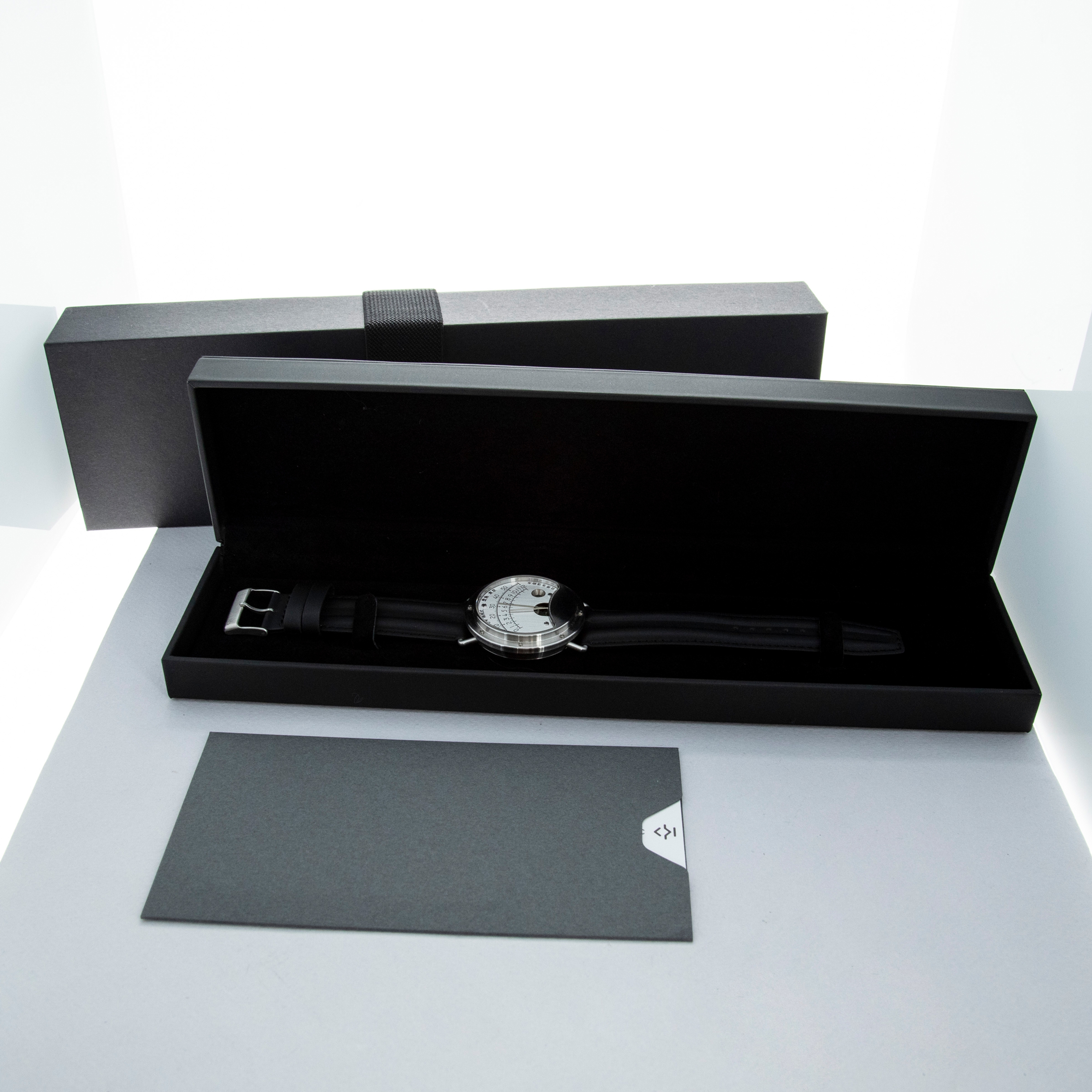 Designed to emulate the gauges that adorn the dashboards of cars and industrial equipment, the No. 6's monochromatic silver dial features a retrograde minute and hour hand along with exposed screws that further feed into its steampunk aesthetic.