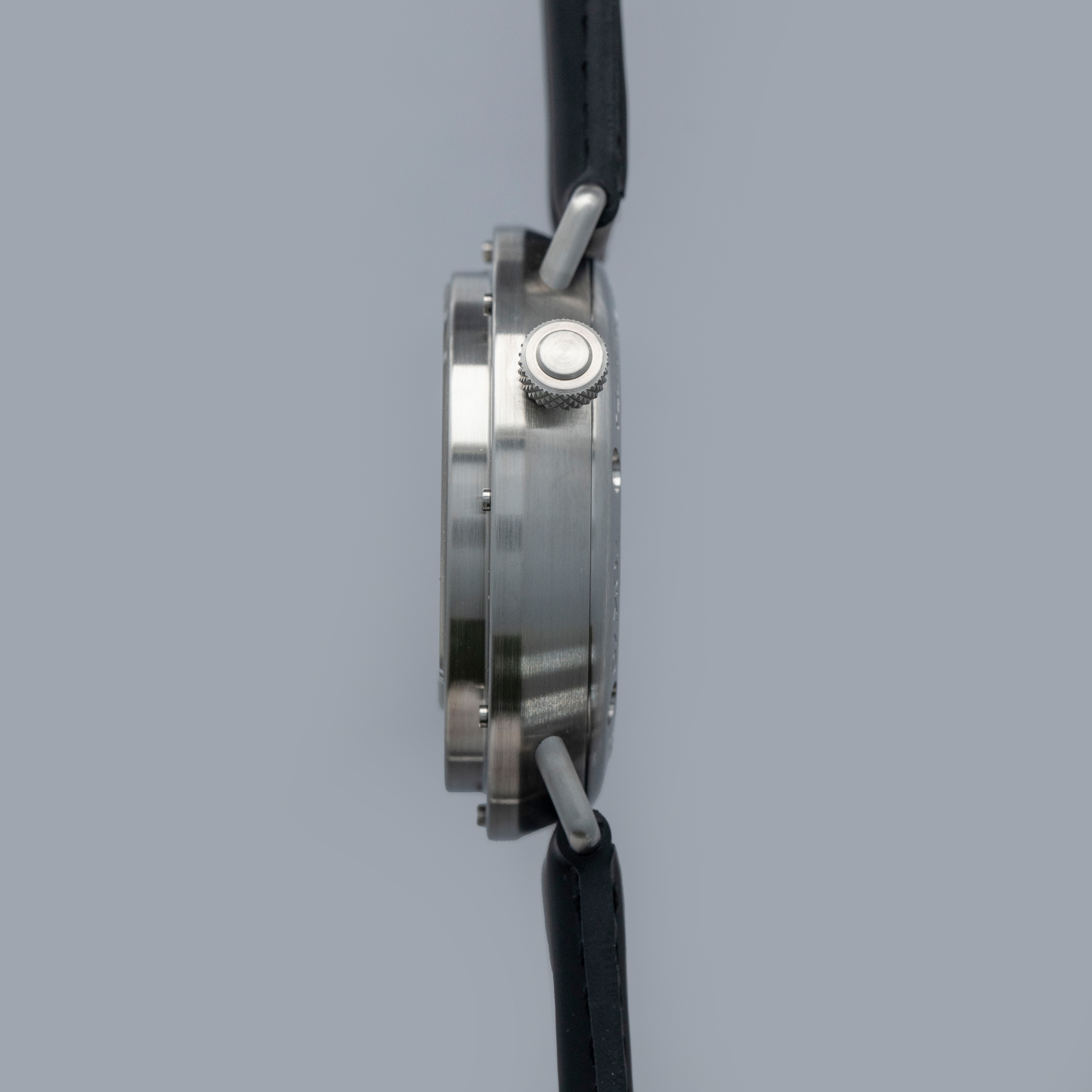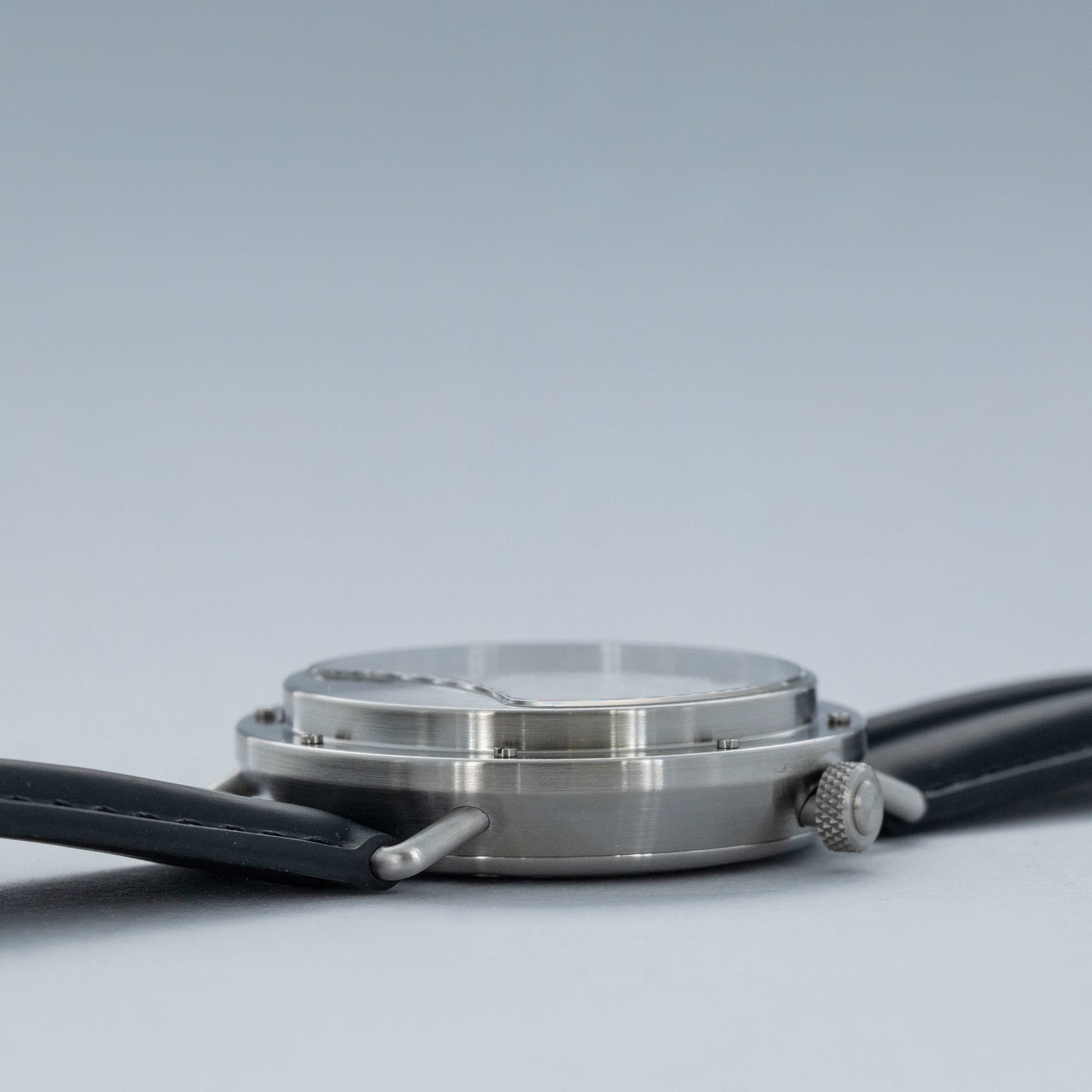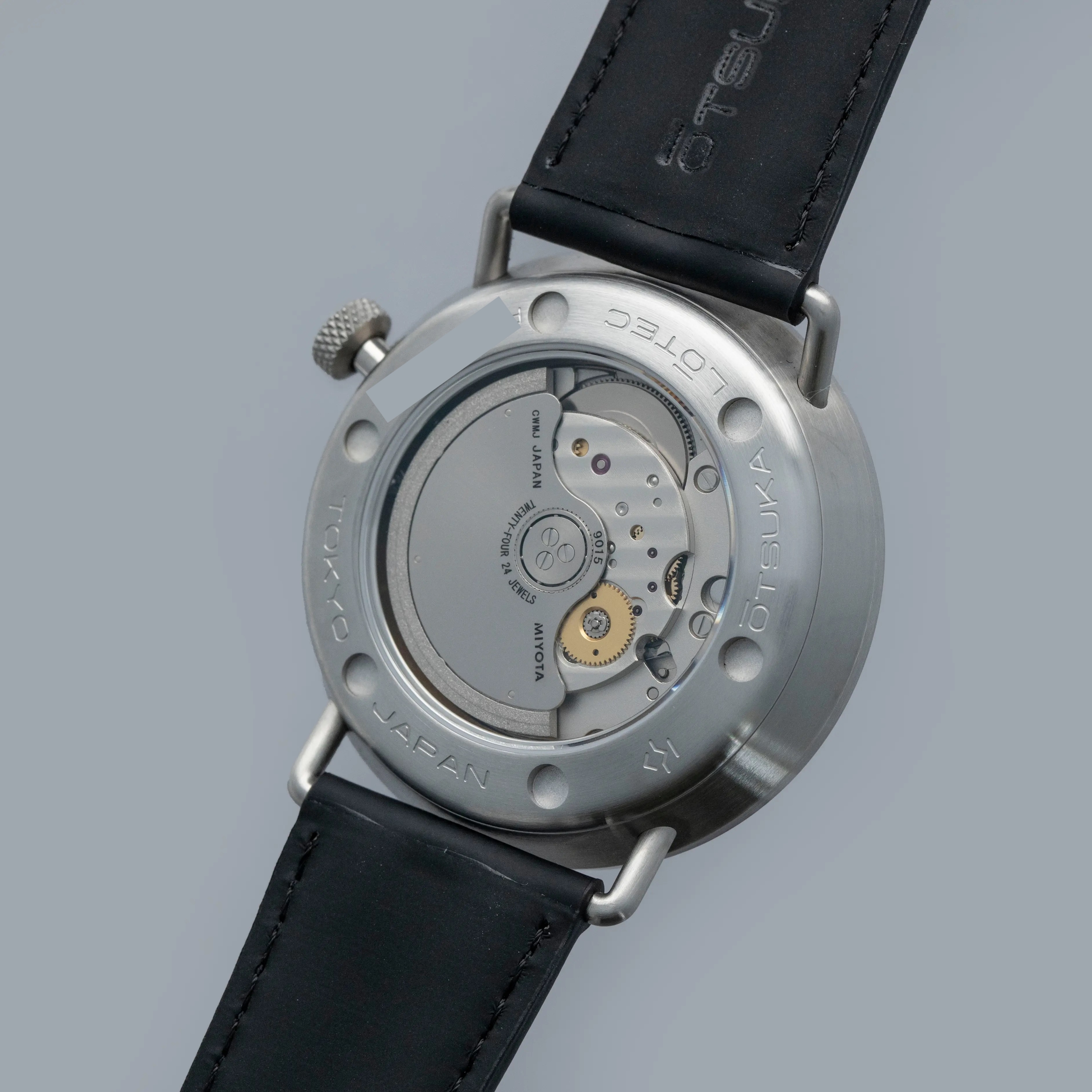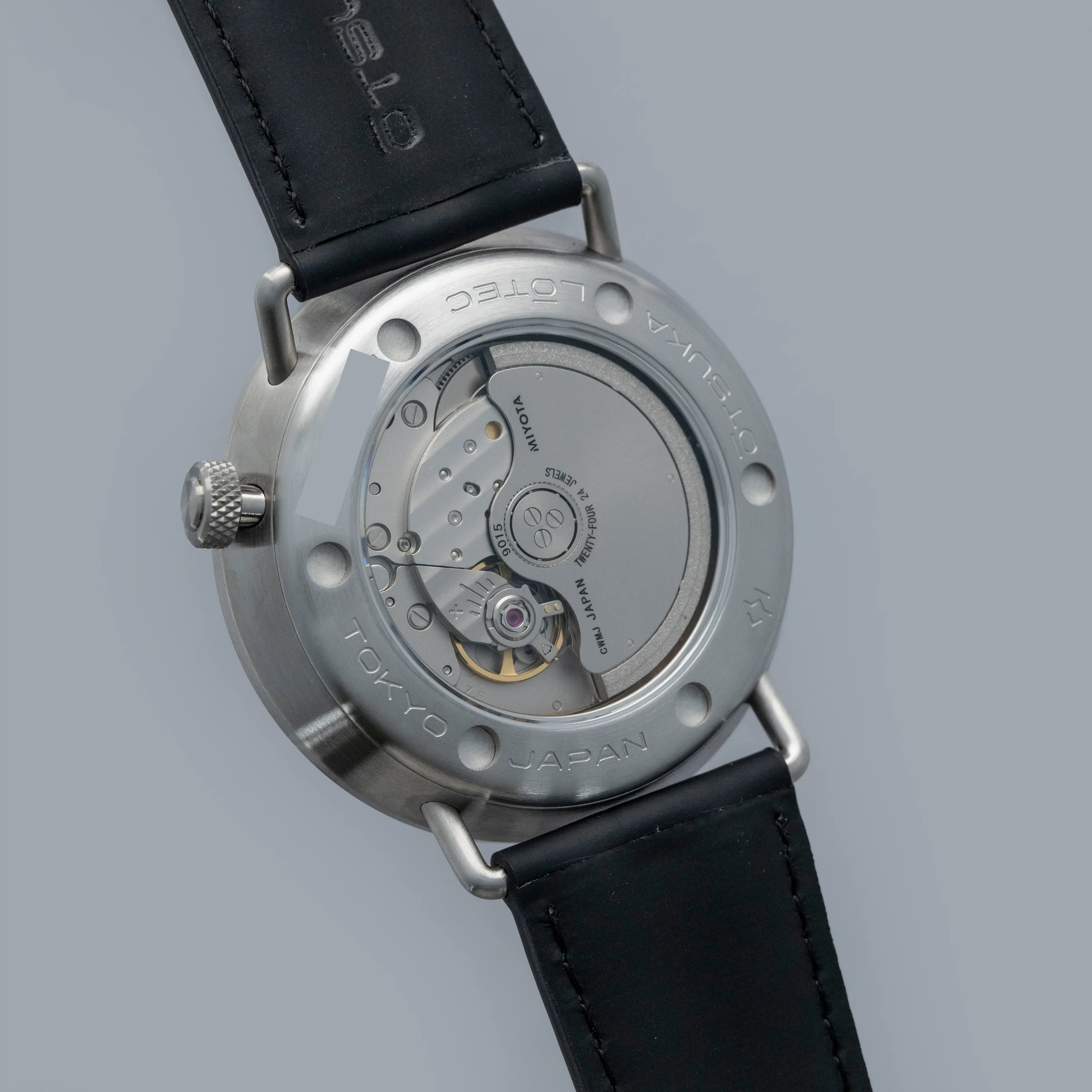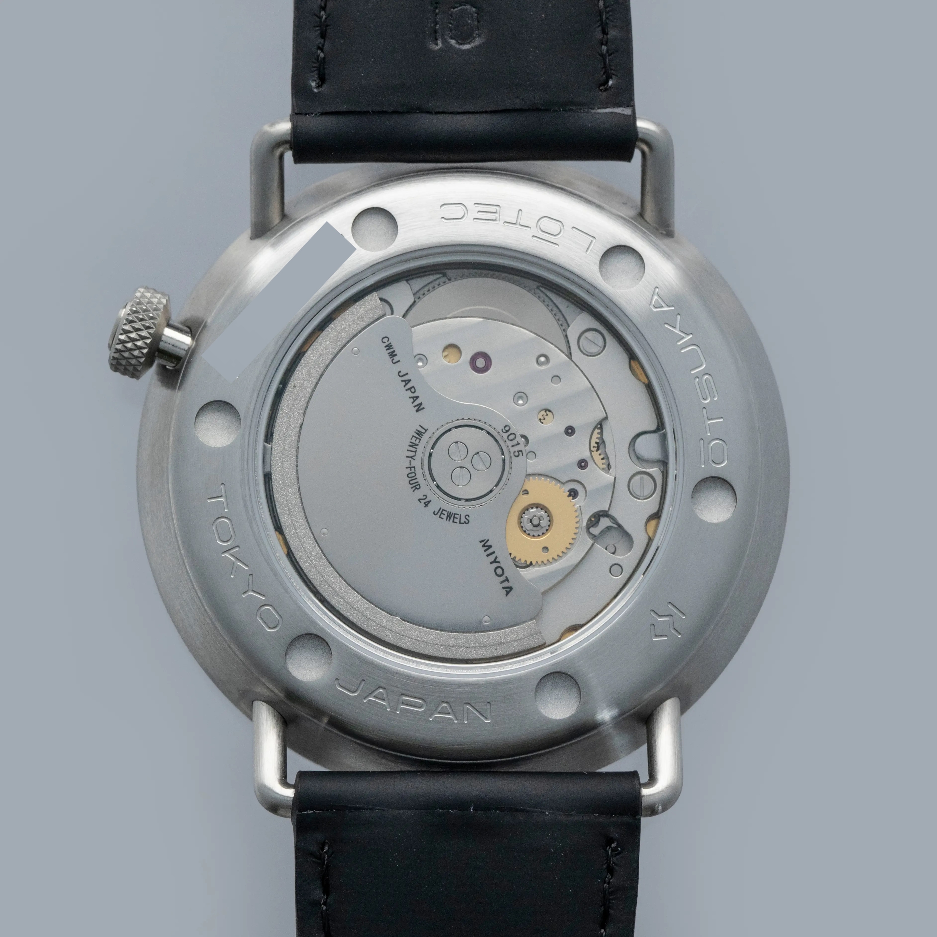 Decidedly unique and industrial, the No. 6's 42.6mm case features all brushed surfaces and exposed screws atop its bezel and on its dial that reveal Otsuka Lotec's function over form design thesis.