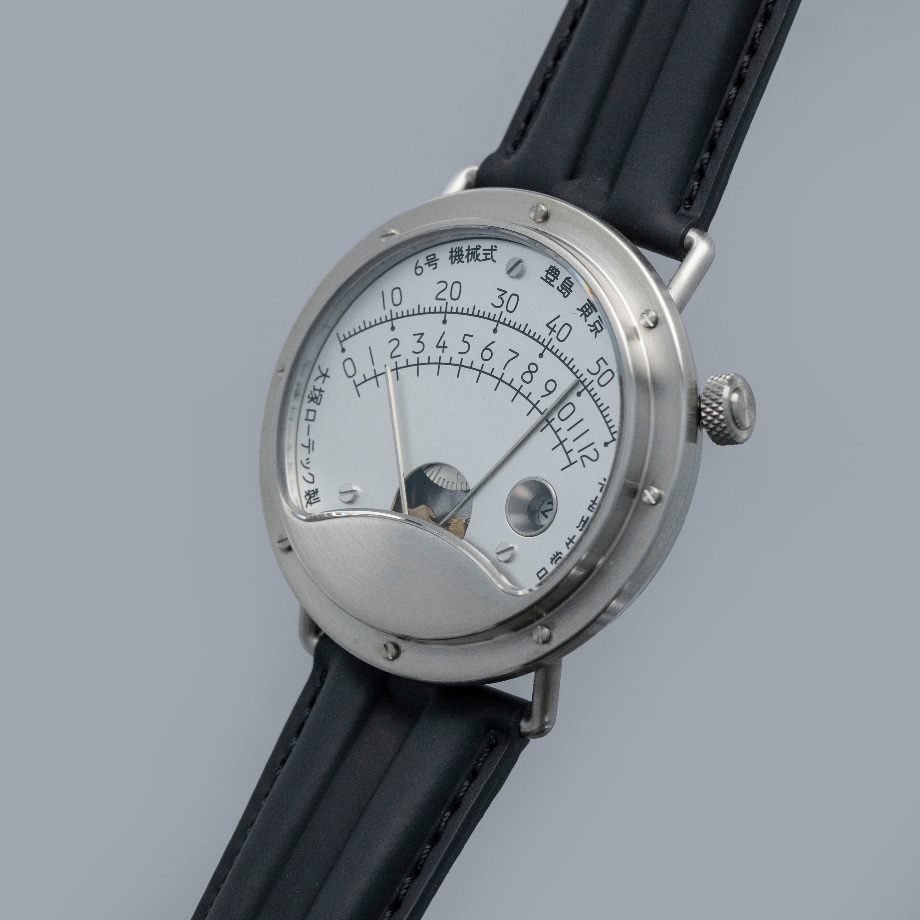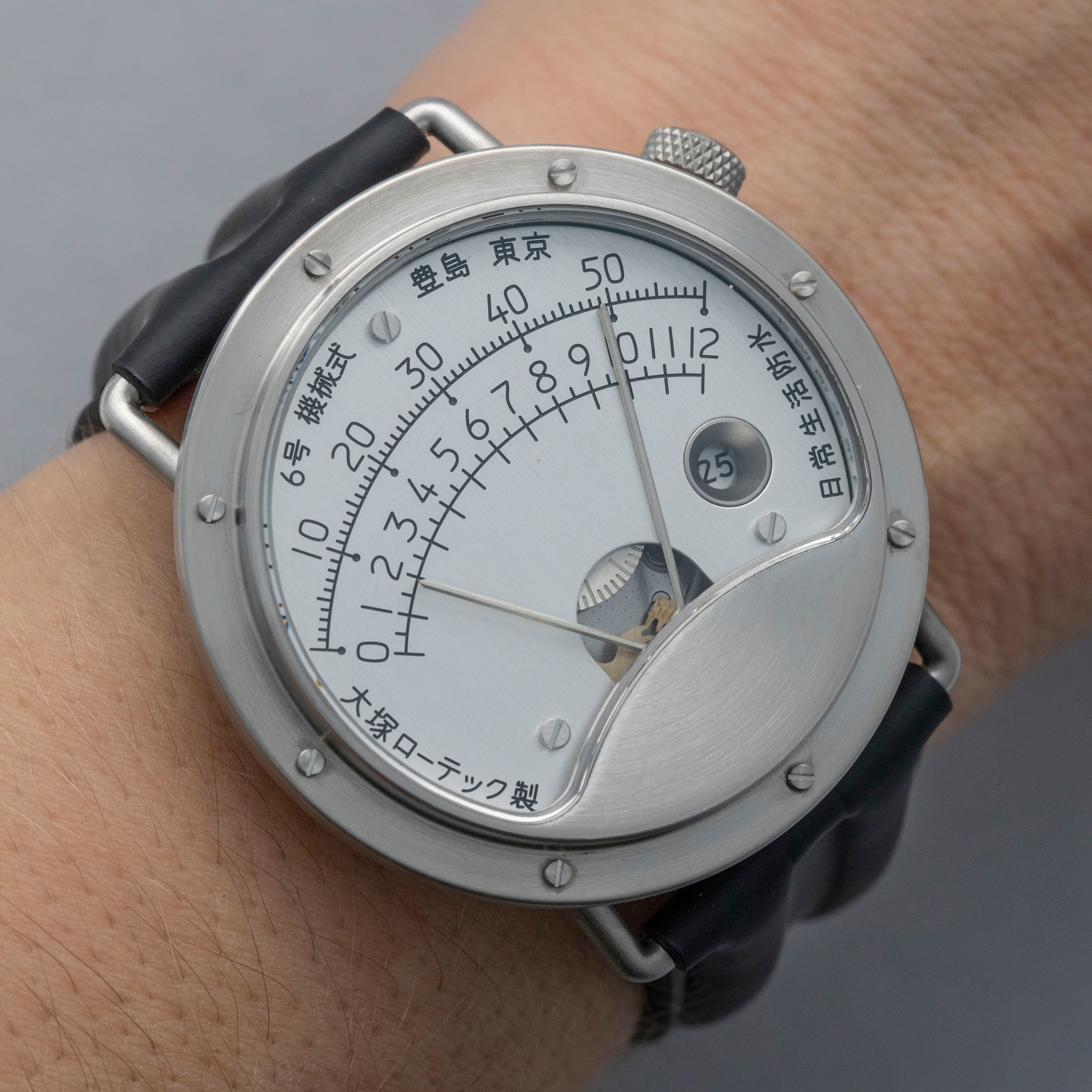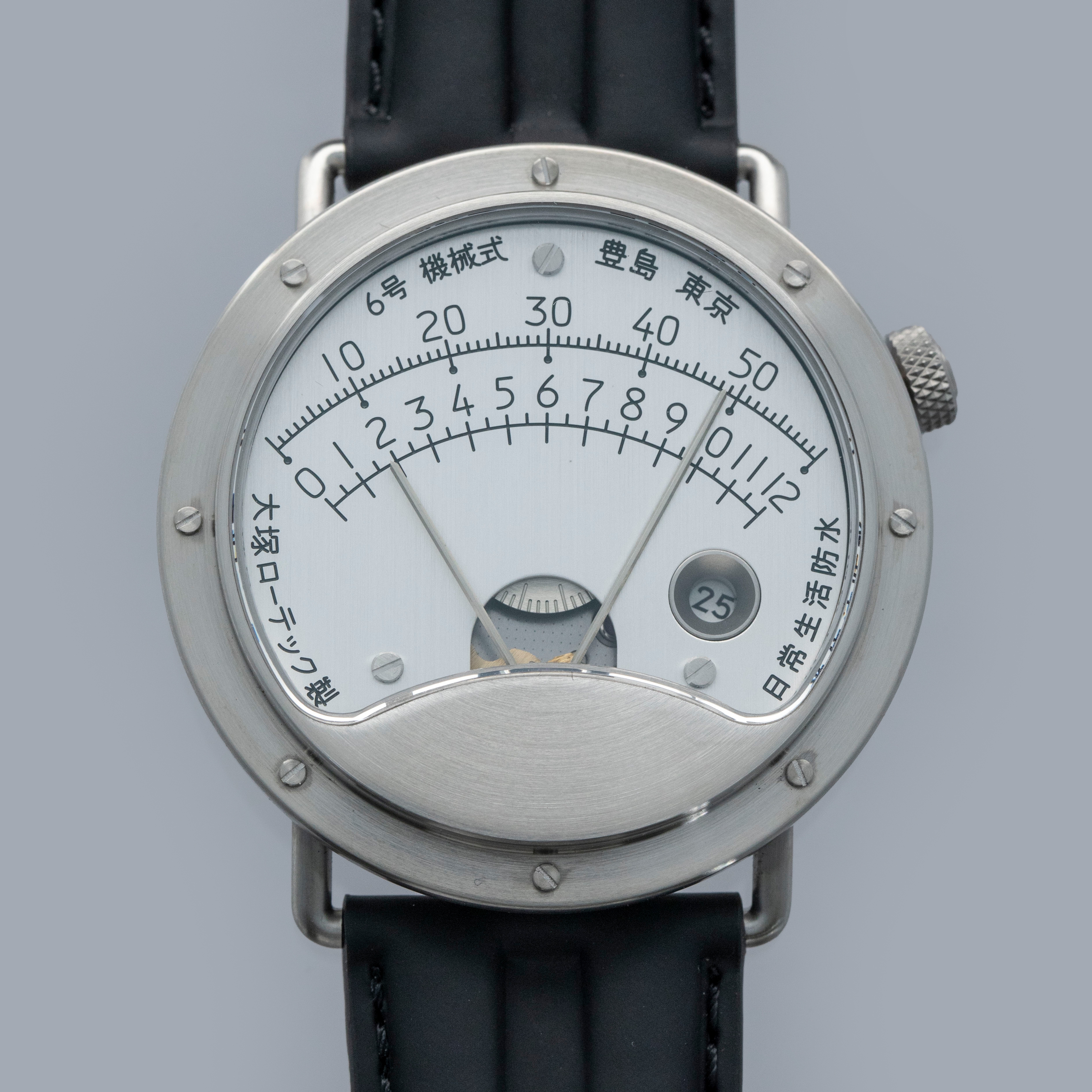 Originally moving into watchmaking in 2008 after studying automotive design, Jiro Katayama, a Tokyo-based watchmaker and designer, draws his inspiration from the realm of industrial world where his career originally started. Incorporating automotive design details and an industrialized steampunk aesthetic, Katayama’s timepieces, offered in limited runs only in Japan through his brand Otsuka Lotec, are some of the most visually distinctive and unique watches within the modern realm of indie watchmaking. Winning the recent Challenge Watch Prize in 2024’s GPHG awards, the No. 6 has quickly become Otsuka Lotec’s most revered watch. Boasting a brushed stainless steel design with exposed screws, a stepped bezel, wire lugs, and a large monochromatic retrograde time display, the resulting timepiece is reminiscent of the pressure gauge on a car or a hygrometer.