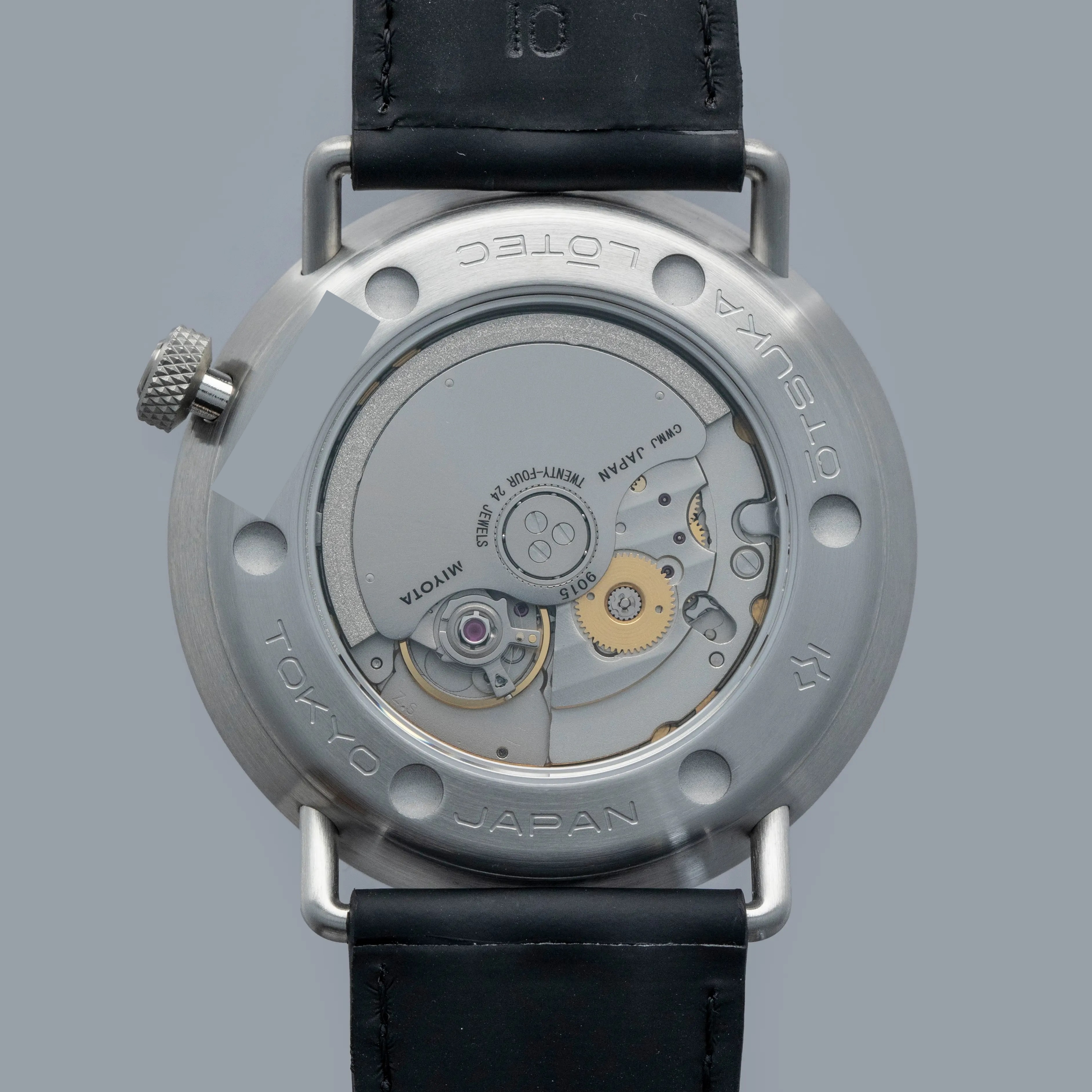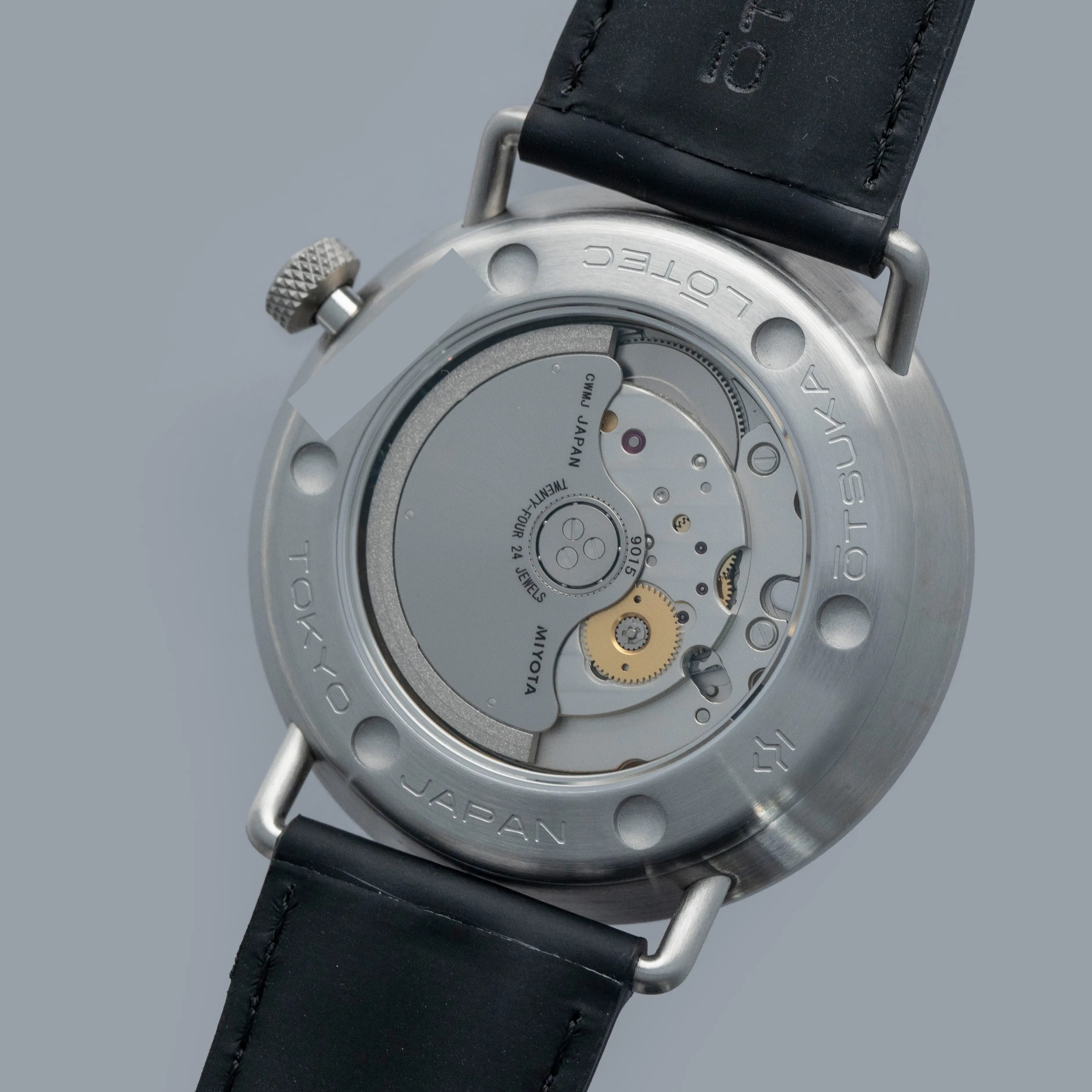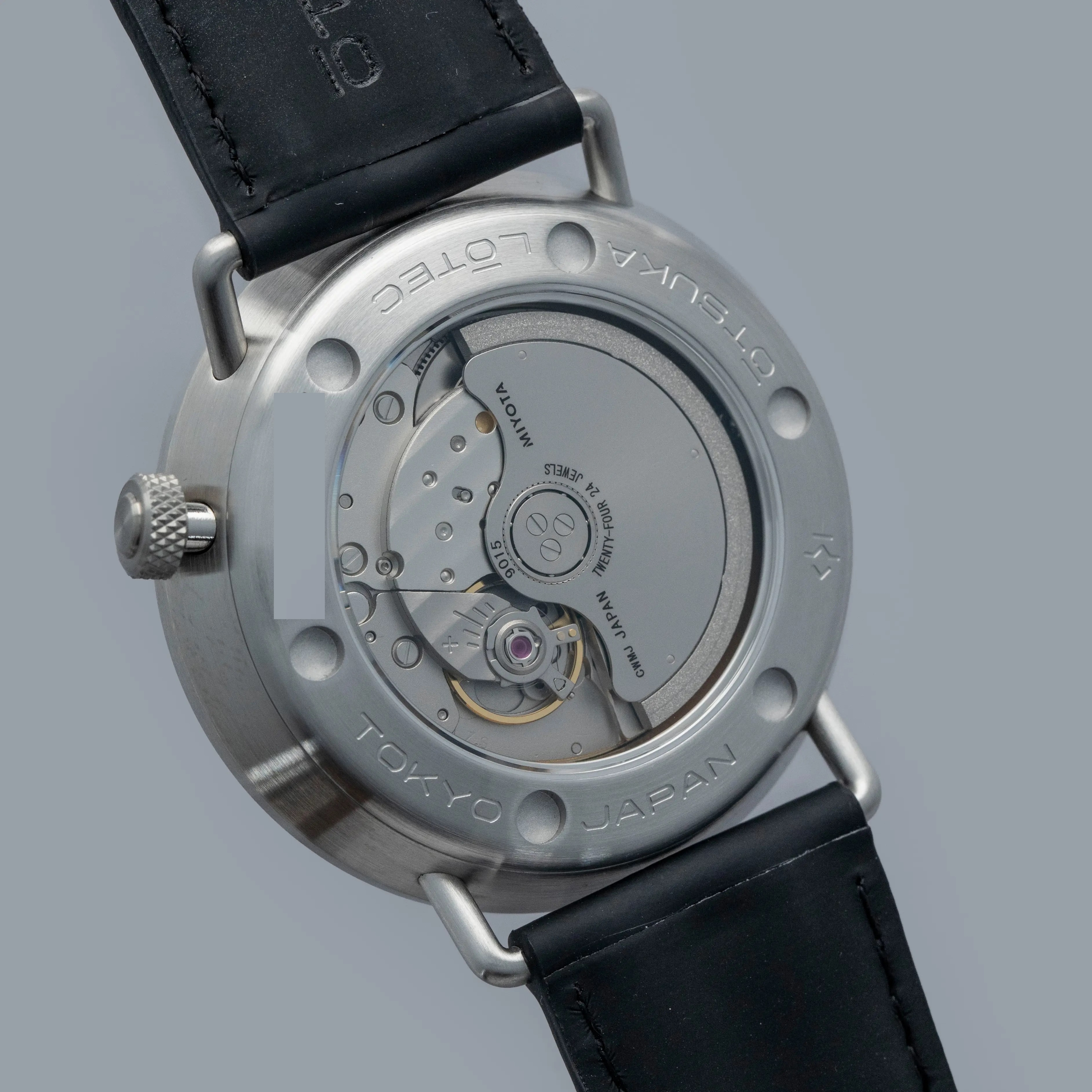 Decidedly unique and industrial, the No. 6's 42.6mm case features all brushed surfaces and exposed screws atop its bezel and on its dial that reveal Otsuka Lotec's function over form design thesis.