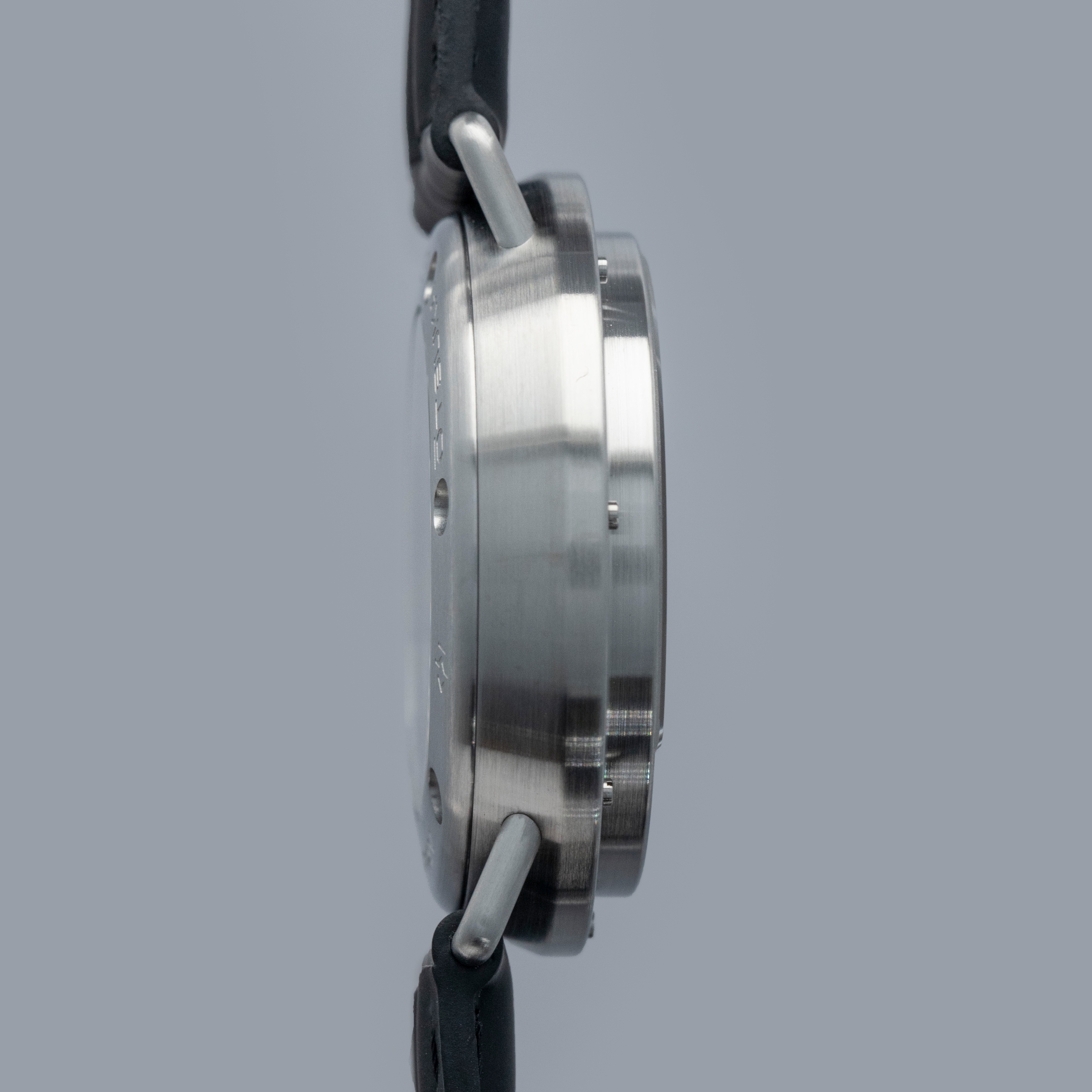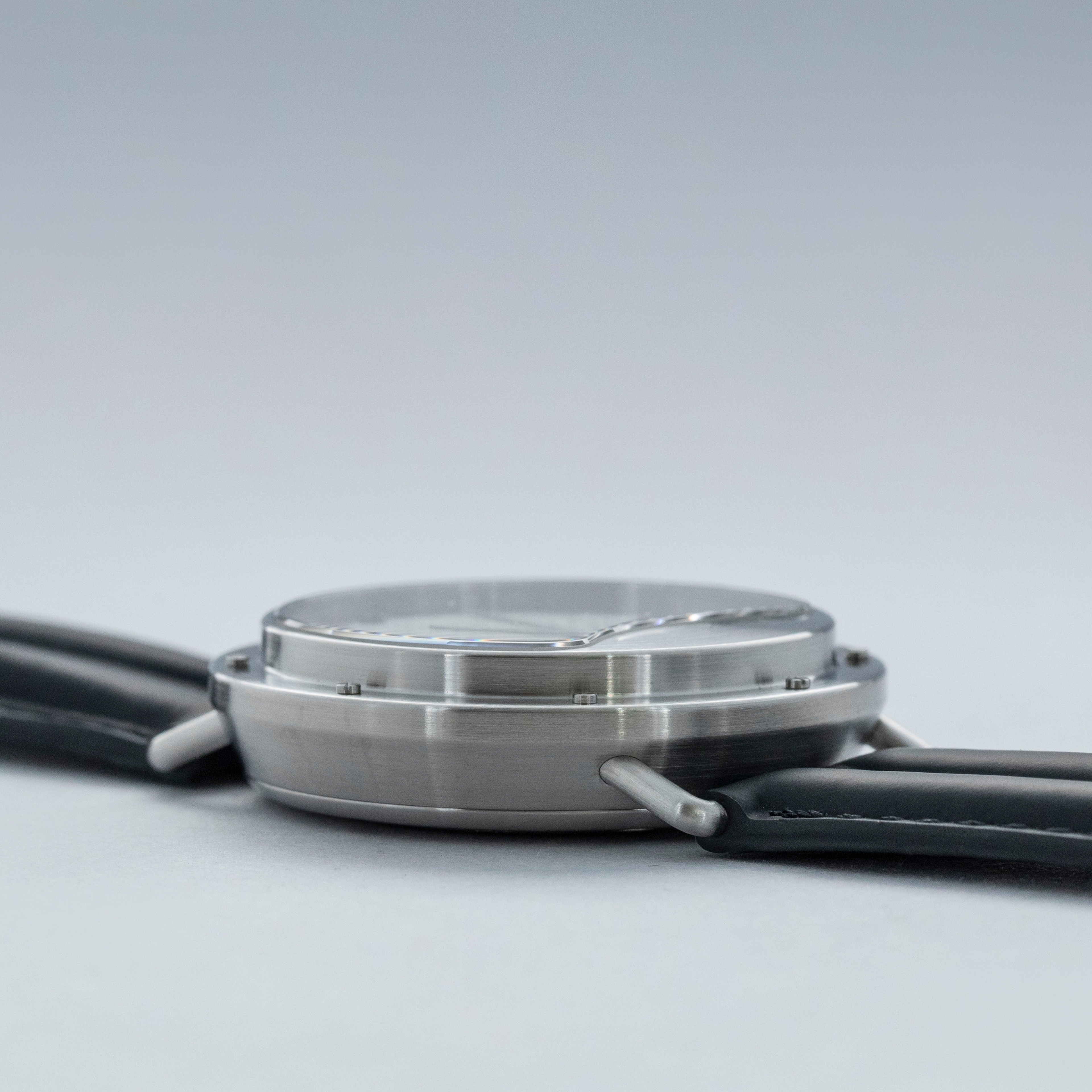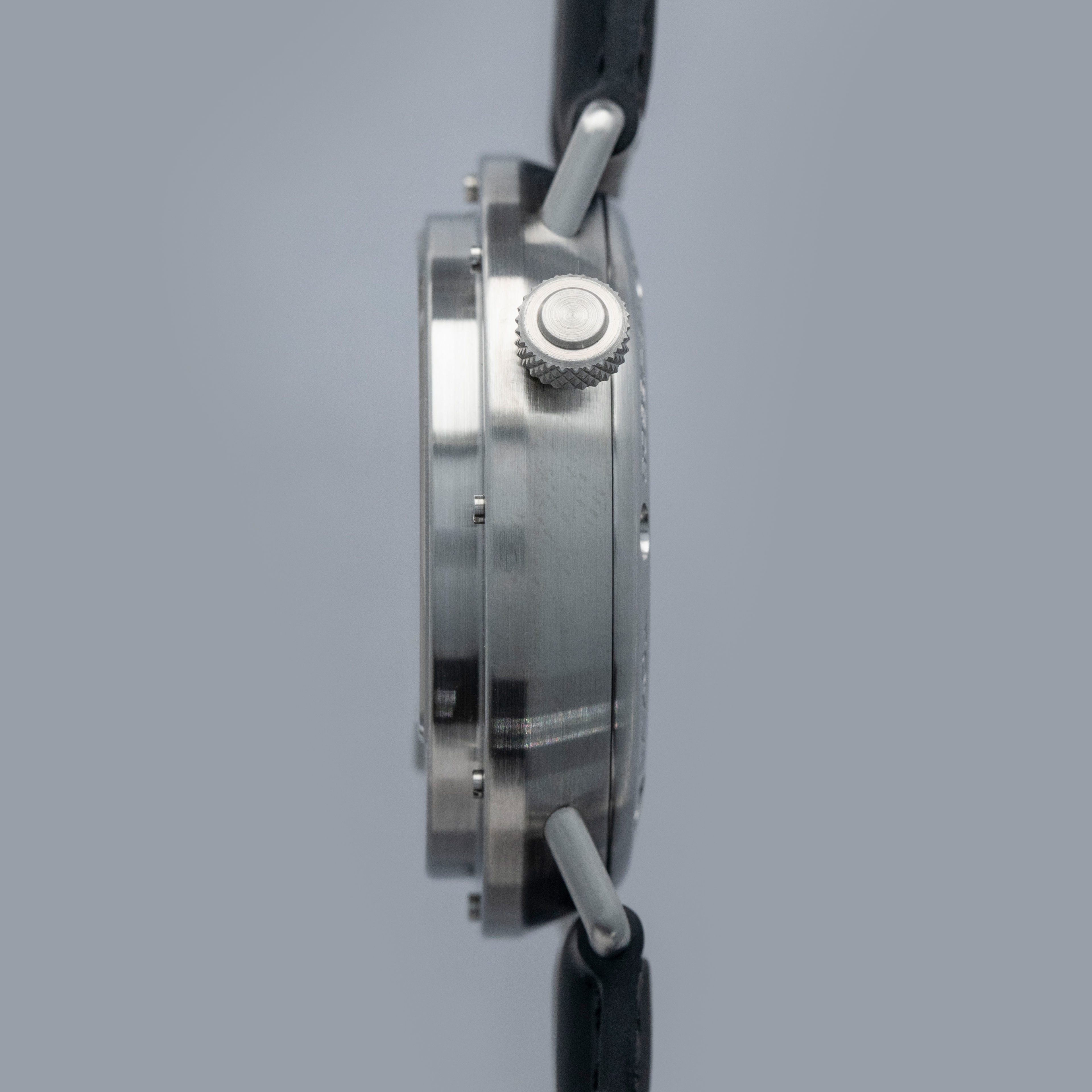 Decidedly unique and industrial, the No. 6's 42.6mm case features all brushed surfaces and exposed screws atop its bezel and on its dial that reveal Otsuka Lotec's function over form design thesis.