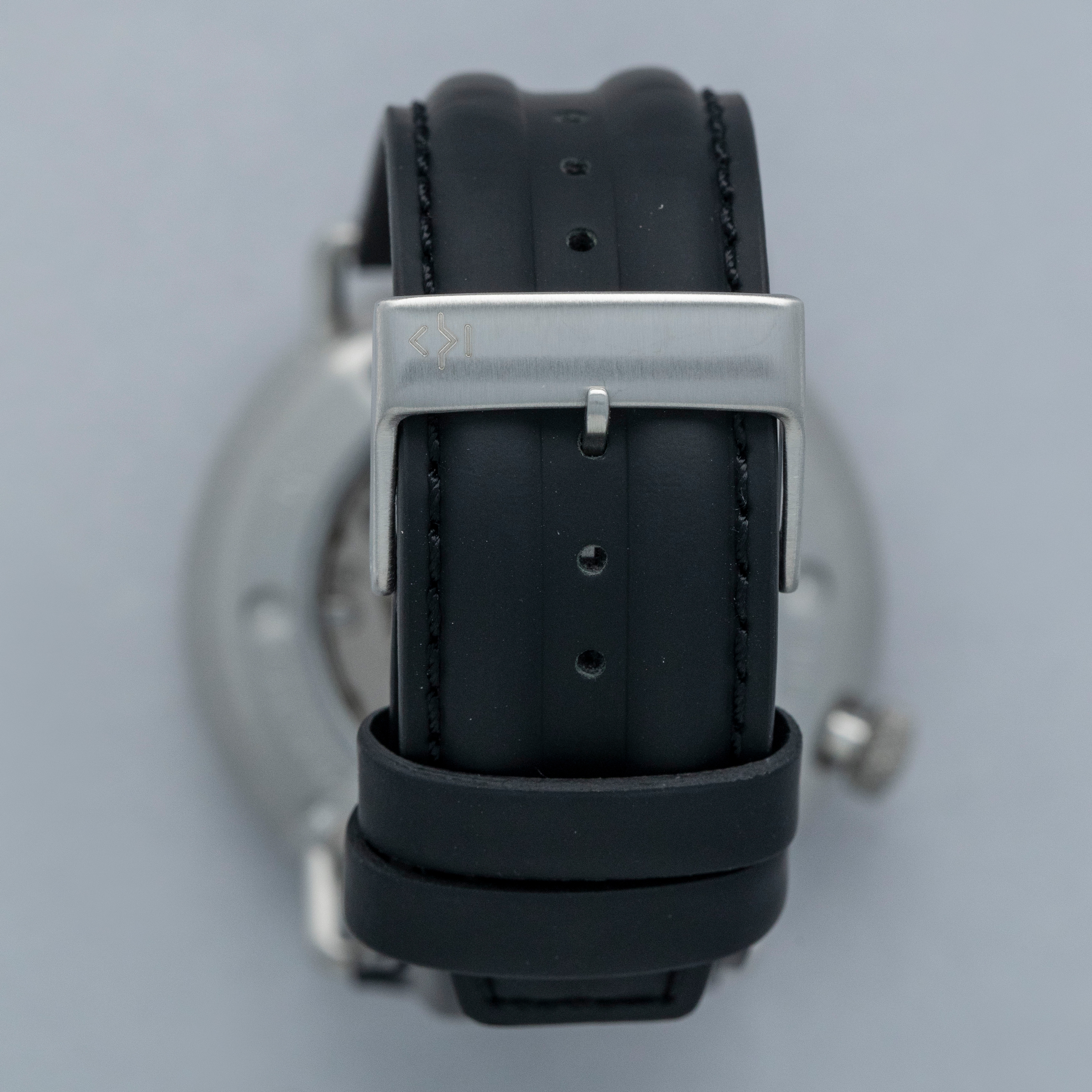 Designed to emulate the gauges that adorn the dashboards of cars and industrial equipment, the No. 6's monochromatic silver dial features a retrograde minute and hour hand along with exposed screws that further feed into its steampunk aesthetic.