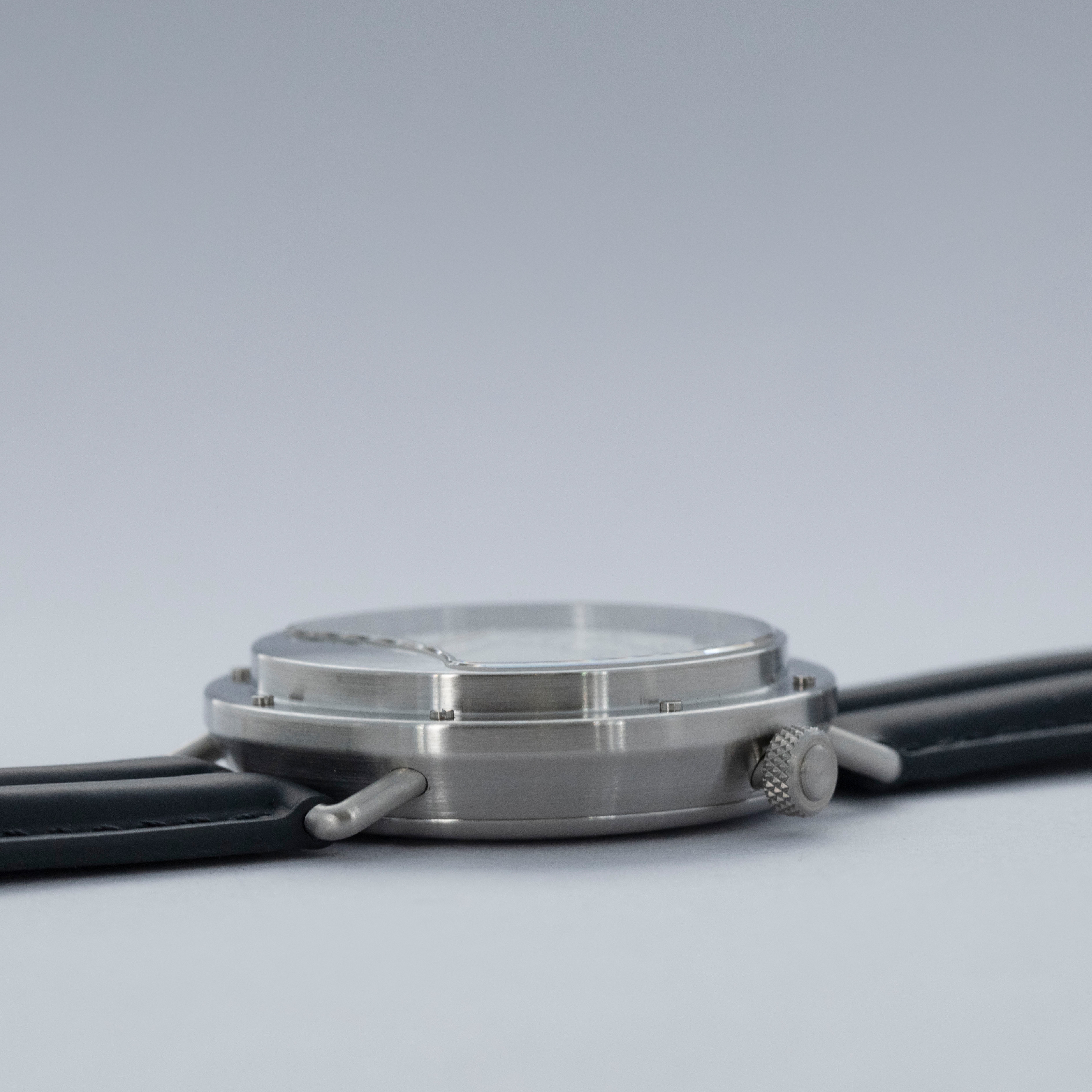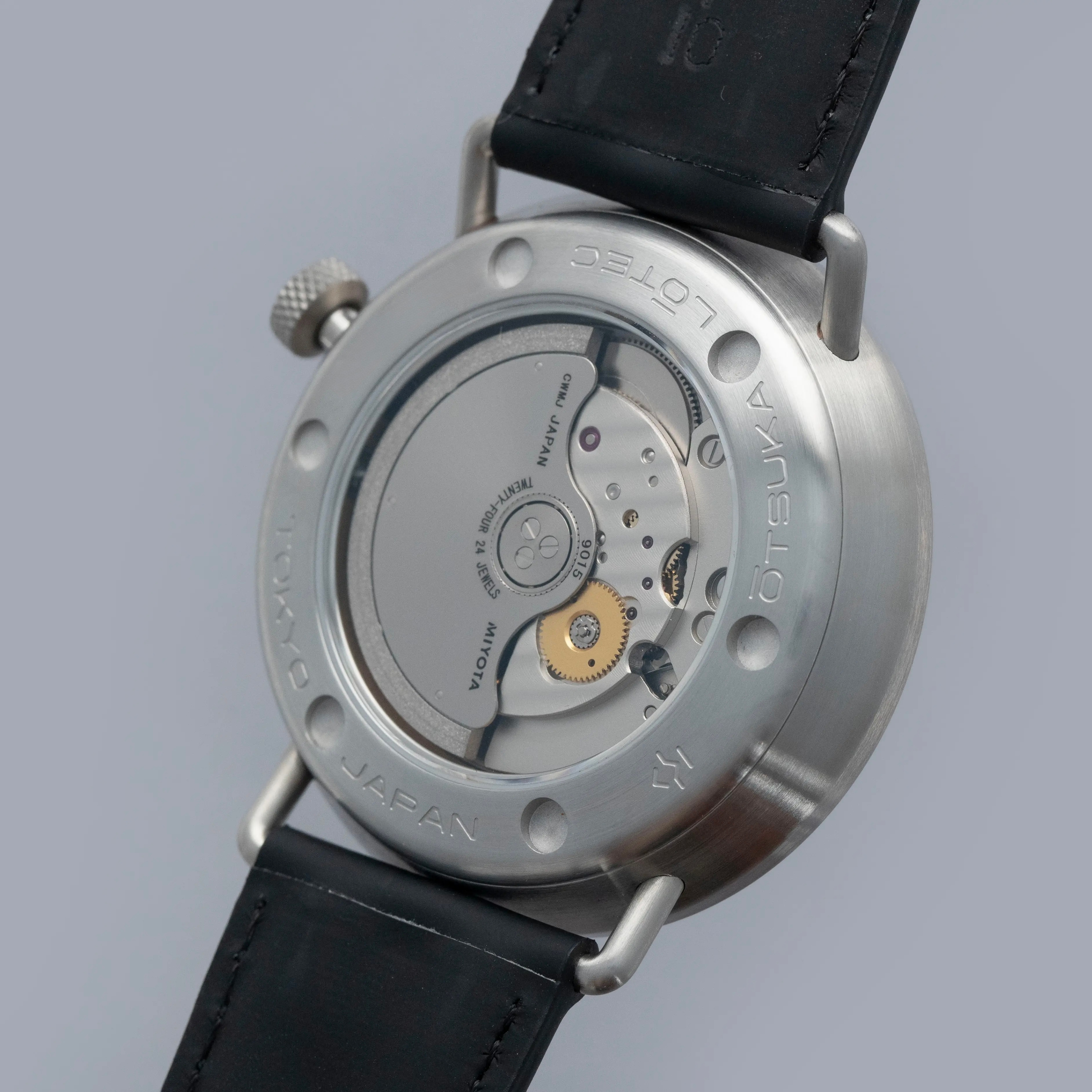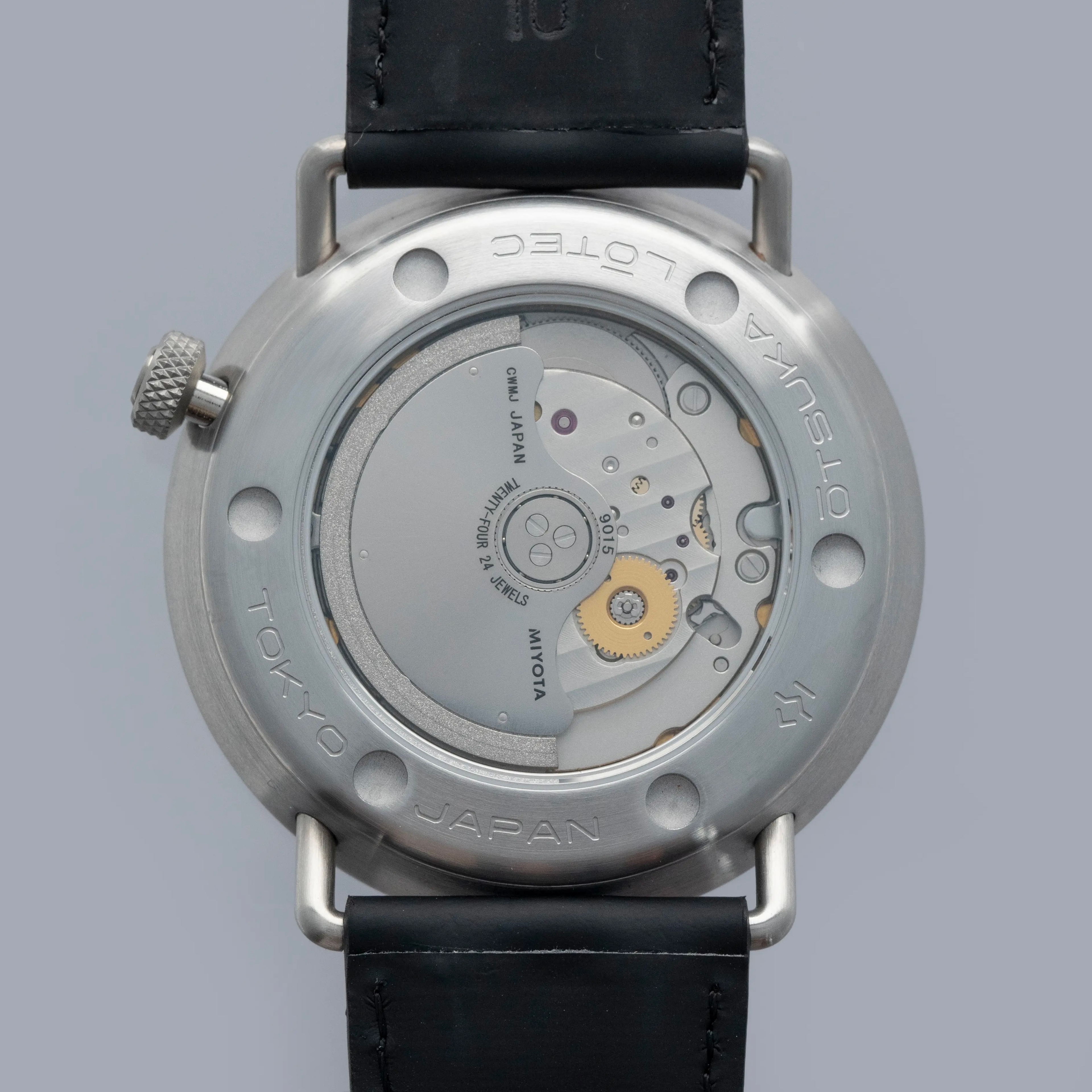 Decidedly unique and industrial, the No. 6's 42.6mm case features all brushed surfaces and exposed screws atop its bezel and on its dial that reveal Otsuka Lotec's function over form design thesis.