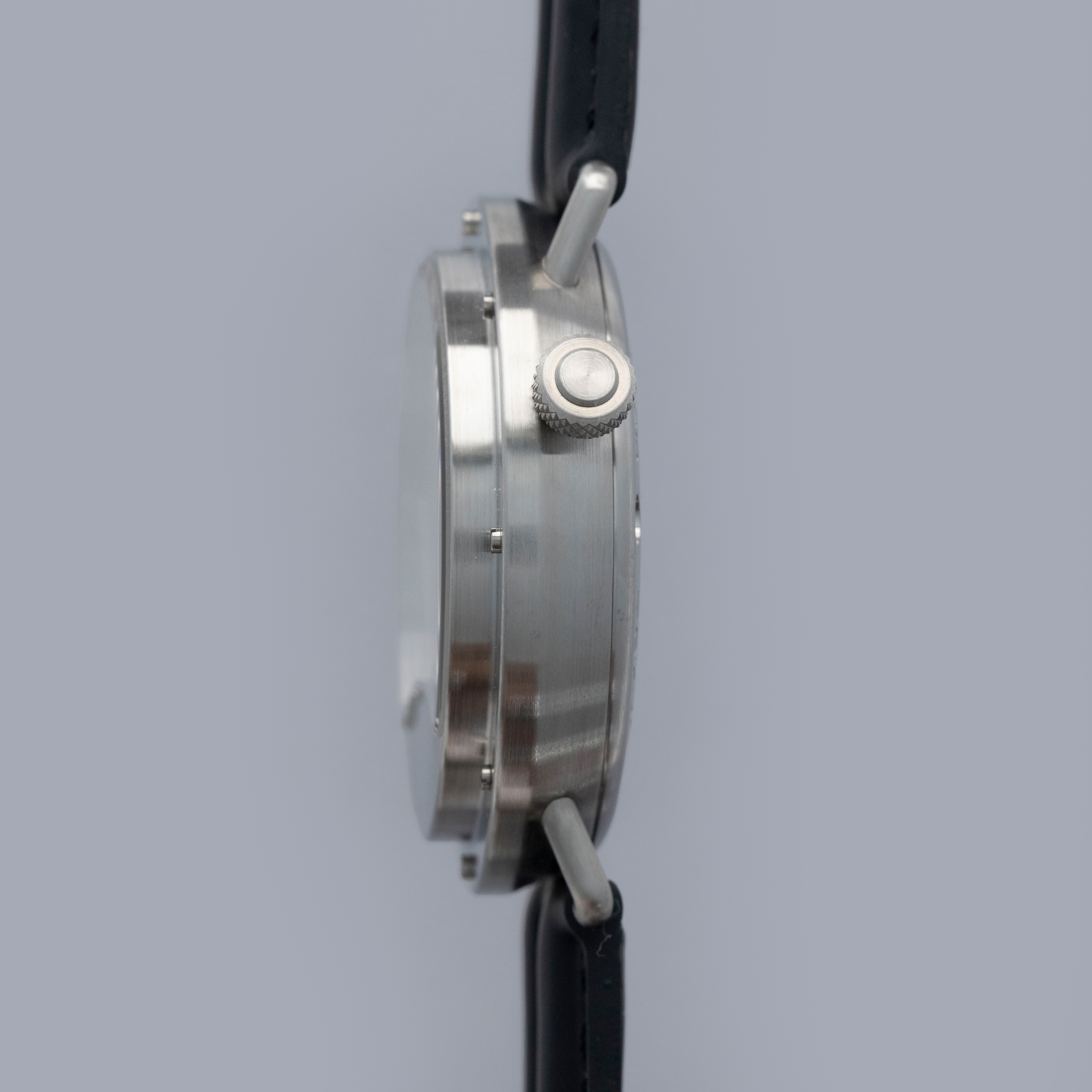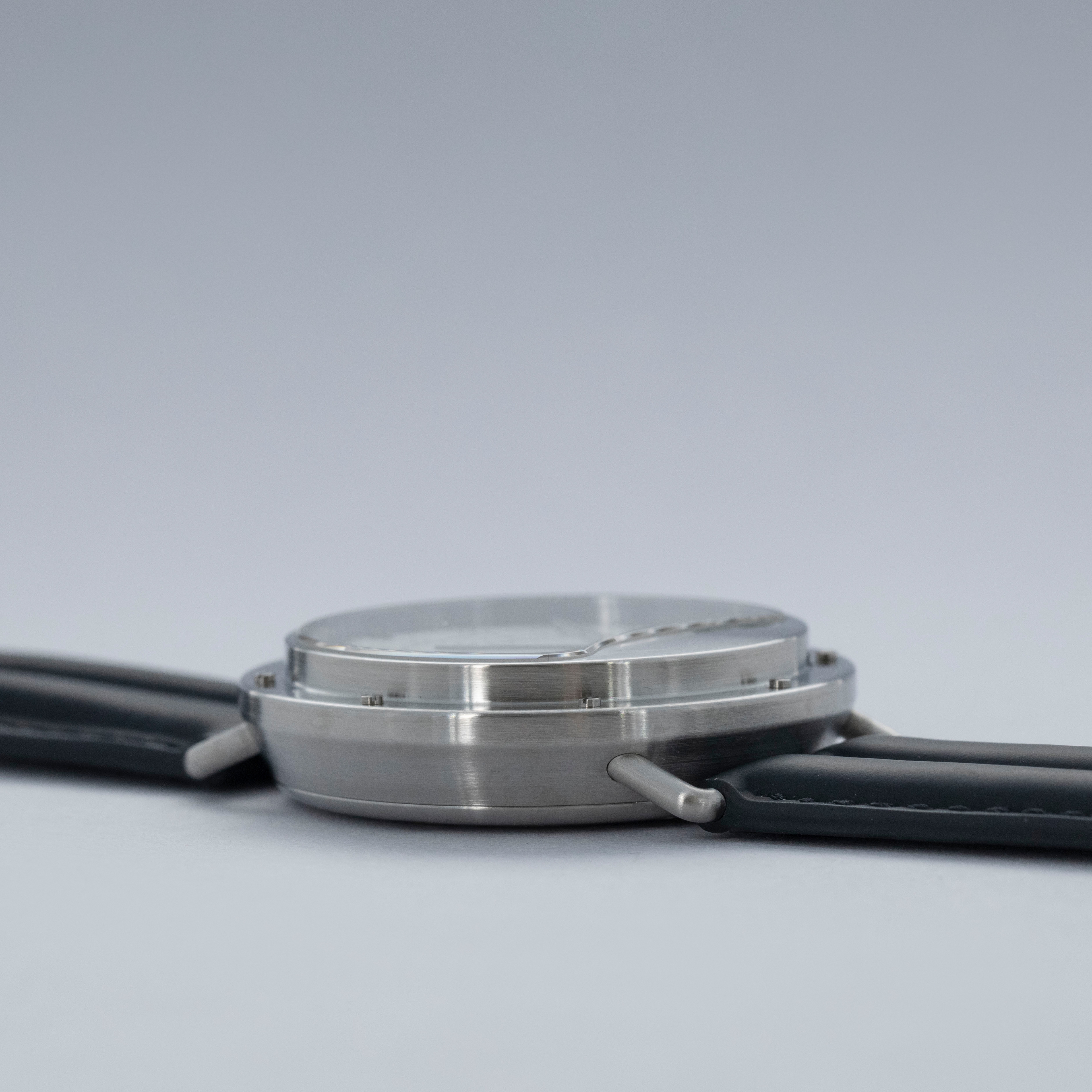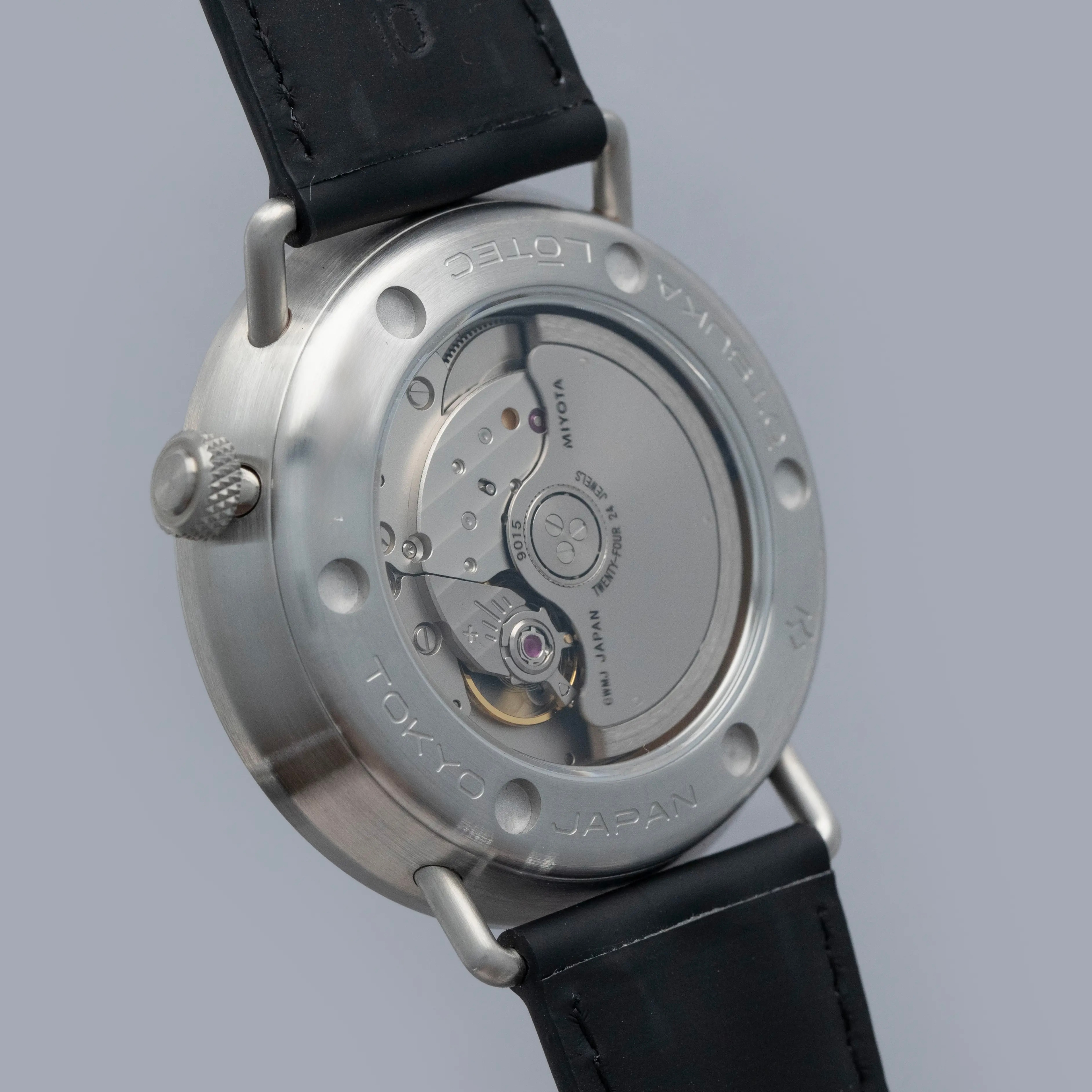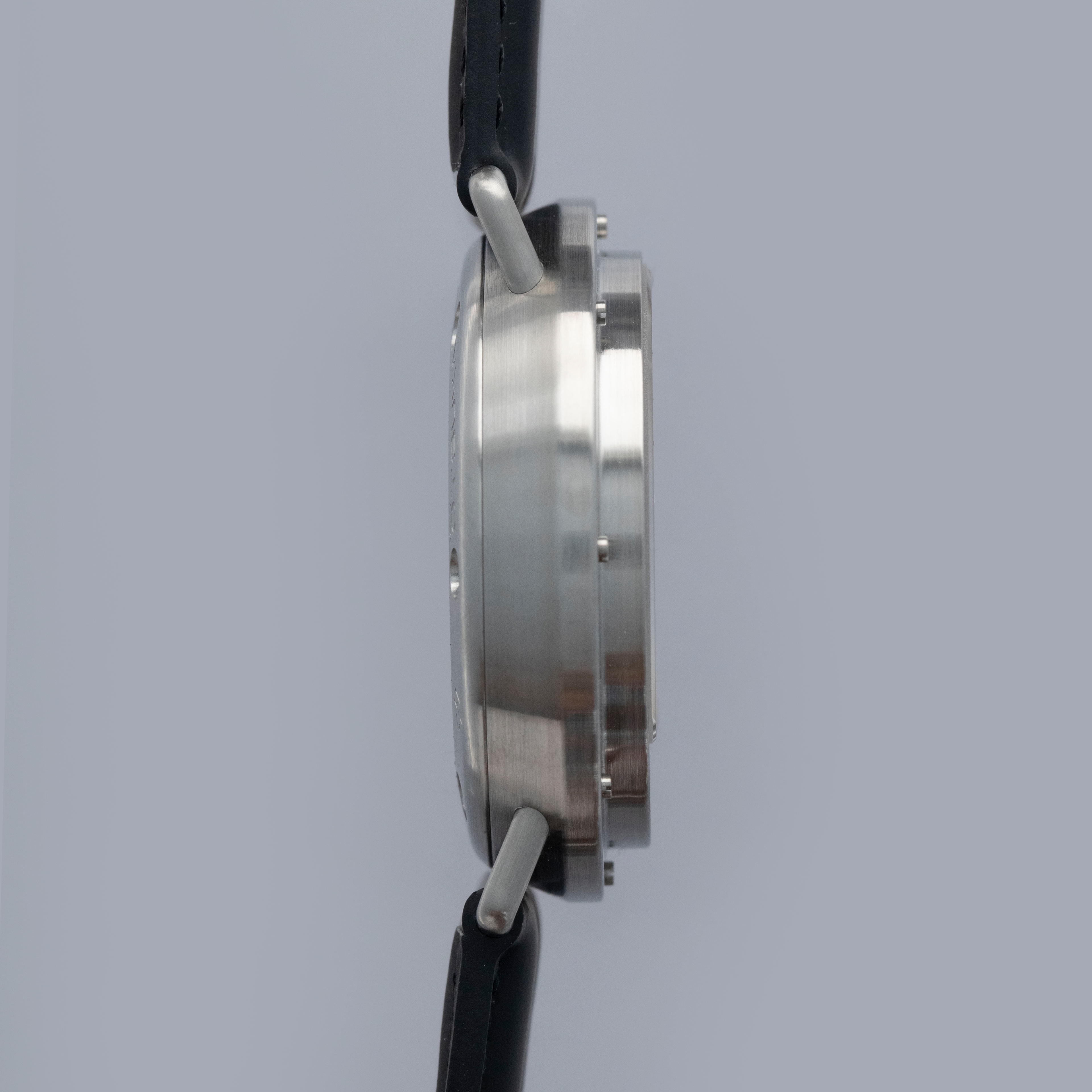 Decidedly unique and industrial, the No. 6's 42.6mm case features all brushed surfaces and exposed screws atop its bezel and on its dial that reveal Otsuka Lotec's function over form design thesis.