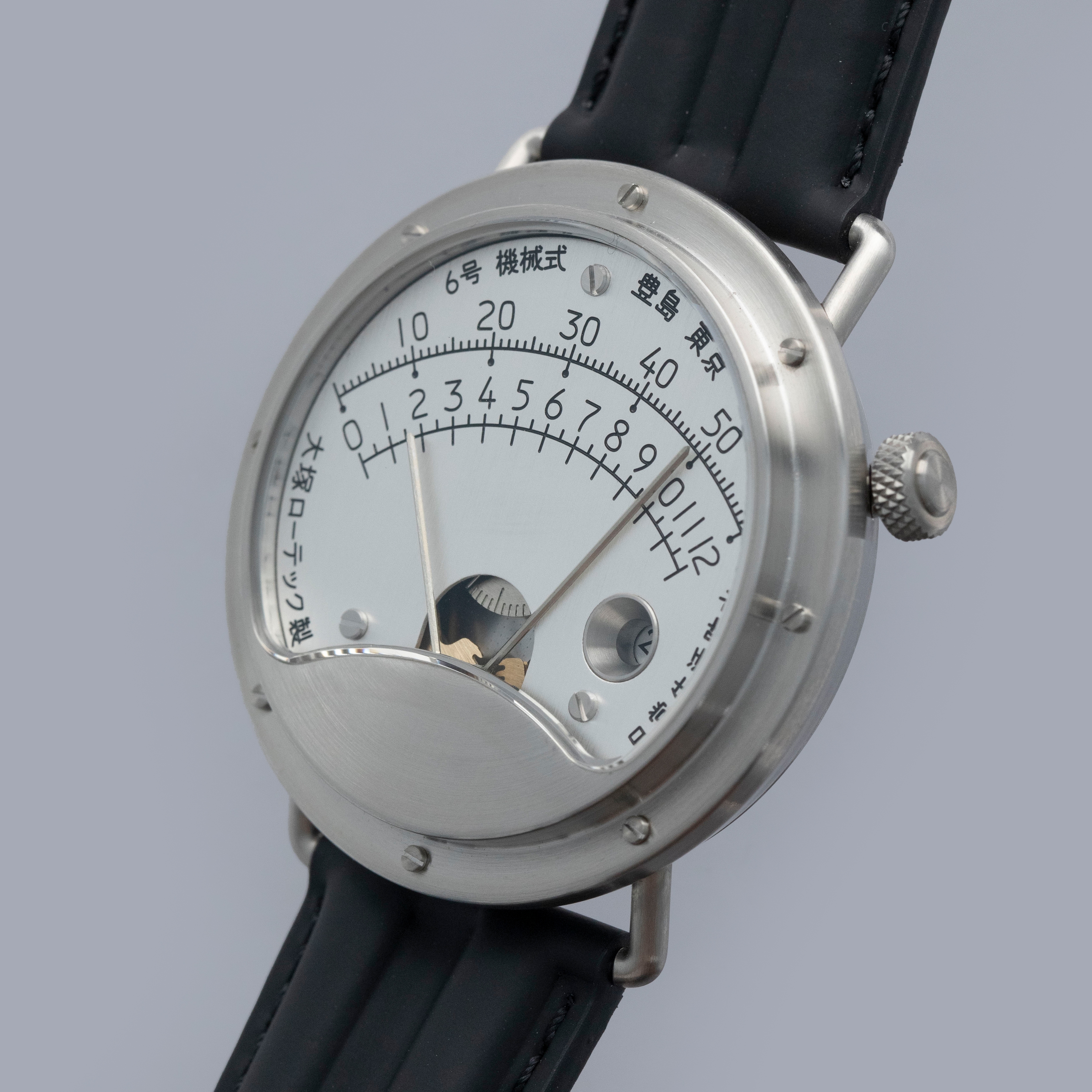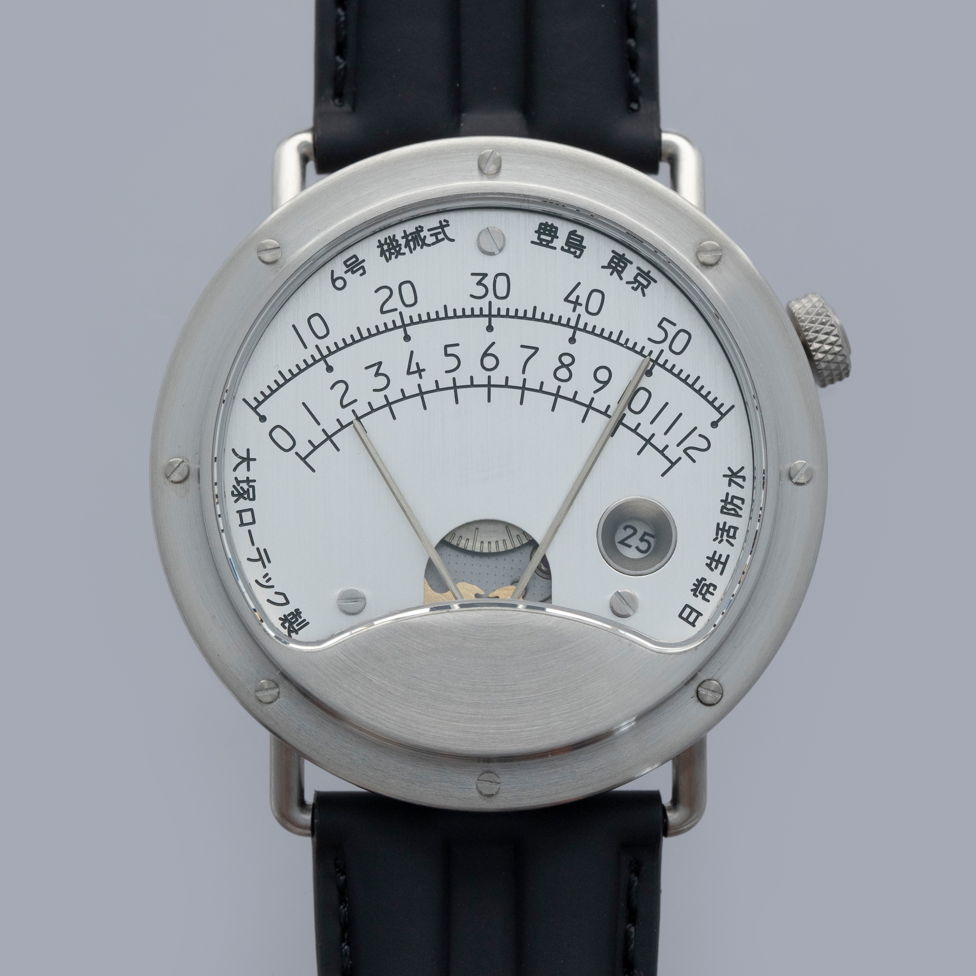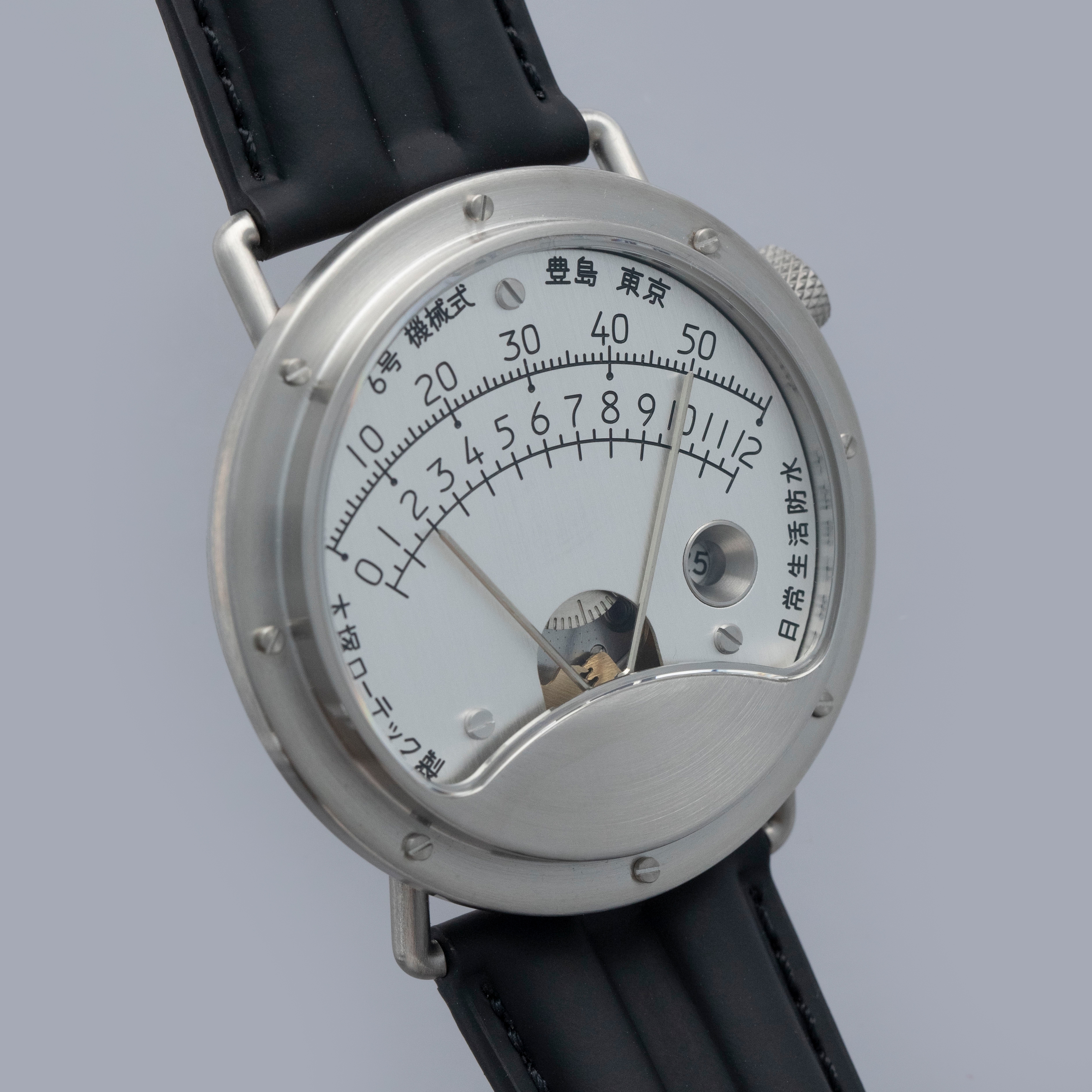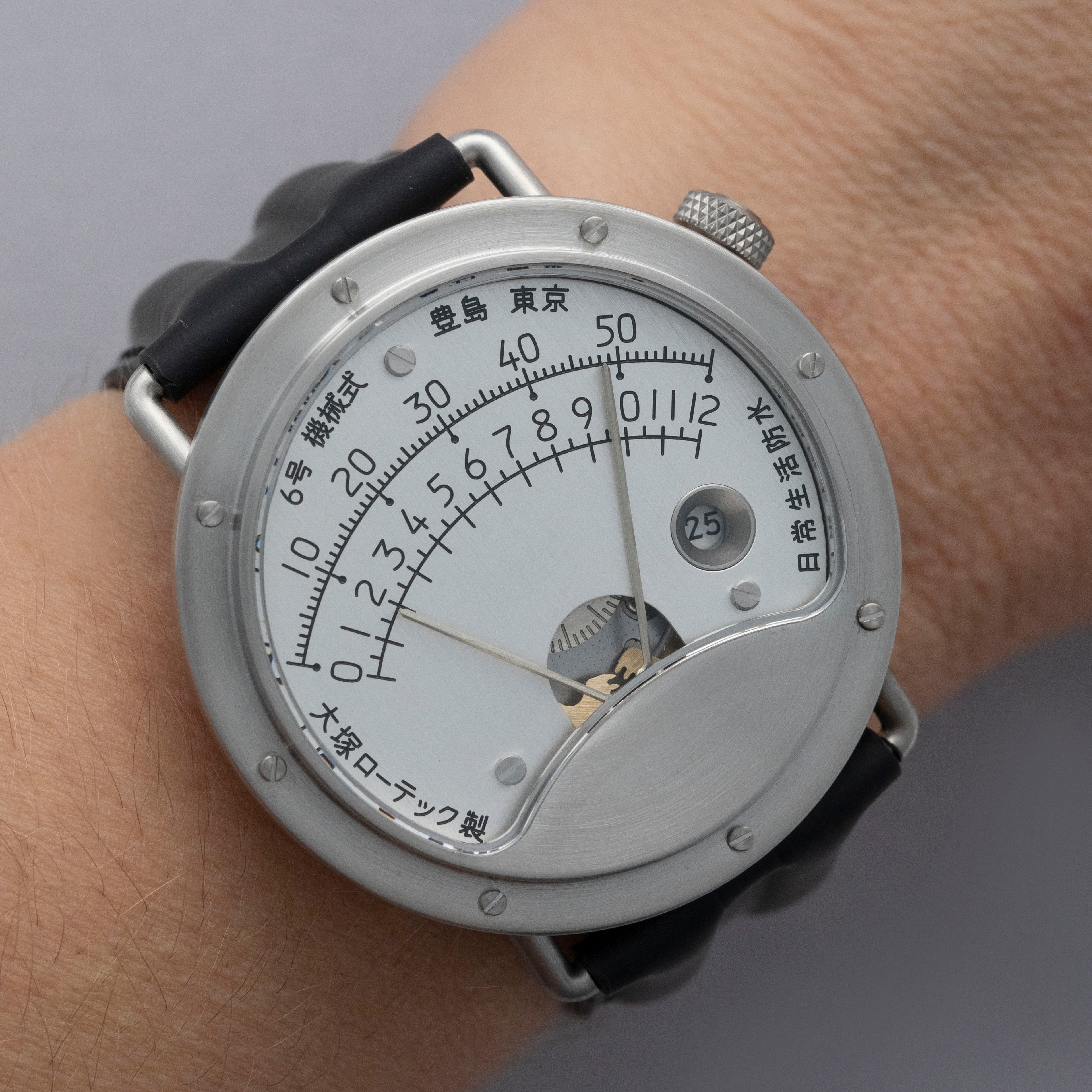 Originally moving into watchmaking in 2008 after studying automotive design, Jiro Katayama, a Tokyo-based watchmaker and designer, draws his inspiration from the realm of industrial world where his career originally started. Incorporating automotive design details and an industrialized steampunk aesthetic, Katayama’s timepieces, offered in limited runs only in Japan through his brand Otsuka Lotec, are some of the most visually distinctive and unique watches within the modern realm of indie watchmaking. Winning the recent Challenge Watch Prize in 2024’s GPHG awards, the No. 6 has quickly become Otsuka Lotec’s most revered watch. Boasting a brushed stainless steel design with exposed screws, a stepped bezel, wire lugs, and a large monochromatic retrograde time display, the resulting timepiece is reminiscent of the pressure gauge on a car or a hygrometer.