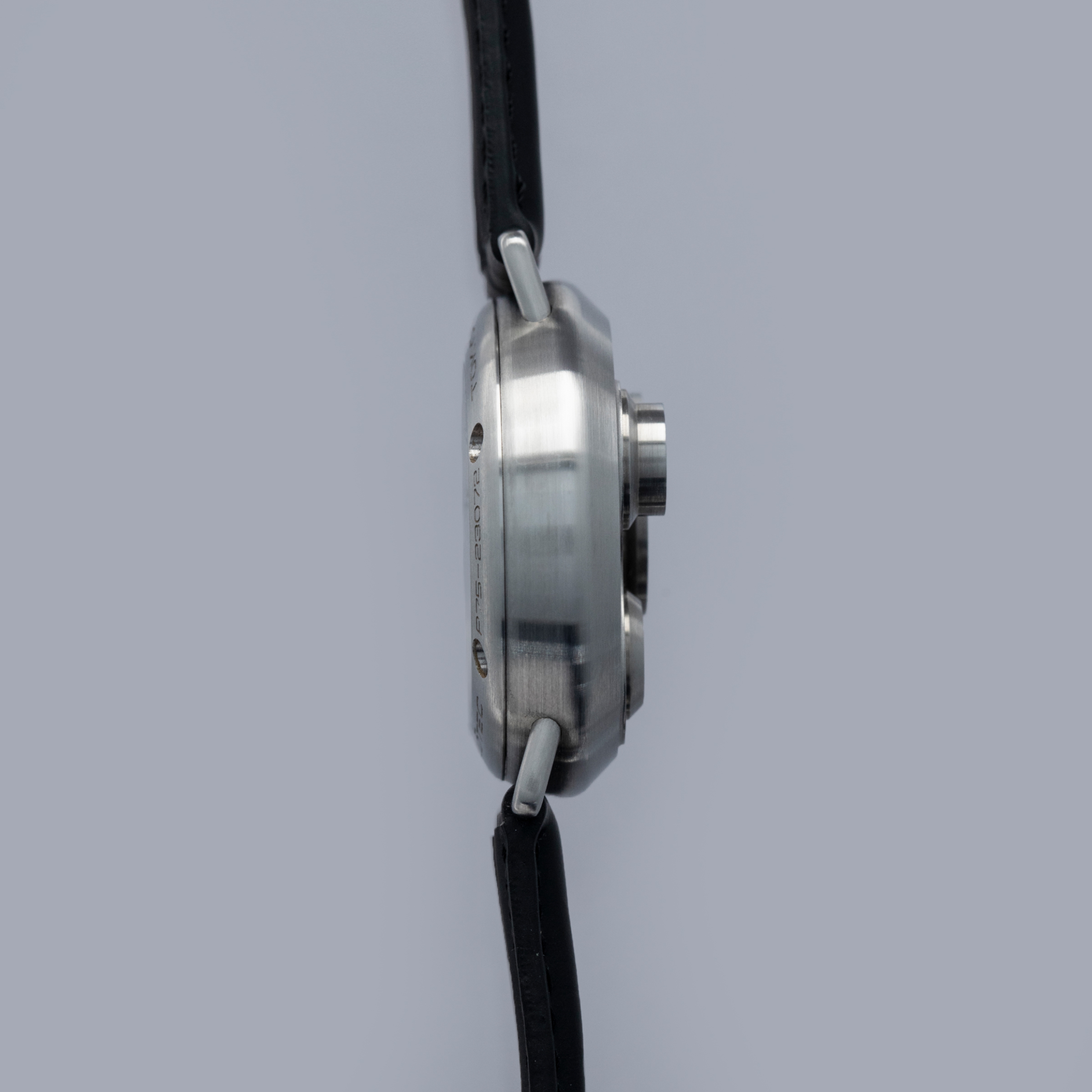 The watch is in near-mint condition. The case has very light signs of wear. The leather strap and stainless steel buckle are in excellent condition. It comes complete with its box and papers.