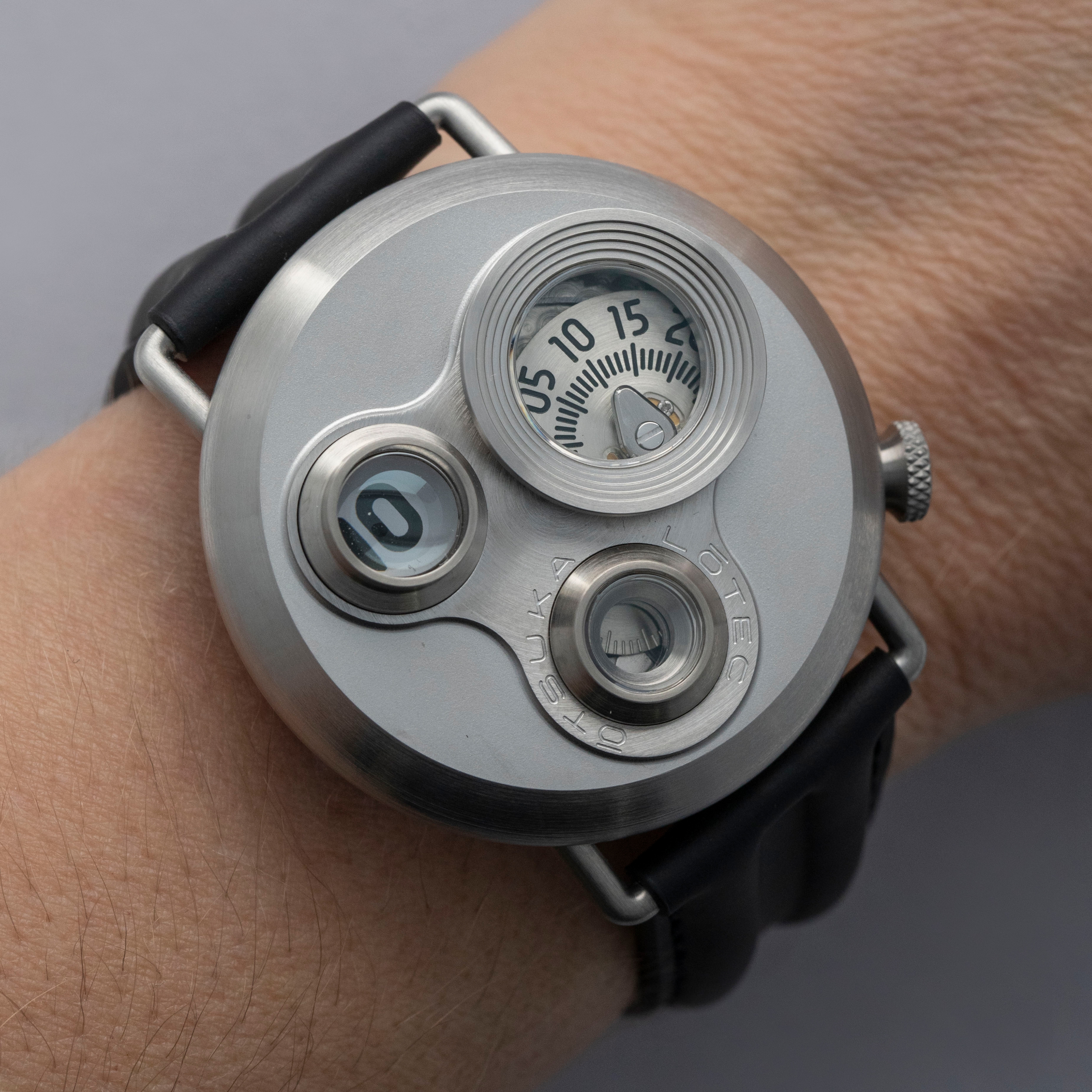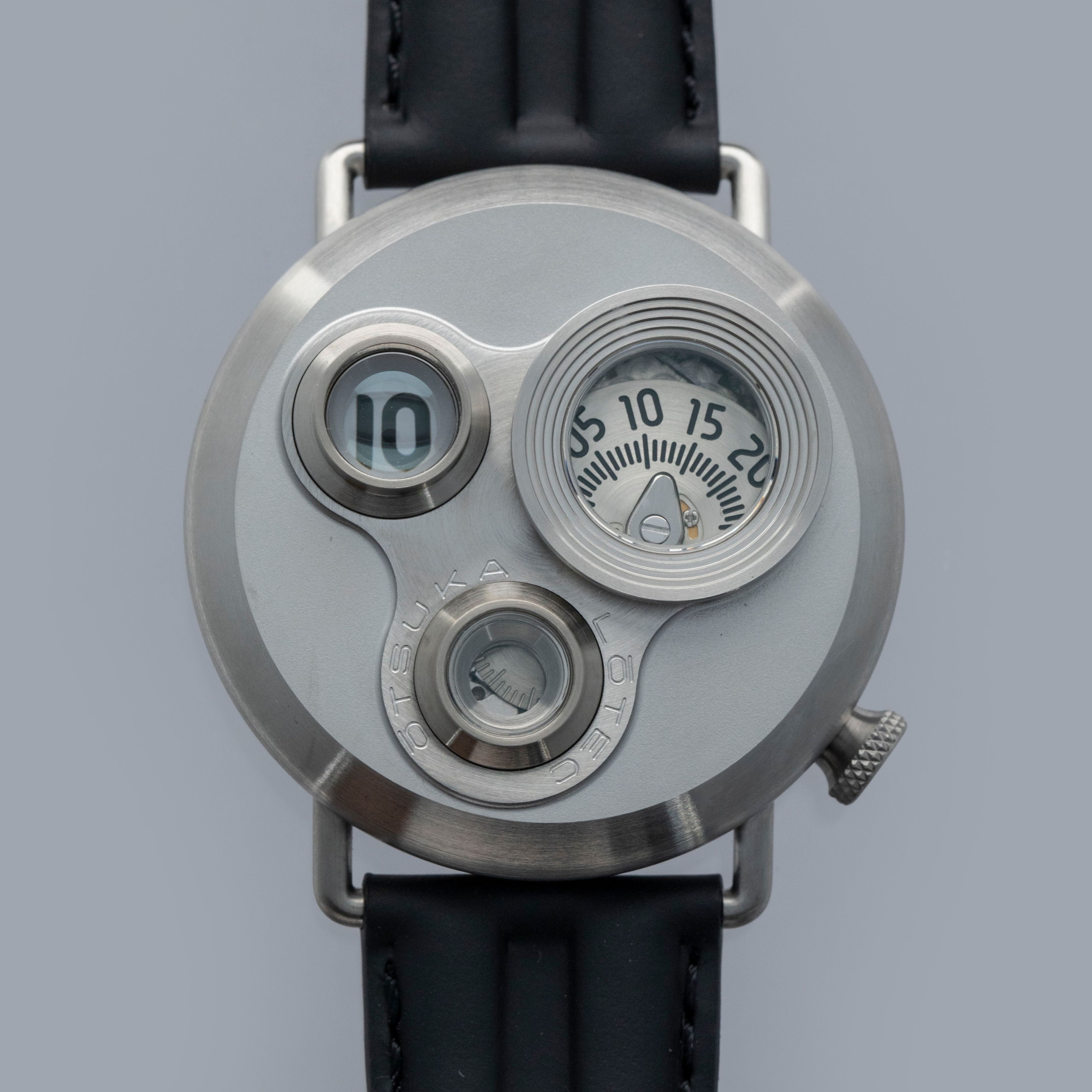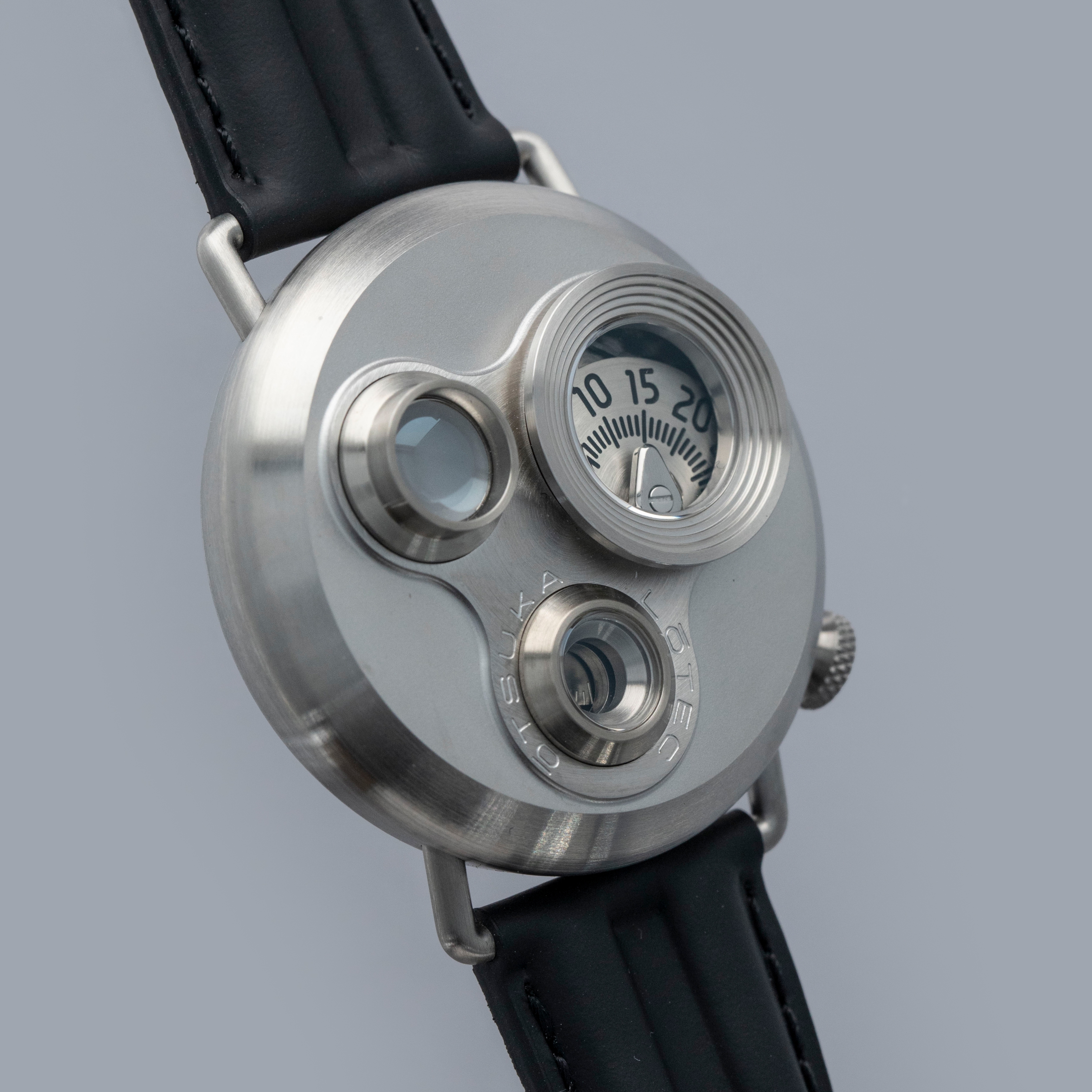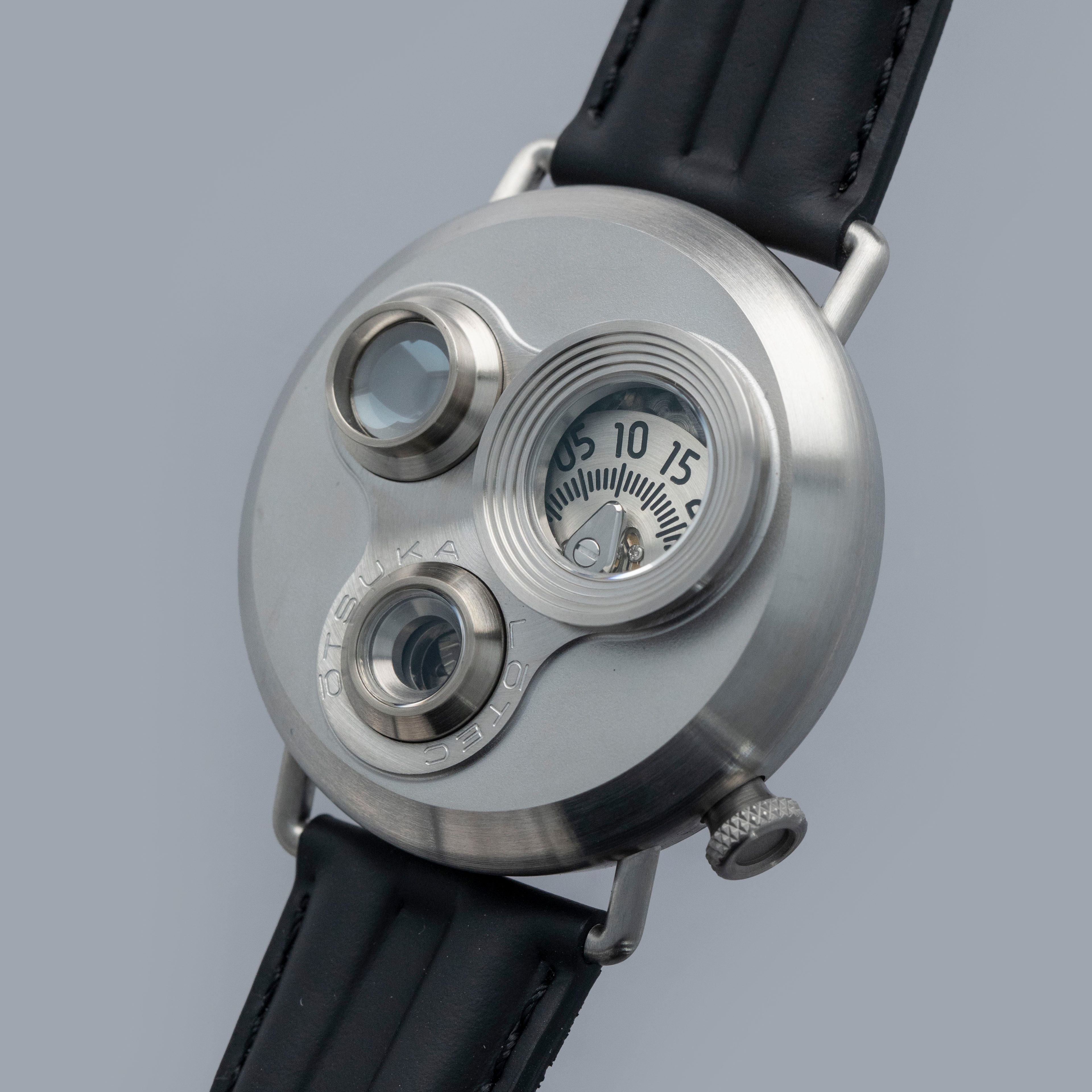 Decidedly unique and industrial, the No. 7.5's 40mm case features all brushed surfaces atop its case and bezel that reveal Otsuka Lotec's function over form design thesis.