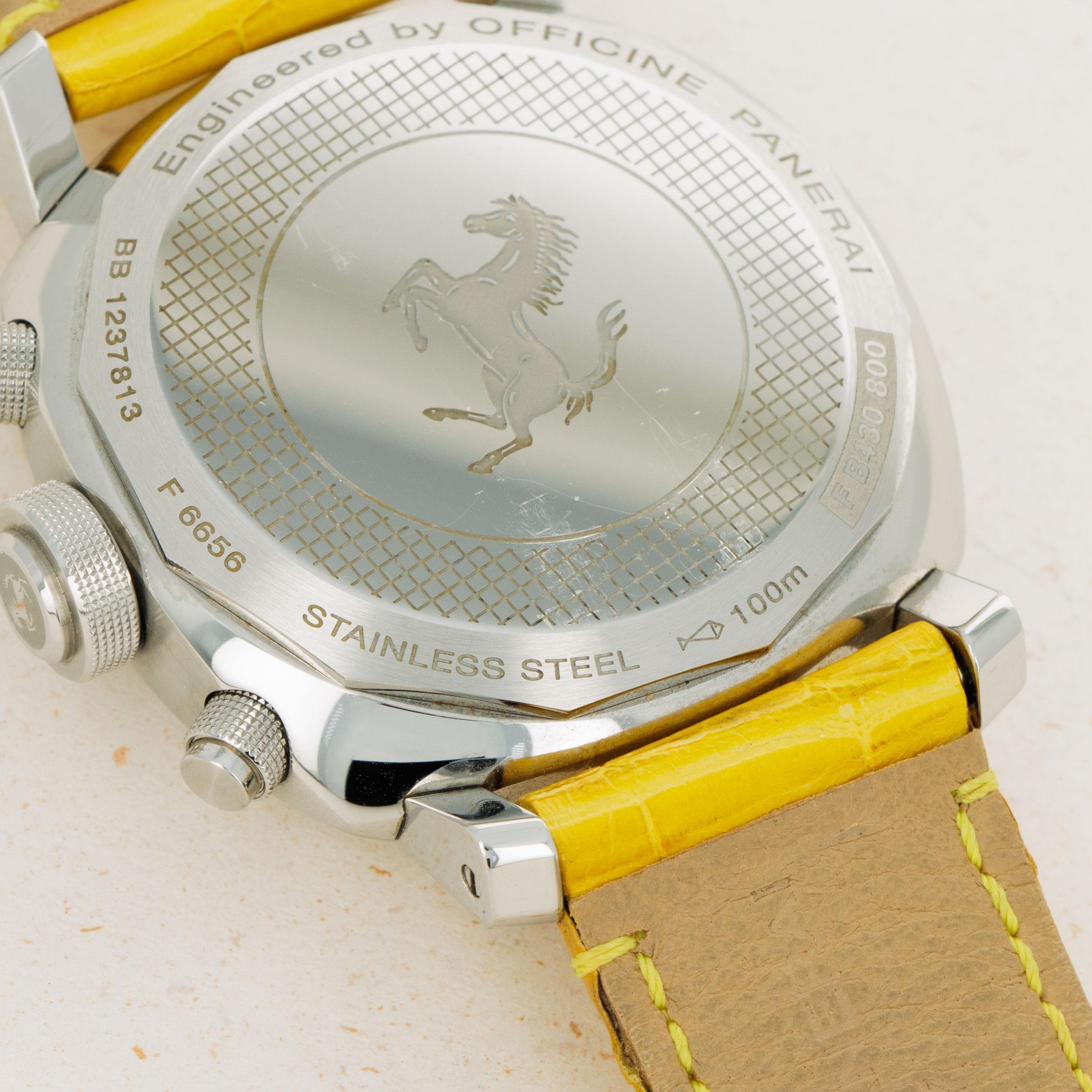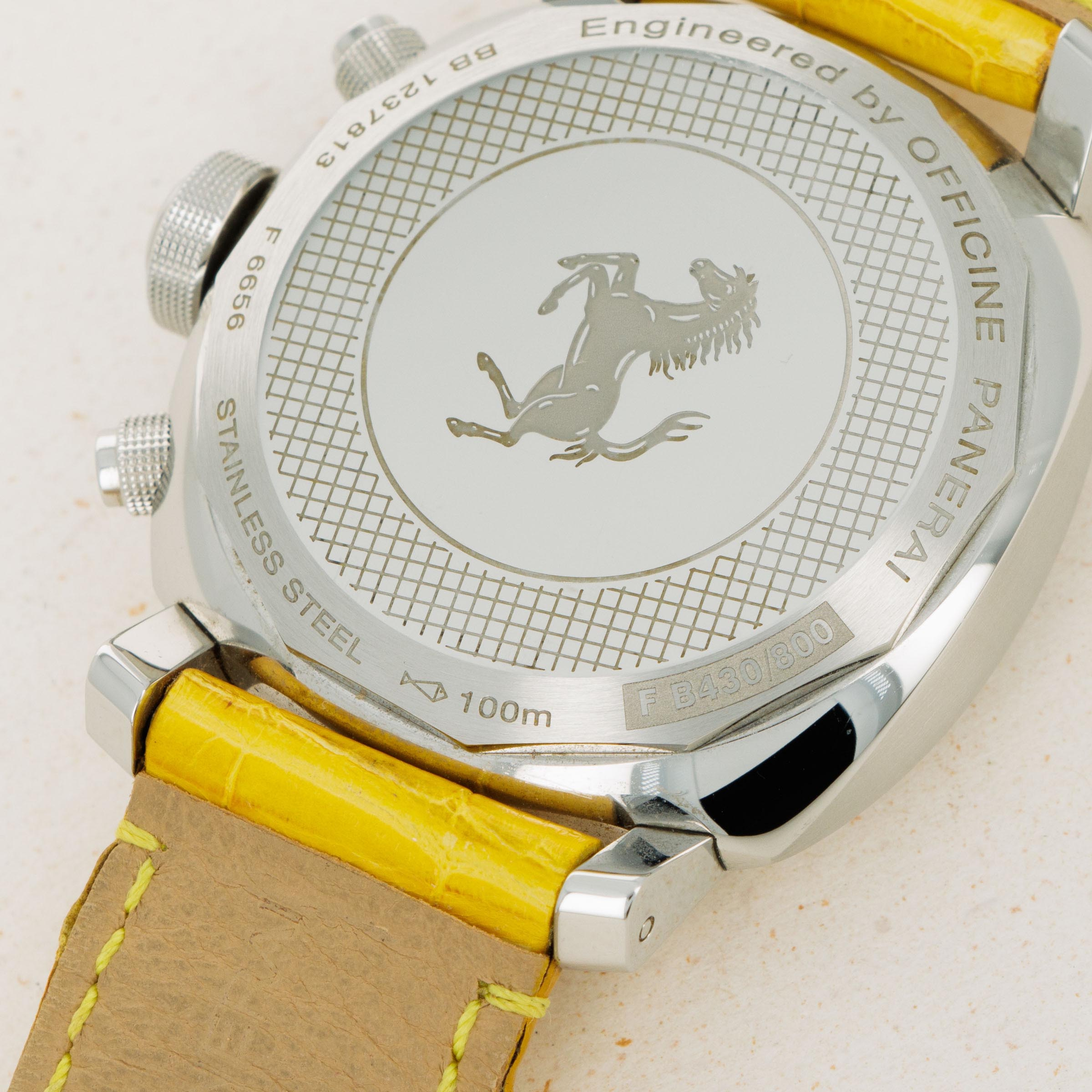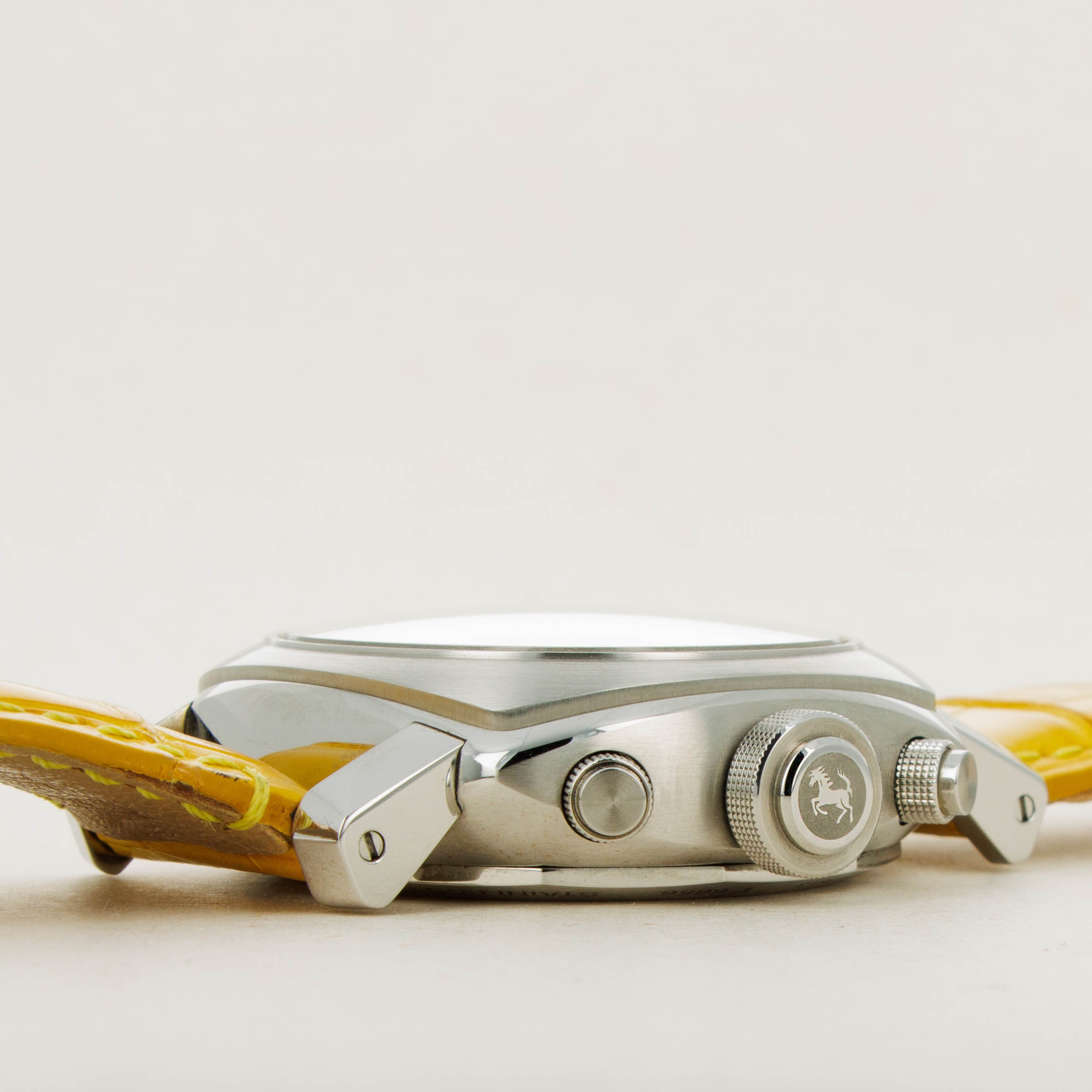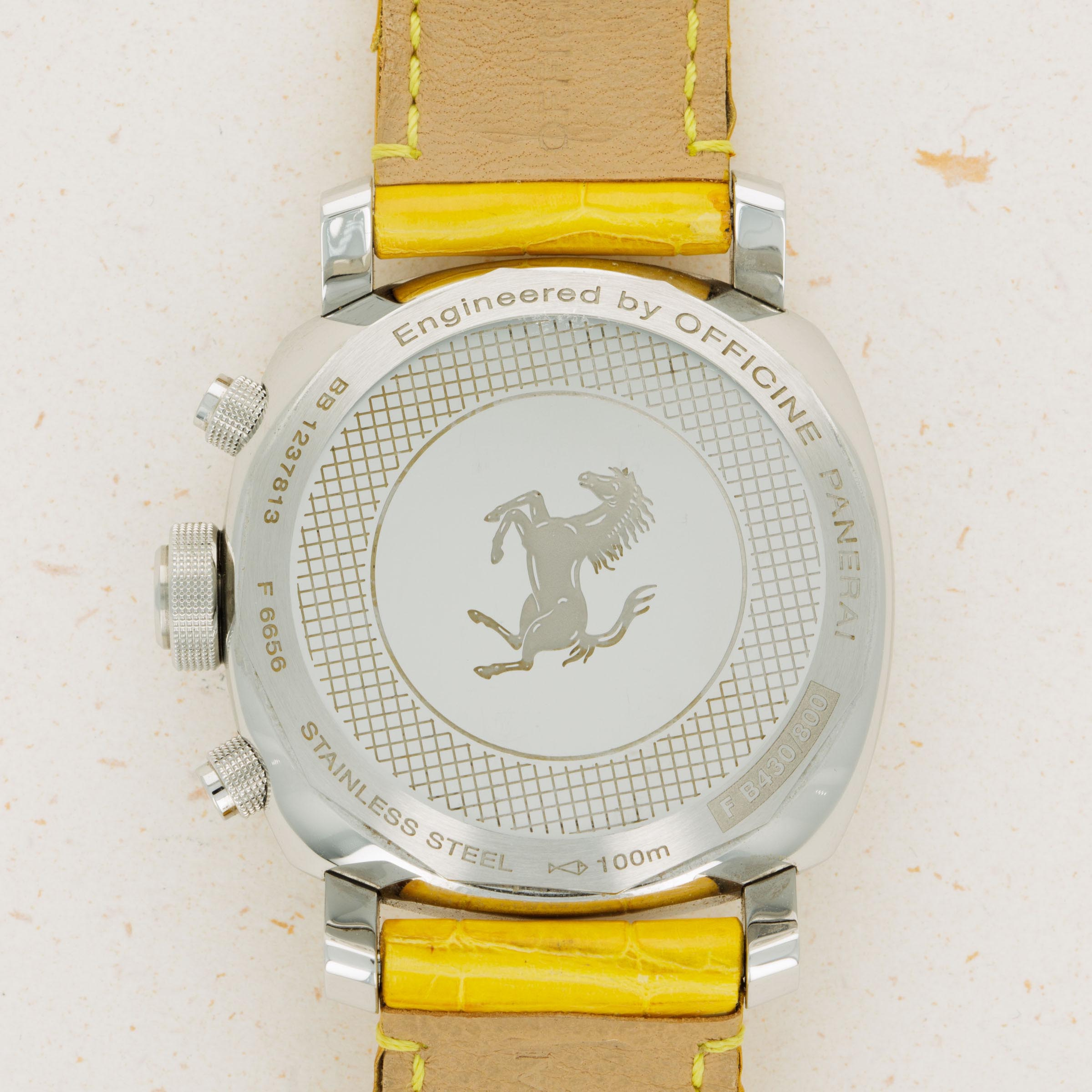 Lacking an Panerai branding and boasting Ferrari's Prancing Horse alongside a rich yellow color; one of Ferrari's most iconic options, this Gran Turismo Chronograph leaves no ambiguity as to who it was created for.