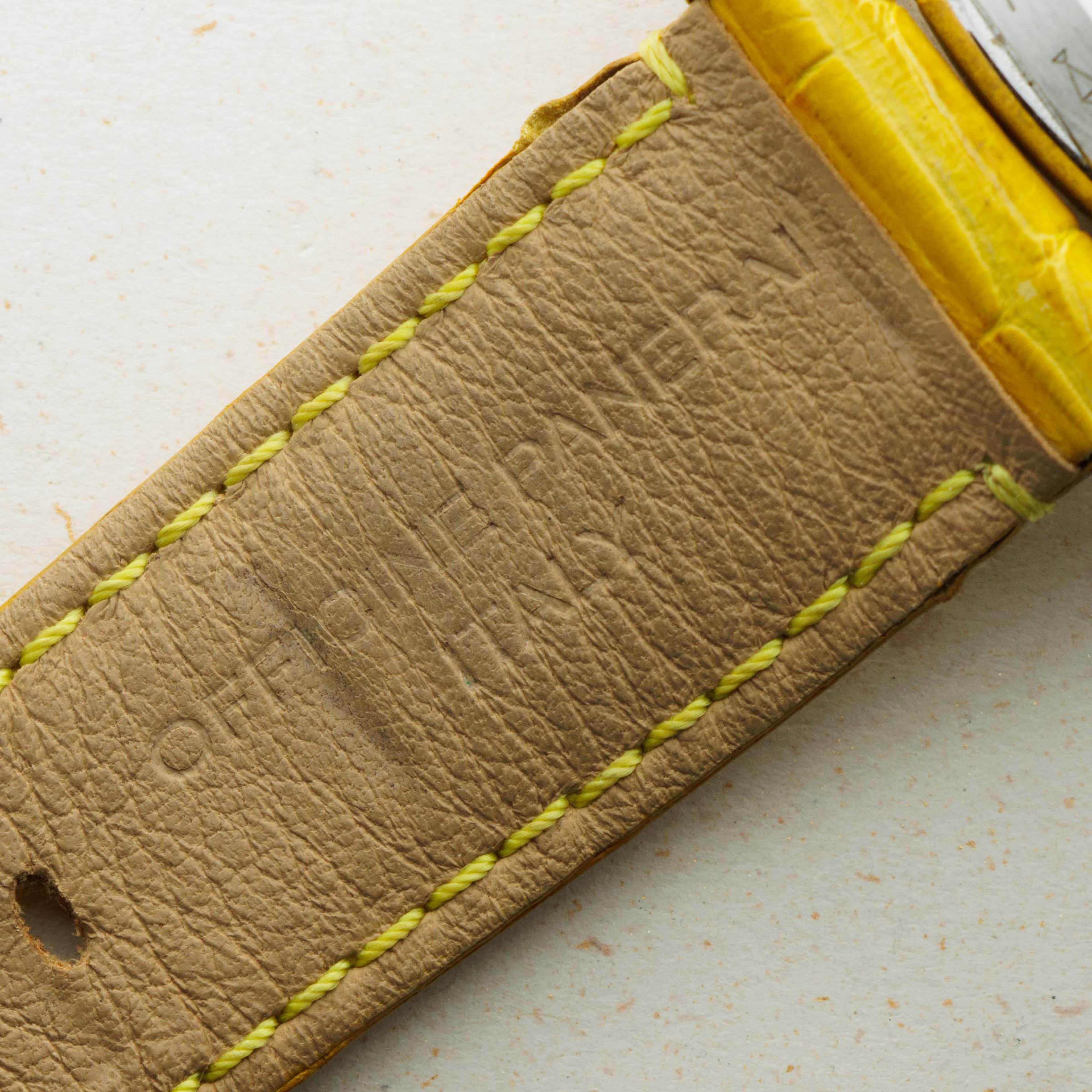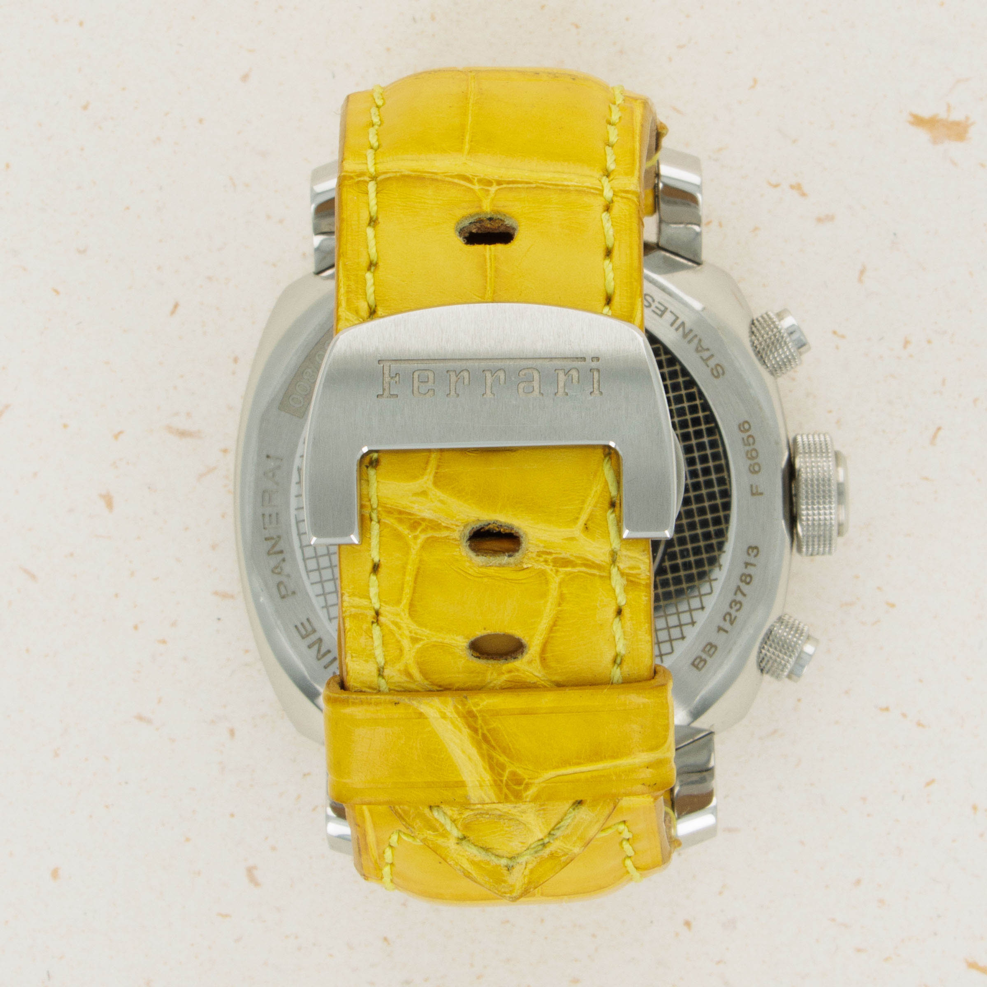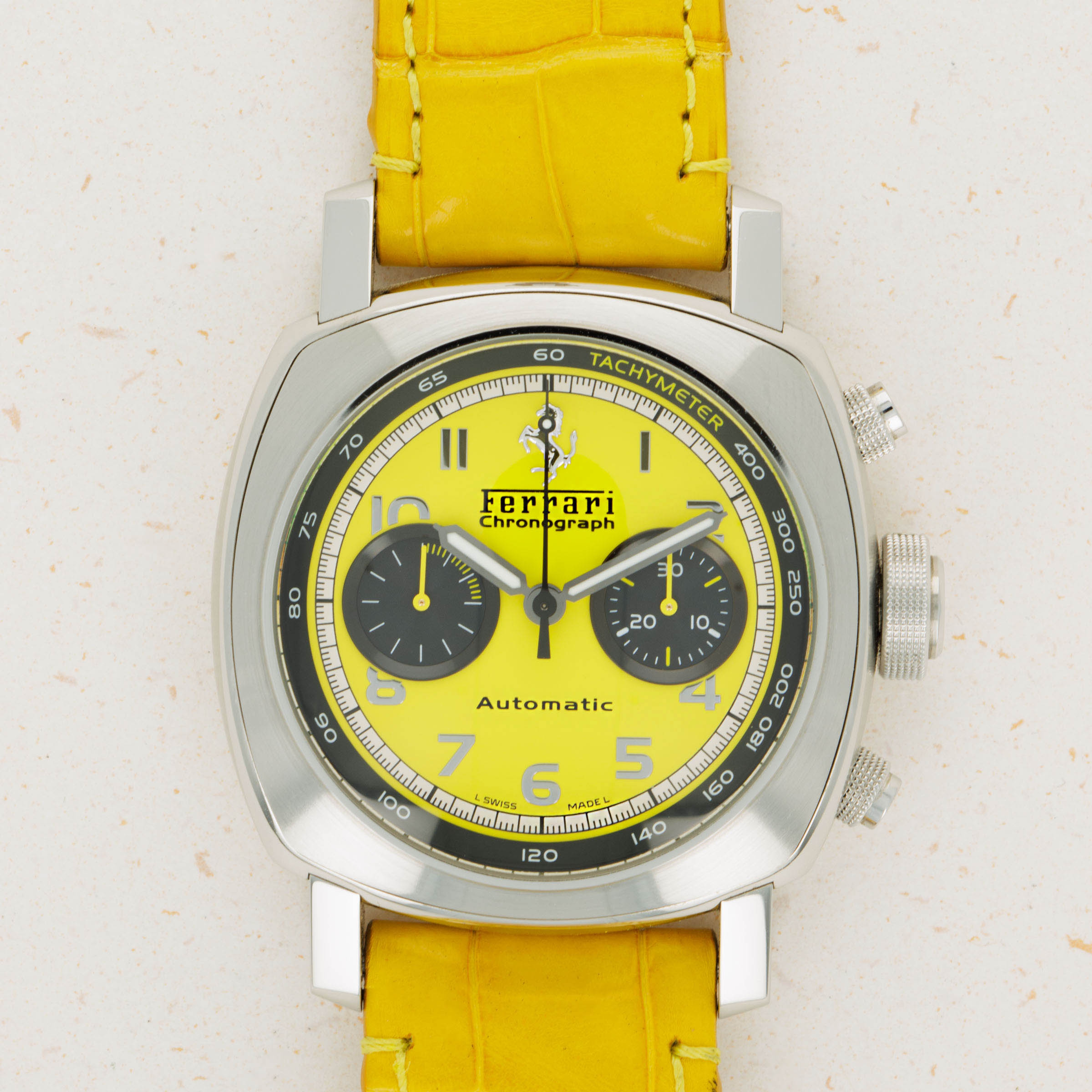 Lacking an Panerai branding and boasting Ferrari's Prancing Horse alongside a rich yellow color; one of Ferrari's most iconic options, this Gran Turismo Chronograph leaves no ambiguity as to who it was created for.