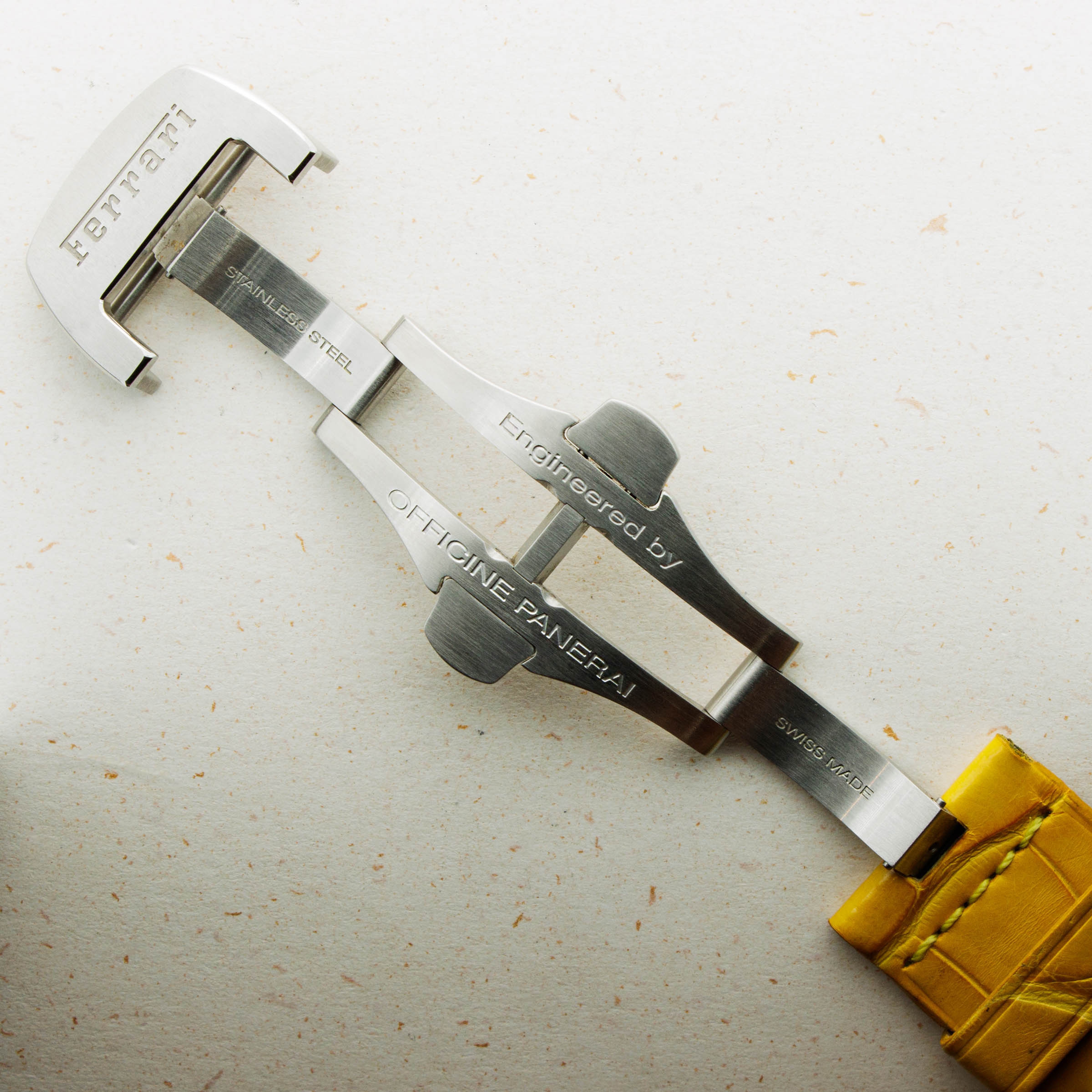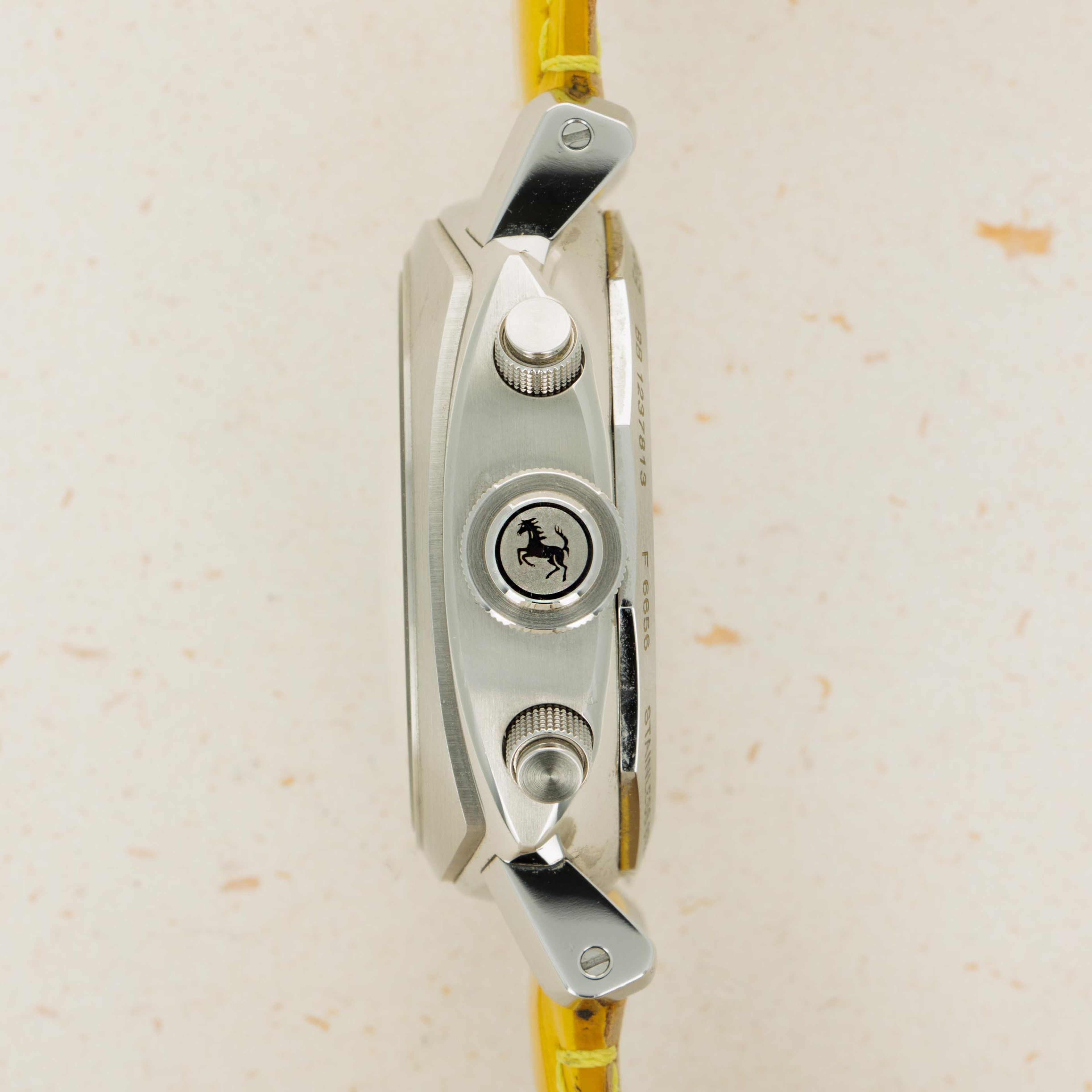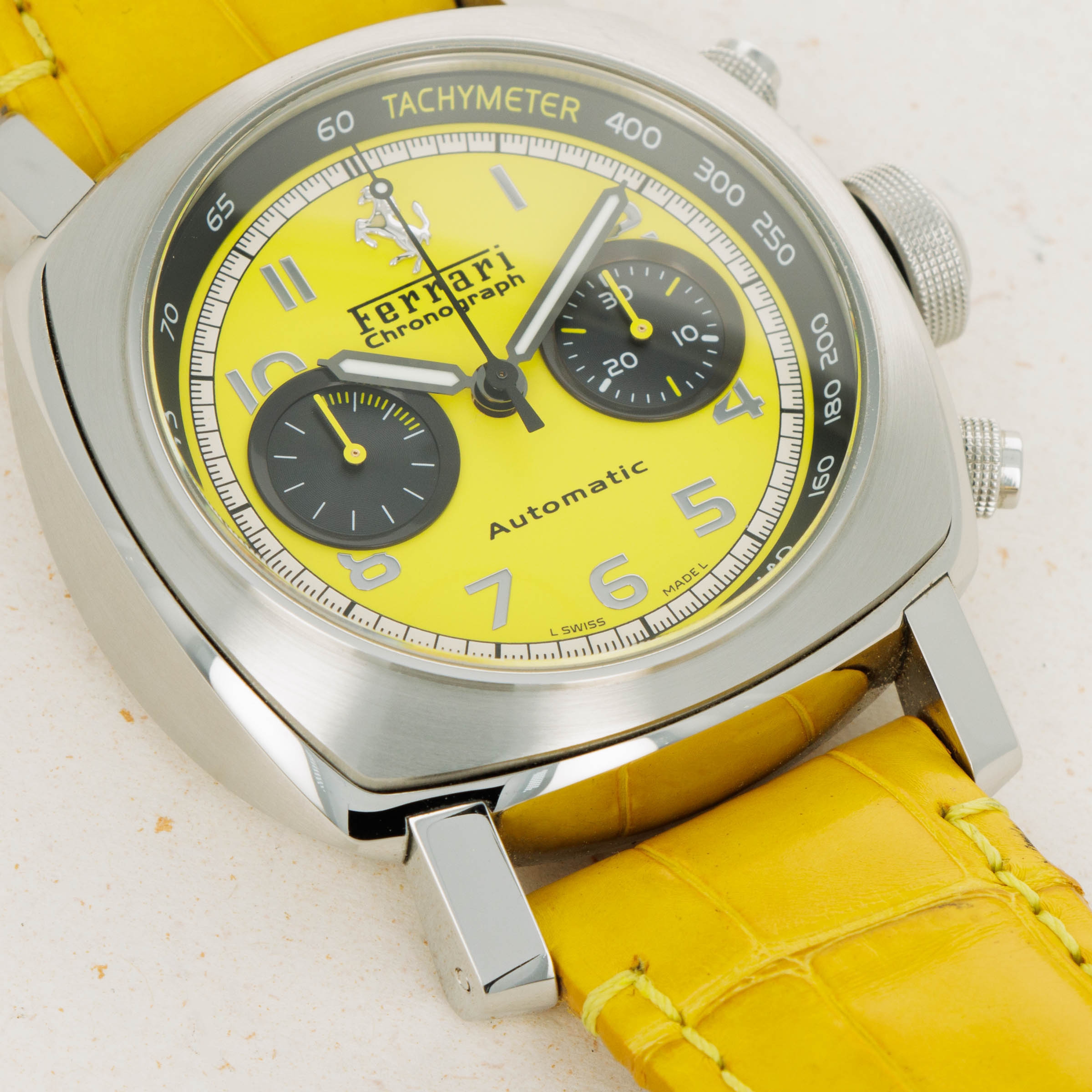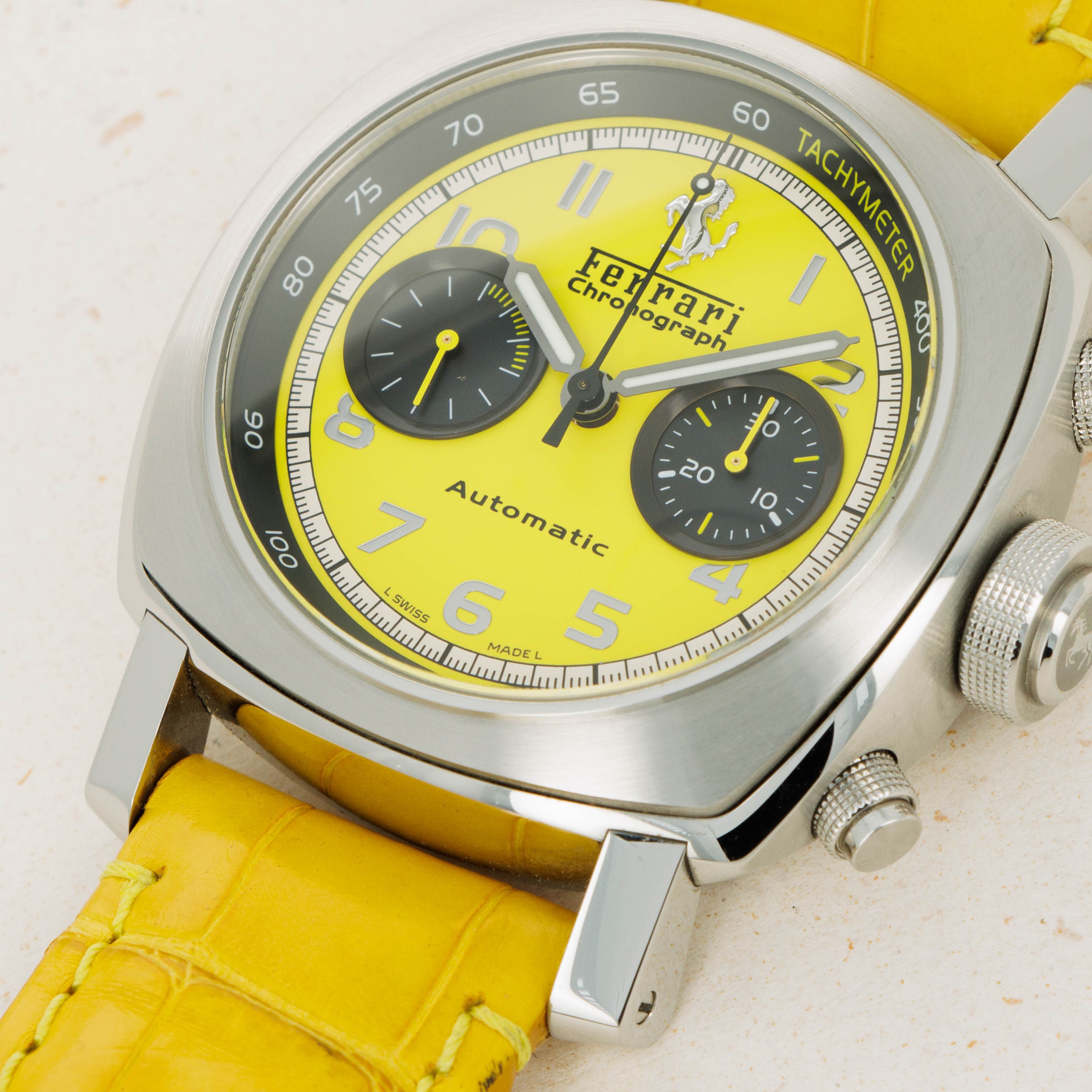 Lacking an Panerai branding and boasting Ferrari's Prancing Horse alongside a rich yellow color; one of Ferrari's most iconic options, this Gran Turismo Chronograph leaves no ambiguity as to who it was created for.