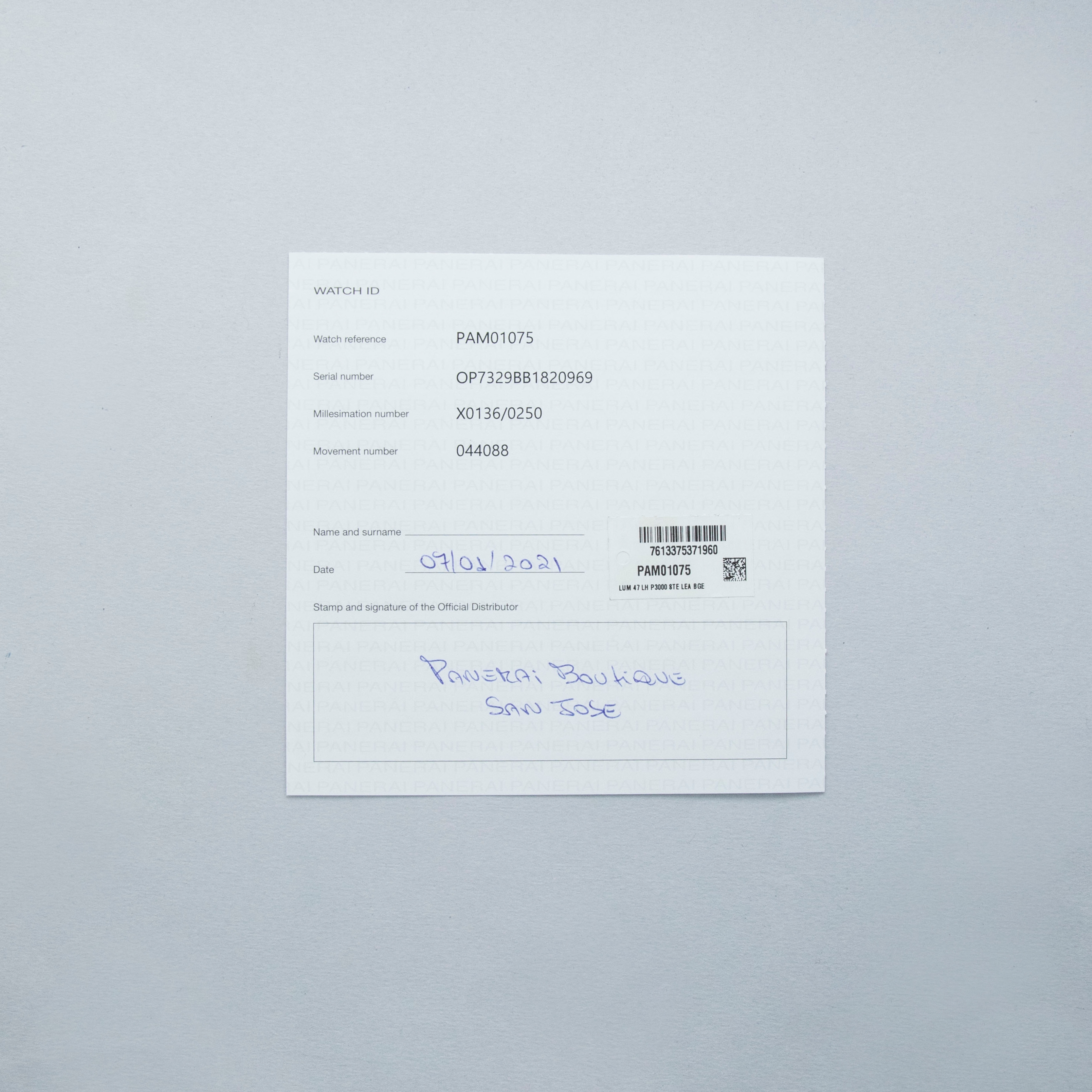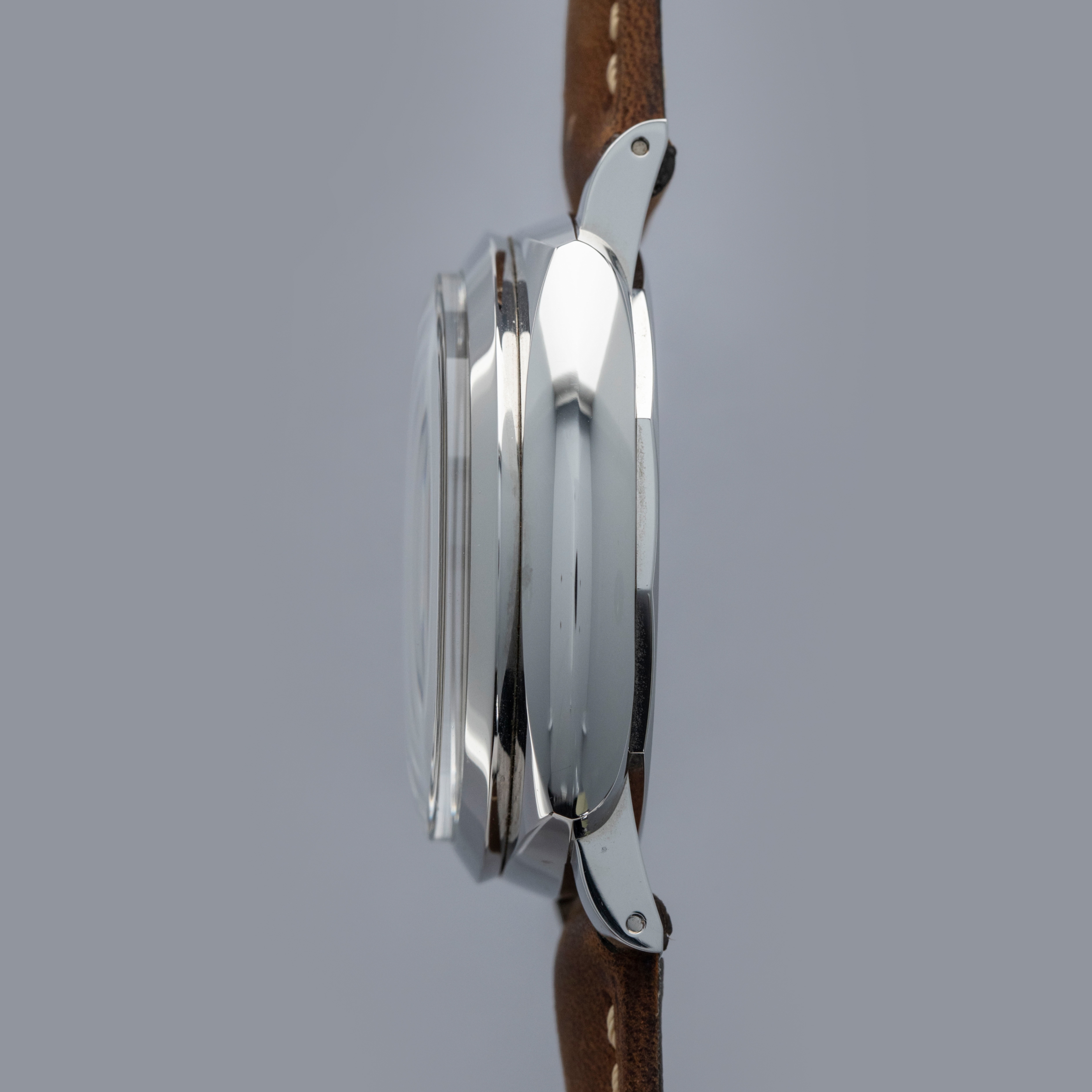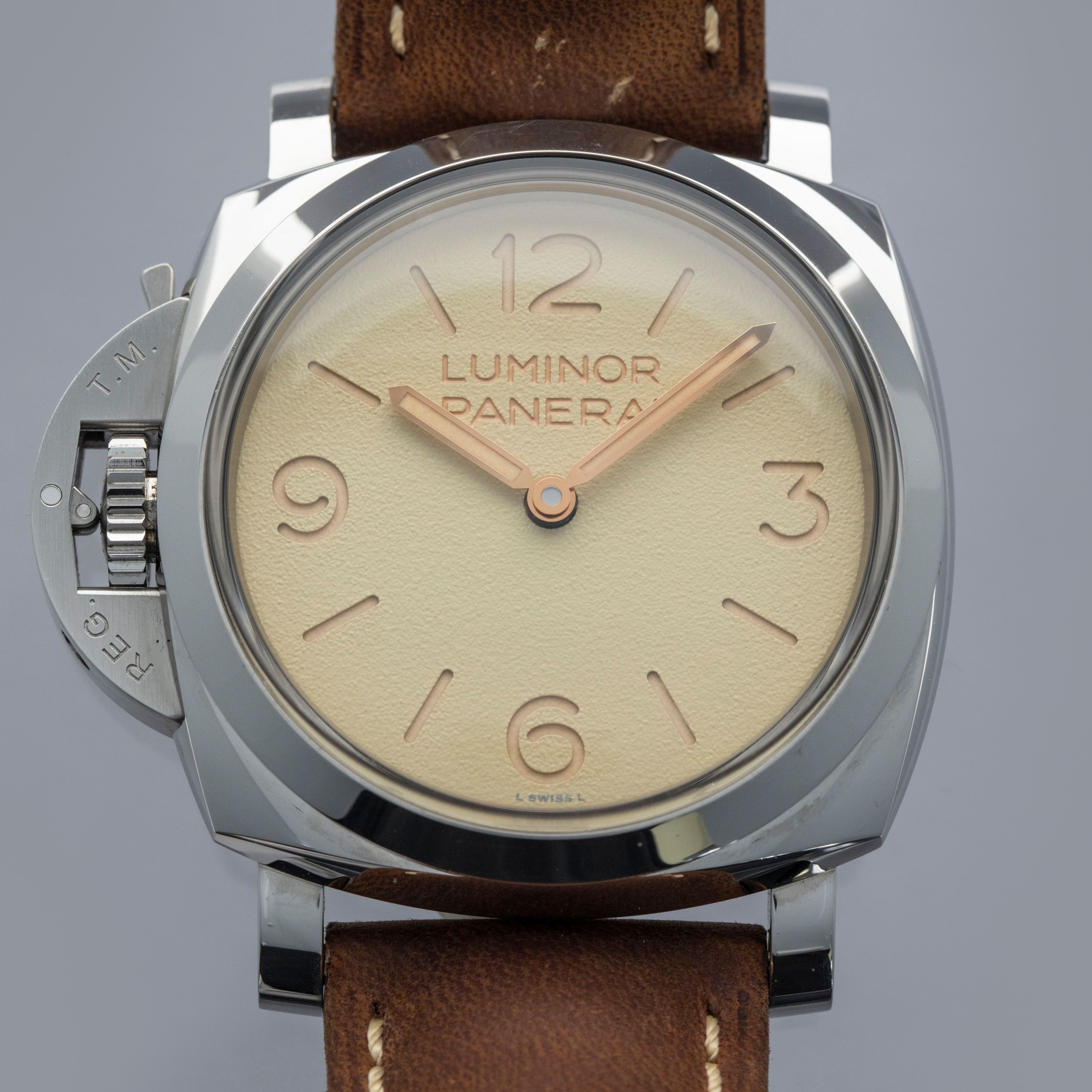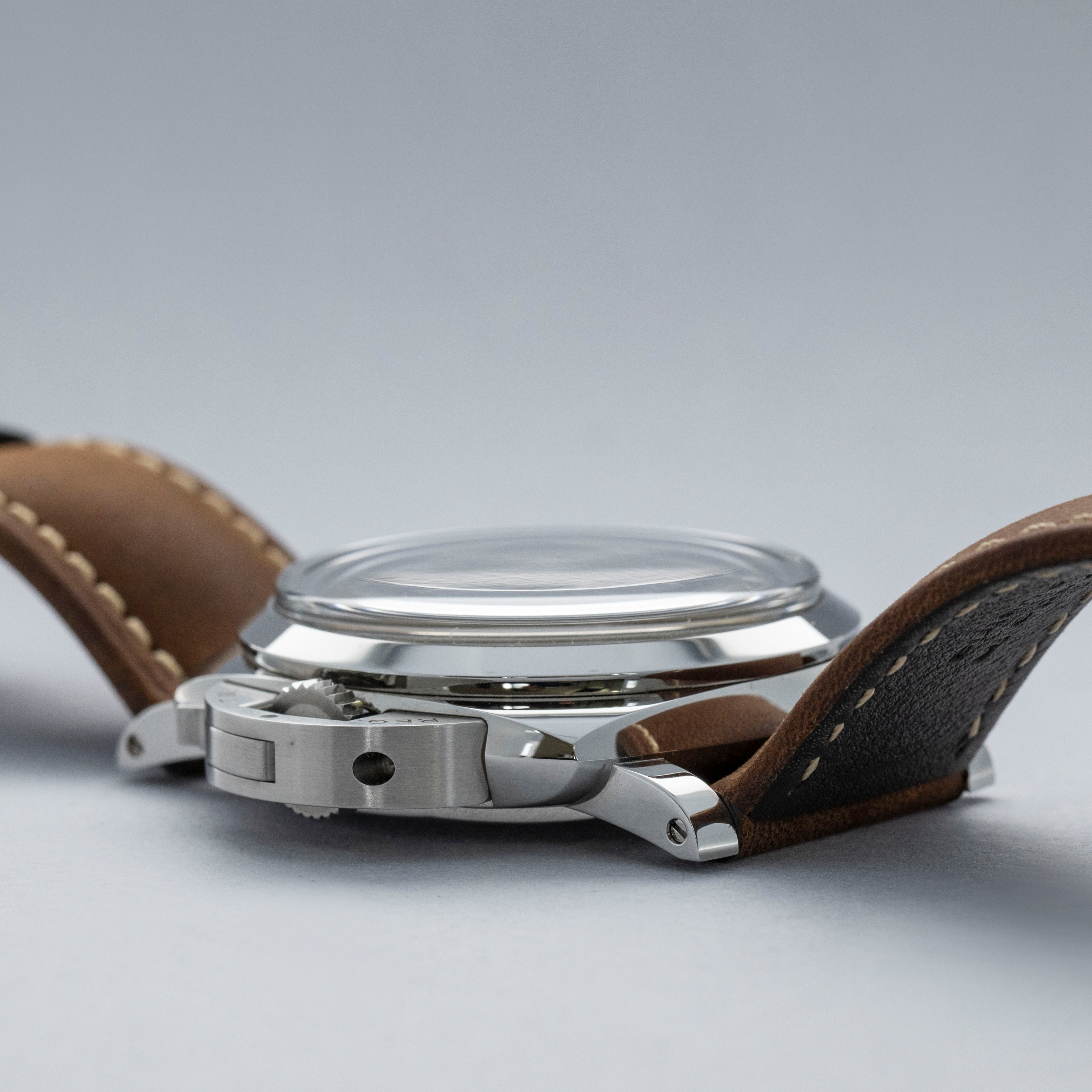 Featuring the Luminor 1950's robust 47mm cushion-shaped construction and Panerai's signature crown-locking mechanism on the 9 o'clock side for a left-handed wearer, the PAM1075 wears exactly how Paneristis prefer, with its large presence making quite the statement on the wrist.