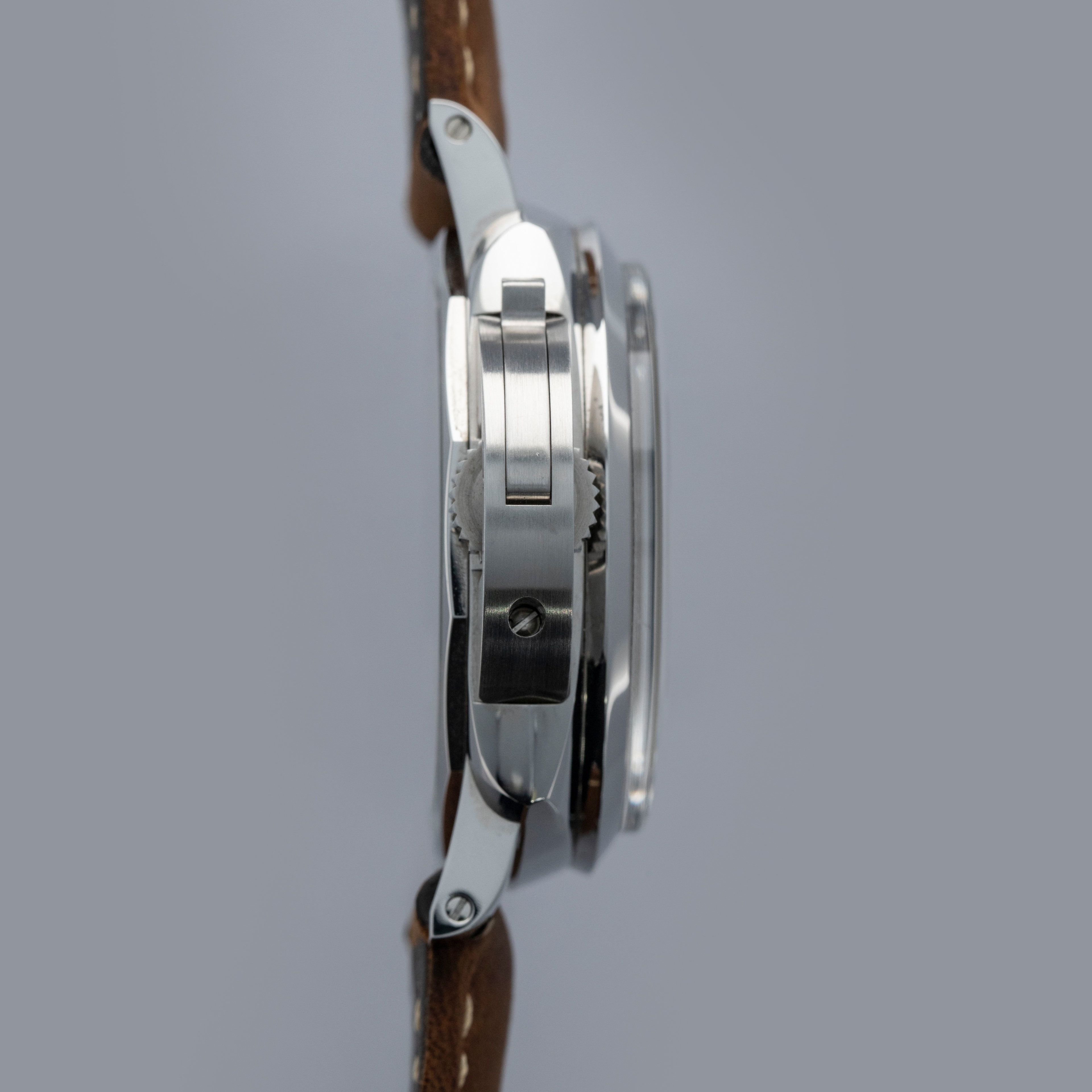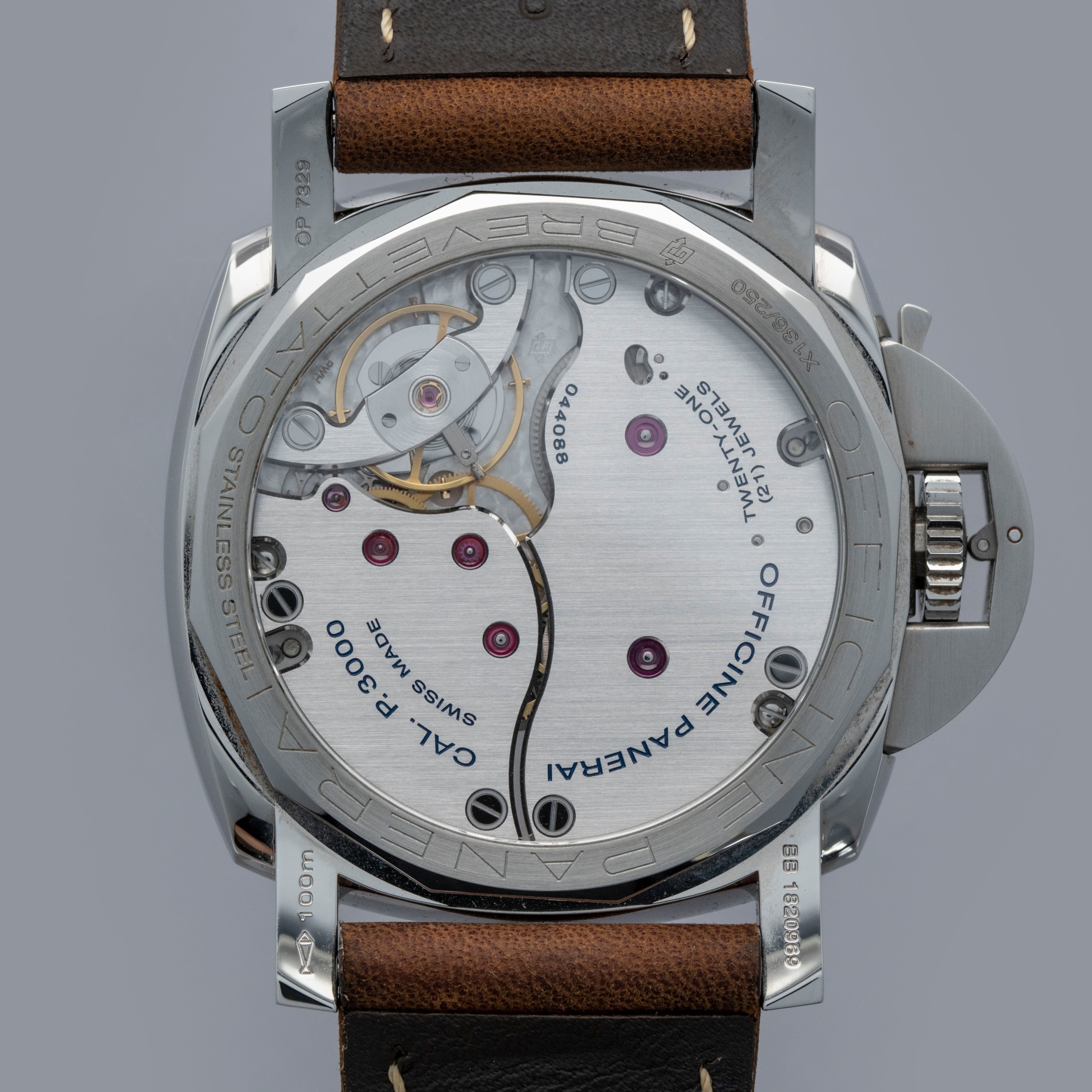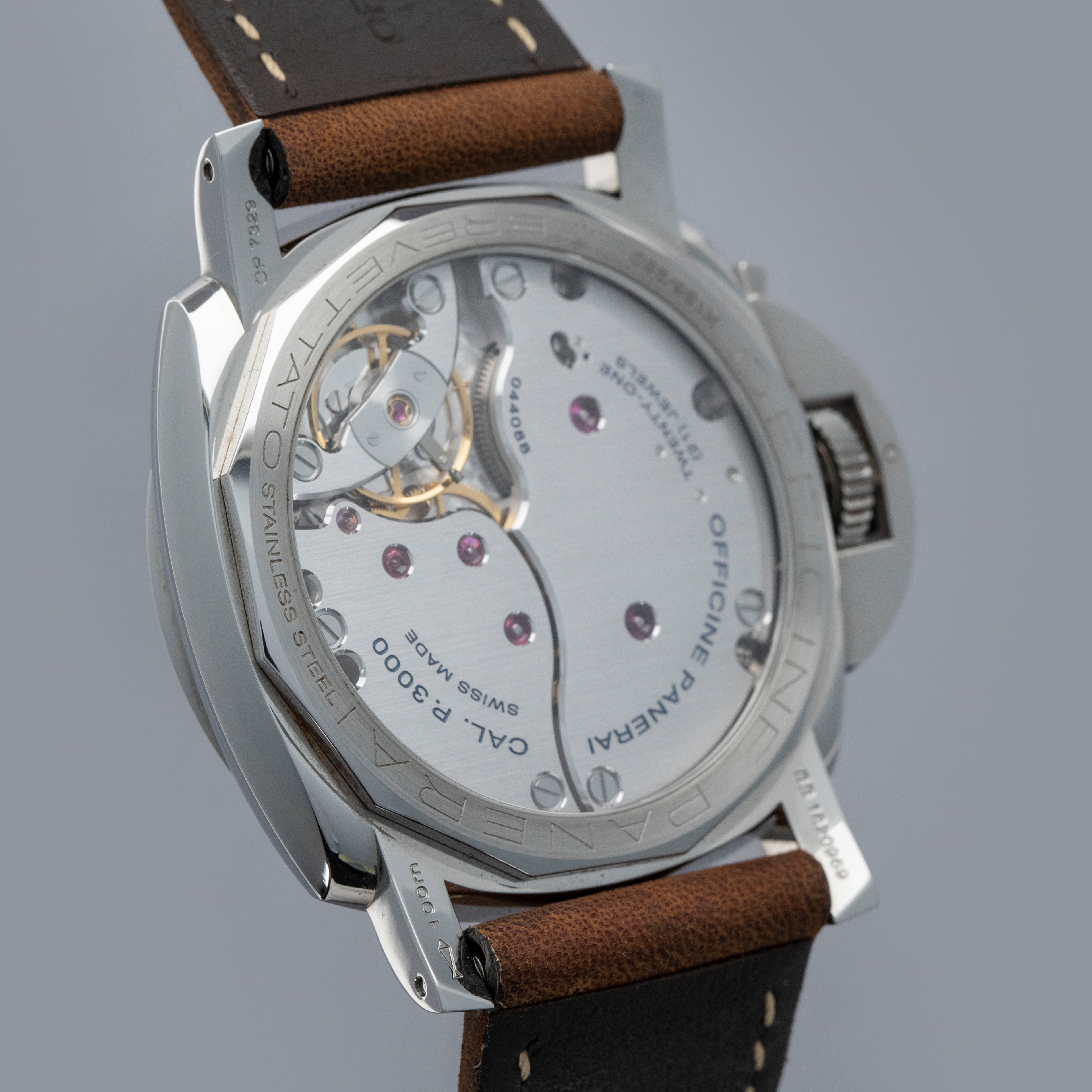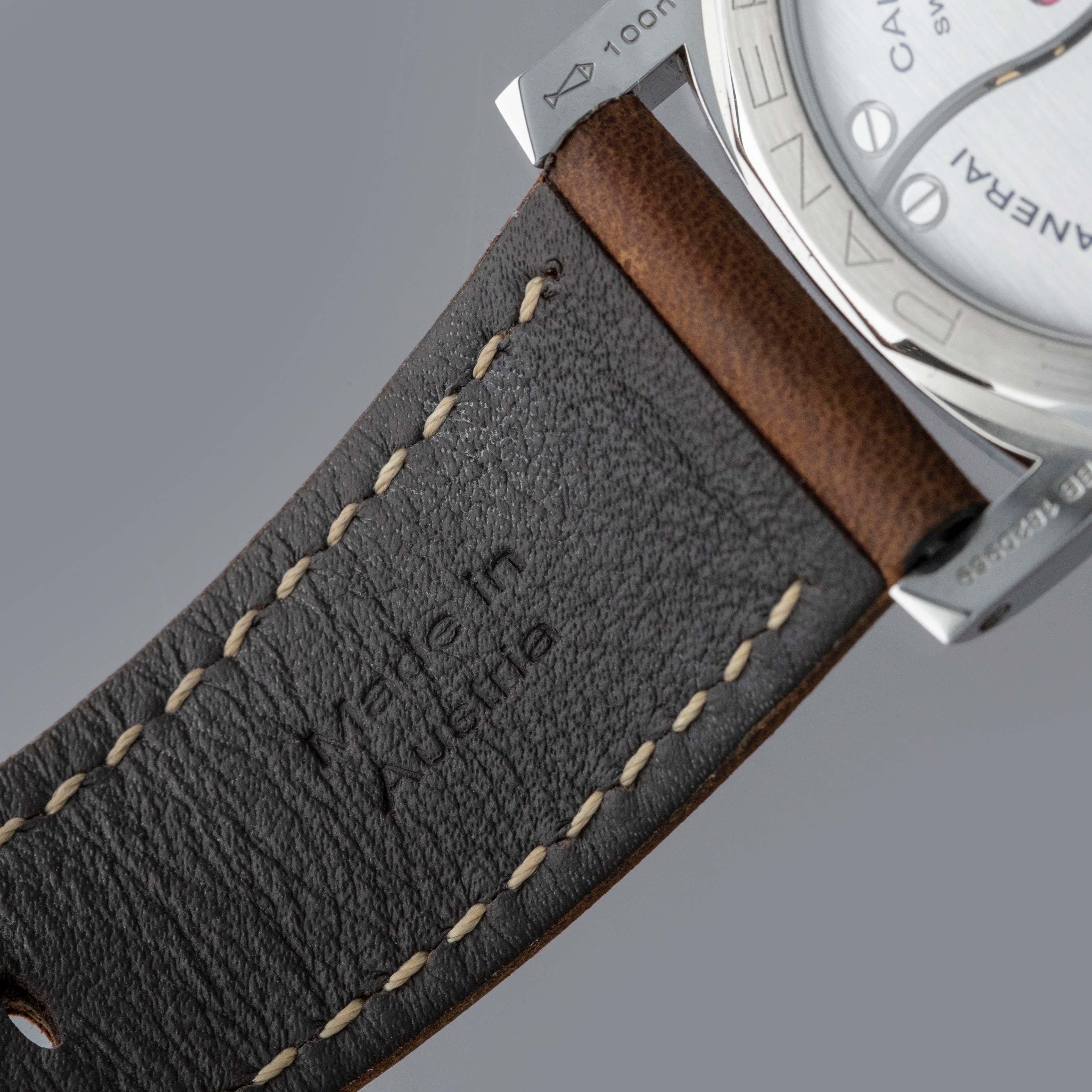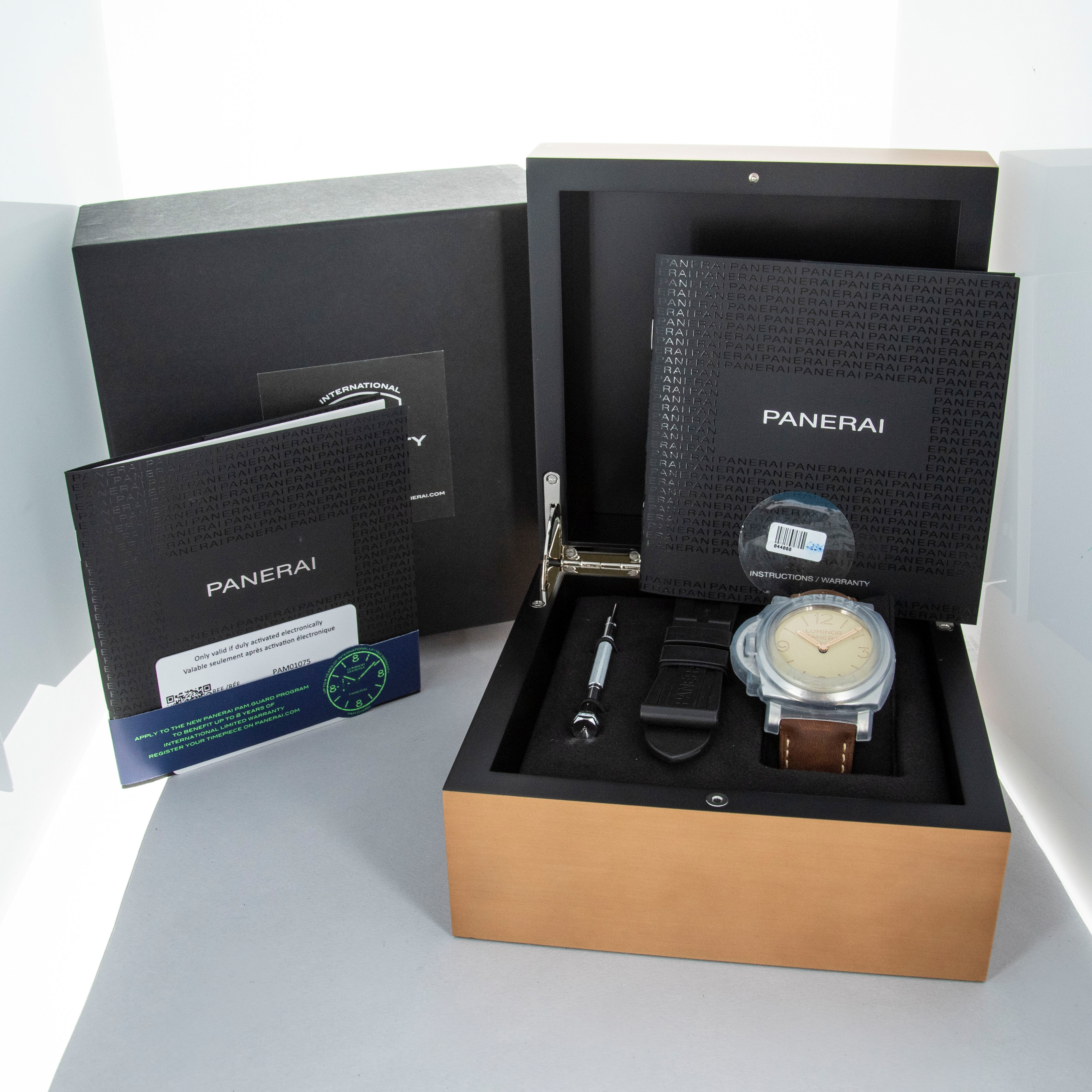 Watch is in overall near-mint condition. The steel case shows signs of wear, with light surface scratches on the bezel and marks visible on the case sides and case back. The dial and hands remain like new. It is fitted with a brown leather strap and a Panerai pin buckle, remaining in near-mint condition, and includes a spare strap and screwdriver. Comes complete with inner and outer boxes, warranty, booklets, case back sticker and associated paperwork.