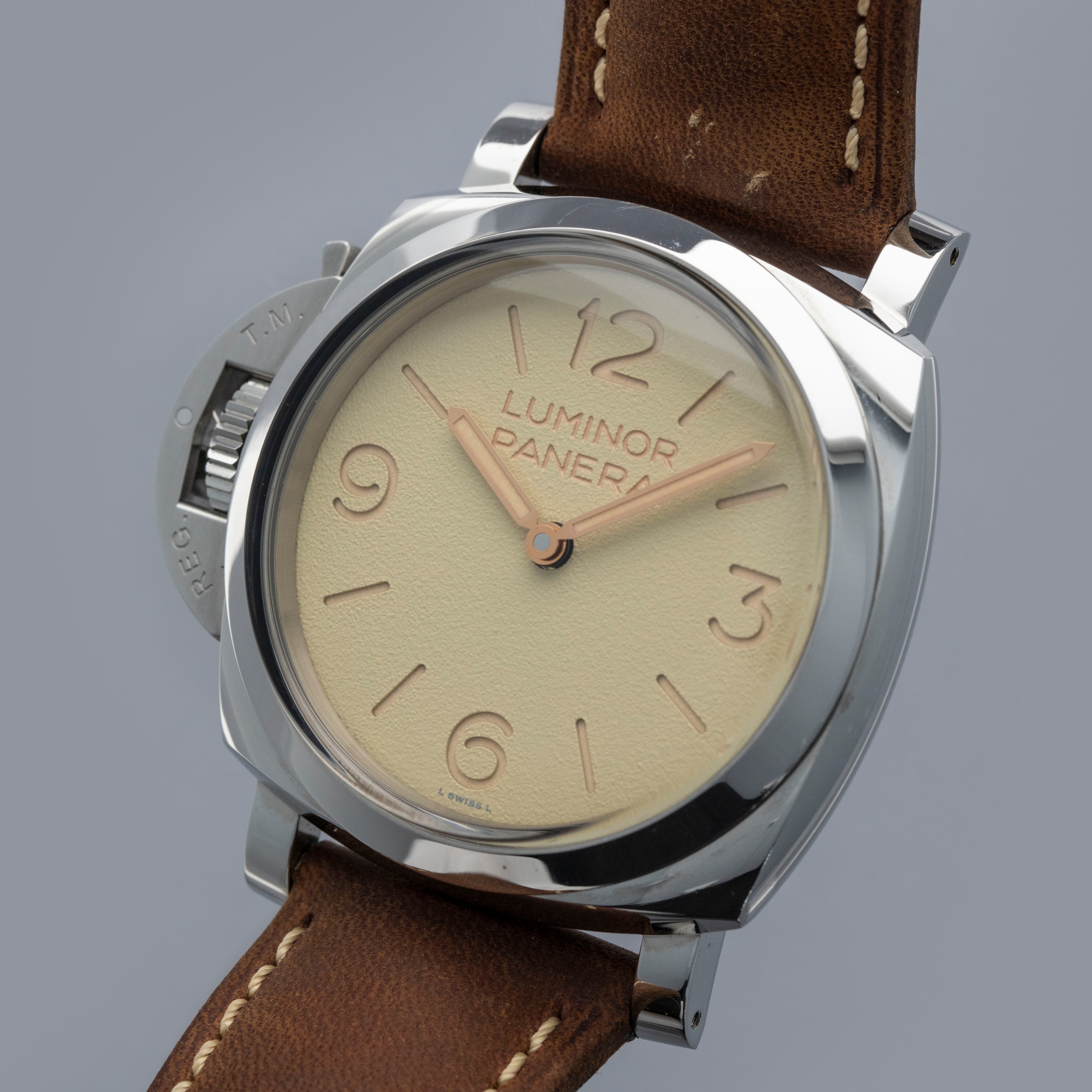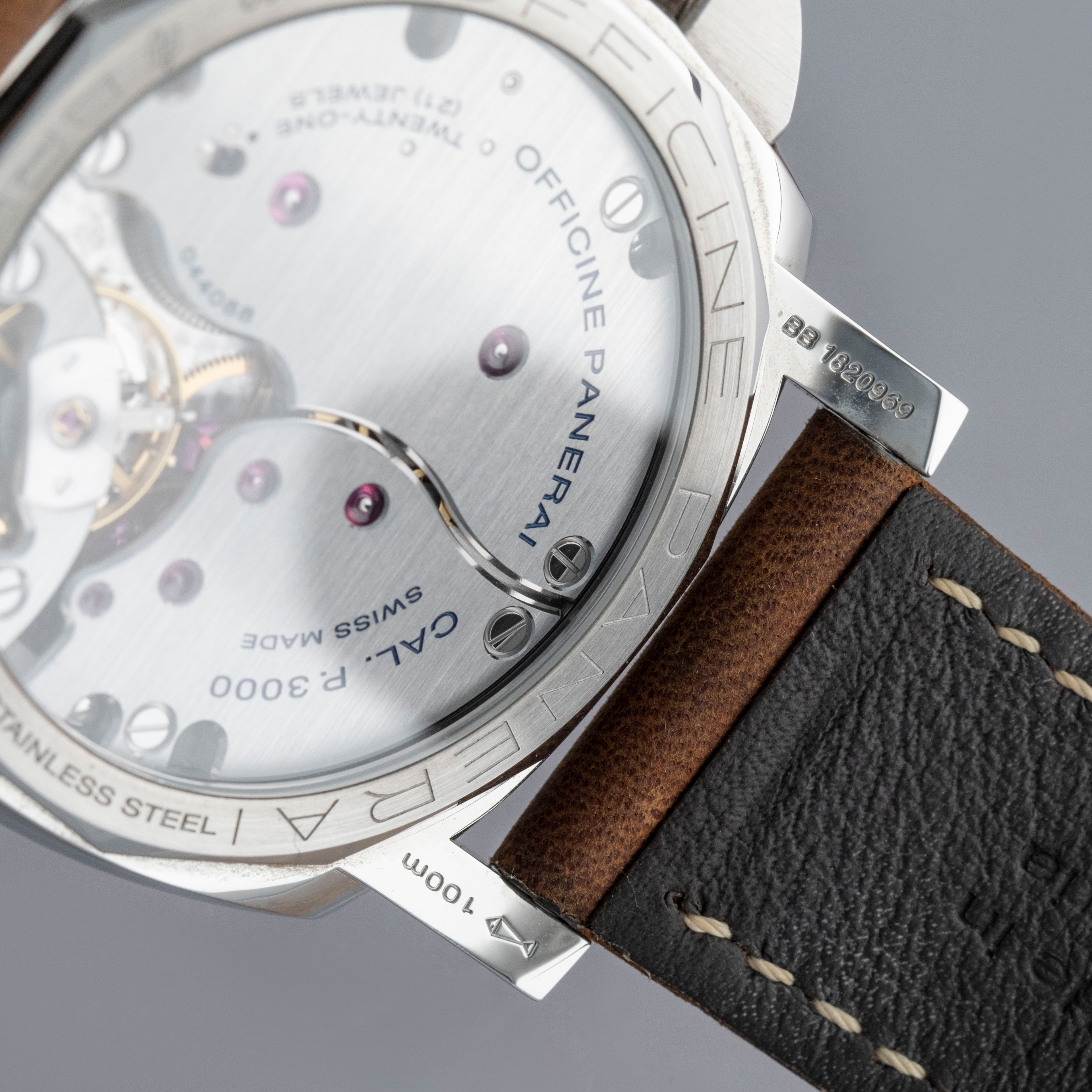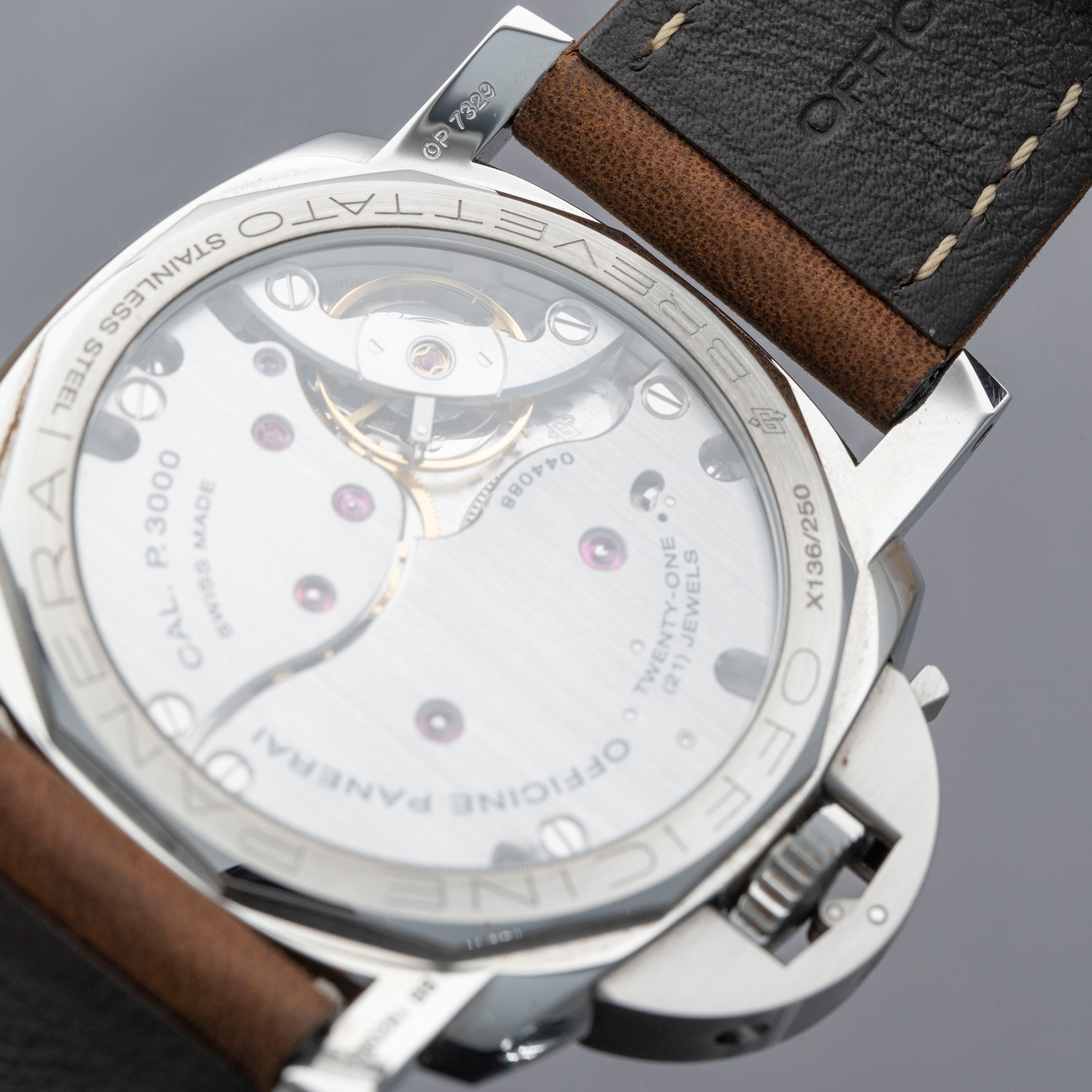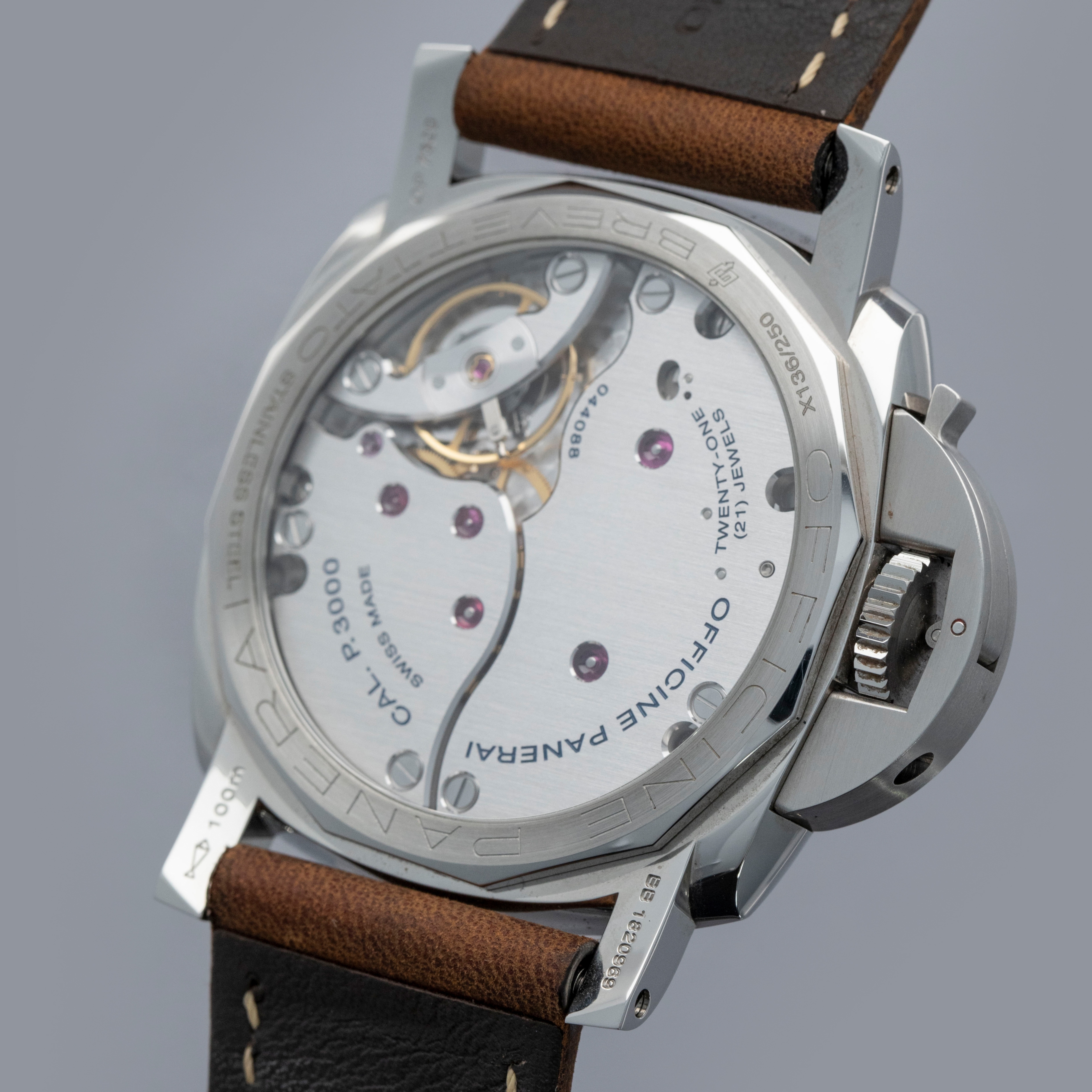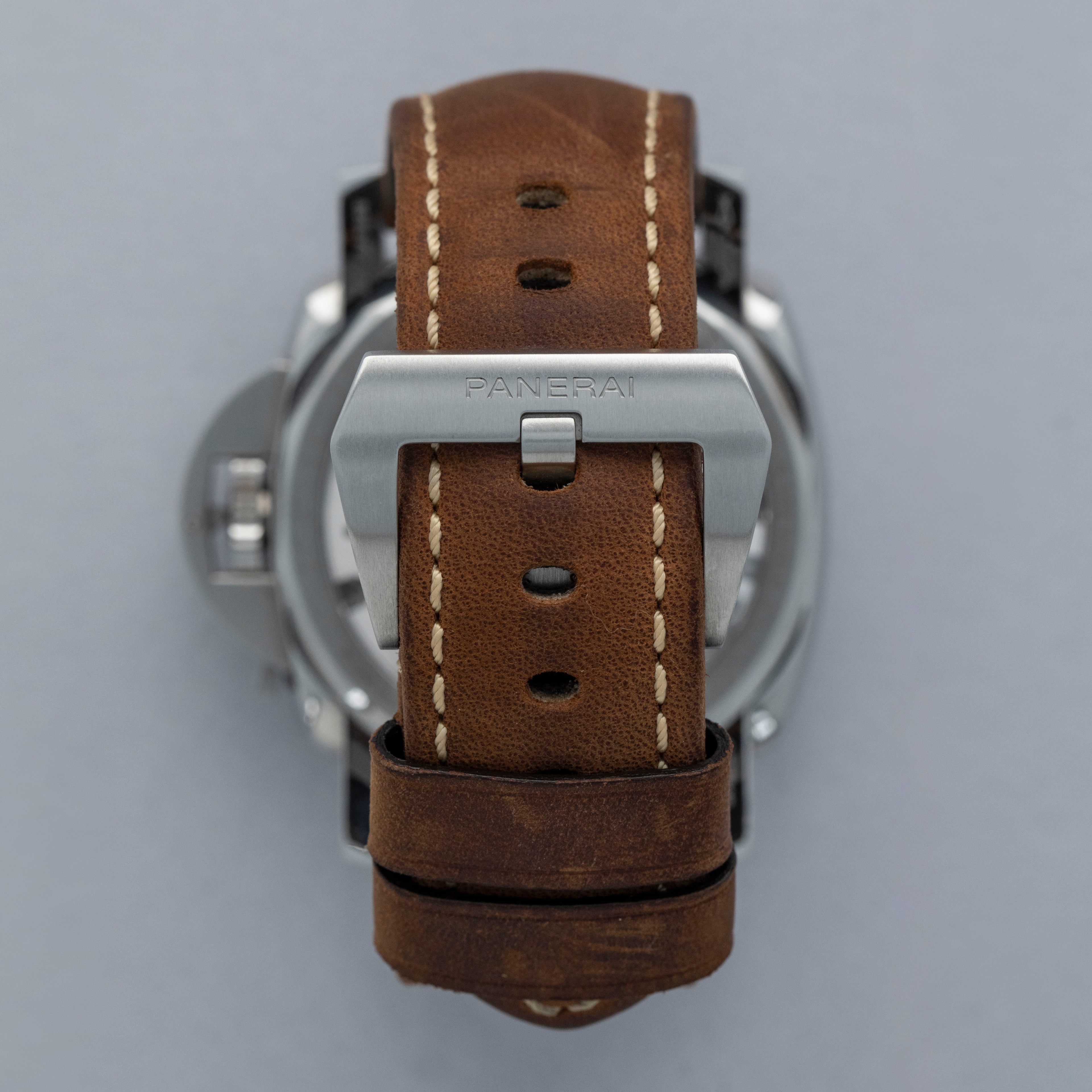 Watch is in overall near-mint condition. The steel case shows signs of wear, with light surface scratches on the bezel and marks visible on the case sides and case back. The dial and hands remain like new. It is fitted with a brown leather strap and a Panerai pin buckle, remaining in near-mint condition, and includes a spare strap and screwdriver. Comes complete with inner and outer boxes, warranty, booklets, case back sticker and associated paperwork.