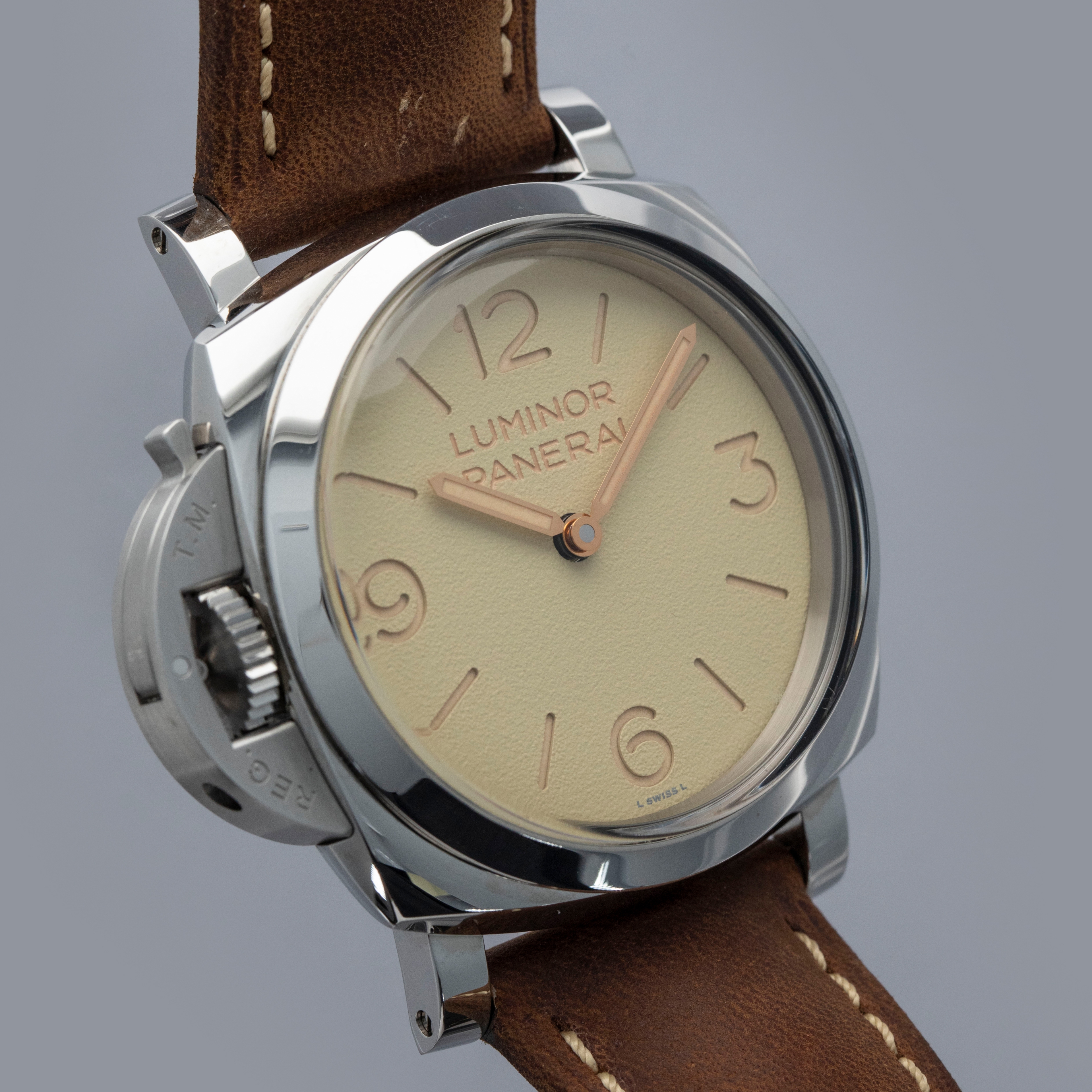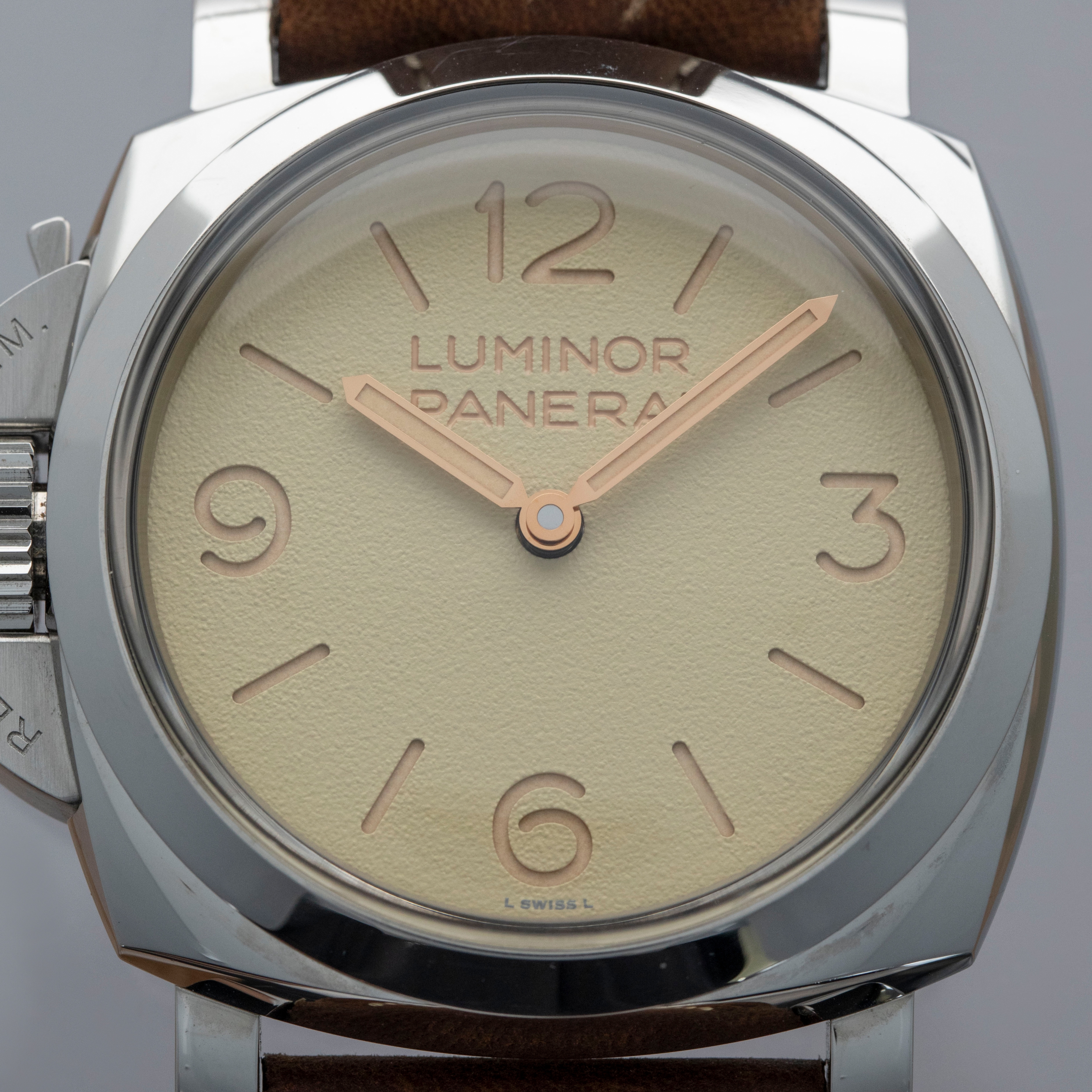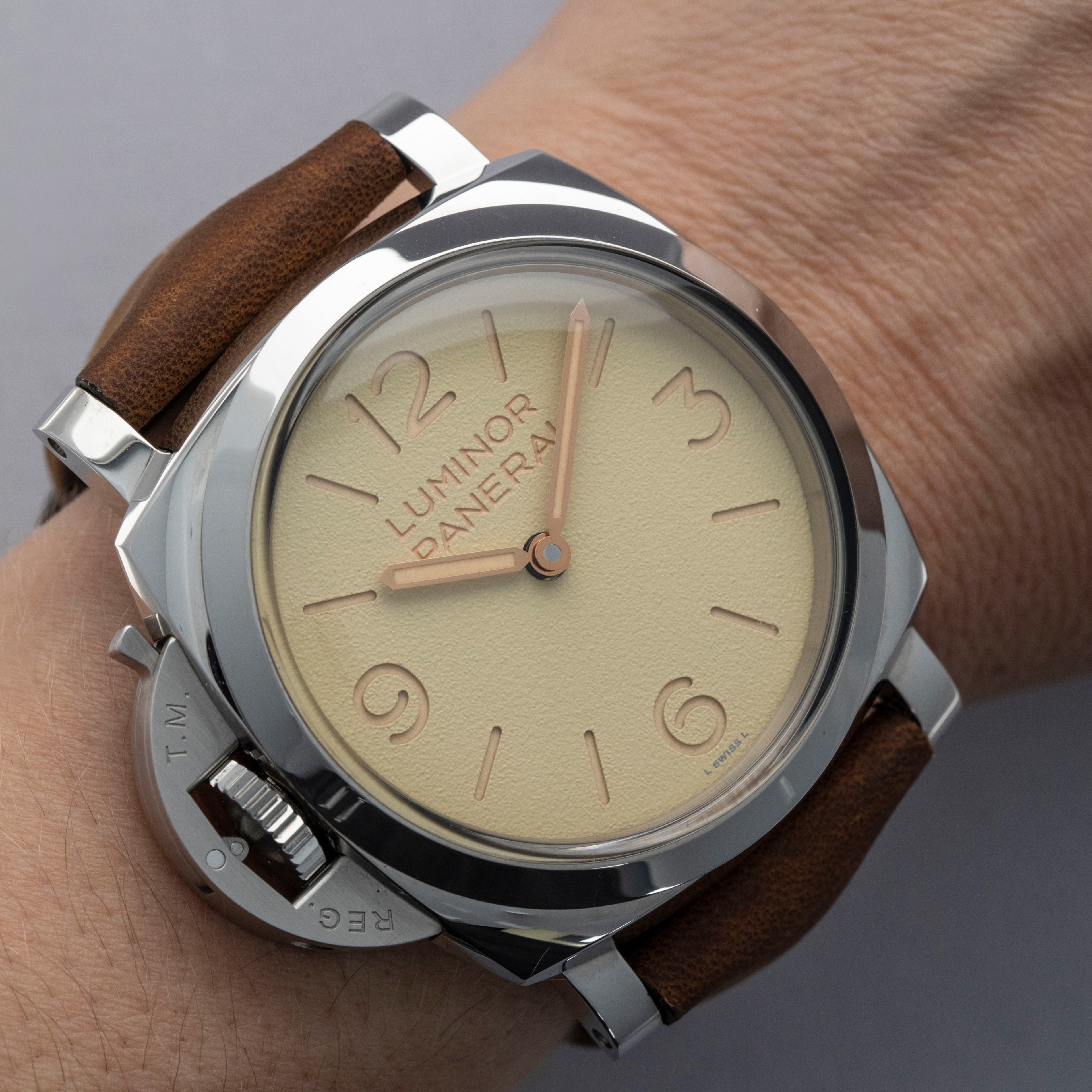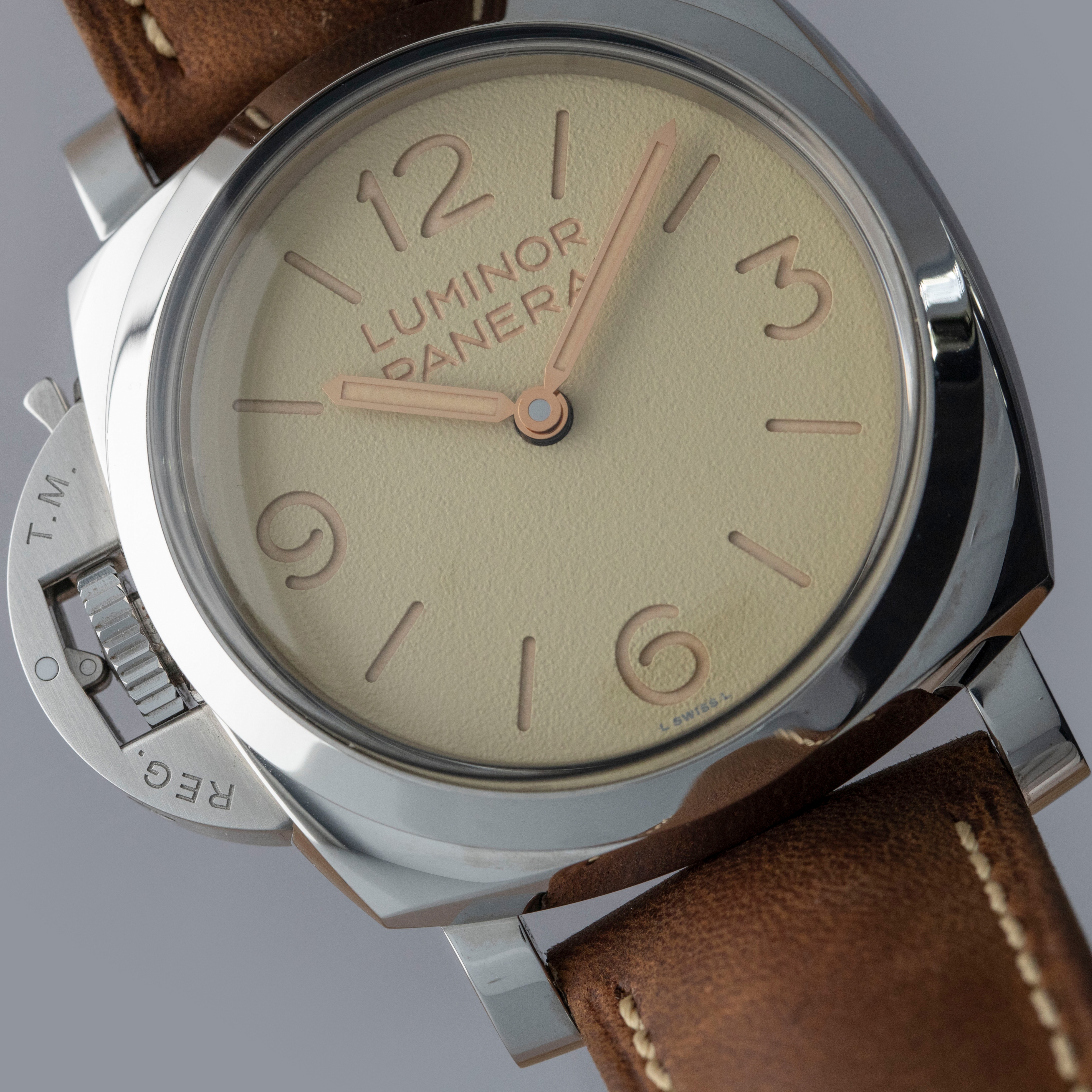 Featuring a beige sandwich dial in keeping with Panerai's signature aesthetic, the PAM1075 boasts a subtle texture on its surface that adds some visual intrigue to its display.