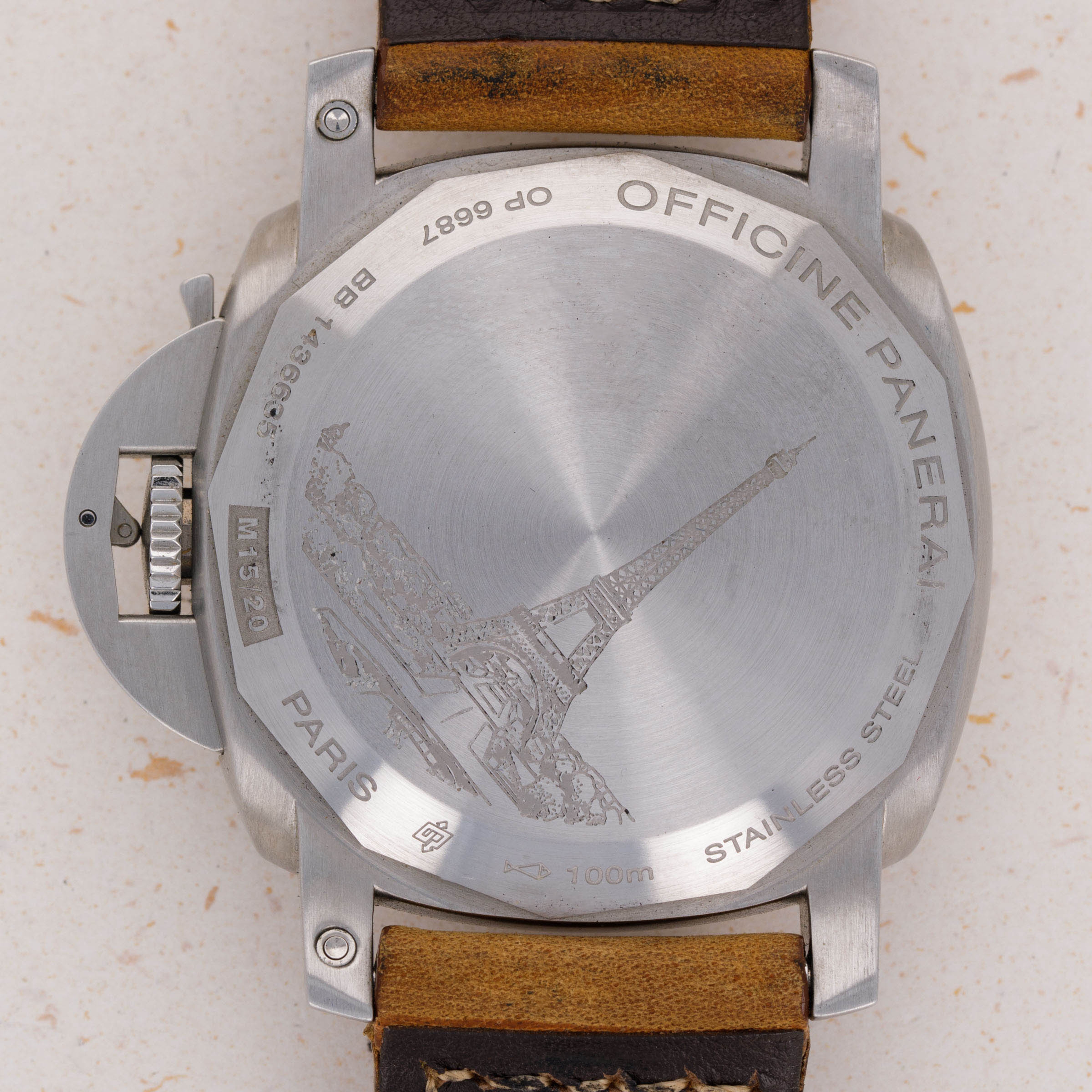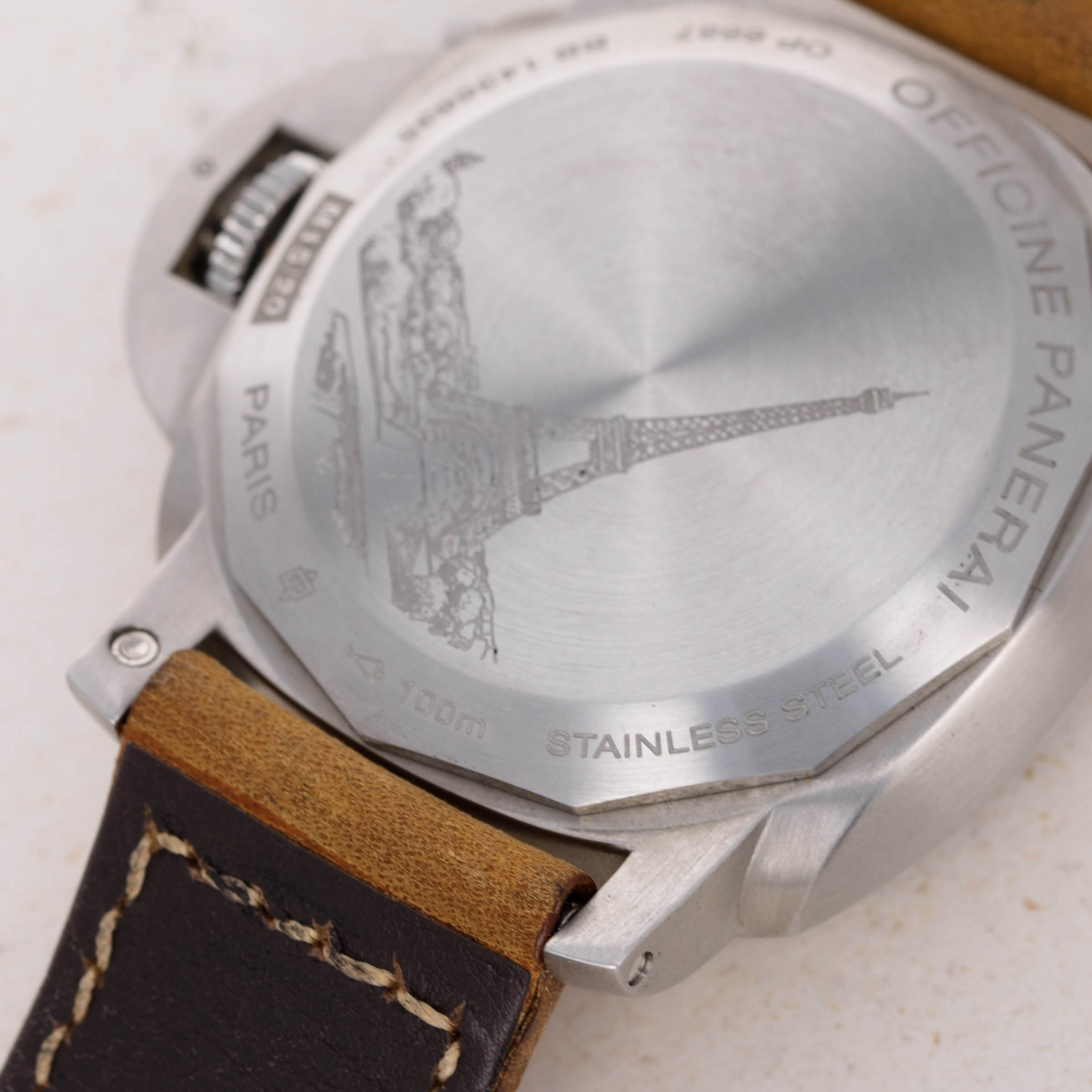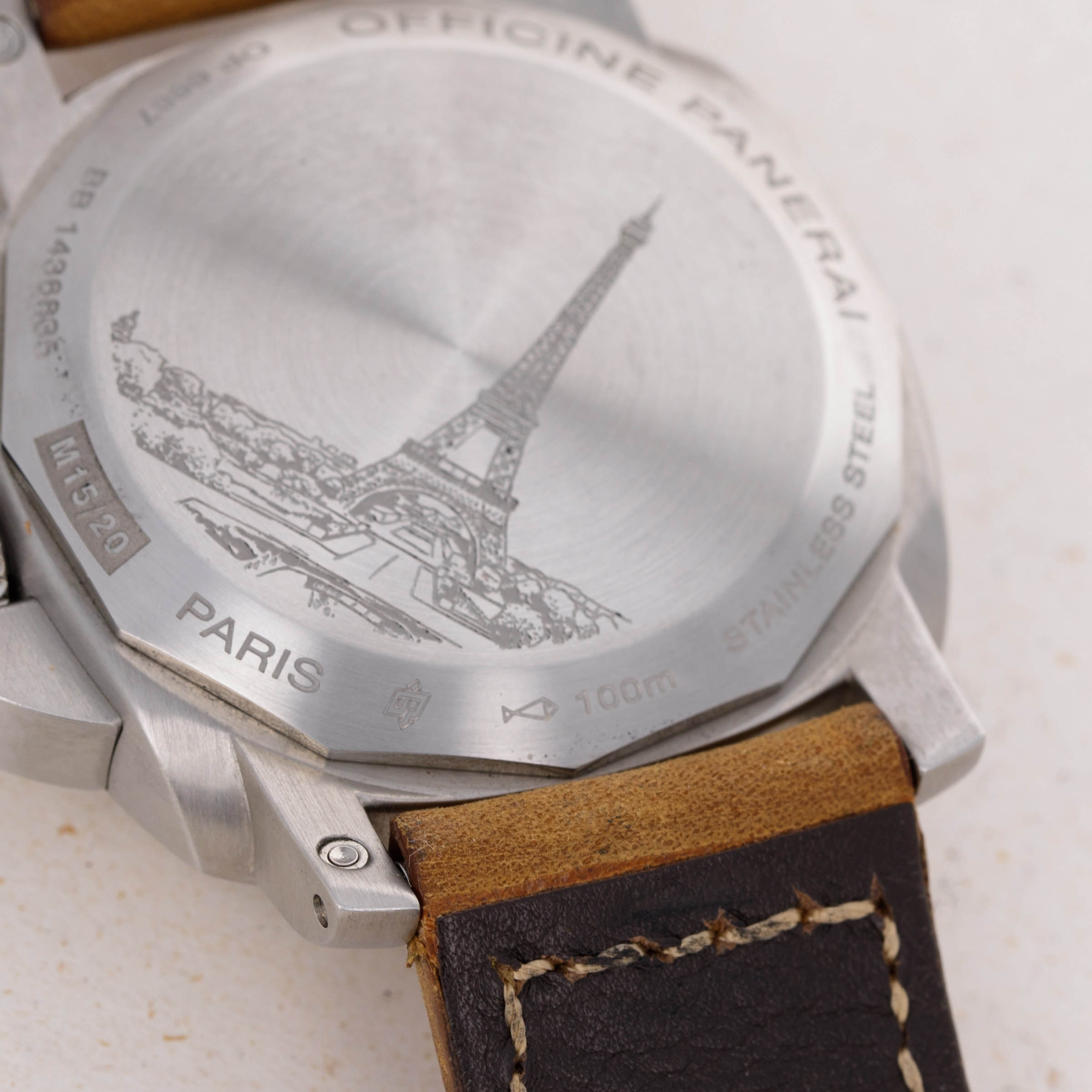 Featuring the Luminor 1950's robust 44mm cushion-shaped construction and Panerai's signature crown-locking mechanism, the PAM404 wears exactly how Paneristis prefer, with its large presence making quite the statement on the wrist. Additionally, as a limited edition variant celebrating the Paris Boutique, it features an engraved caseback depicting the Eiffel Tower.