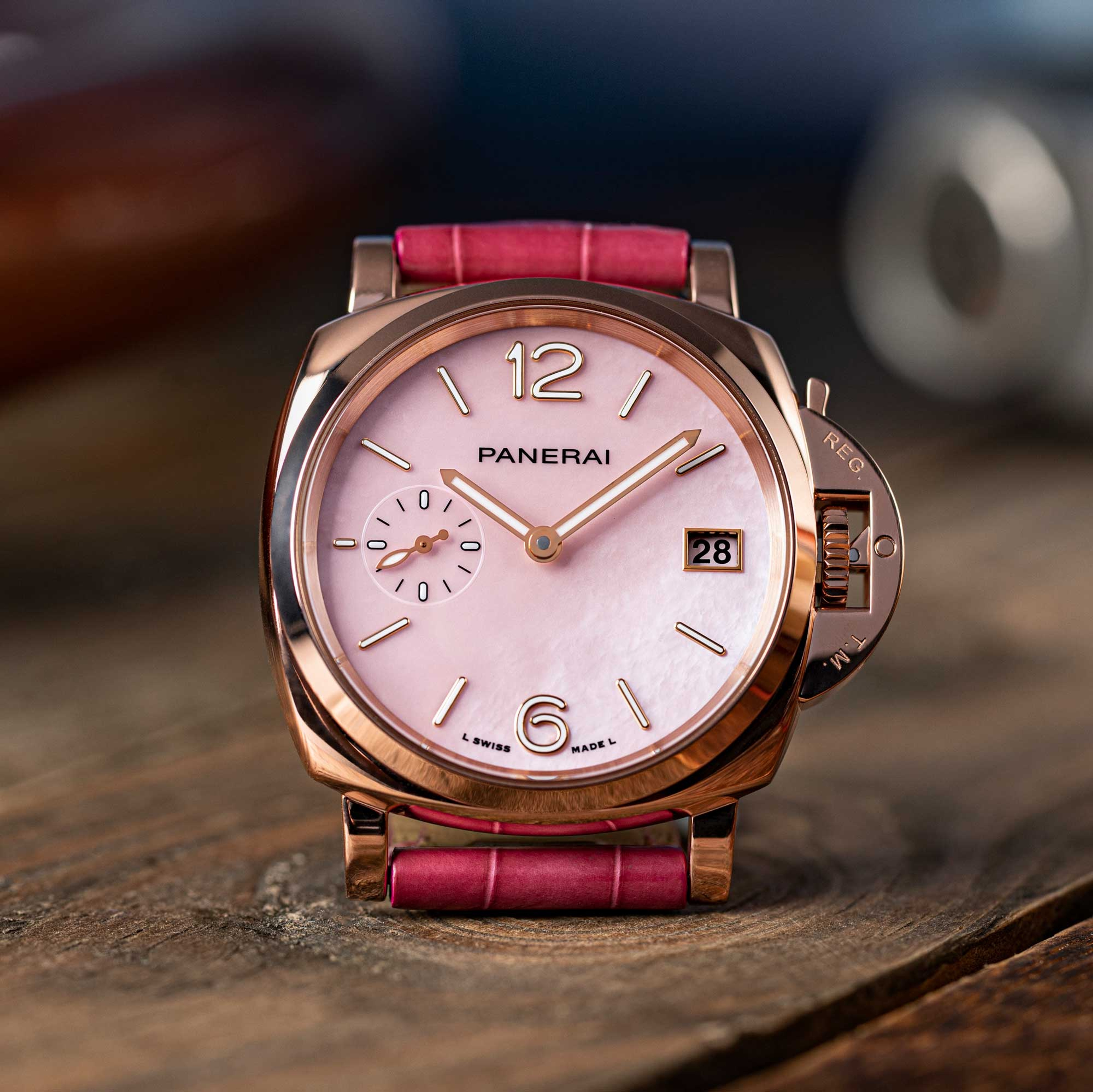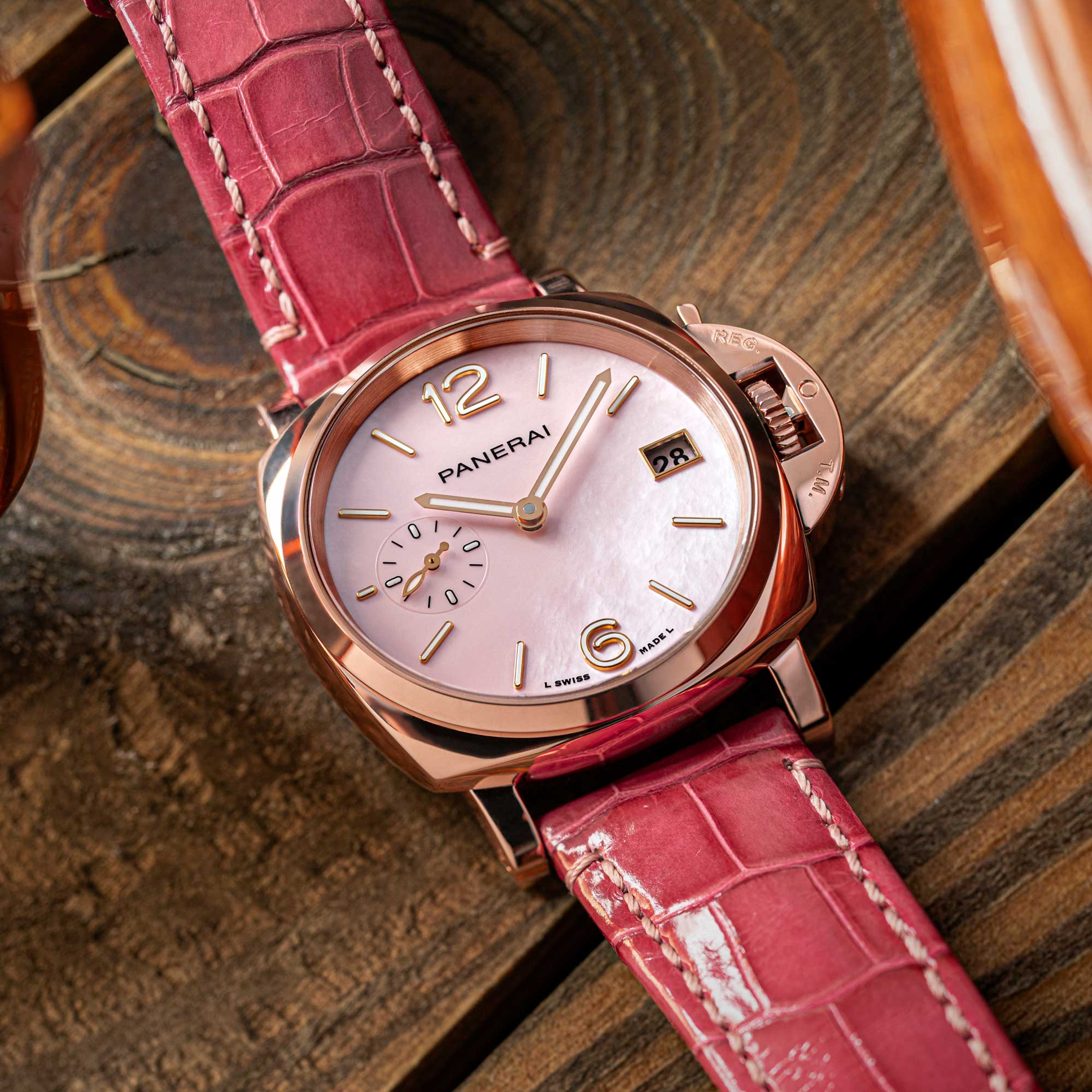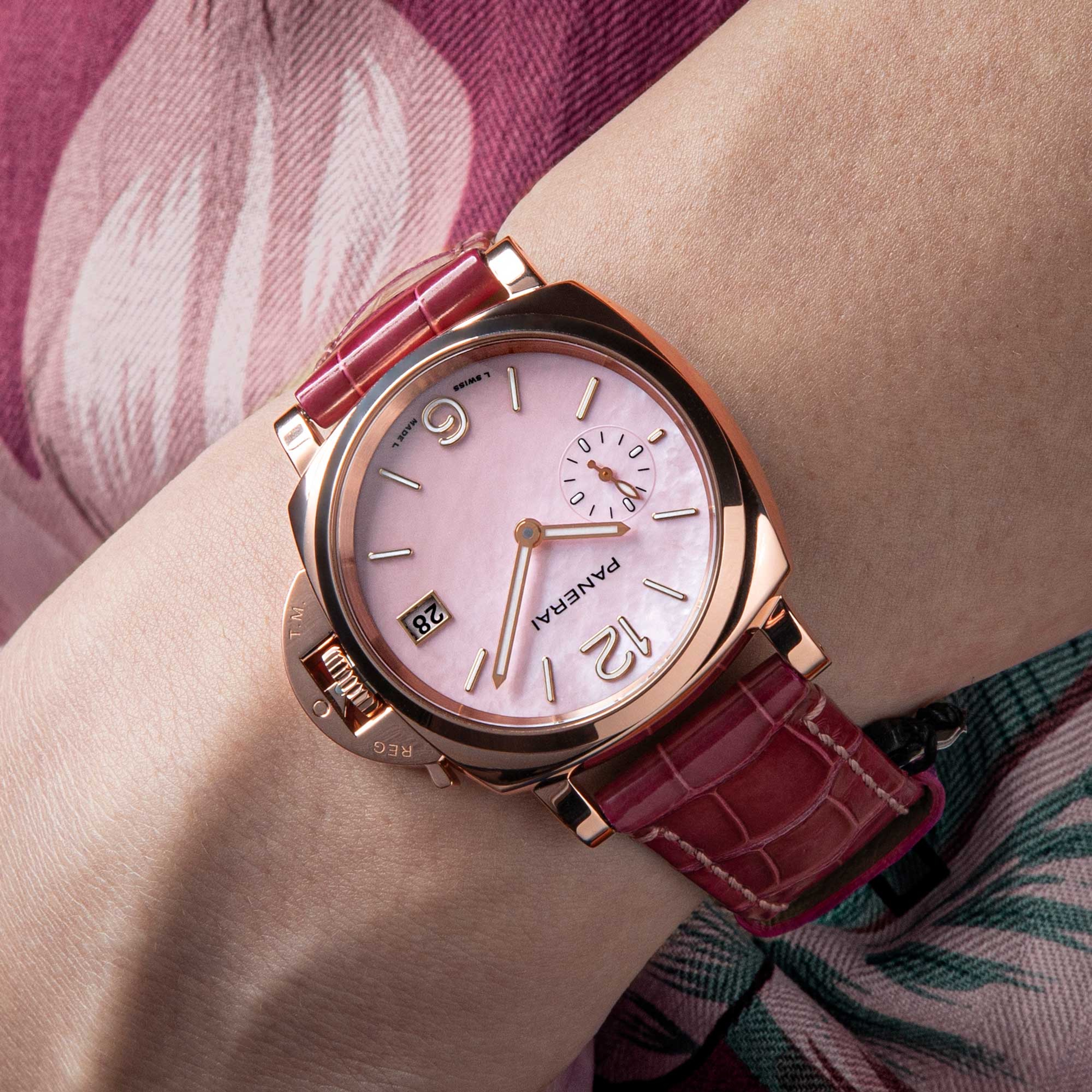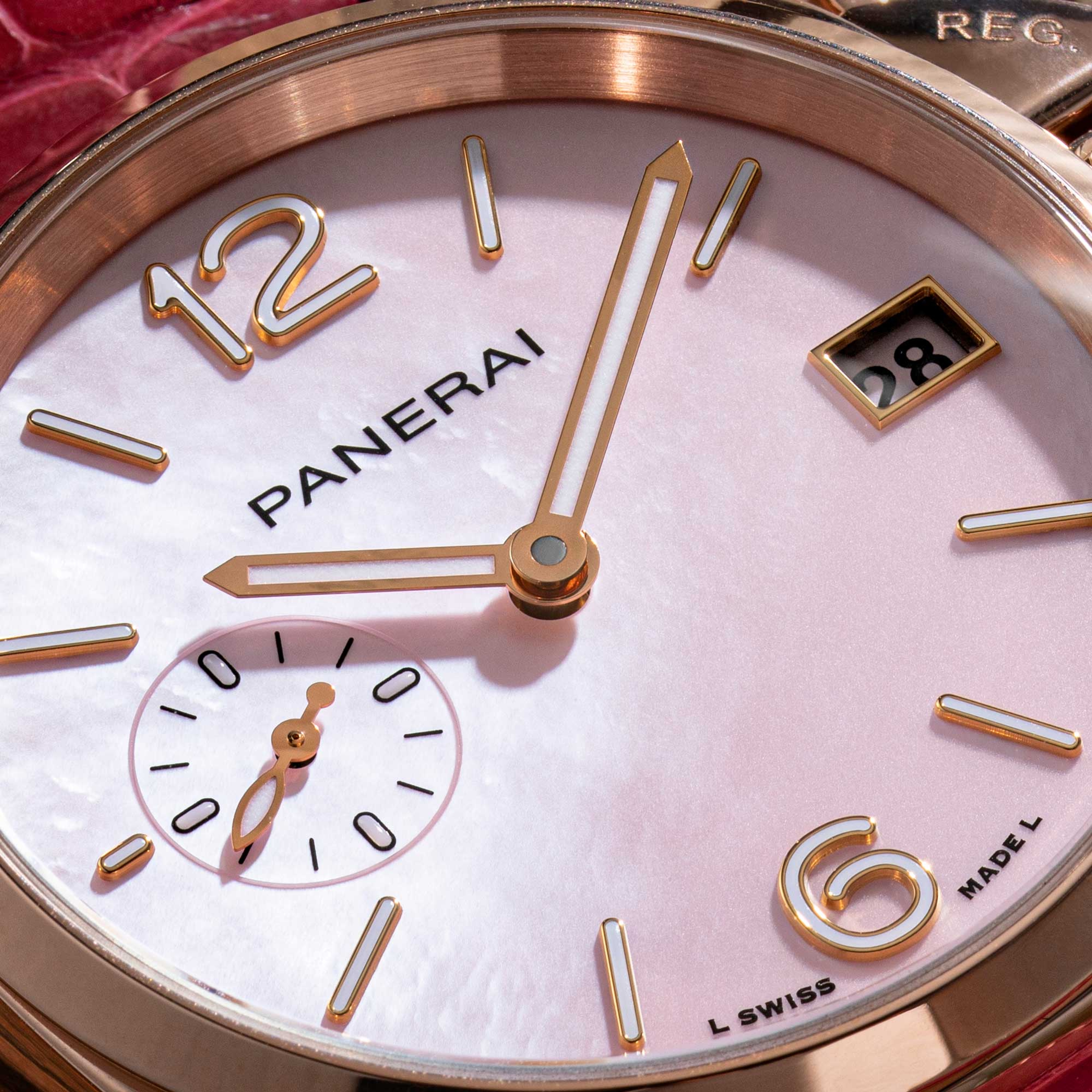 Made especially for the Pink Dial Project, the Panerai PAM02021 pièce unique Piccolo Due in Goldtech™ and pink mother-of-pearl dial features an aesthetic unprecedented by Panerai. With a 38mm diameter, the smallest ever adopted by Panerai, this piece is a marker of elegance thanks to the rich contribution conferred by the iridescent pink mother-of-pearl — a lustrous material that endows the watch with a unique character. The sophistication of this piece is further enhanced by Goldtech™, a proprietary precious metal boasting an intense tone and heightened resistance to oxidation. The PAM02021 pièce unique is accompanied by a shiny pink alligator strap, complementing its one-of-a-kind dial perfectly.