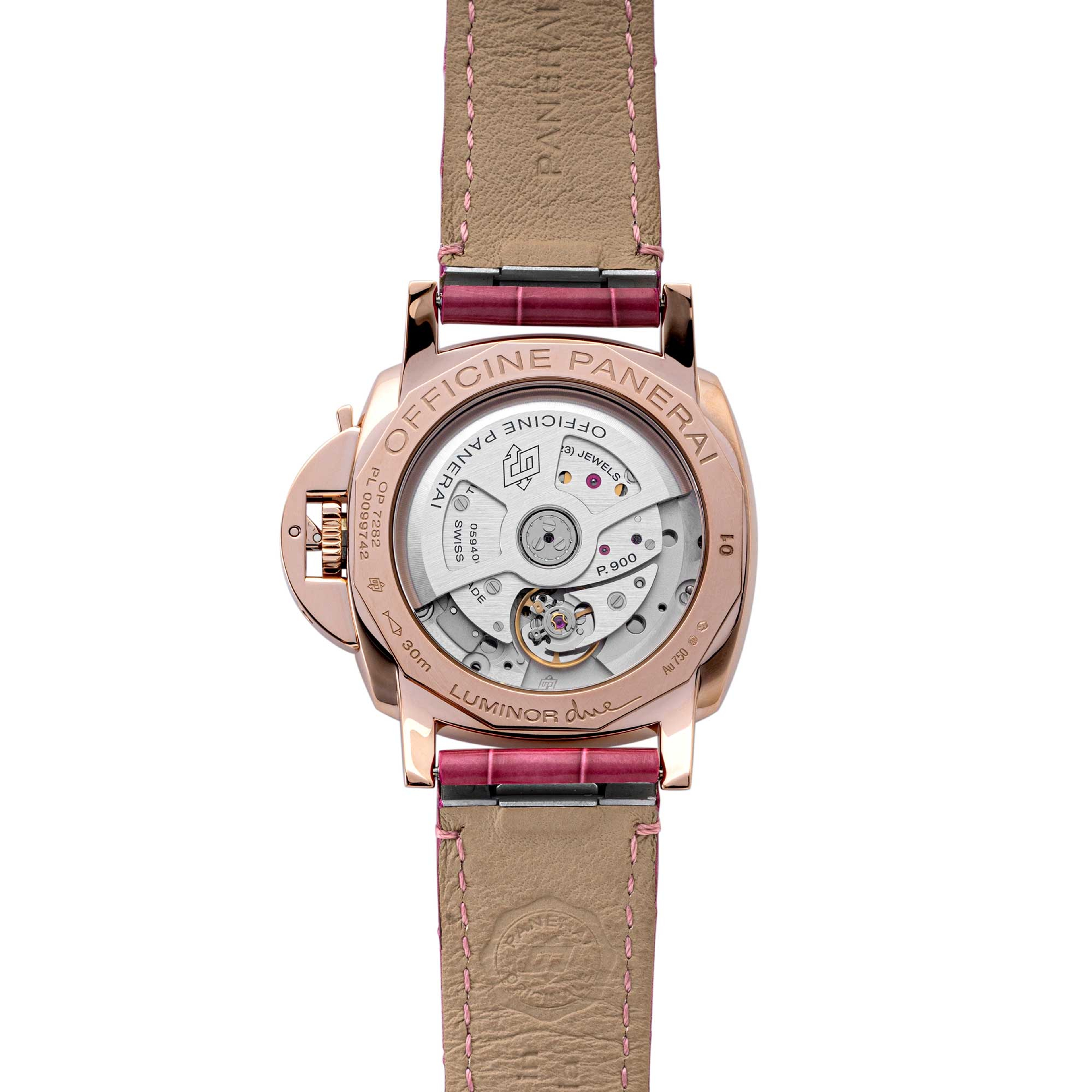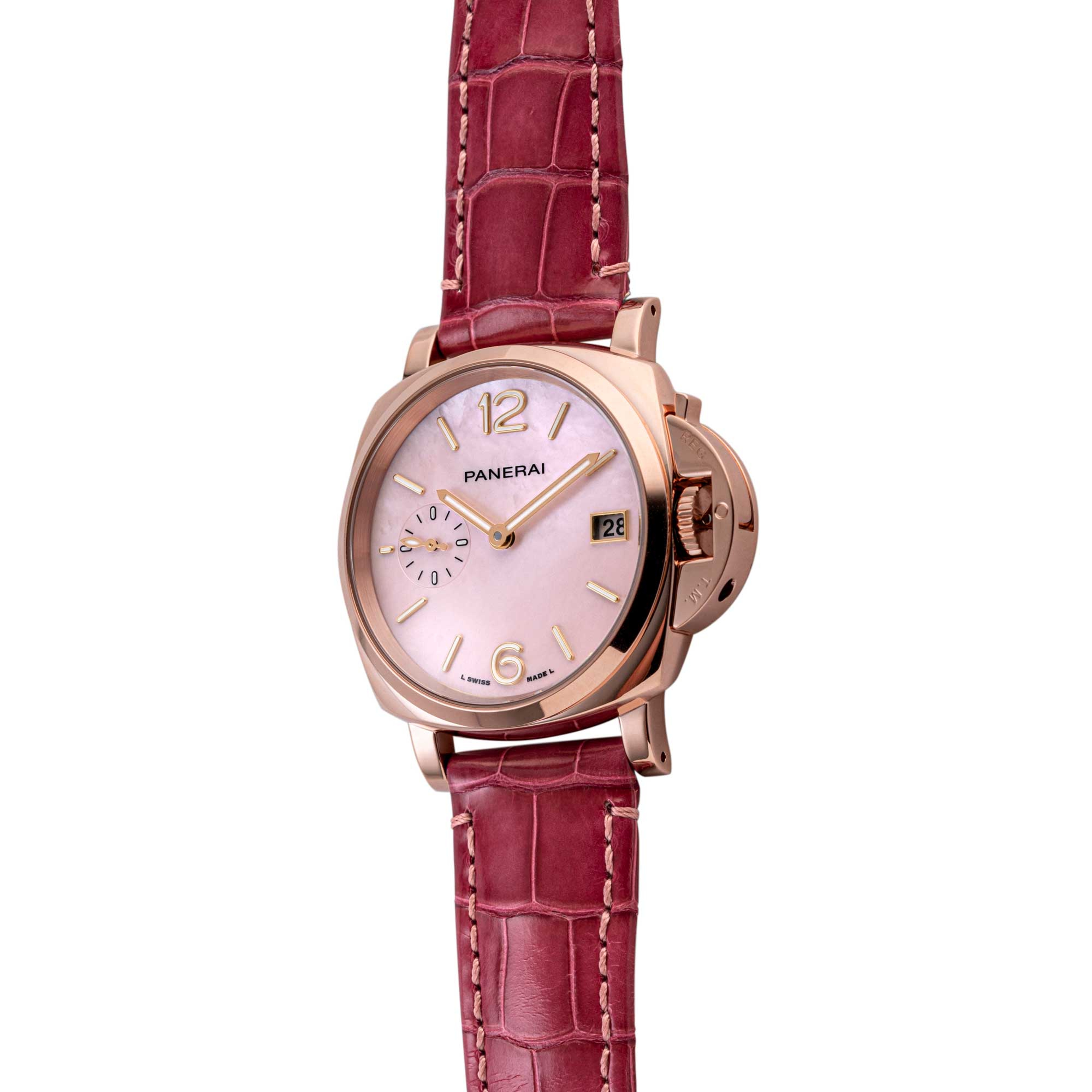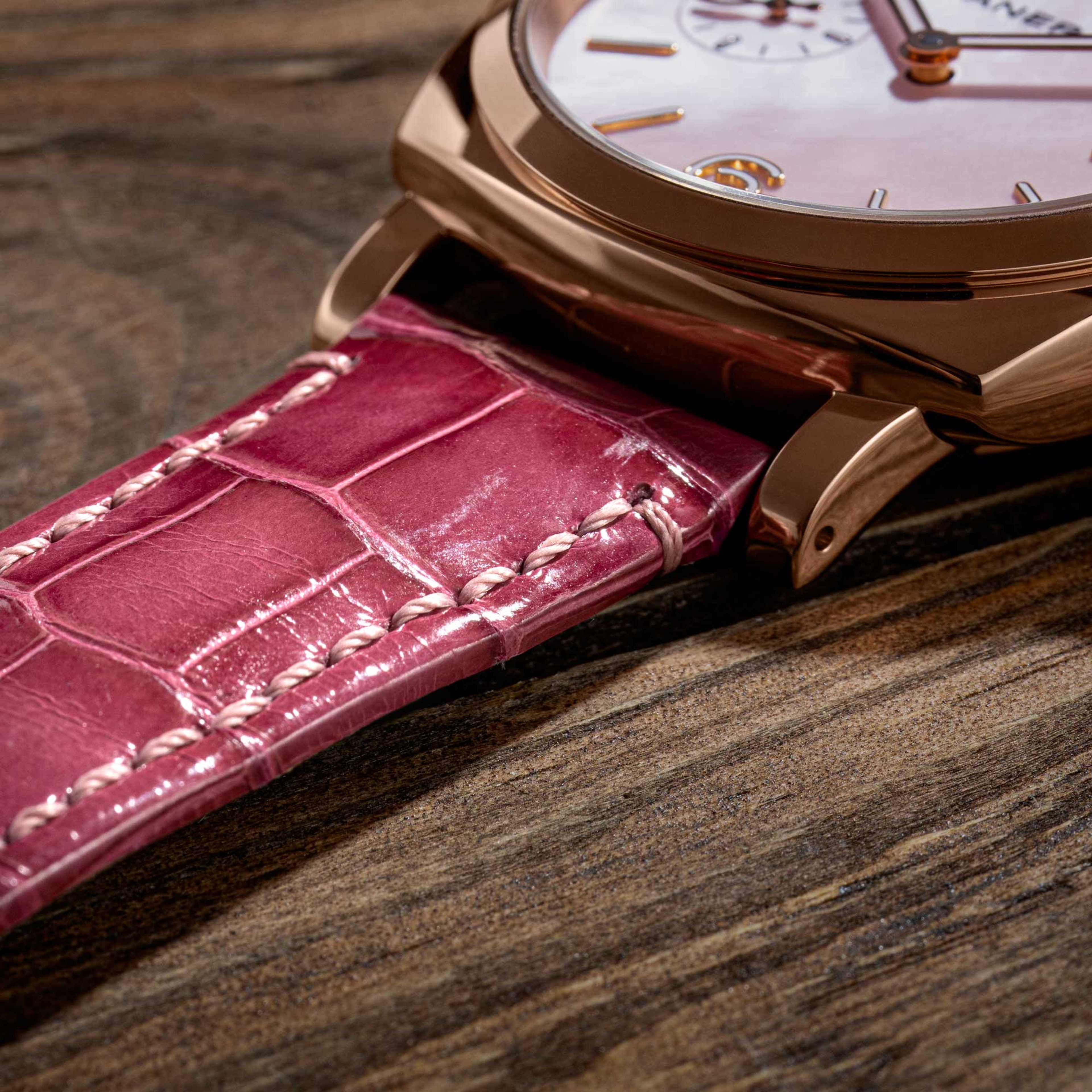 Made especially for the Pink Dial Project, the Panerai PAM02021 pièce unique Piccolo Due in Goldtech™ and pink mother-of-pearl dial features an aesthetic unprecedented by Panerai. With a 38mm diameter, the smallest ever adopted by Panerai, this piece is a marker of elegance thanks to the rich contribution conferred by the iridescent pink mother-of-pearl — a lustrous material that endows the watch with a unique character. The sophistication of this piece is further enhanced by Goldtech™, a proprietary precious metal boasting an intense tone and heightened resistance to oxidation. The PAM02021 pièce unique is accompanied by a shiny pink alligator strap, complementing its one-of-a-kind dial perfectly.