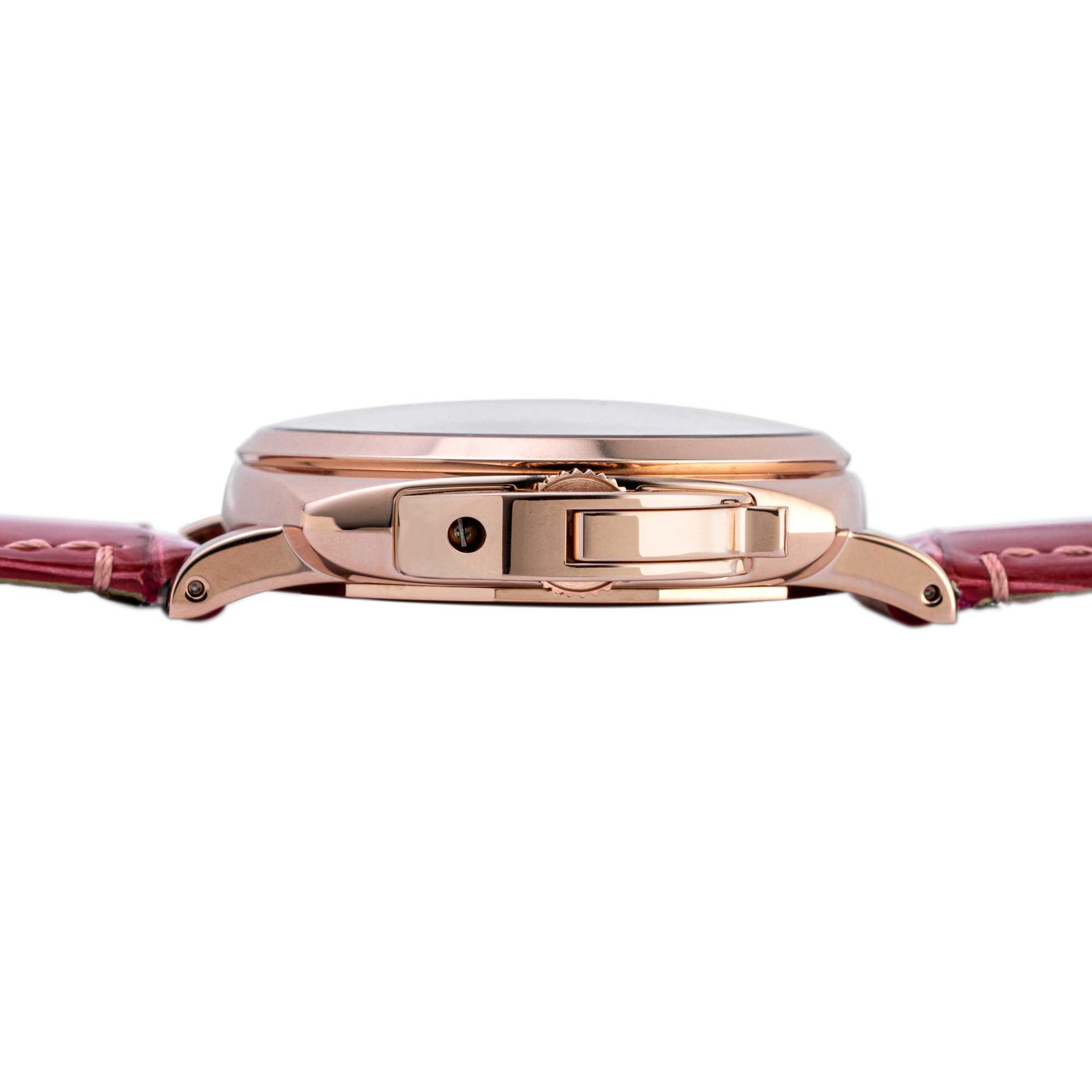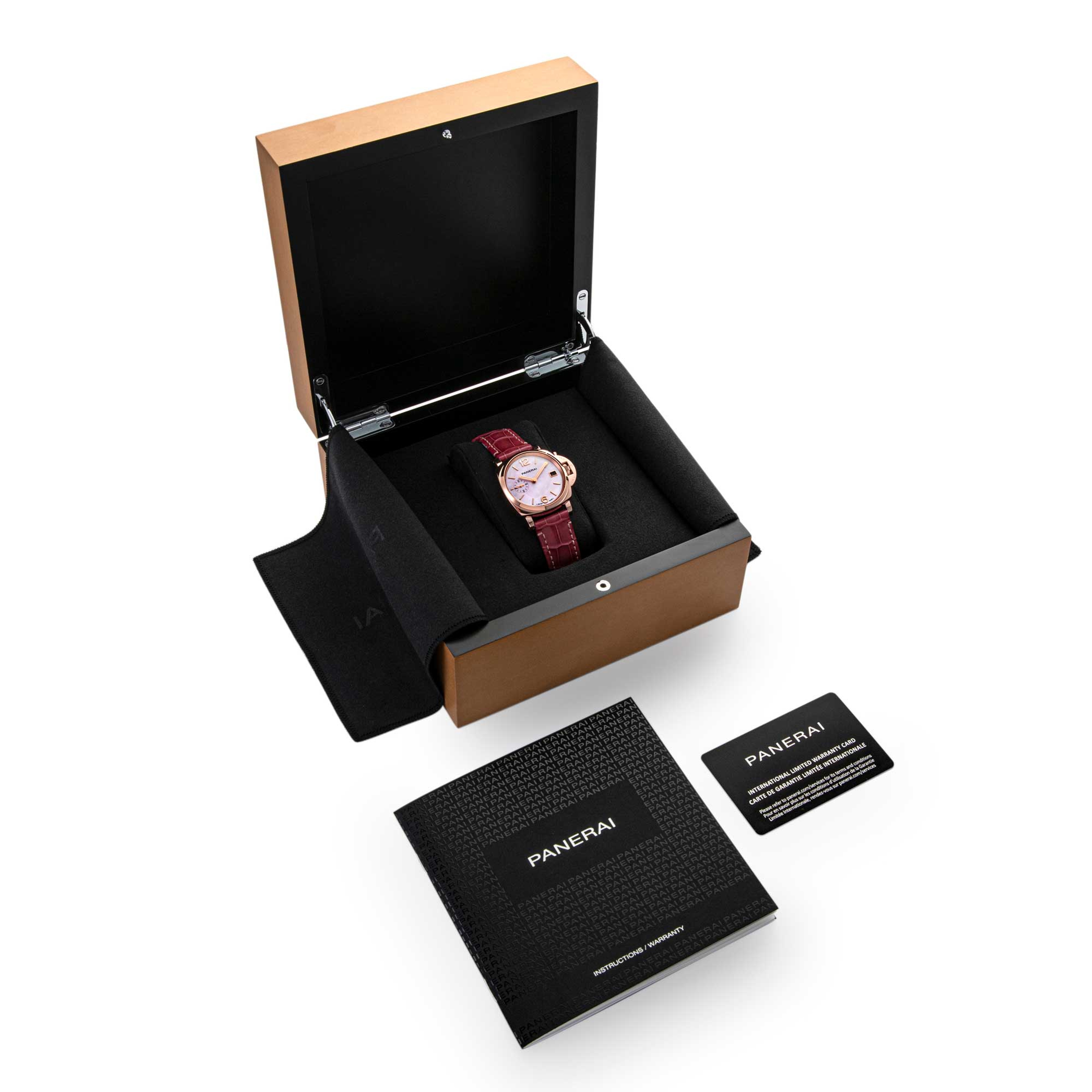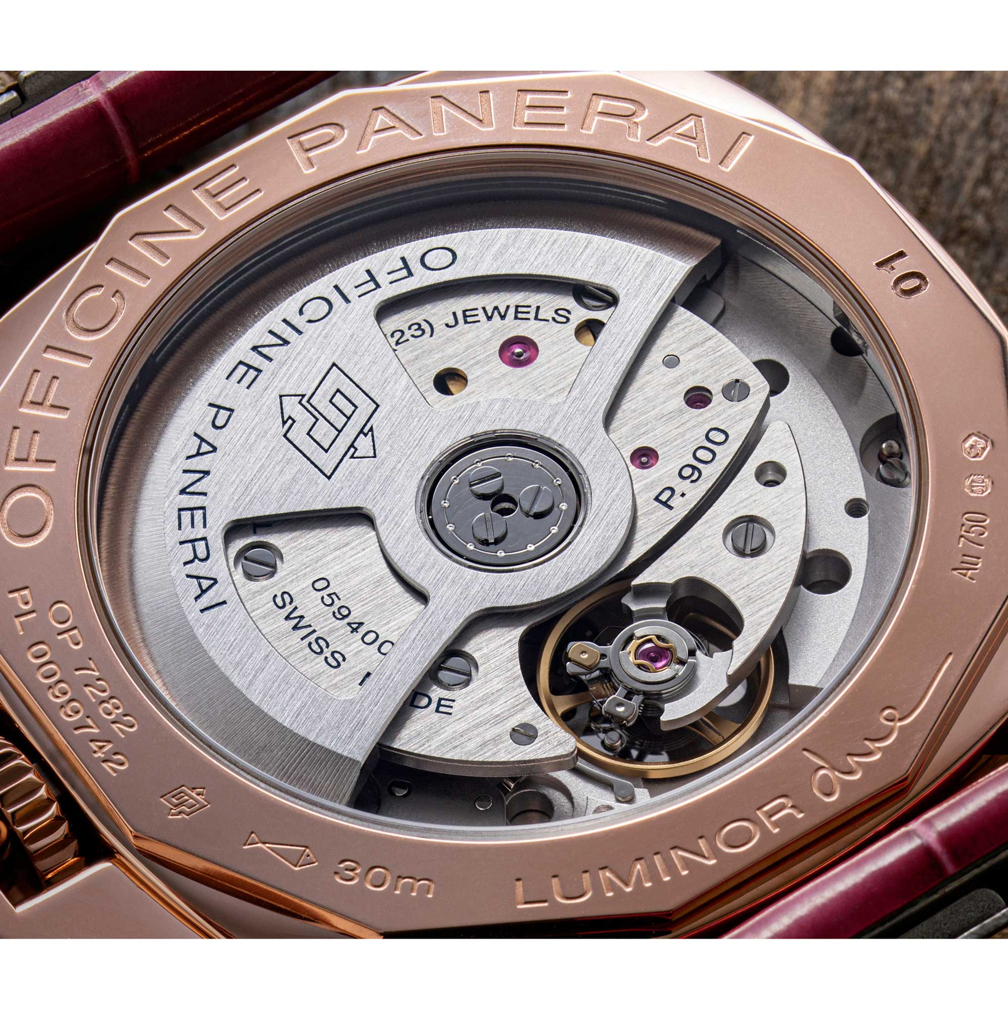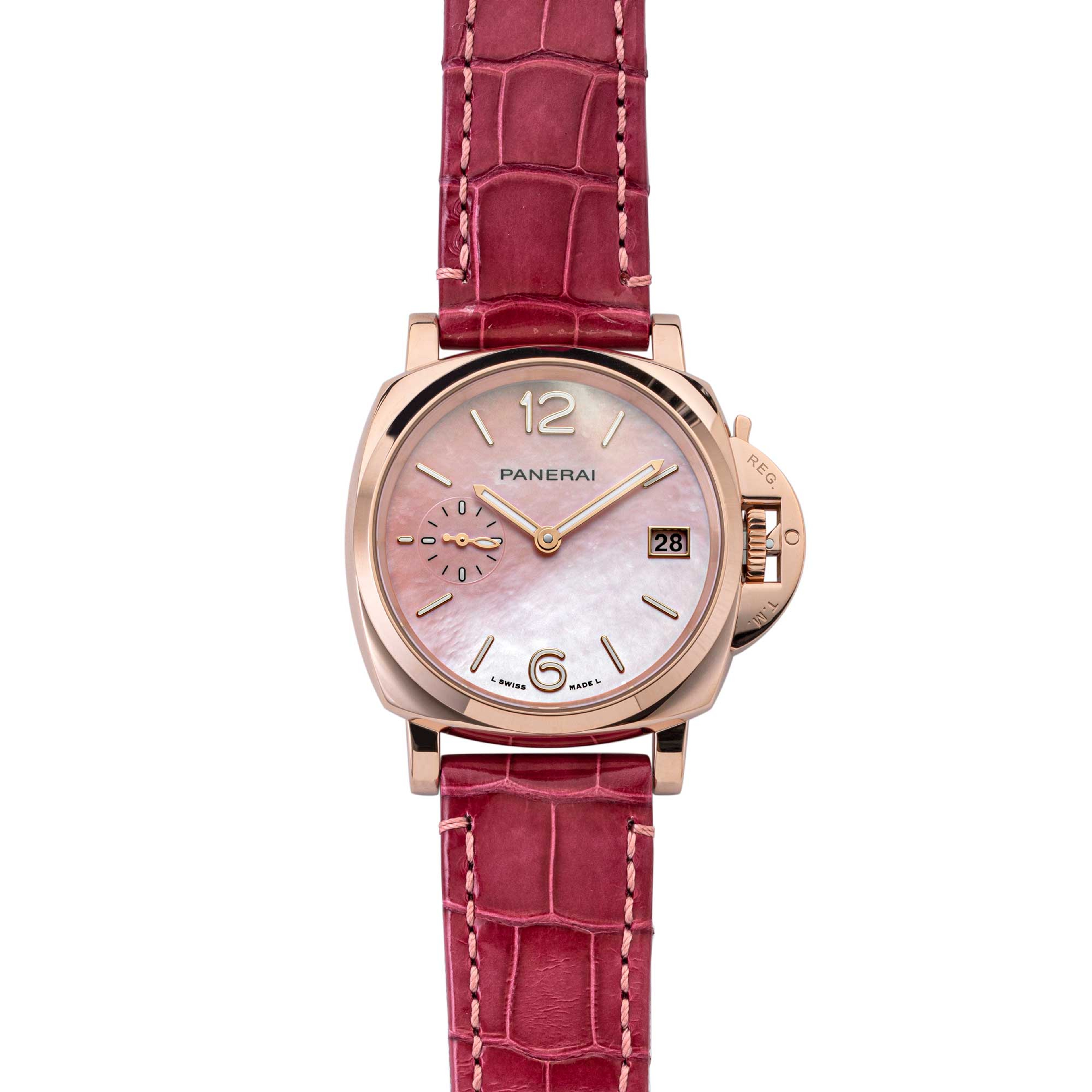 Made especially for the Pink Dial Project, the Panerai PAM02021 pièce unique Piccolo Due in Goldtech™ and pink mother-of-pearl dial features an aesthetic unprecedented by Panerai. With a 38mm diameter, the smallest ever adopted by Panerai, this piece is a marker of elegance thanks to the rich contribution conferred by the iridescent pink mother-of-pearl — a lustrous material that endows the watch with a unique character. The sophistication of this piece is further enhanced by Goldtech™, a proprietary precious metal boasting an intense tone and heightened resistance to oxidation. The PAM02021 pièce unique is accompanied by a shiny pink alligator strap, complementing its one-of-a-kind dial perfectly.