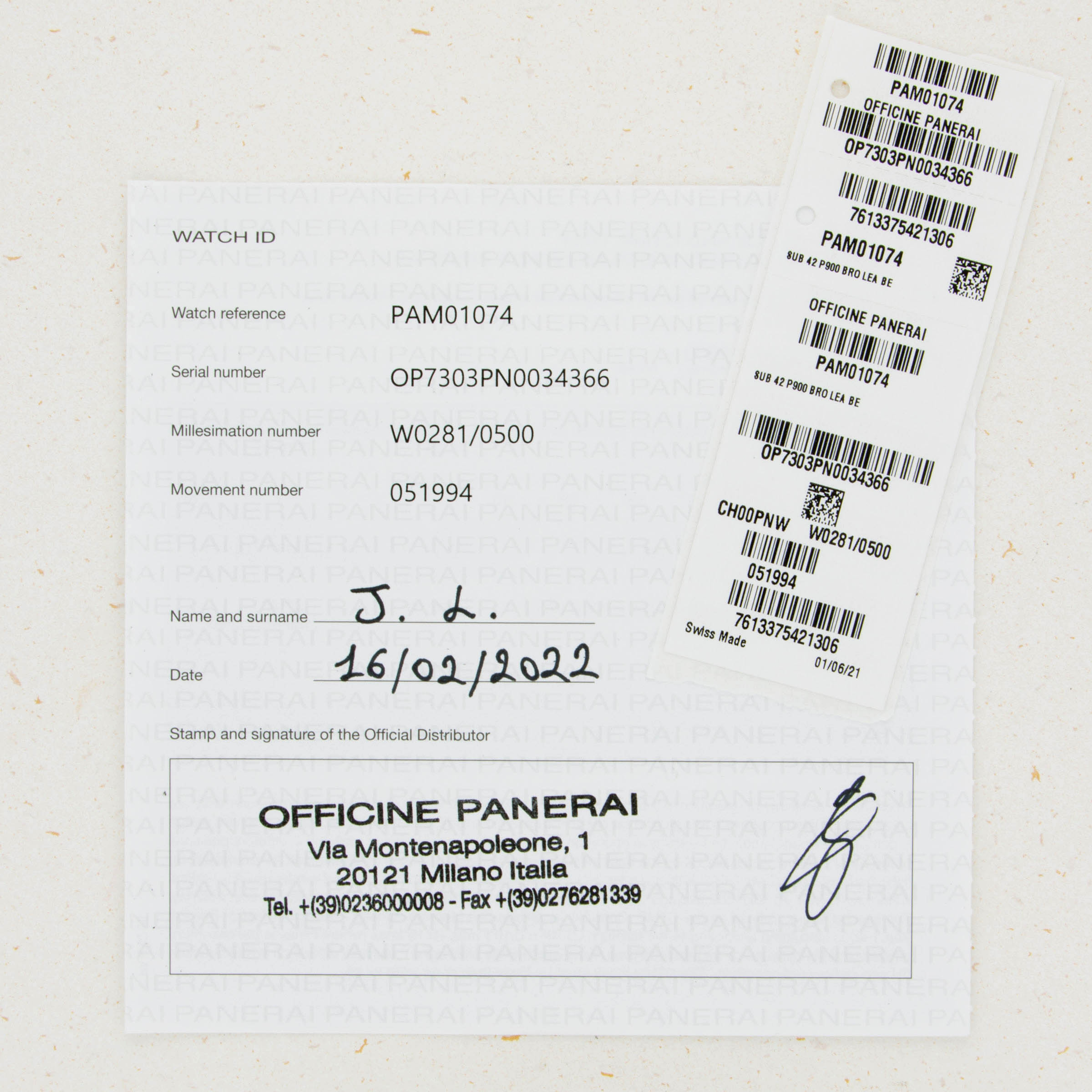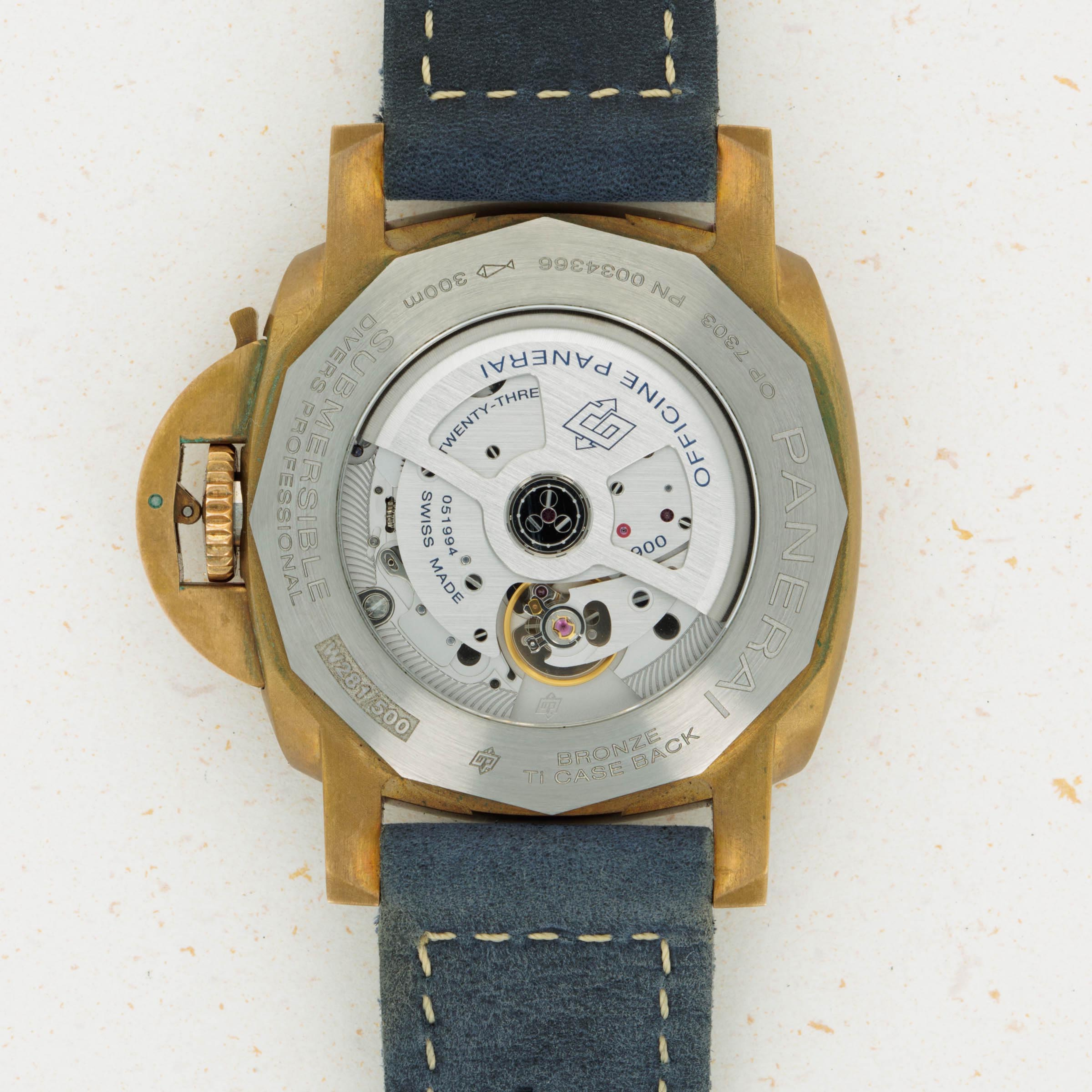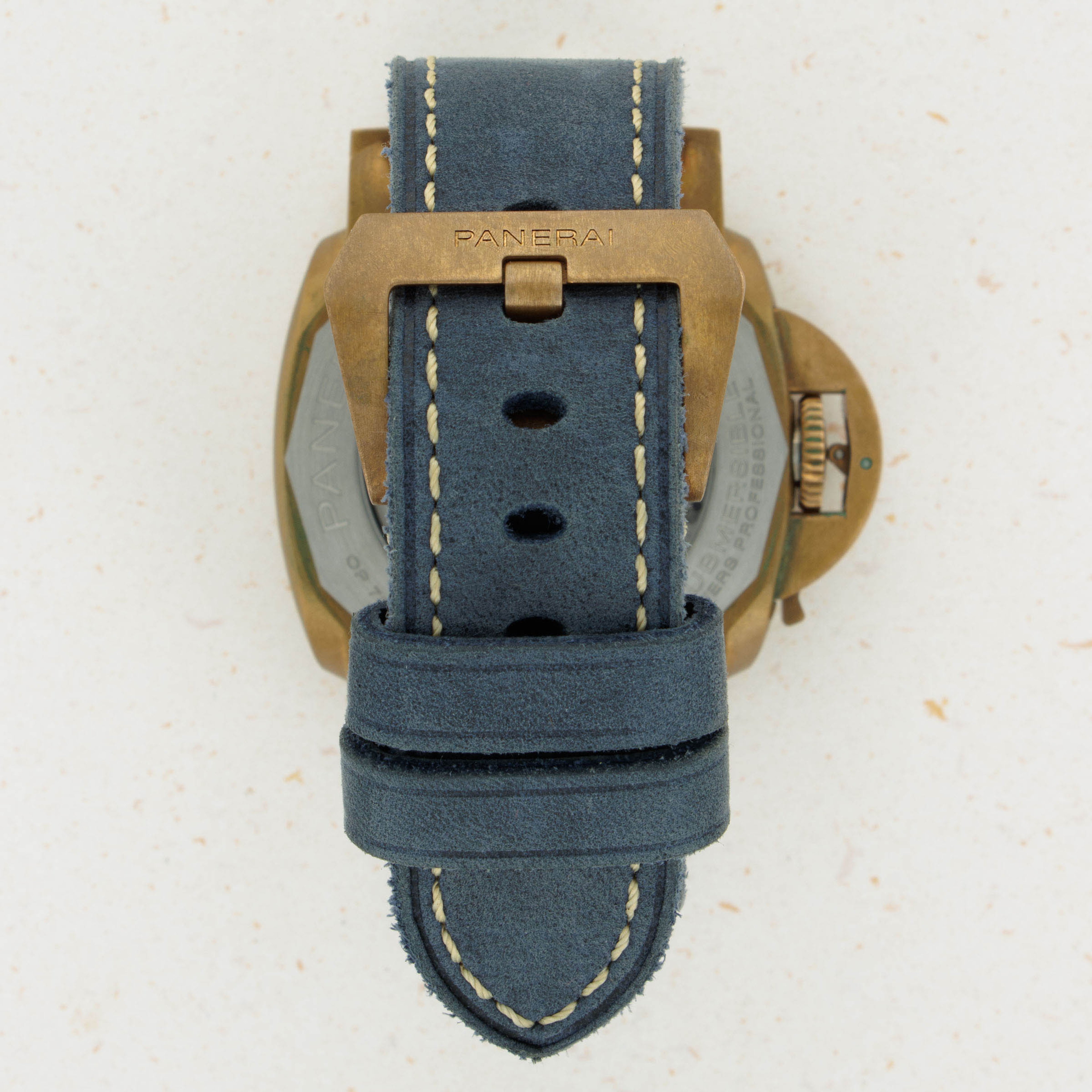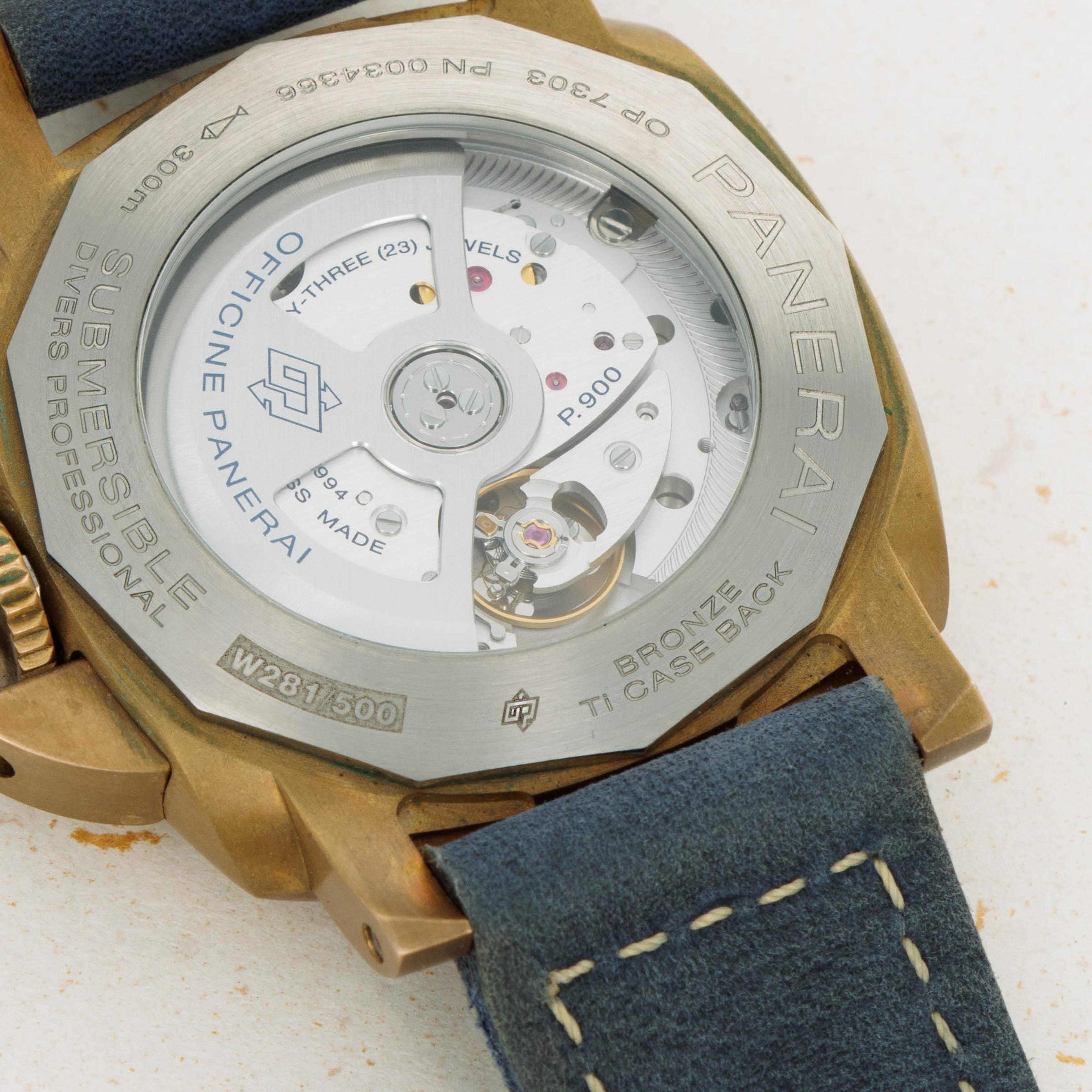 Due to the natural tendency of bronze to develop a patina across its surfaces, this PAM1074's 42mm construction includes a variety of unique golden, bronze, and brown tones, which ensure that no two examples from the reference look exactly alike.