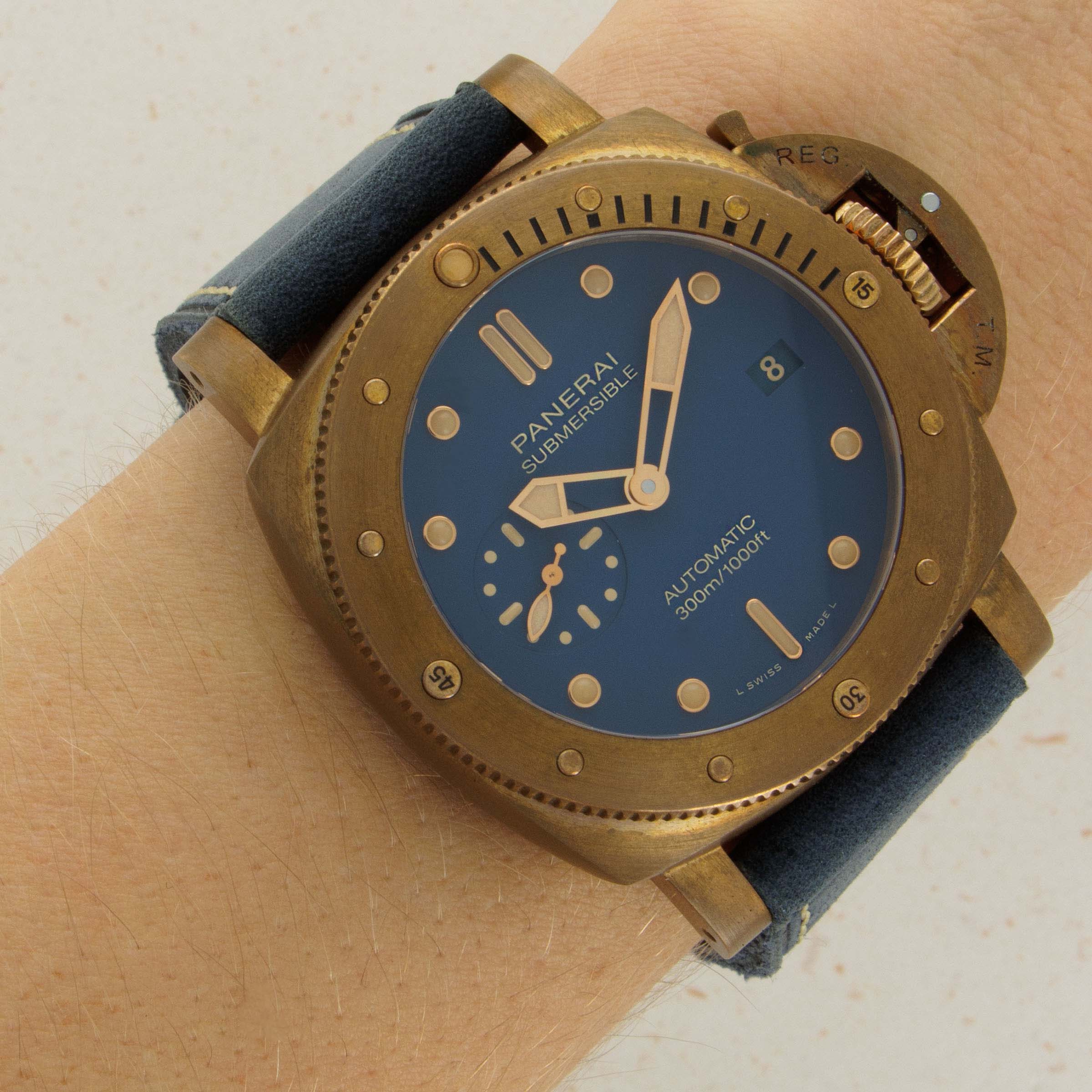 Watch is in near-mint condition. The bronze case has aged as intended with surface patina, but shows no major dings or scratches.
