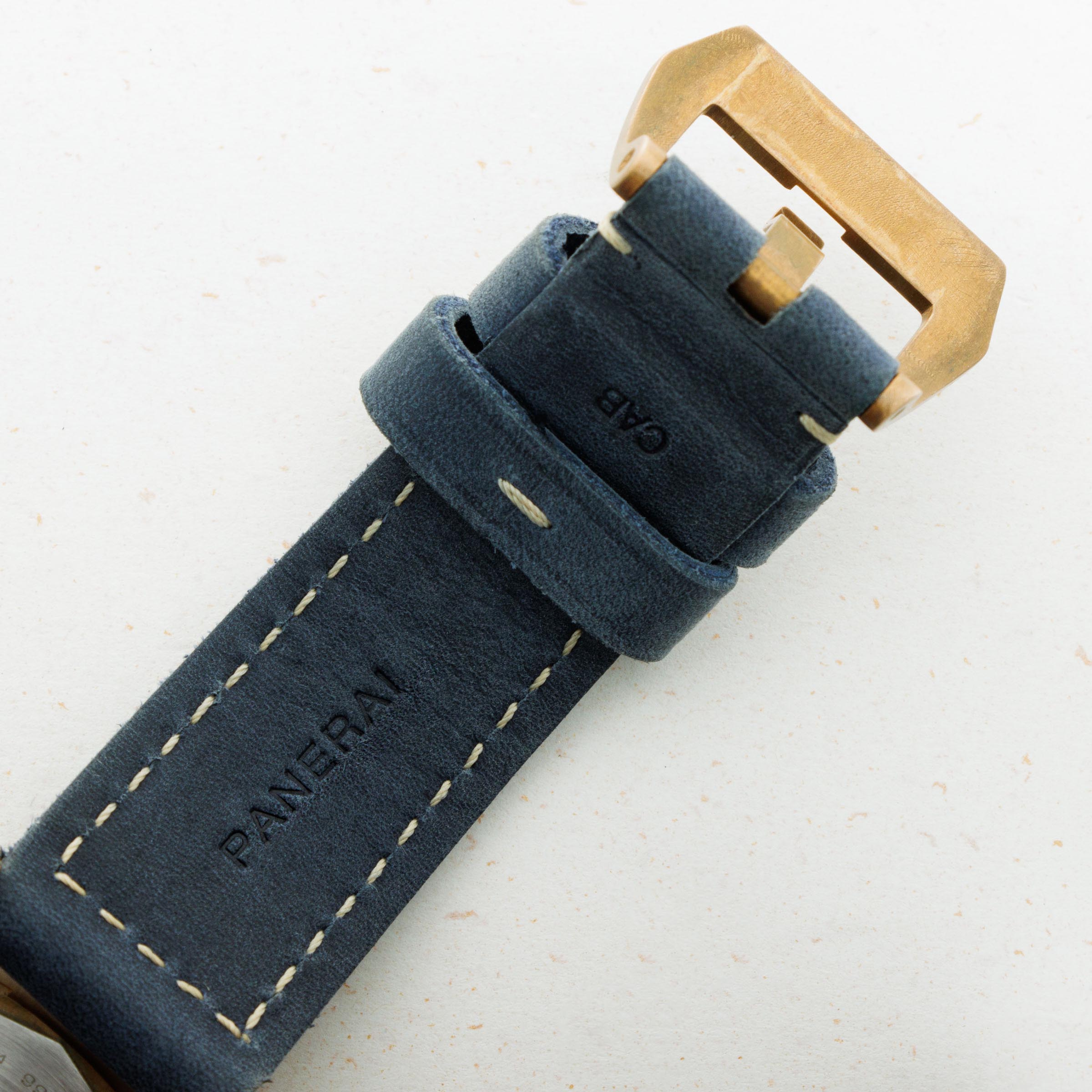Fitted with a subtle blue dial, the PAM1074's display is beautifully refined with the gently aged golden hue of its bronze applied hour markers and hands nicely contrasting its blue dial and aged bronze bezel.