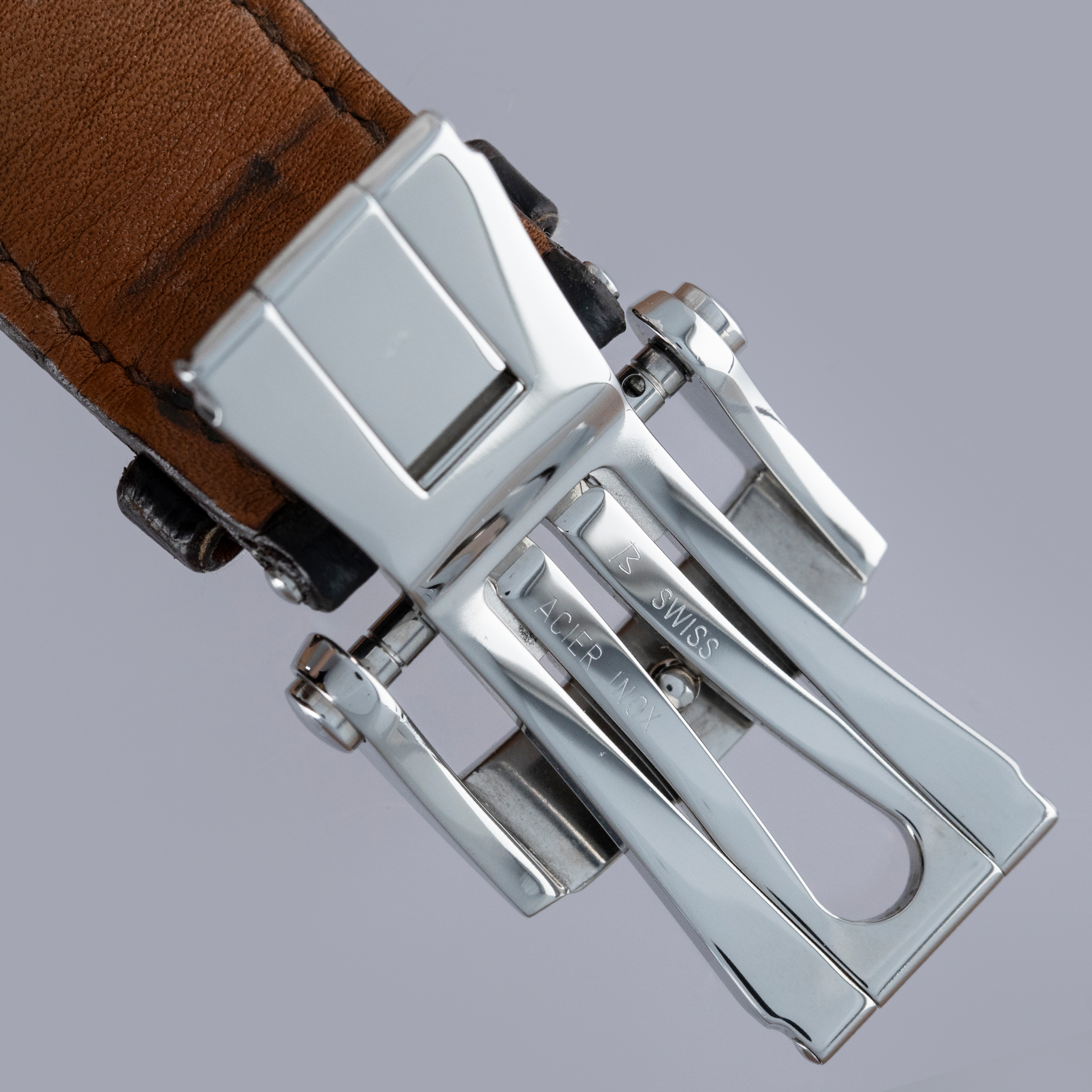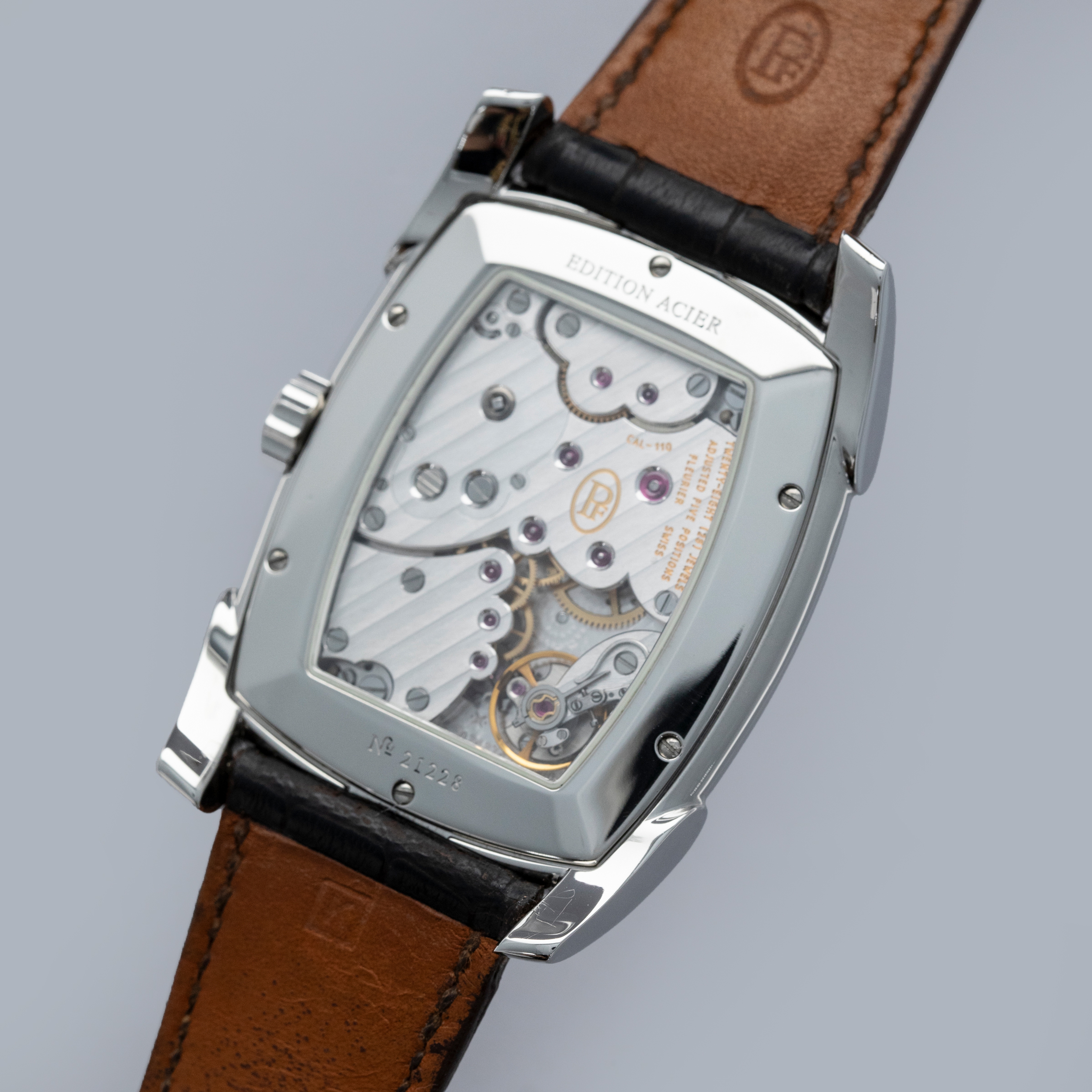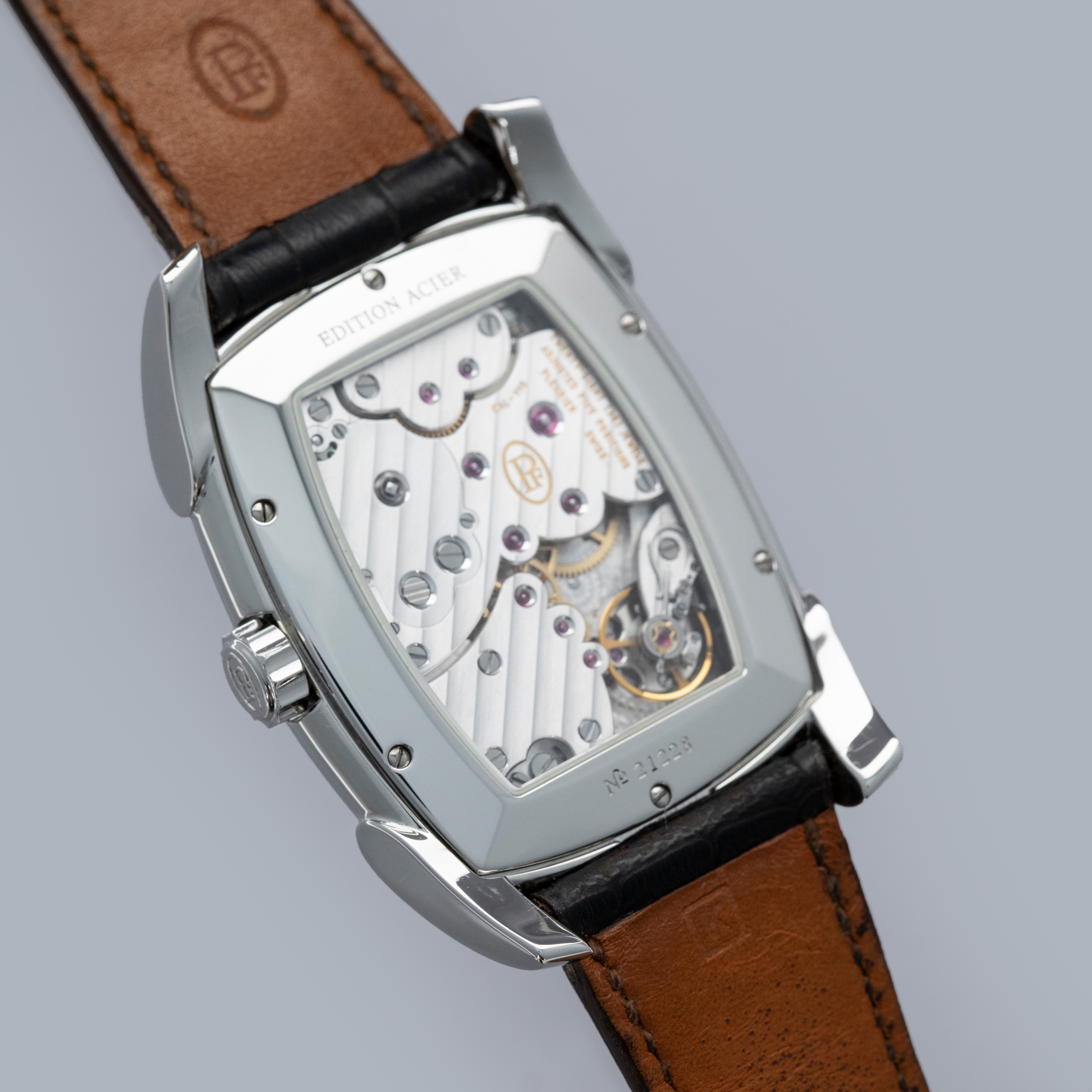 Watch is in overall excellent condition. The steel case has some light scratches and a couple of very light nicks on the bezel. The display case back has well-defined engravings around the edge and light wear on the screw heads. The dial is in excellent condition, and the blued hands are all clean. The watch is fitted with a black alligator PF and Hermès-signed strap with a steel PF deployant clasp. Comes with inner and outer boxes.