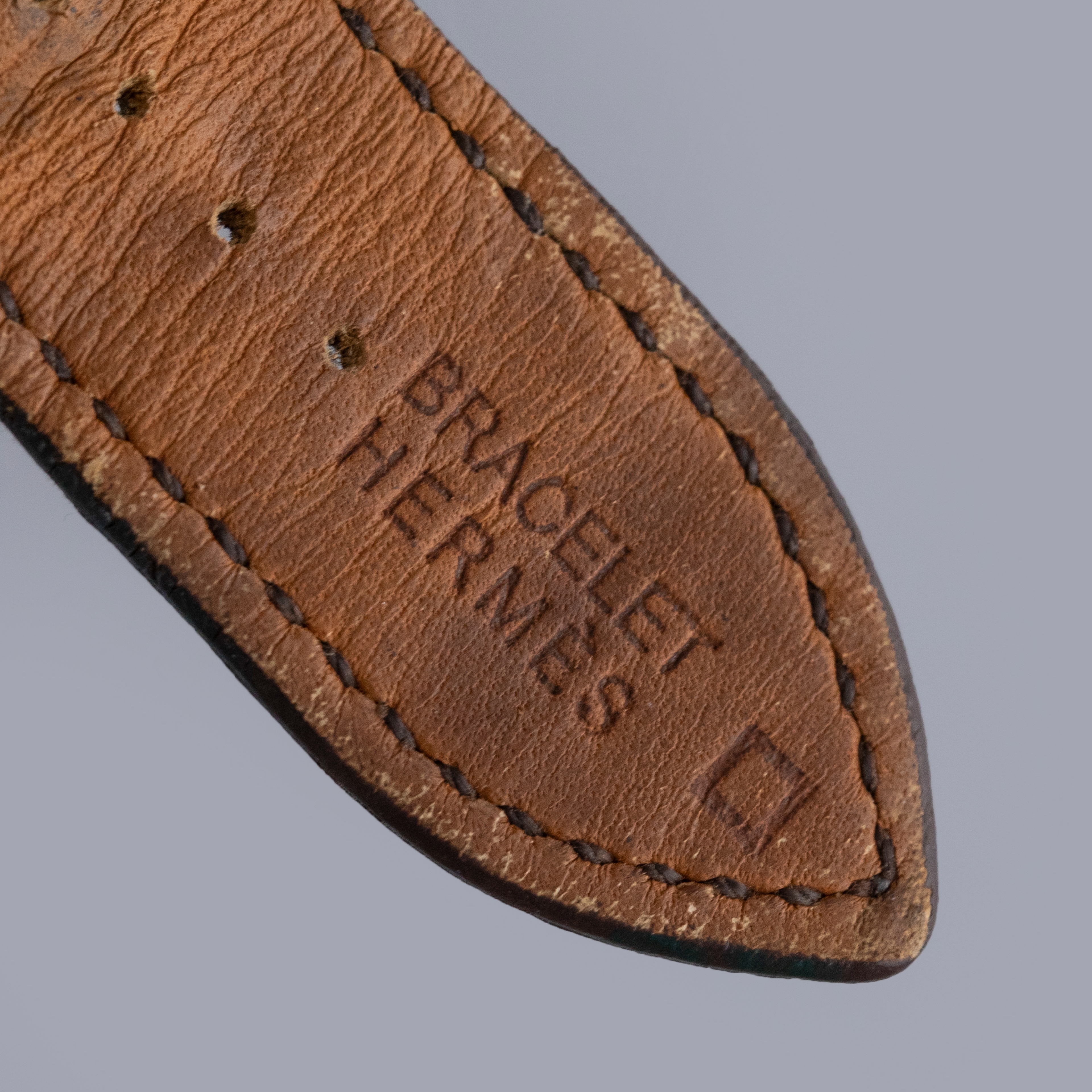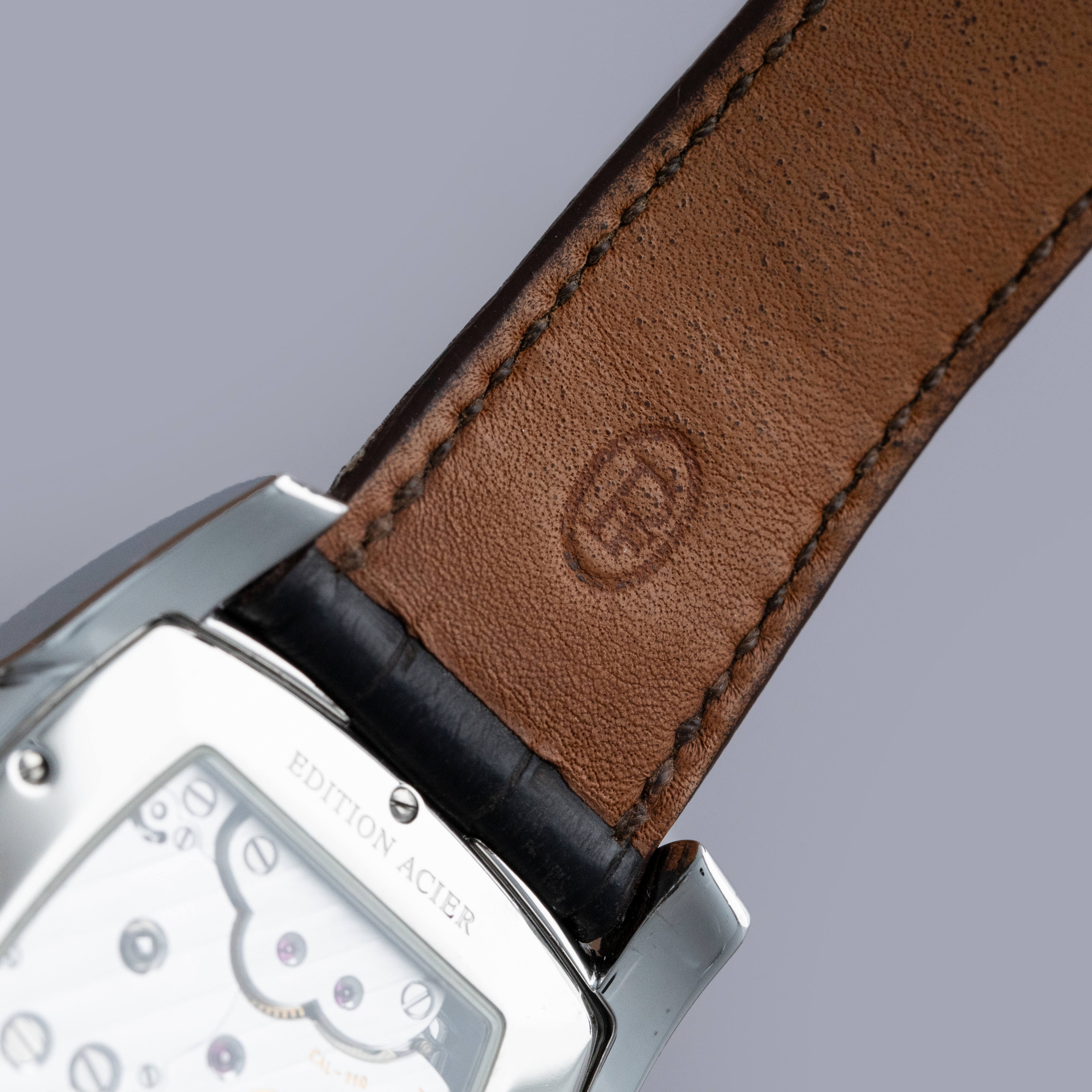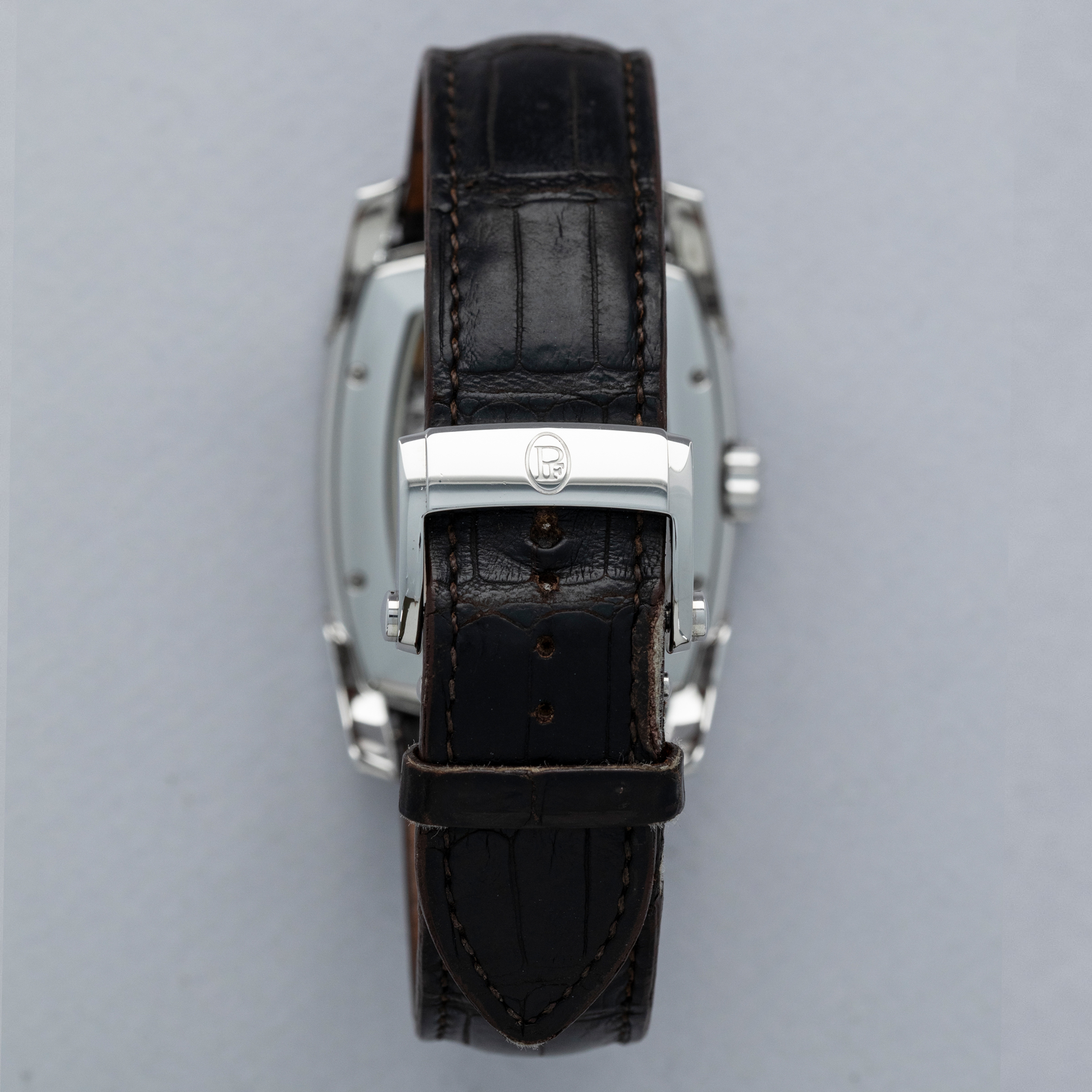 Watch is in overall excellent condition. The steel case has some light scratches and a couple of very light nicks on the bezel. The display case back has well-defined engravings around the edge and light wear on the screw heads. The dial is in excellent condition, and the blued hands are all clean. The watch is fitted with a black alligator PF and Hermès-signed strap with a steel PF deployant clasp. Comes with inner and outer boxes.
