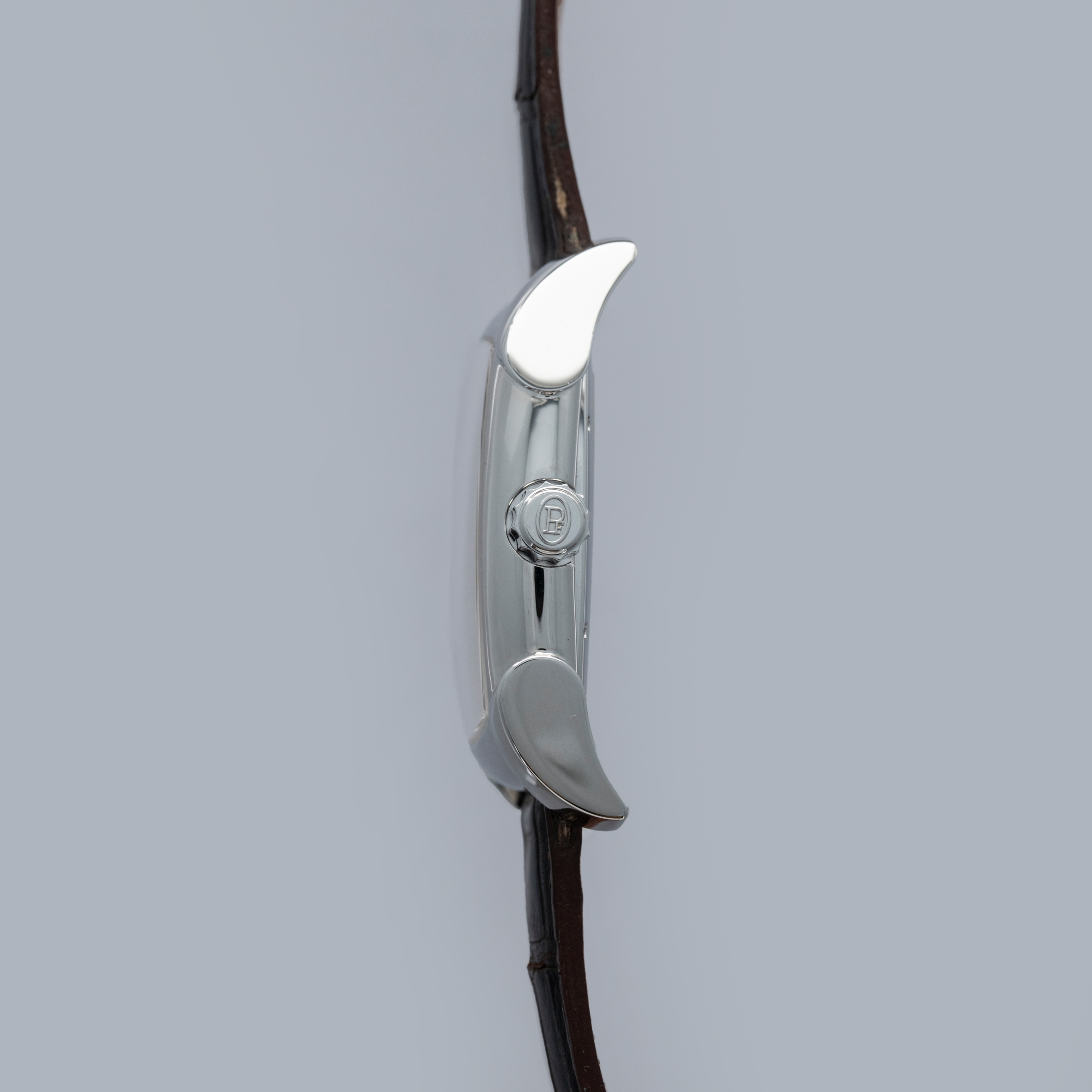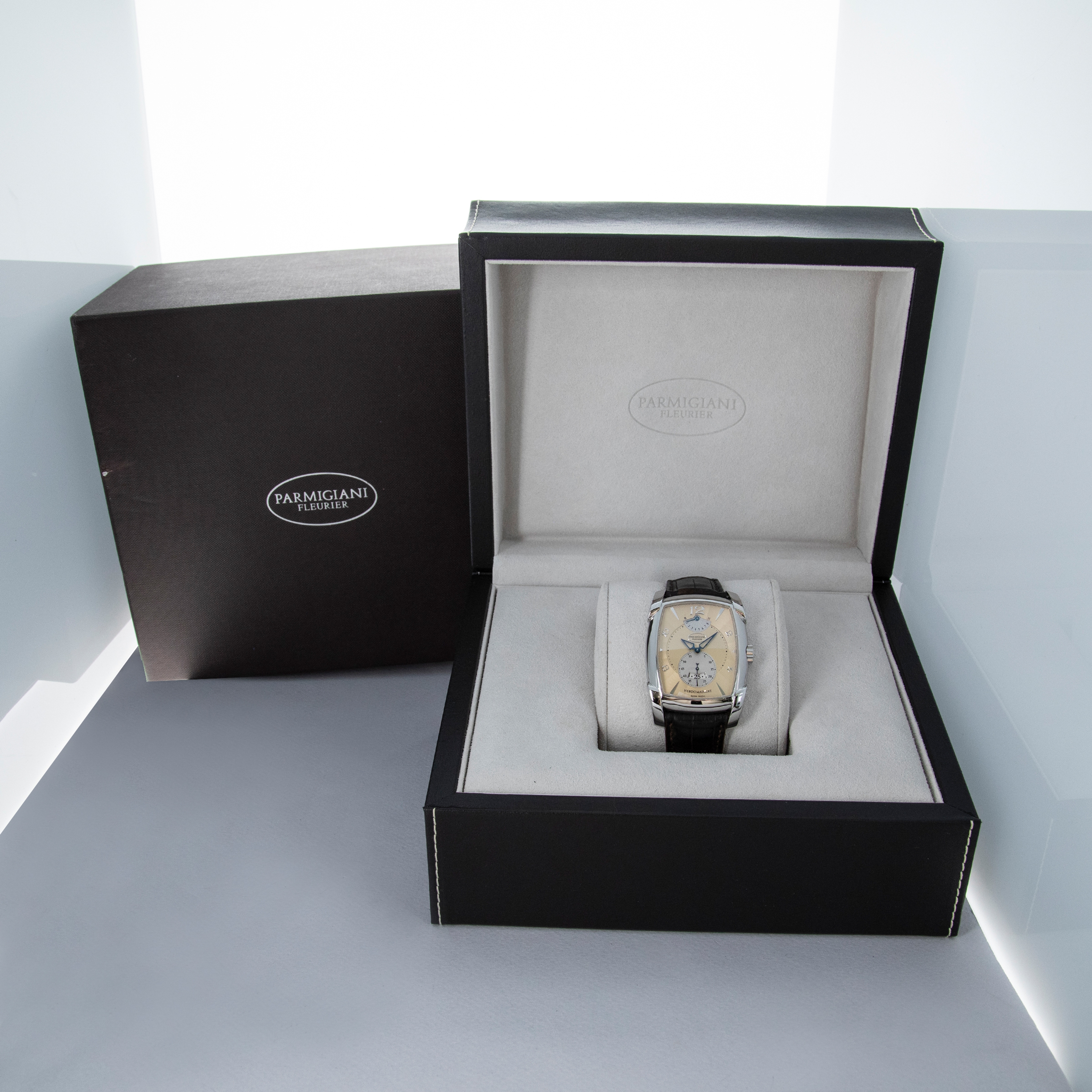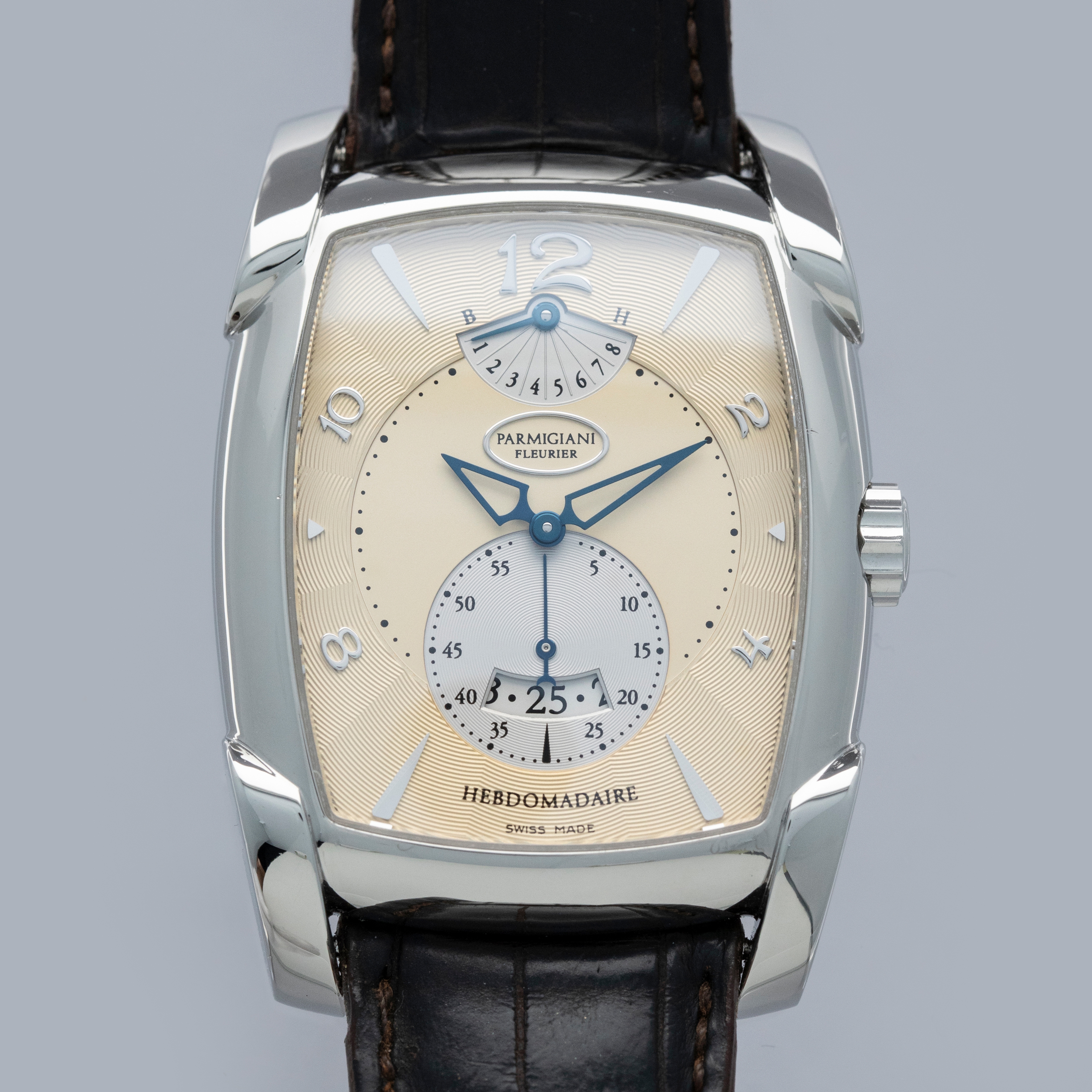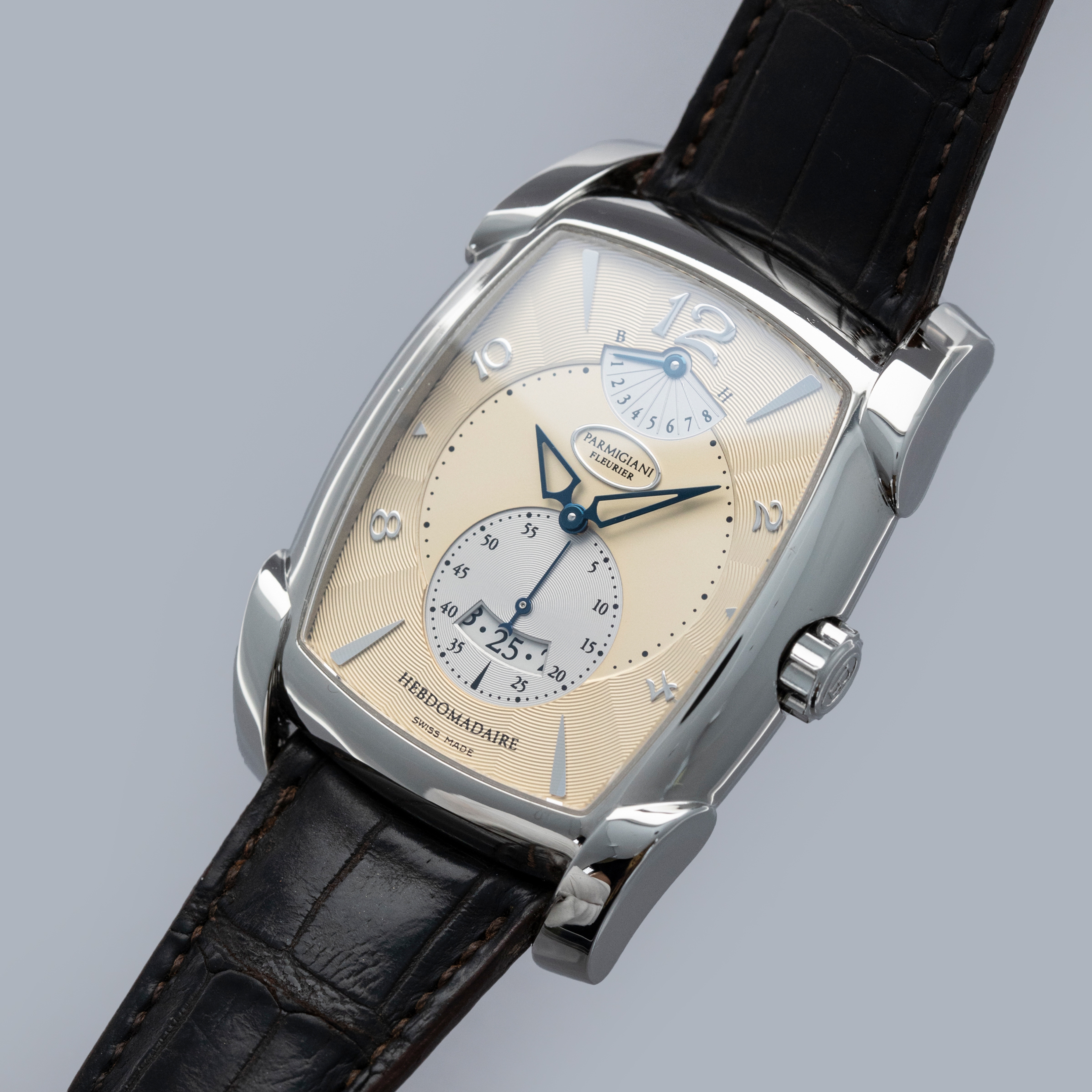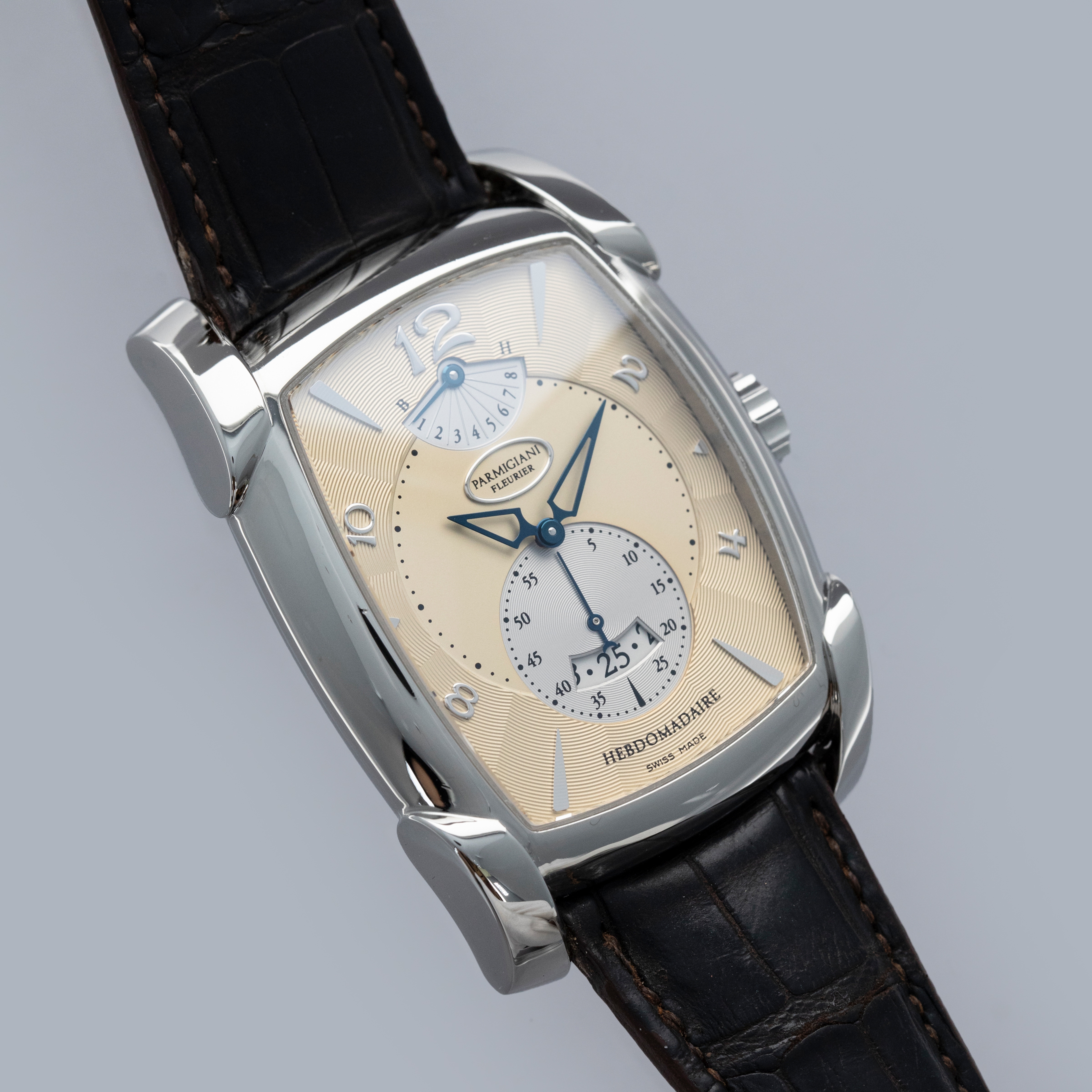 Founded in 1996 by Michel Parmigiani, thanks to the support of the Sandoz Family Foundation, Parmigiani Fleurier has quickly become one of the quiet giants of exquisite Swiss watchmaking. Thanks to their connection to the Sandoz family, Parmigiani Fleurier has been able to draw from technical resources that rival those of the biggest brands in the business. With access to Vaucher Manufacture, suppliers of movements to Richard Mille, Hermes, and other powerhouse brands, Parmigiani Fleurier certainly has the watchmaking heft behind them to perform just as well on the international stage as anyone else, even if their name isn’t as recognizable as some others. Offered here we have the Kalpa XL from the Kalpa collection, launched in 1998 and named after a cosmological unit of time corresponding to one day in the life of Hindu’s god Brahma equivalent to 4.32 billion years. Boasting a stainless steel tonneau-shaped construction with a unique shape and profile thanks to its unusual lugs and swooped bezel, the end result is a watch with a presence on the wrist that few brands have ever achieved. Sporting a light champagne dial with a guilloche engraved periphery, the Kalpa XL showcases Parmigiani’s impressive craftsmanship. Offered as a complicated variant of the Kalpa XL, the exact variant we have here is the Hebdomadaire, with an 8-day power reserve – as indicated by its power reserve indicator at 12 o’clock that is joined by a date display, all of which are balanced by a running seconds subdial at 6 o’clock.