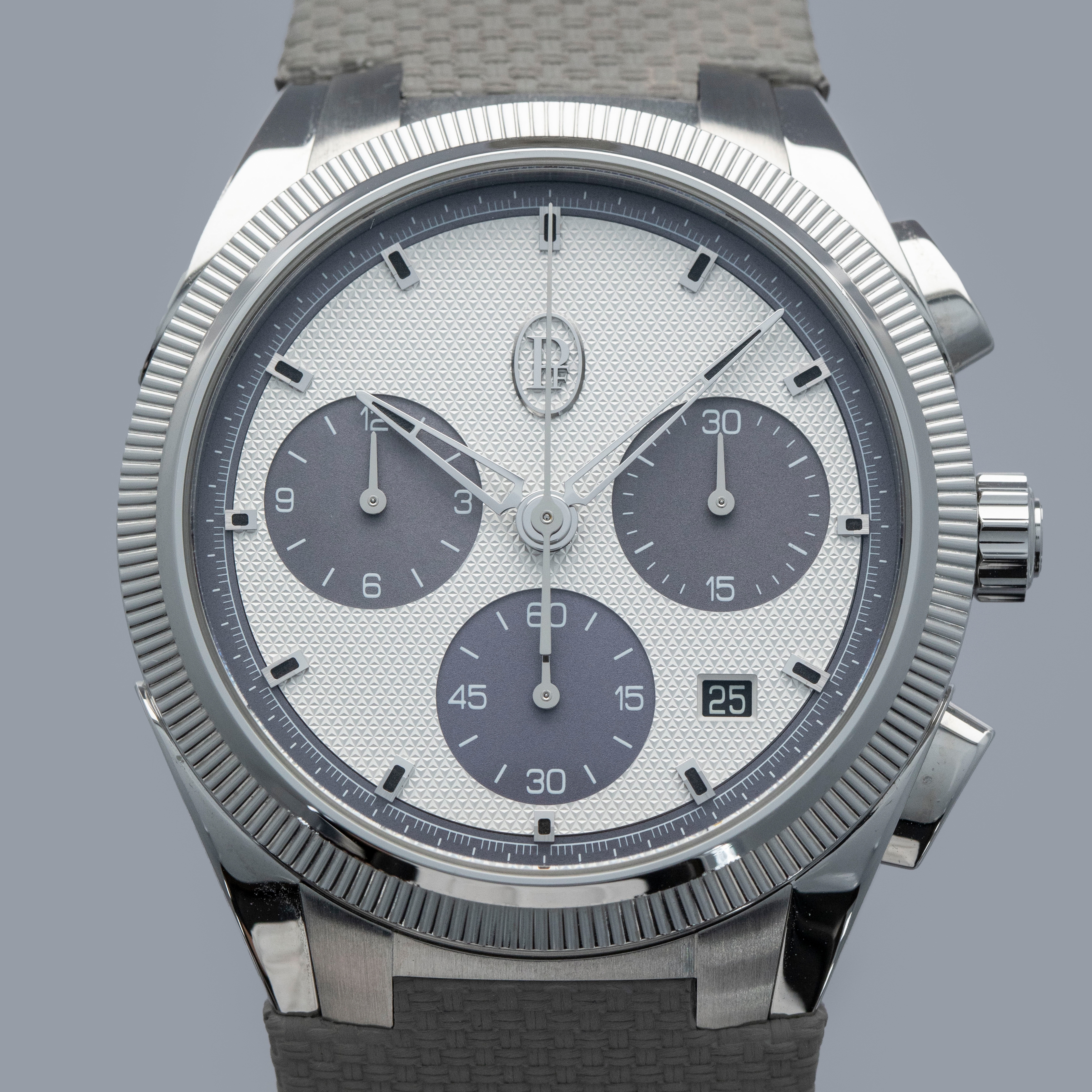 Featuring a silver dial with London Gray subdials, the Tonda PF Sport Chronograph boasts a wonderful blend of textures across its surfaces that set its display off, with its center sporting a clou triangulaire finish.