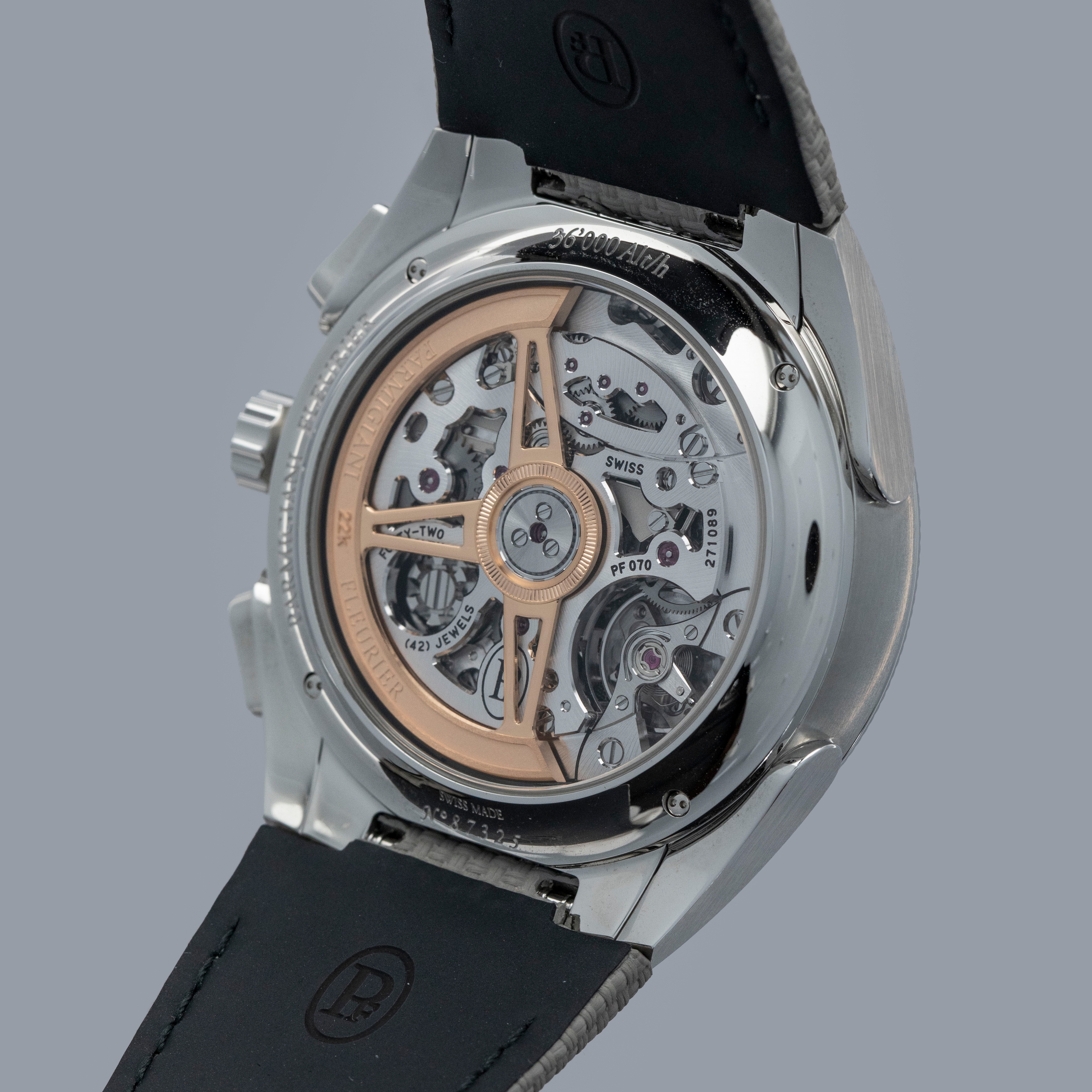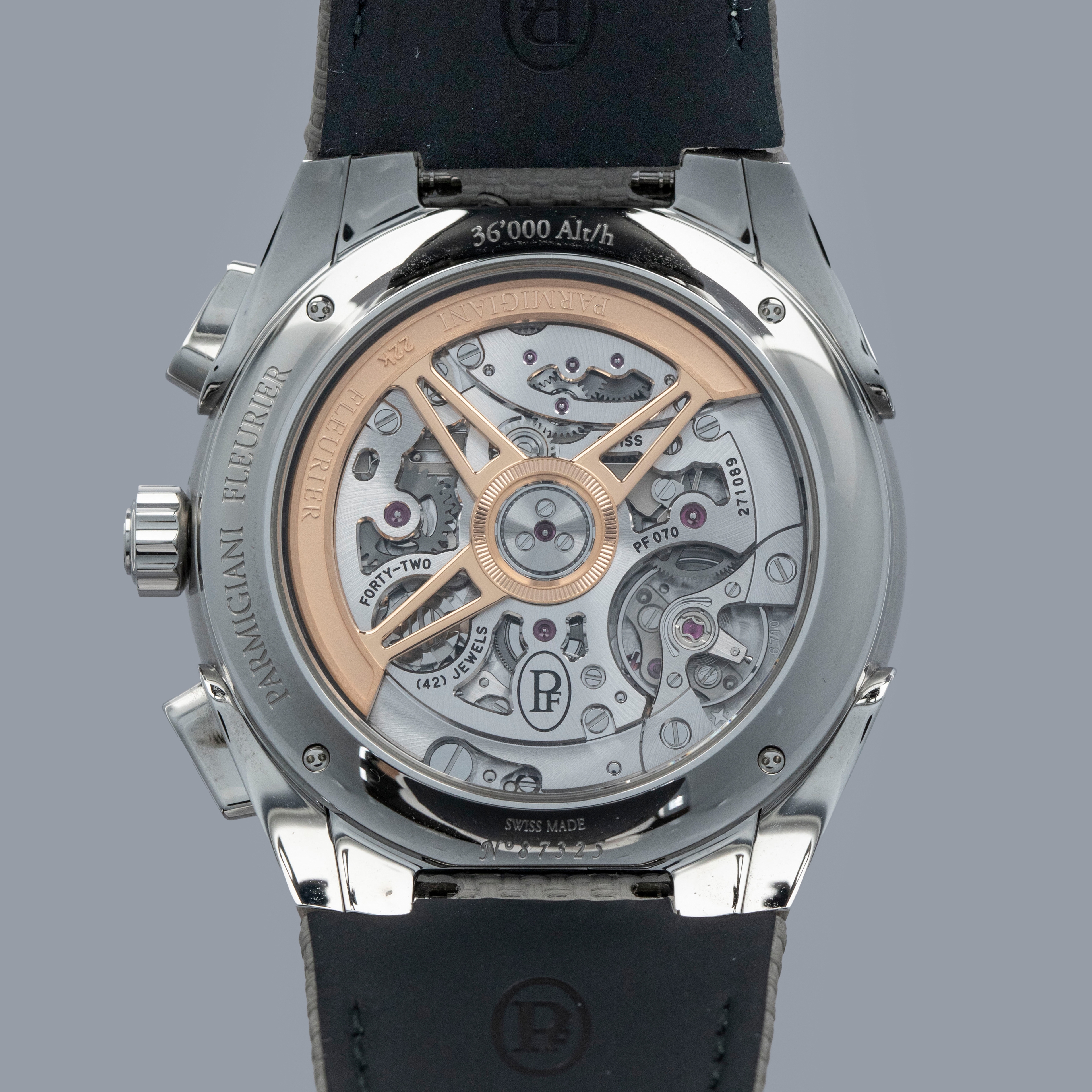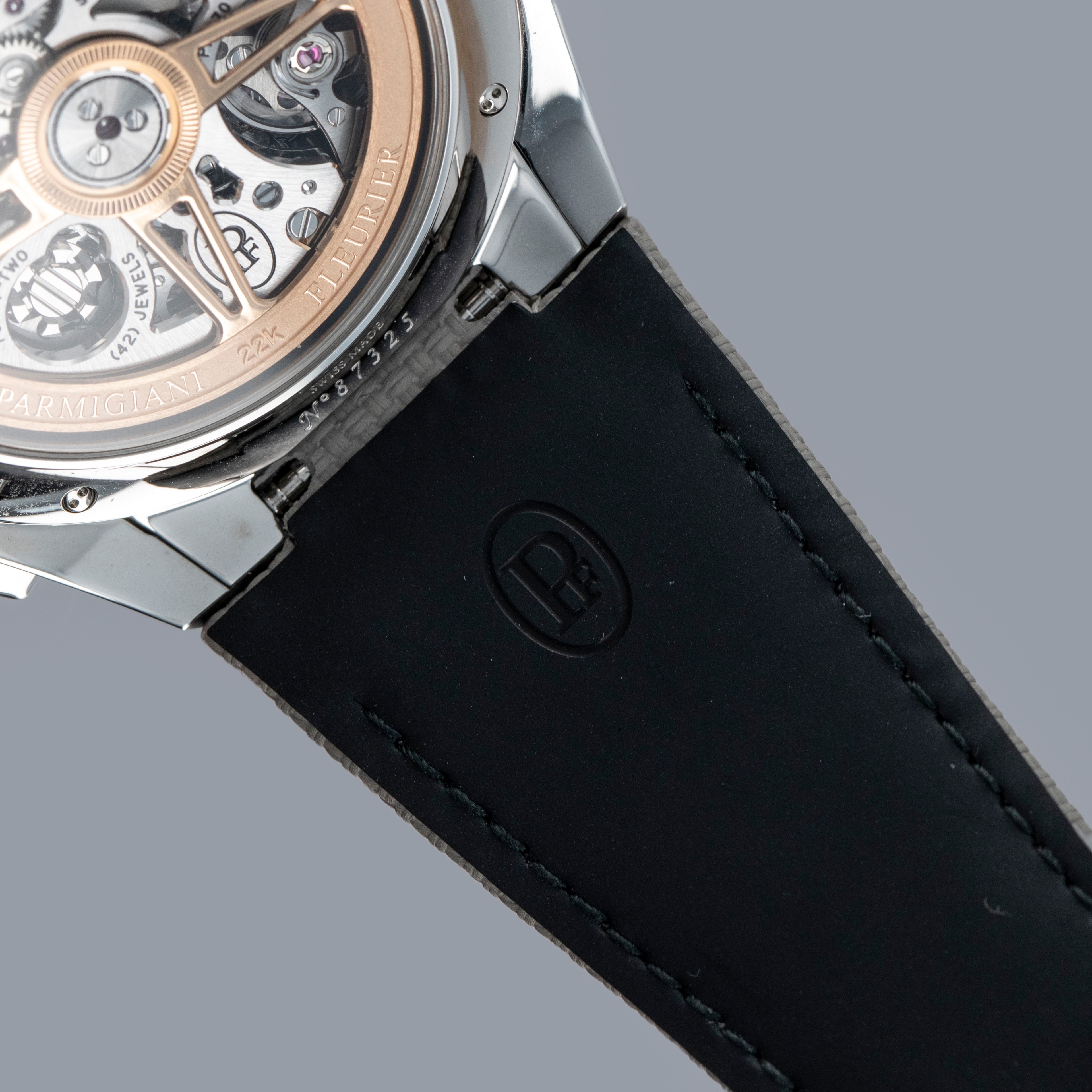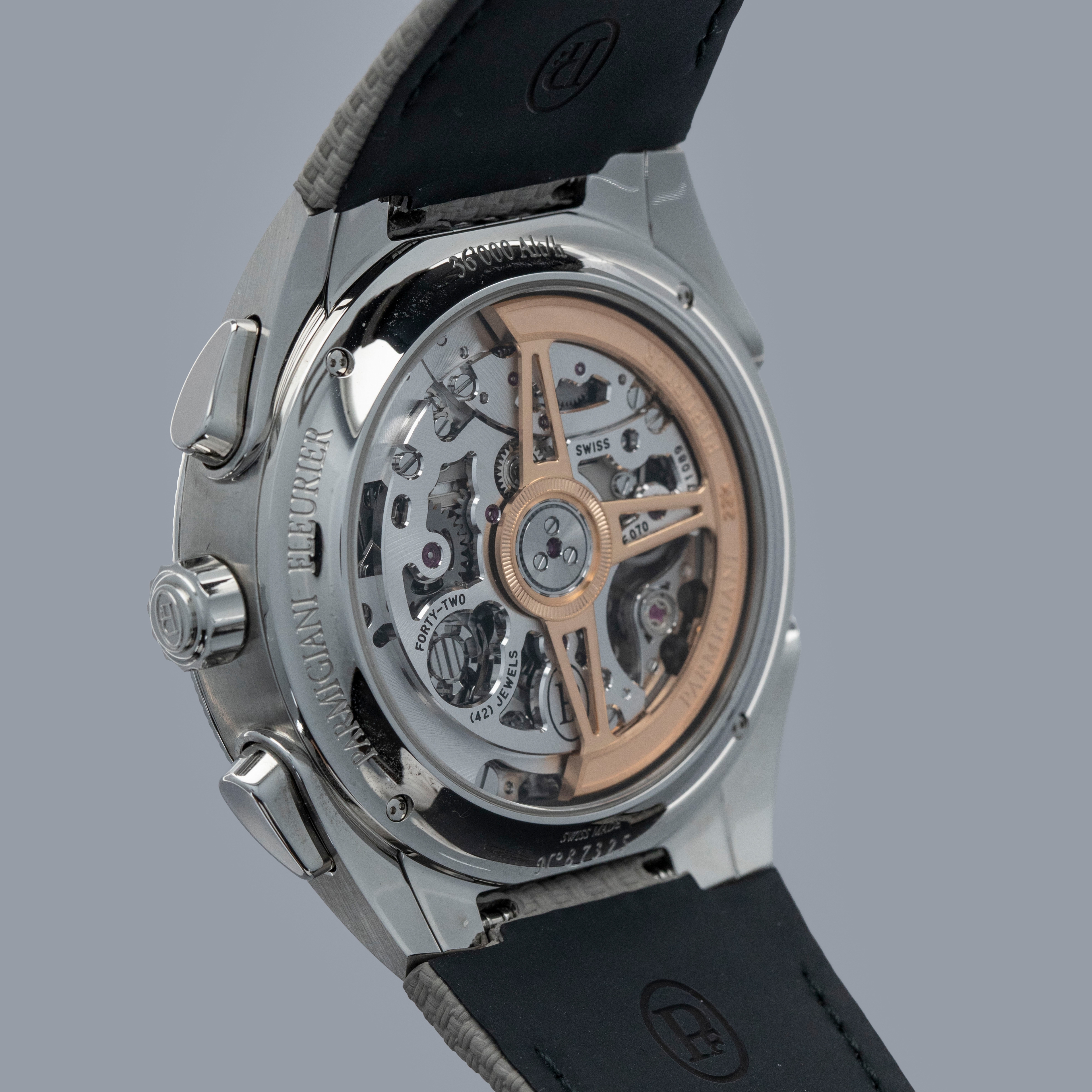 Watch is in overall like-new condition. The case shows only light signs of wear. It is fitted with a strap and a Parmigiani Fleurier steel pin buckle.