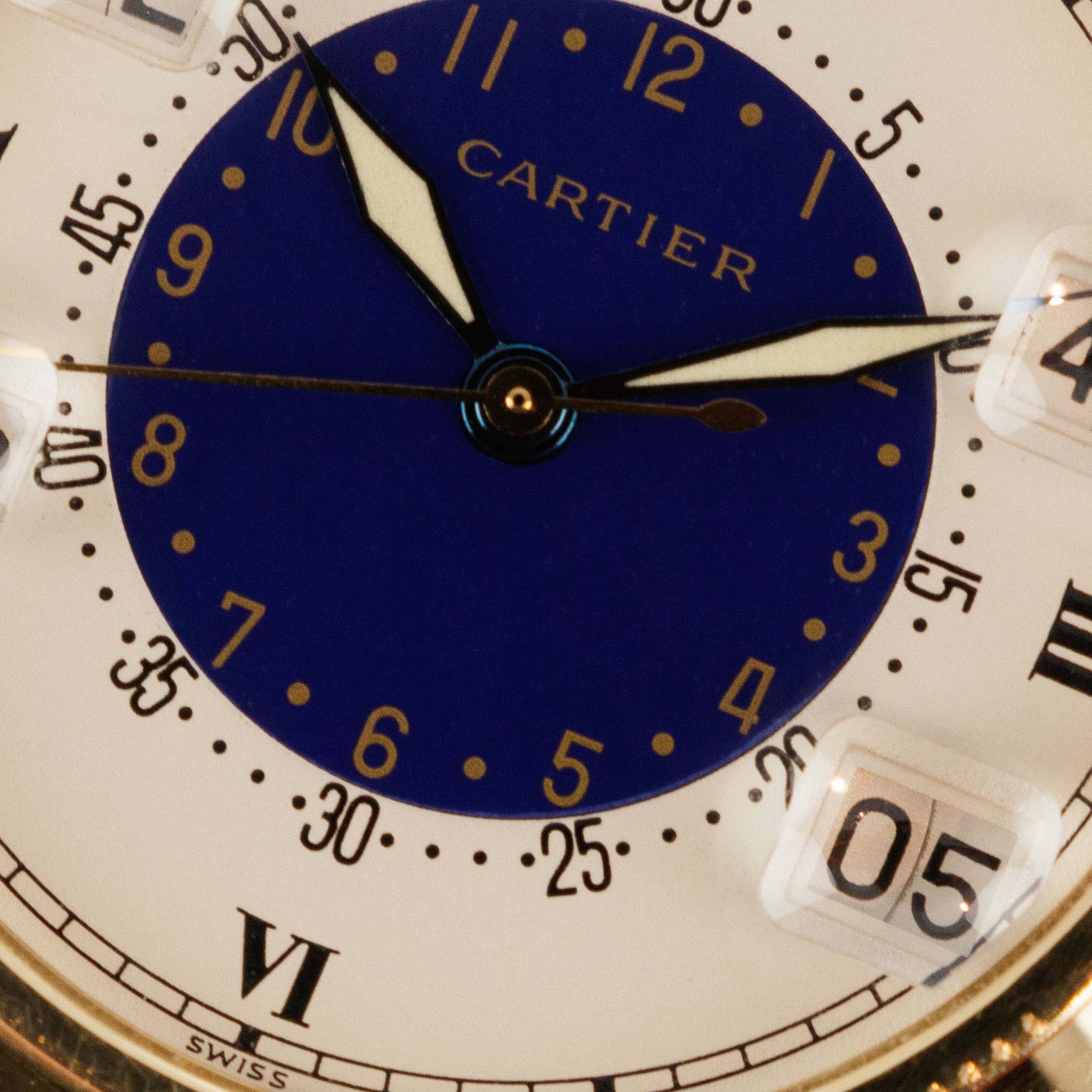 Inspired by some of Genta’s earlier work from his eponymous brand, the Cartier Pasha Golf is a timepiece designed for use on the golf course, as its name suggests. By using four separate apertures at 2, 4, 8, and 10 o’clock in conjunction with corresponding individually colored cabochon-capped pushers, the Pasha Golf can keep the count of four people’s golf score. Originally offered with a quartz or automatic movement, the example we have here is the rarer automatic variant, as discoverable through the Pasha Golf’s sapphire crystal caseback. In addition, this example also sports the two-tone blue and cream dial exclusive to the 1980s variants of the Pasha Golf, with later 1990s examples featuring solid silver dials. Measuring 38mm in diameter, this luxurious 18kt yellow gold beauty is a wonderfully unique timepiece that plays on Cartier’s historic design legacy and Gerald Genta’s own desire to create unusual timepieces that breaks from the mold and excites in new ways – just as the Pasha Golf does.