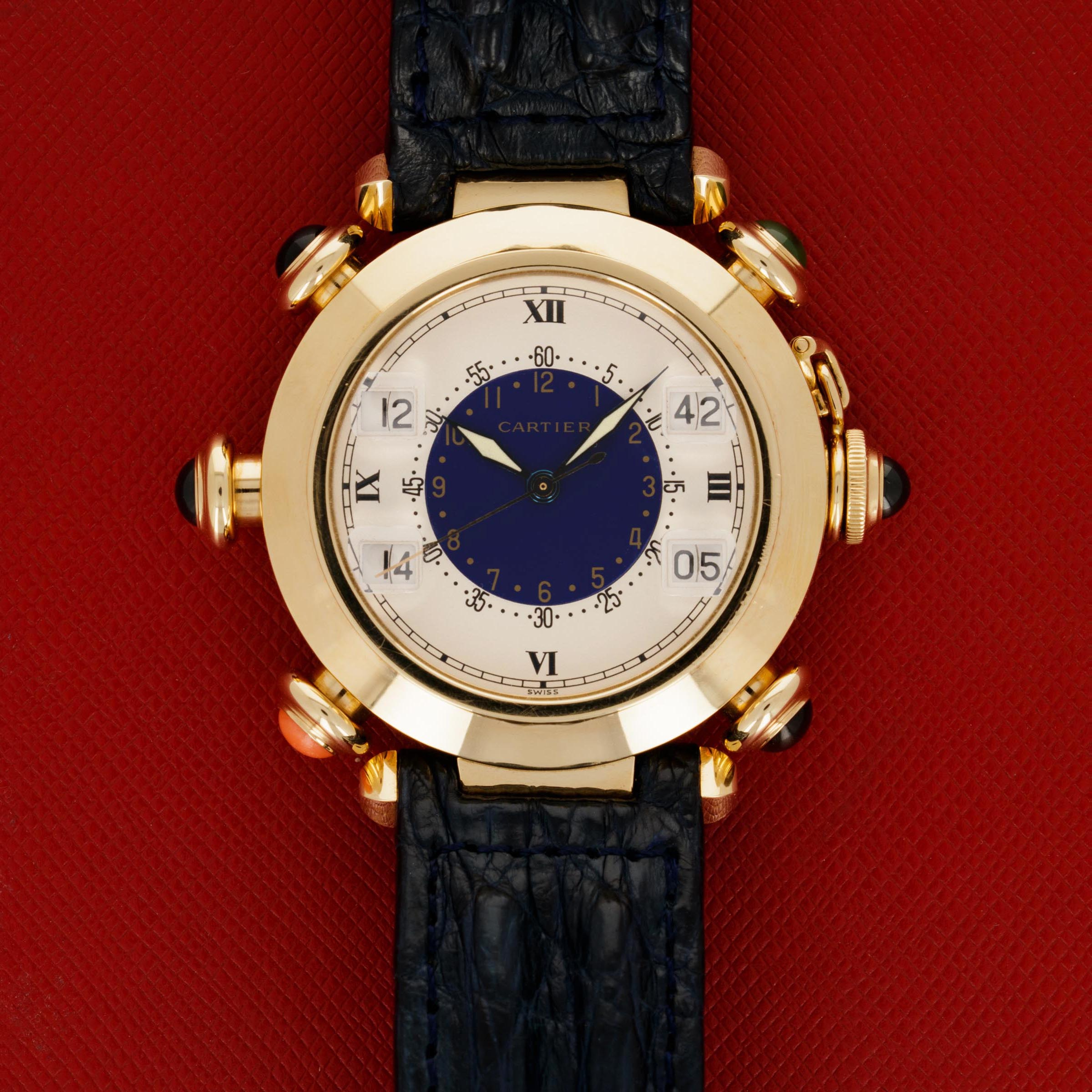 With its round 38mm yellow gold case carrying four pushers and two symmetrical winding crowns, this Pasha's construction resembles a ship's wheel in line with Cartier's classical "helm" aesthetic.