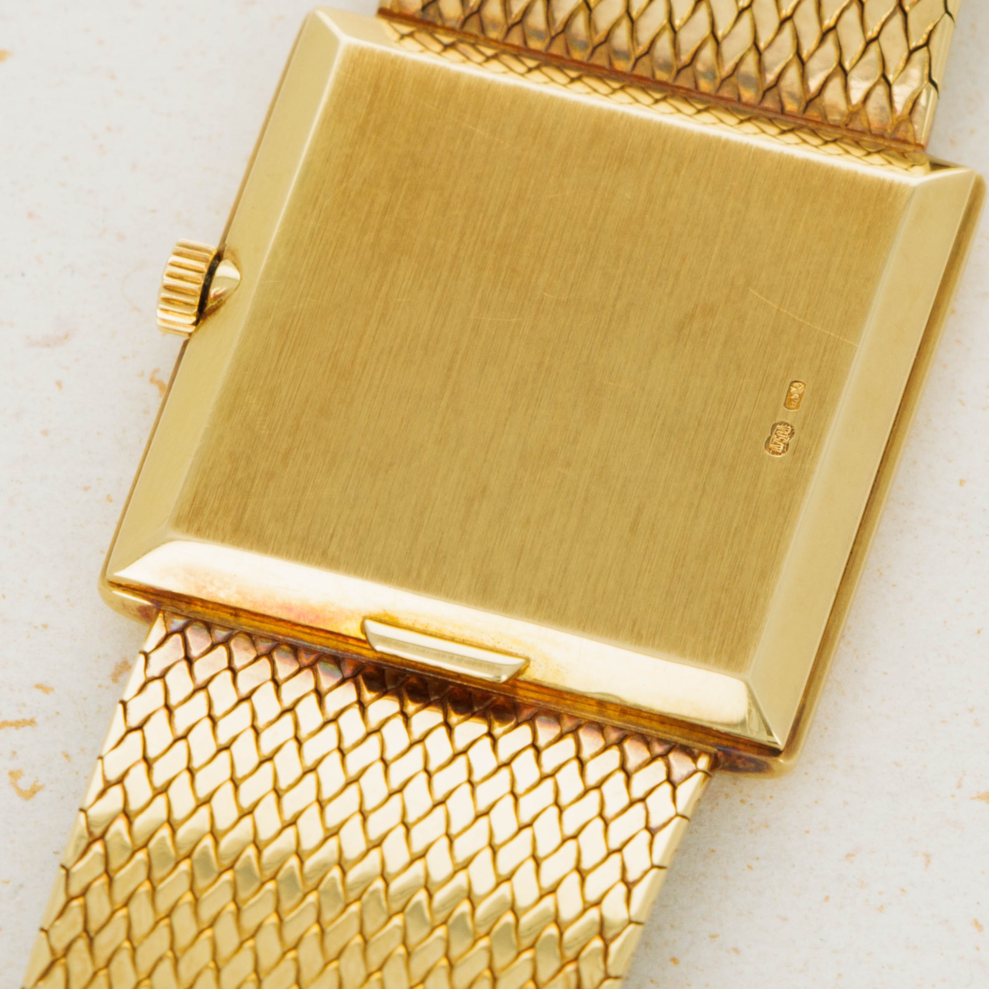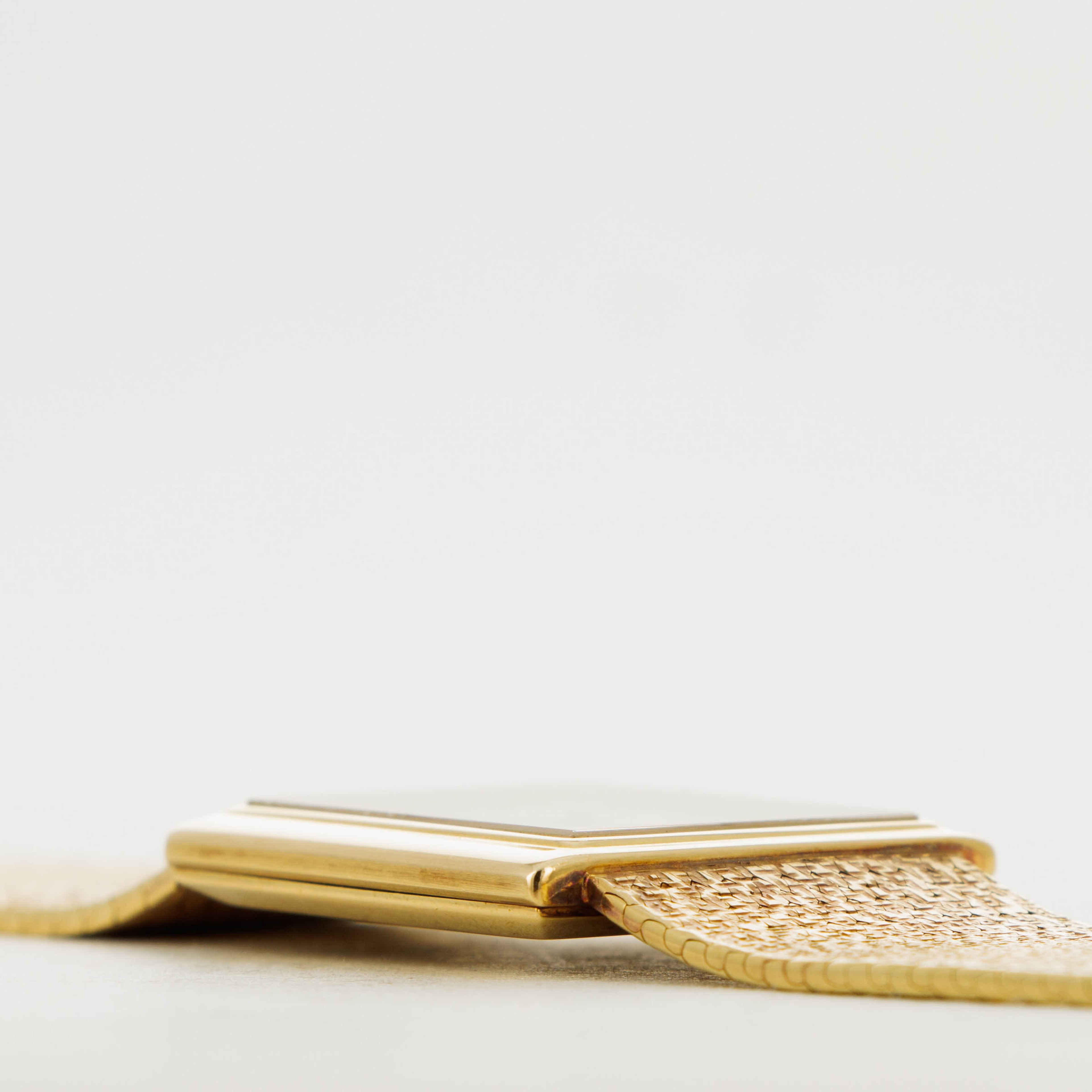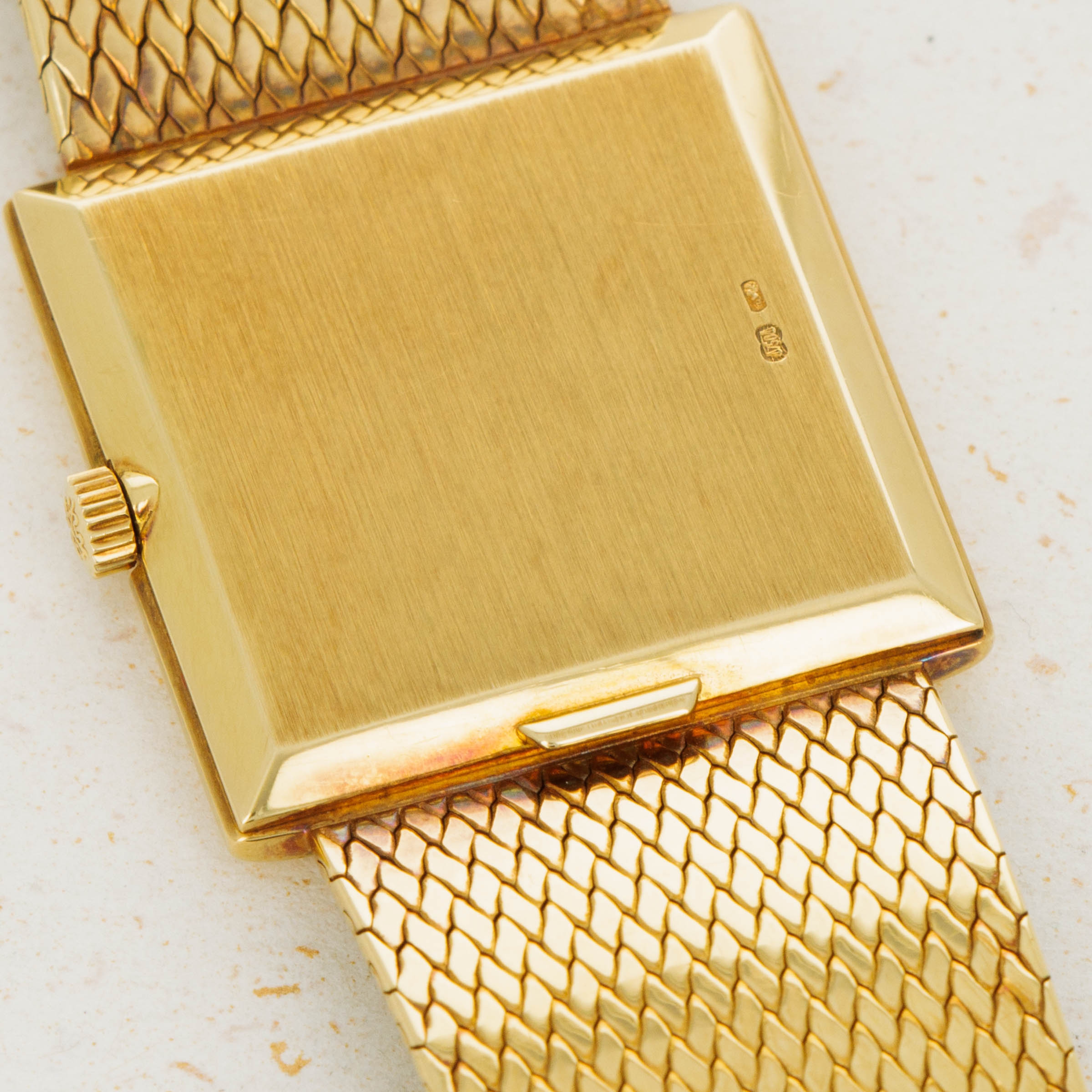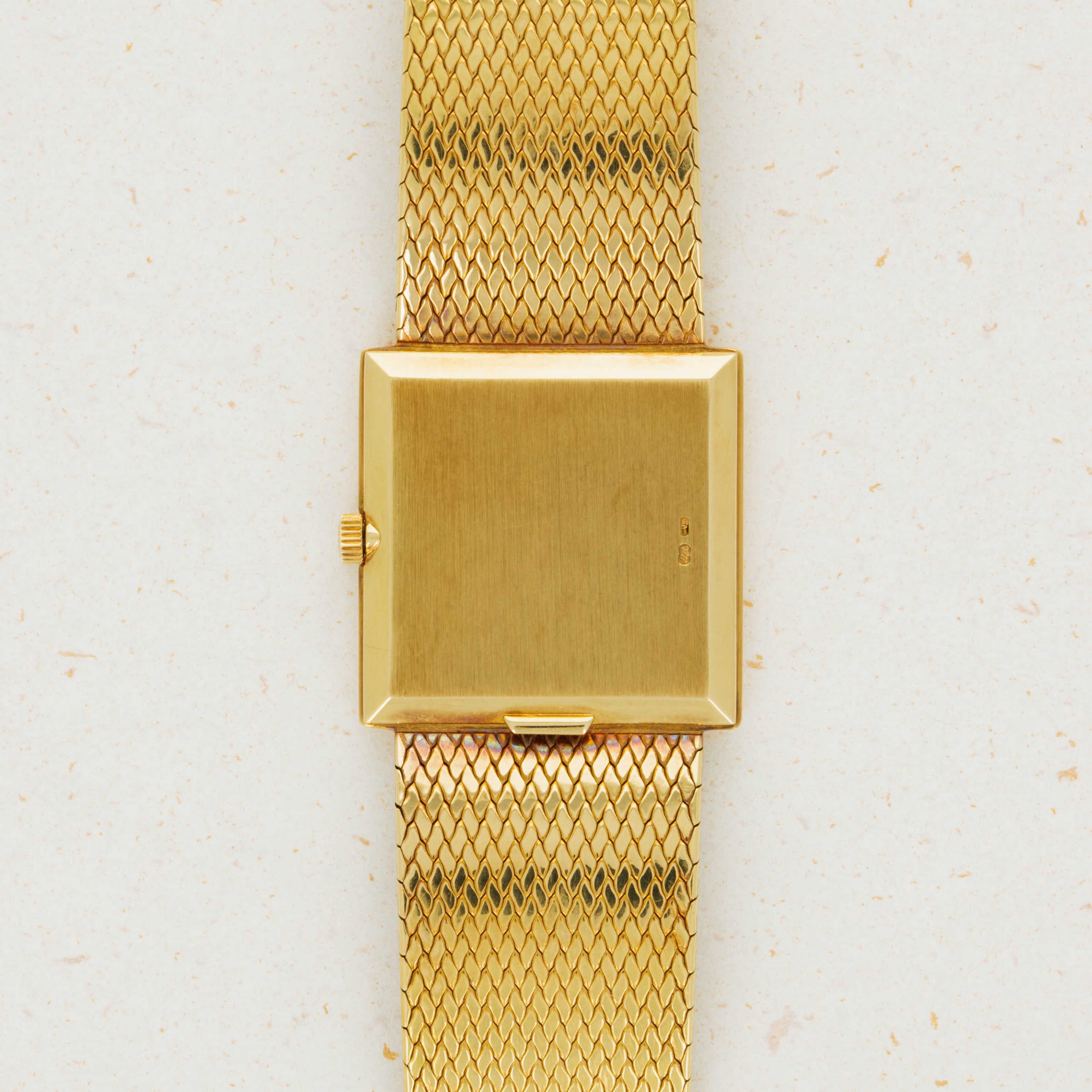 While it features pleasing proportions at 26mm x 26mm, the ref. 3671 wears a little larger than its measurements suggest thanks to its 18kt yellow gold mesh bracelet from famed Genevan bracelet atelier Jean-Pierre Ecoffey.