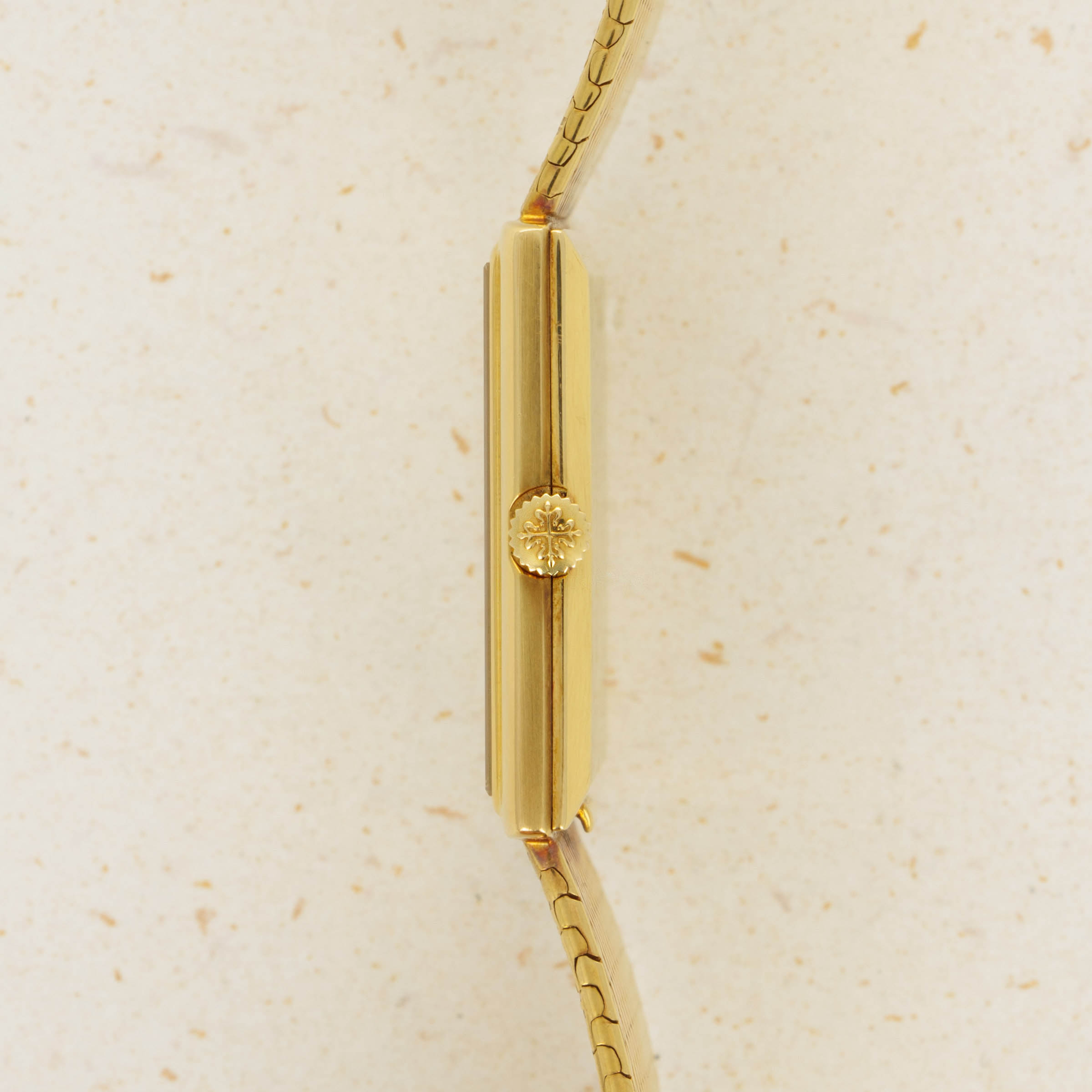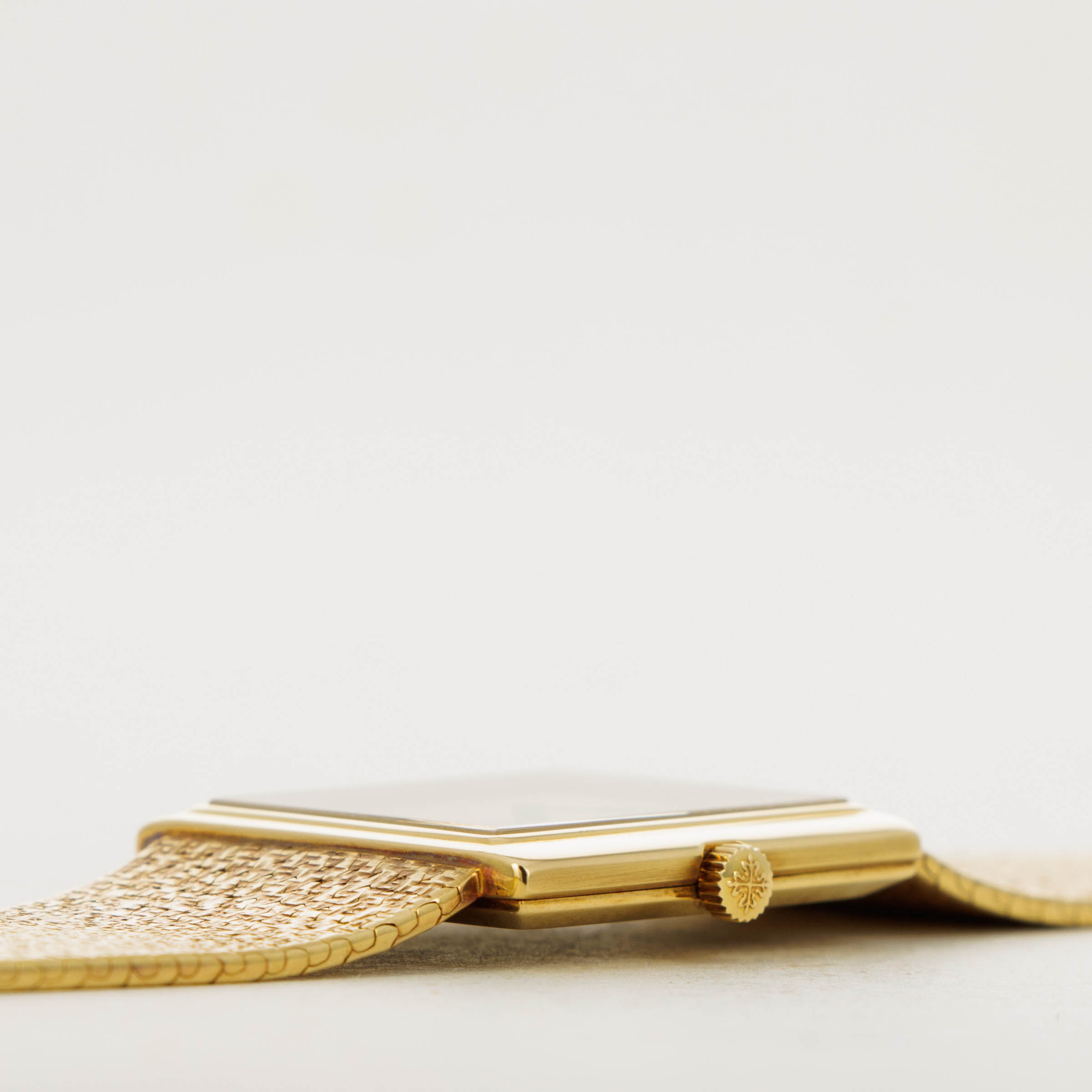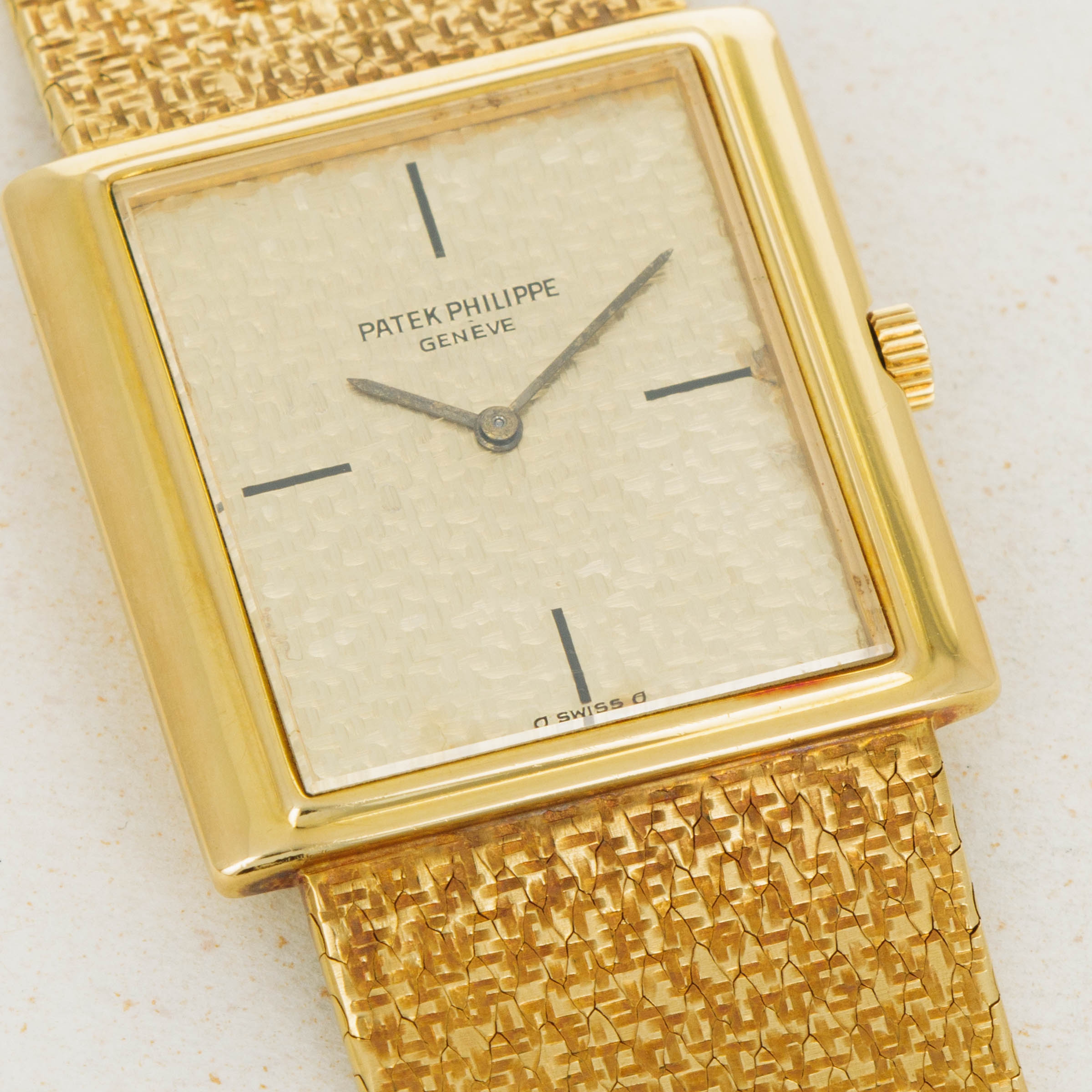 Featuring a rectangular golden dial within its square case, the ref. 3671's dial provides an immediately distinctive aesthetic in its 18kt yellow gold housing. With quarter indices, small sword-shaped hands, and a unique texture this ref. 3671's display is made all the more special thanks to how it reflects the texture found along its bracelet.
