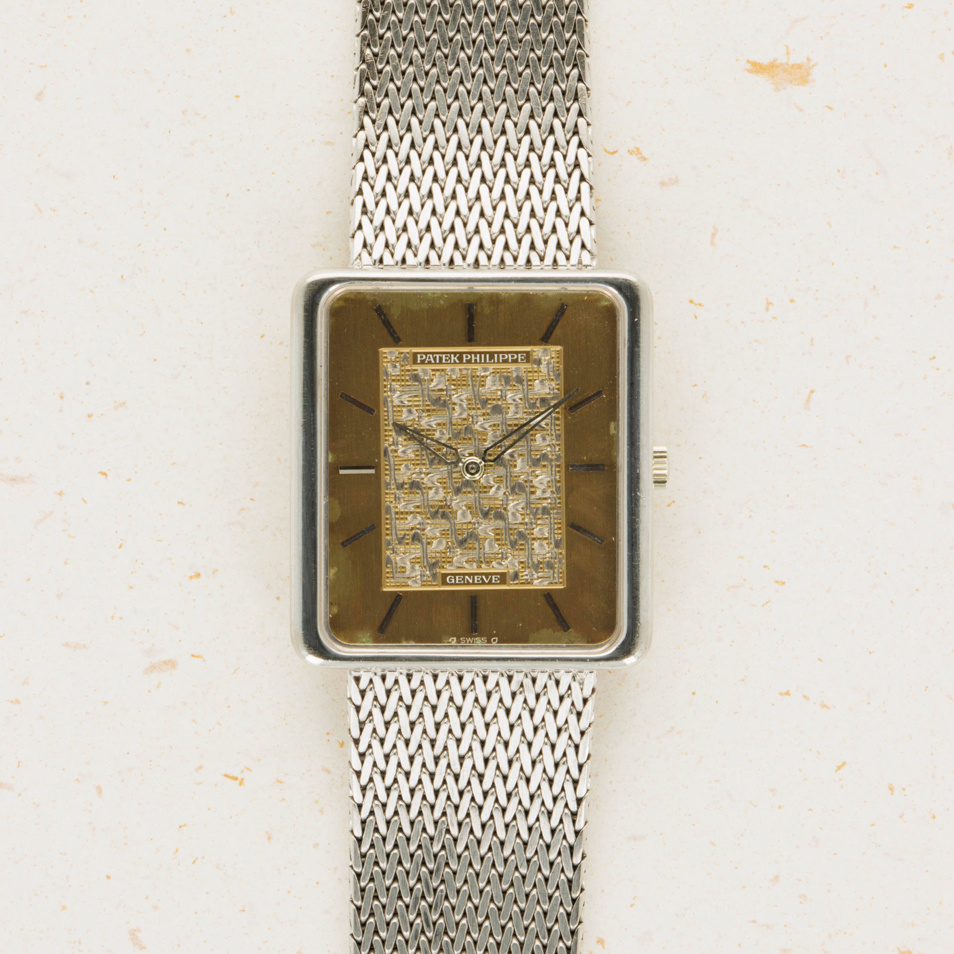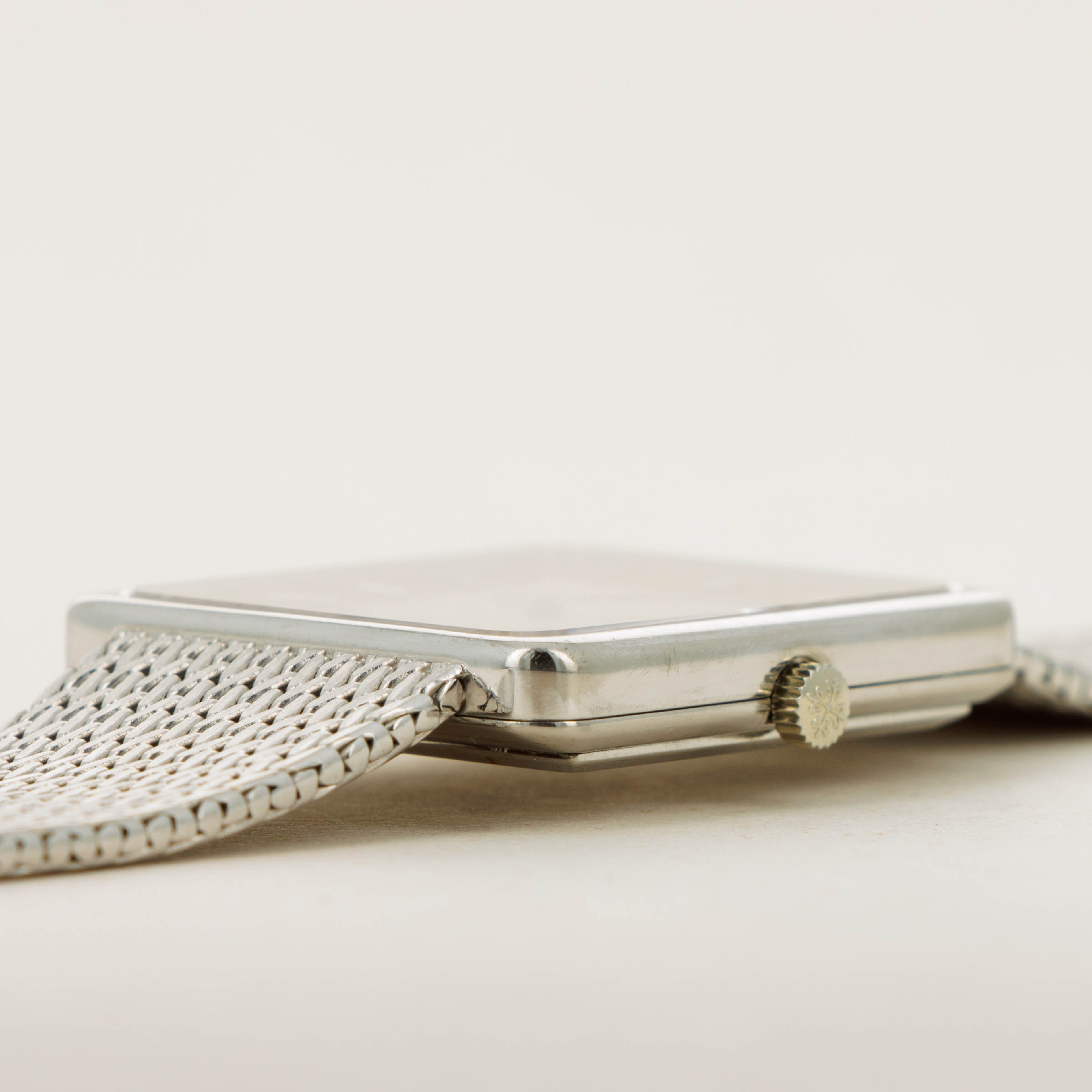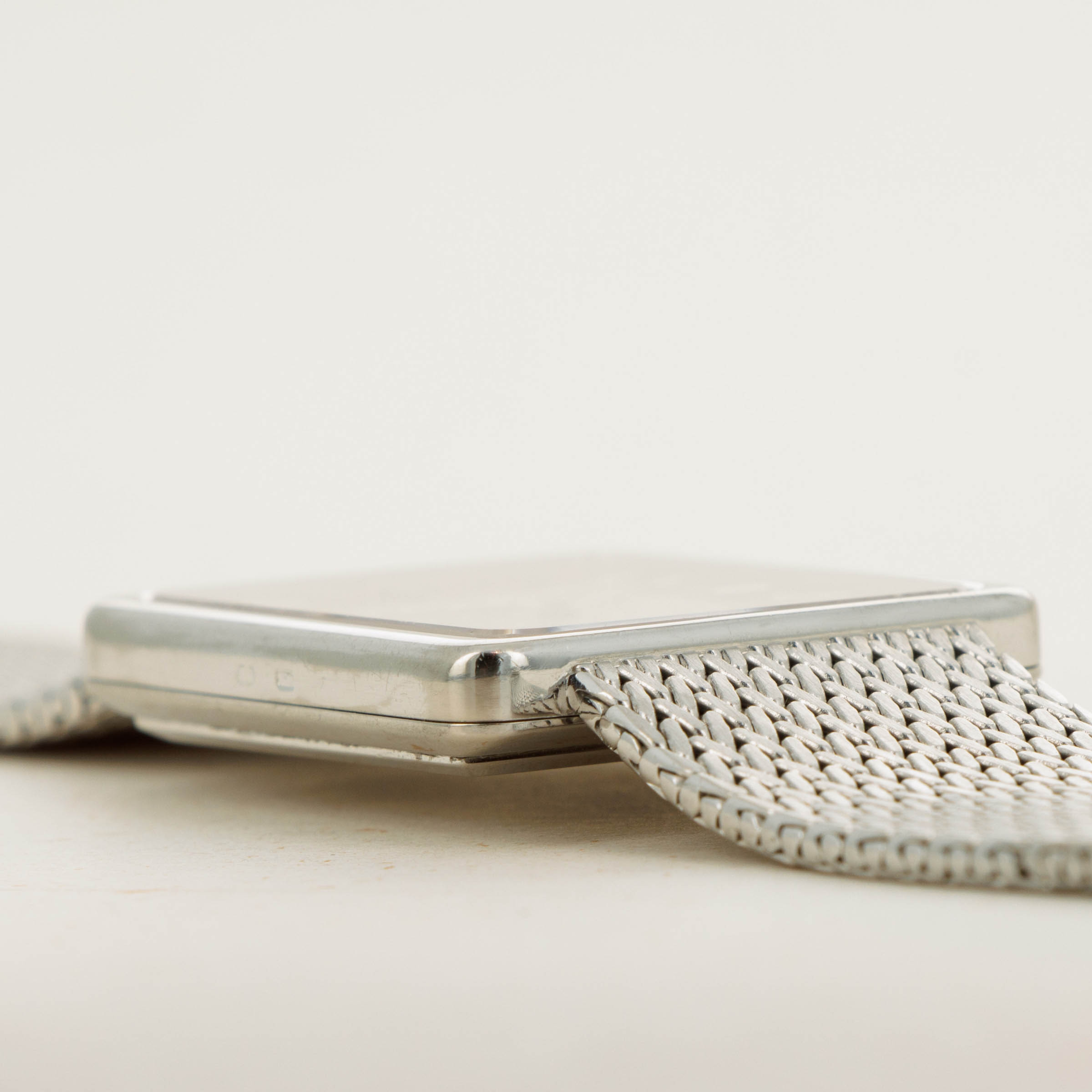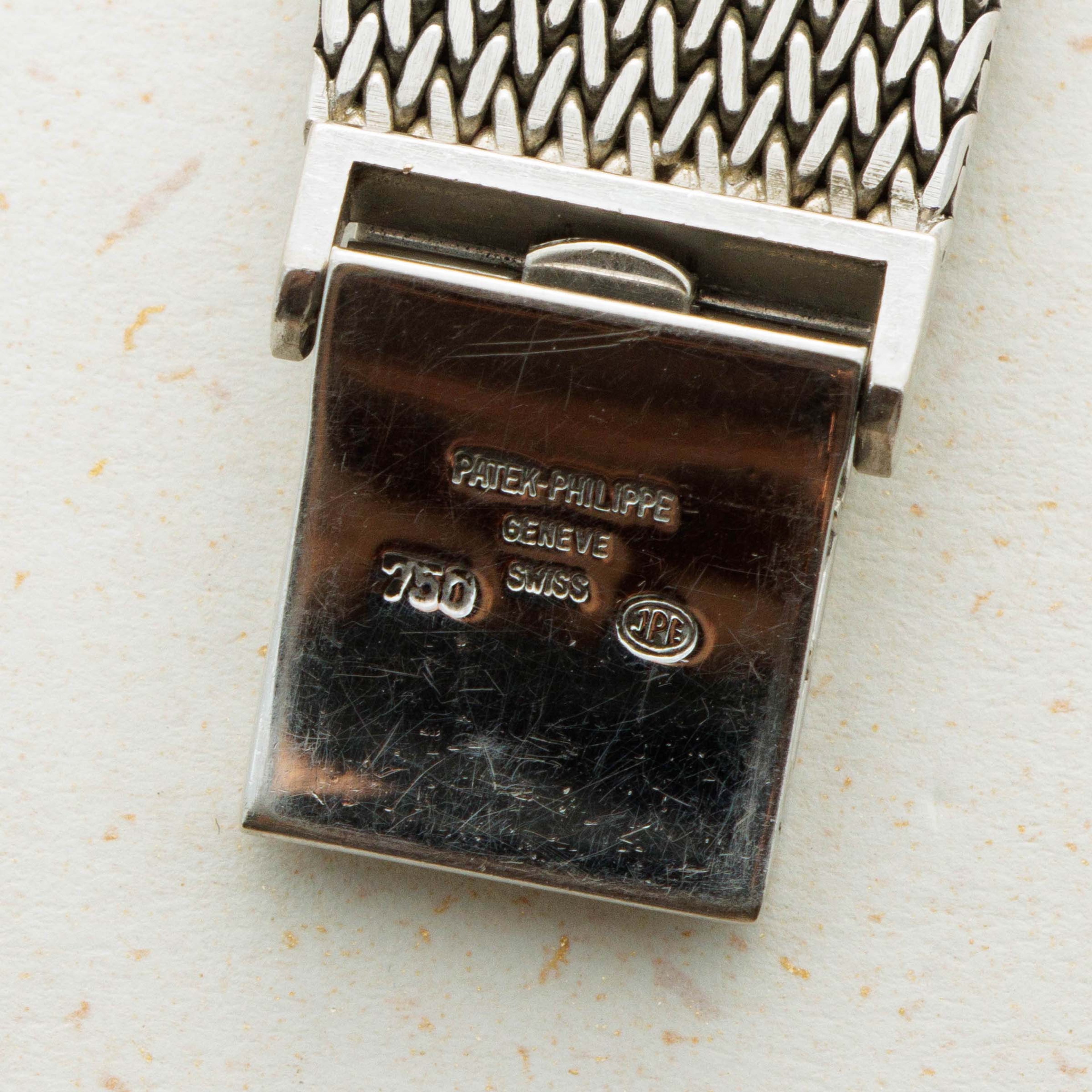 While it features pleasing proportions at 31mm x 28mm, the ref. 3799 wears a little larger than its measurements suggest thanks to its 18kt white gold mesh bracelet from famed Genevan bracelet atelier Jean-Pierre Ecoffey.
