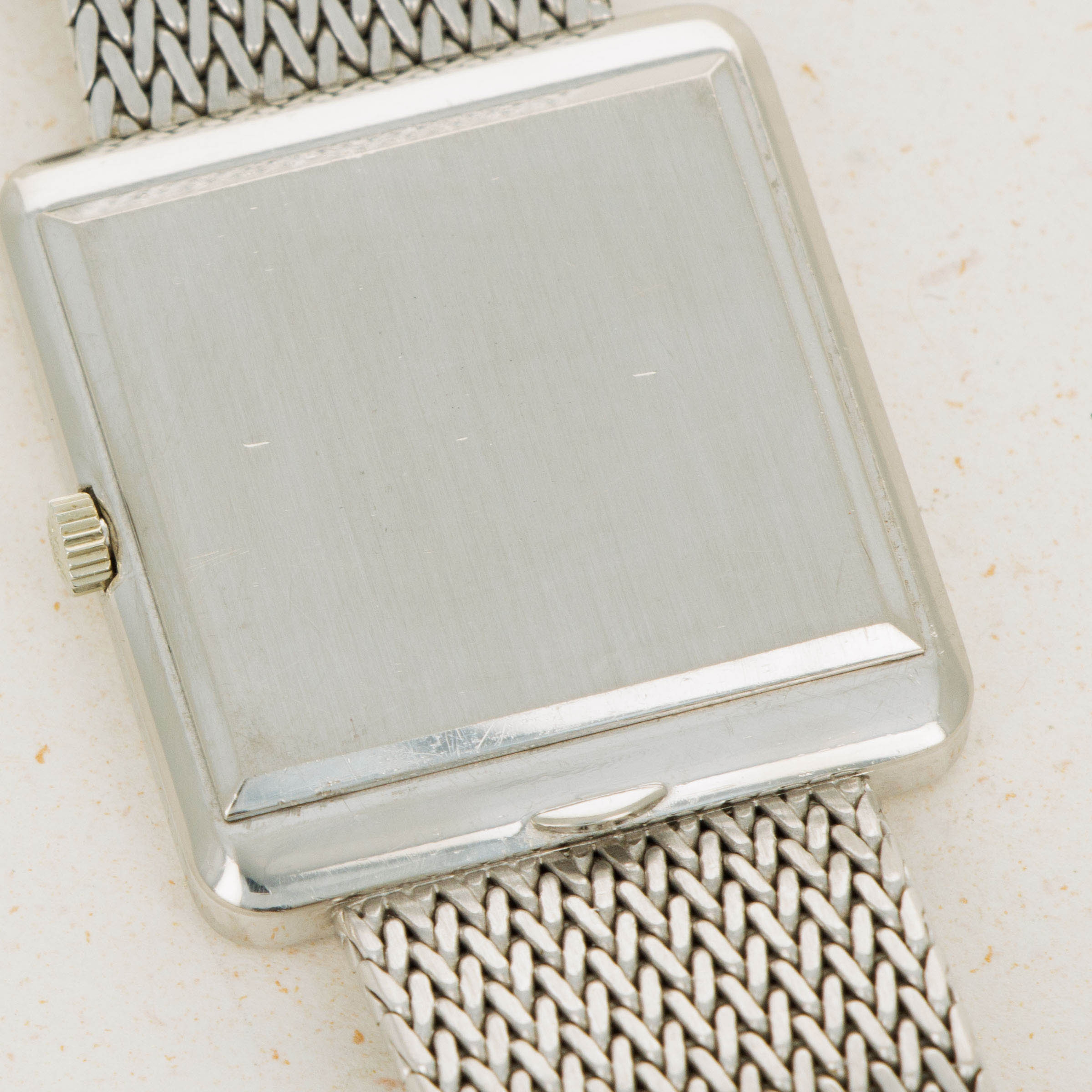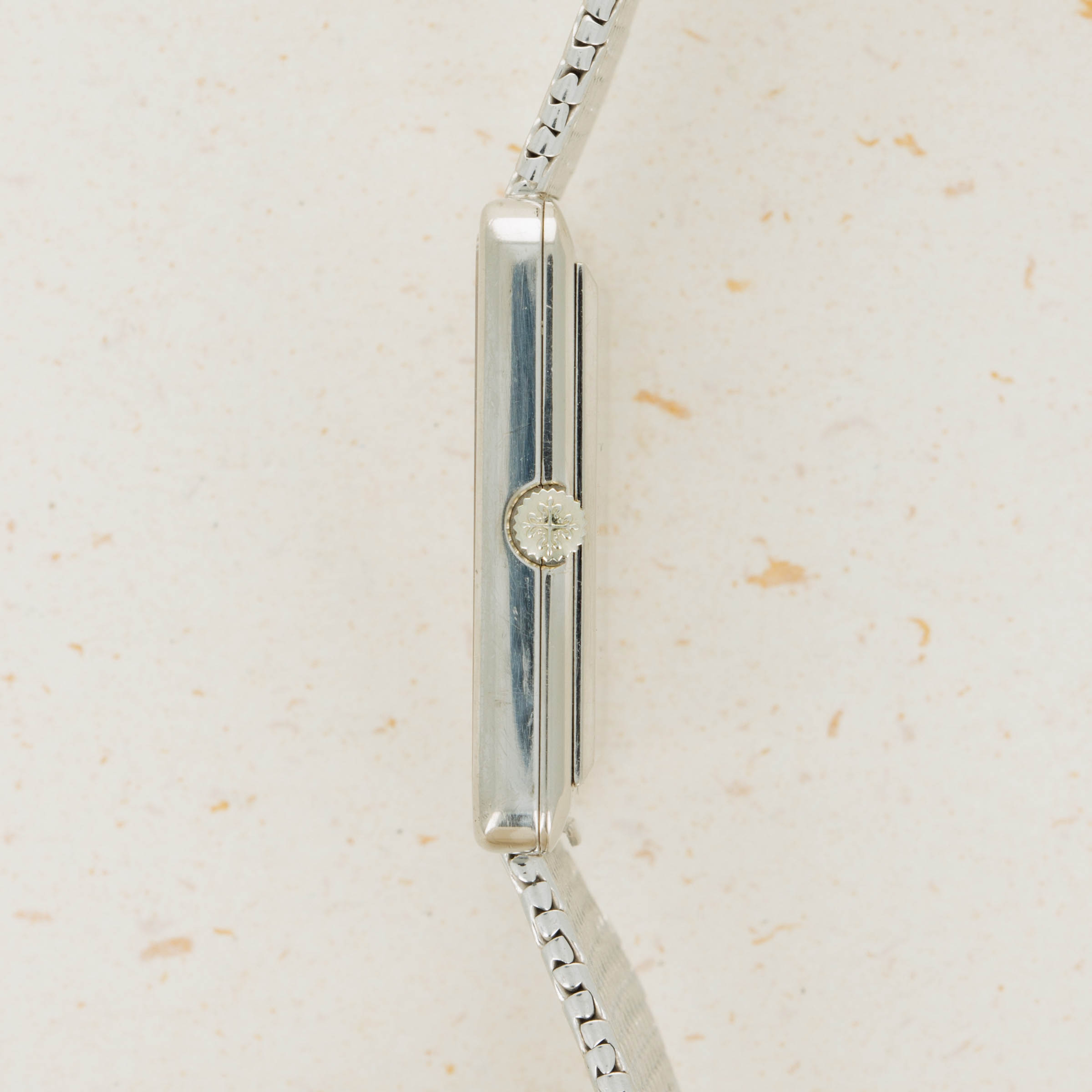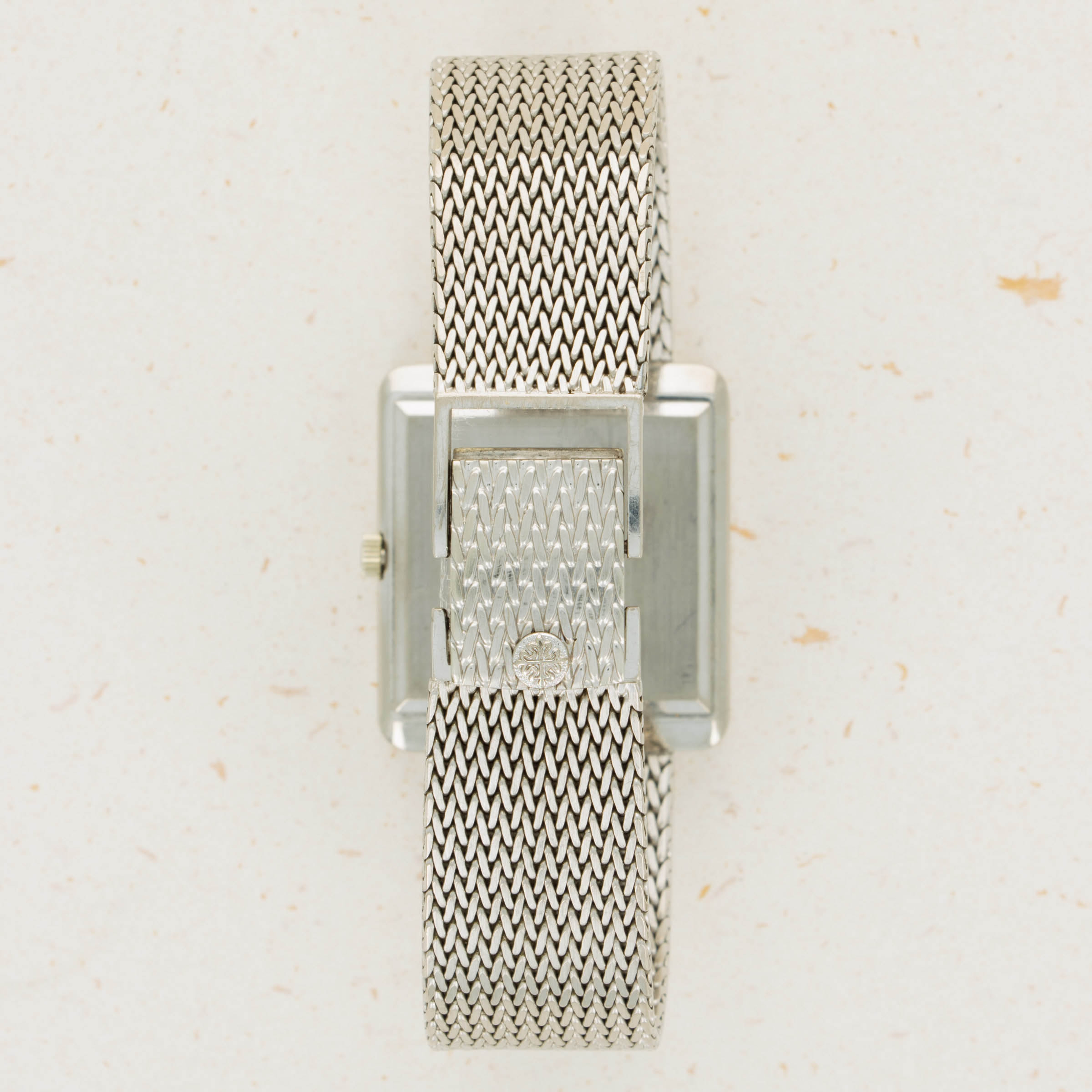 While it features pleasing proportions at 31mm x 28mm, the ref. 3799 wears a little larger than its measurements suggest thanks to its 18kt white gold mesh bracelet from famed Genevan bracelet atelier Jean-Pierre Ecoffey.