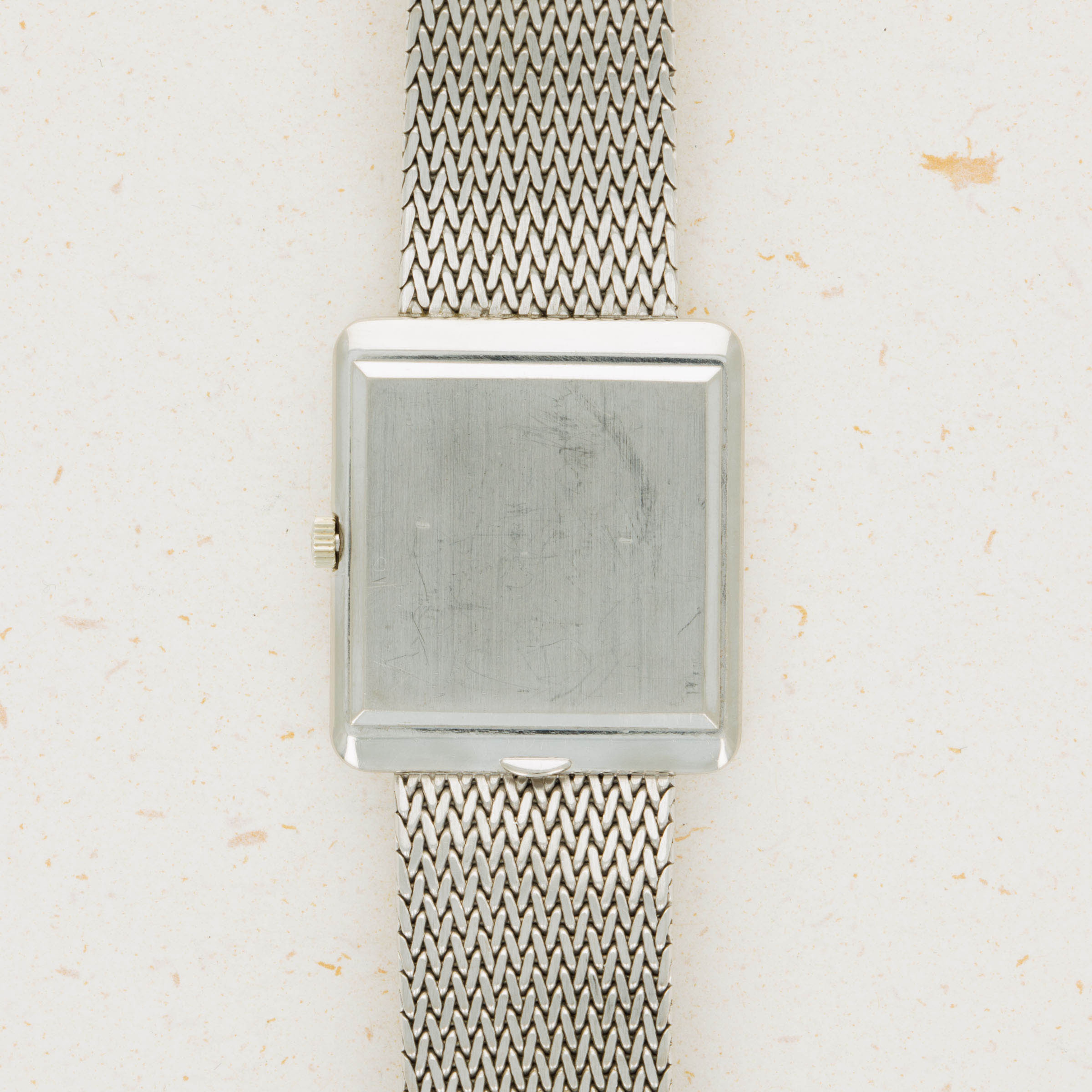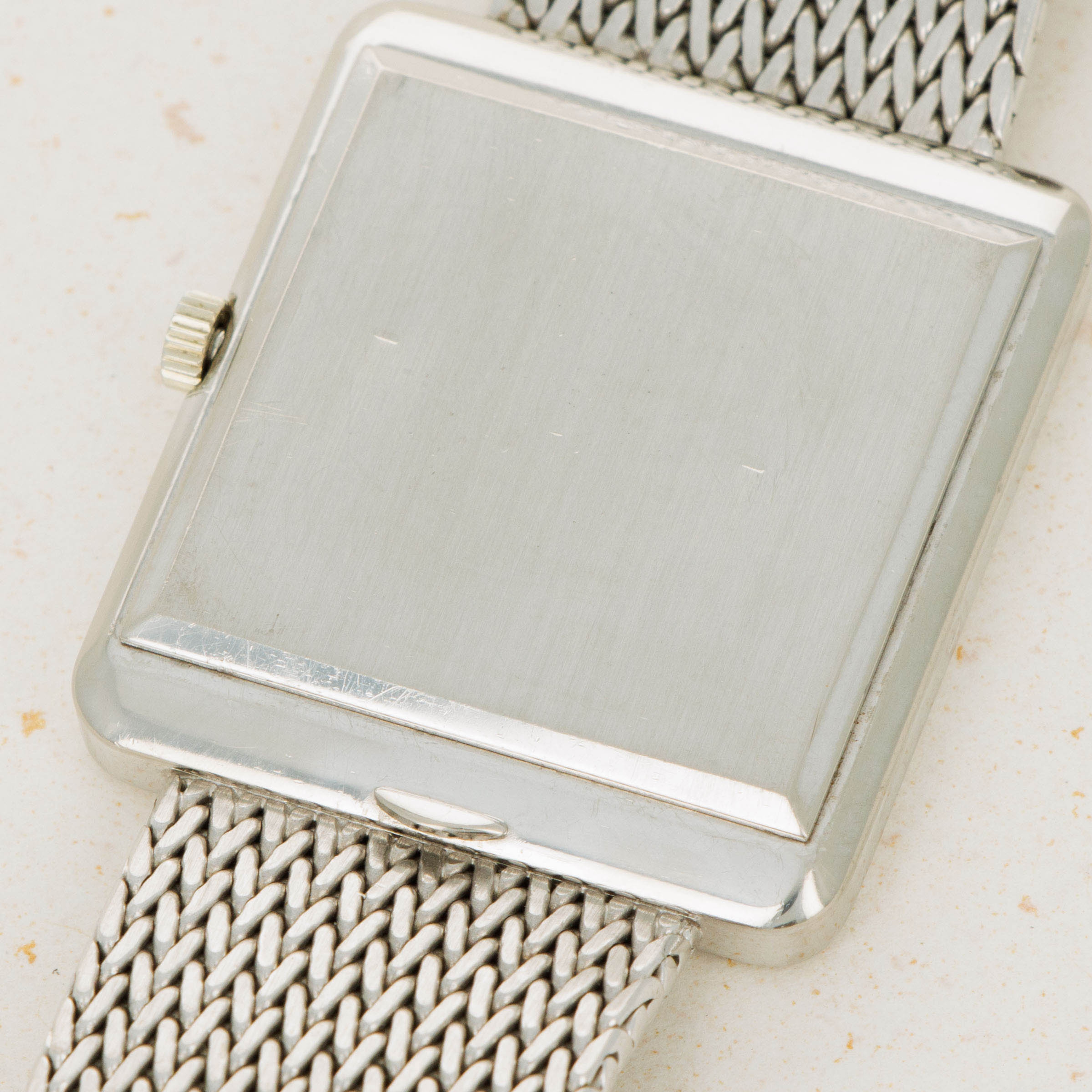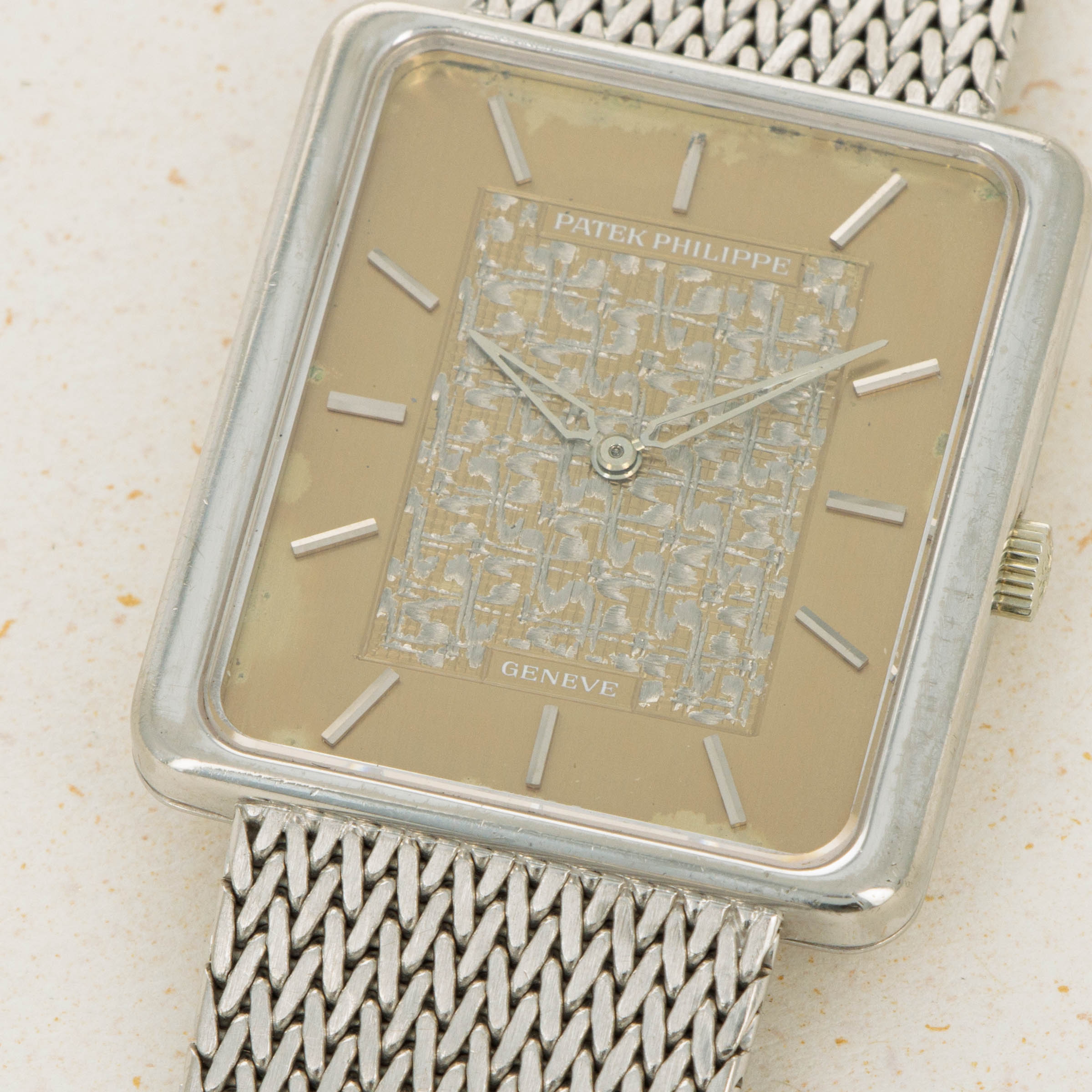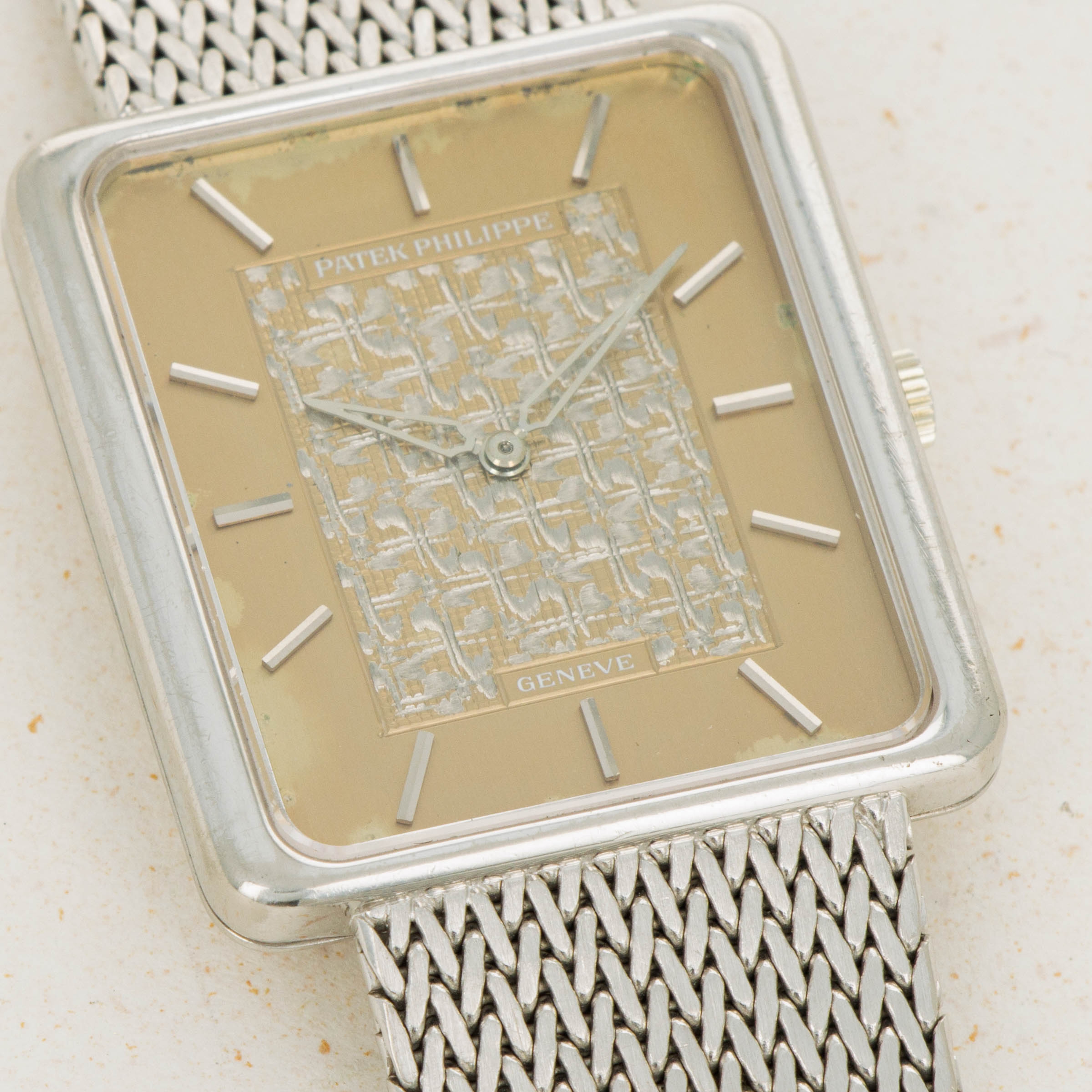 While it features pleasing proportions at 31mm x 28mm, the ref. 3799 wears a little larger than its measurements suggest thanks to its 18kt white gold mesh bracelet from famed Genevan bracelet atelier Jean-Pierre Ecoffey.