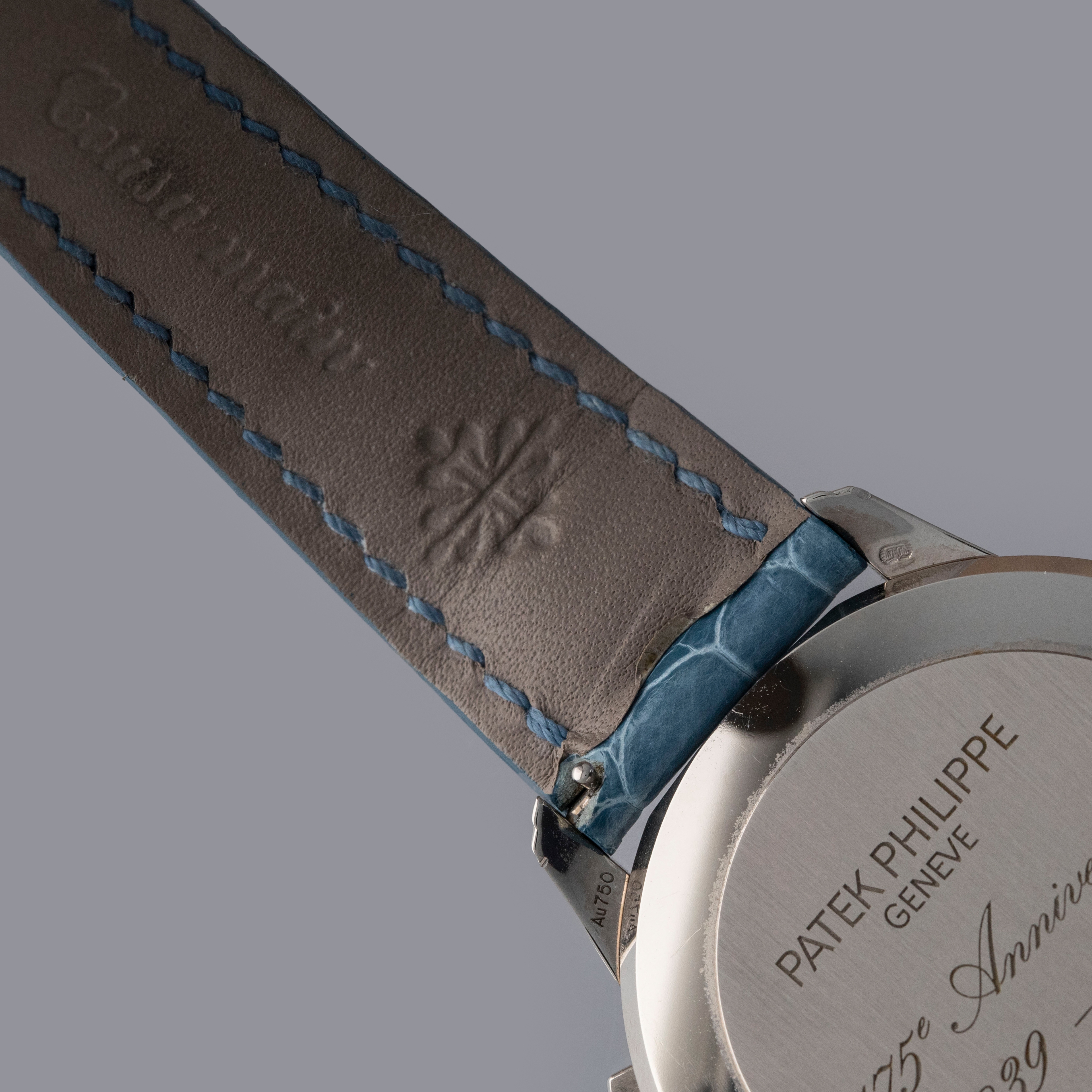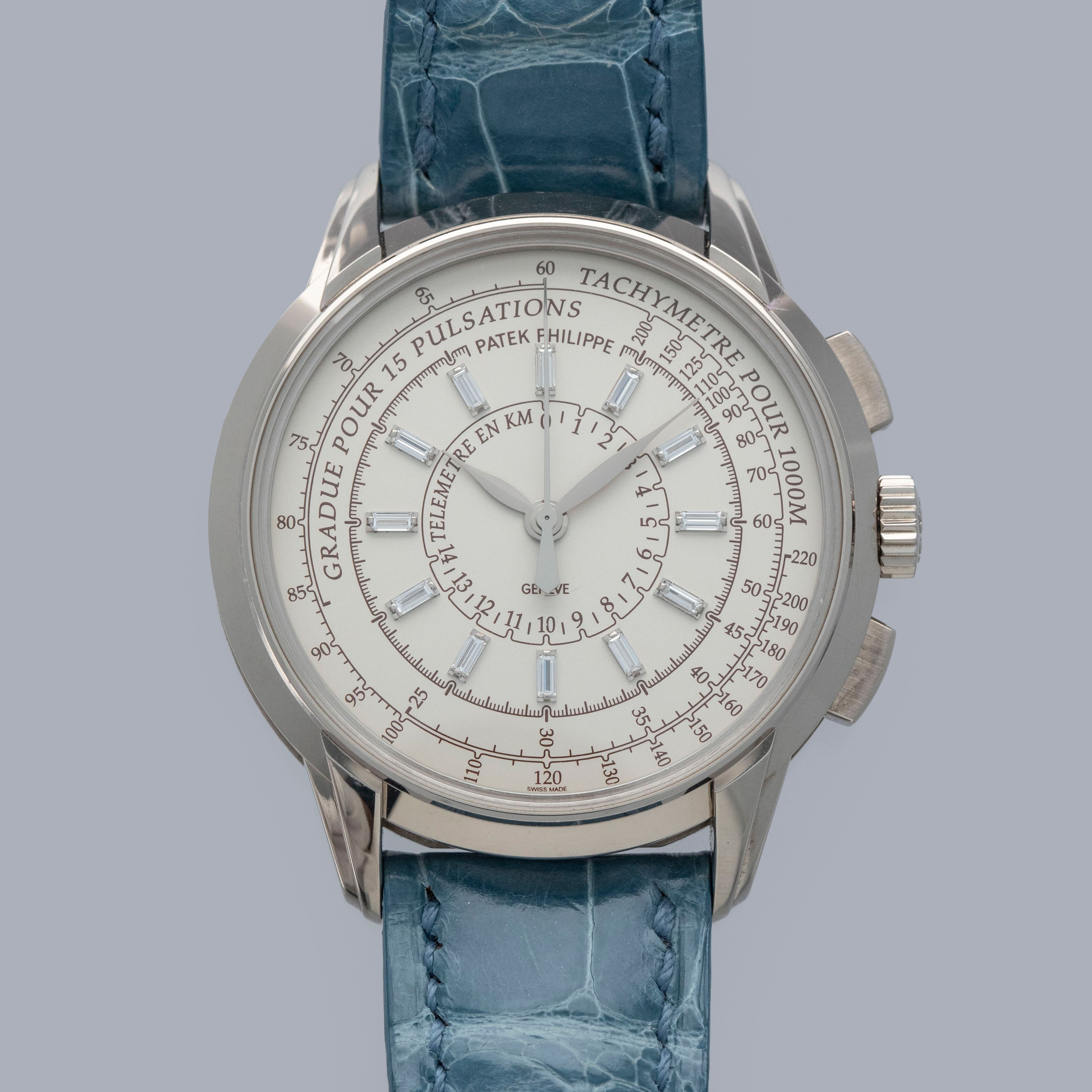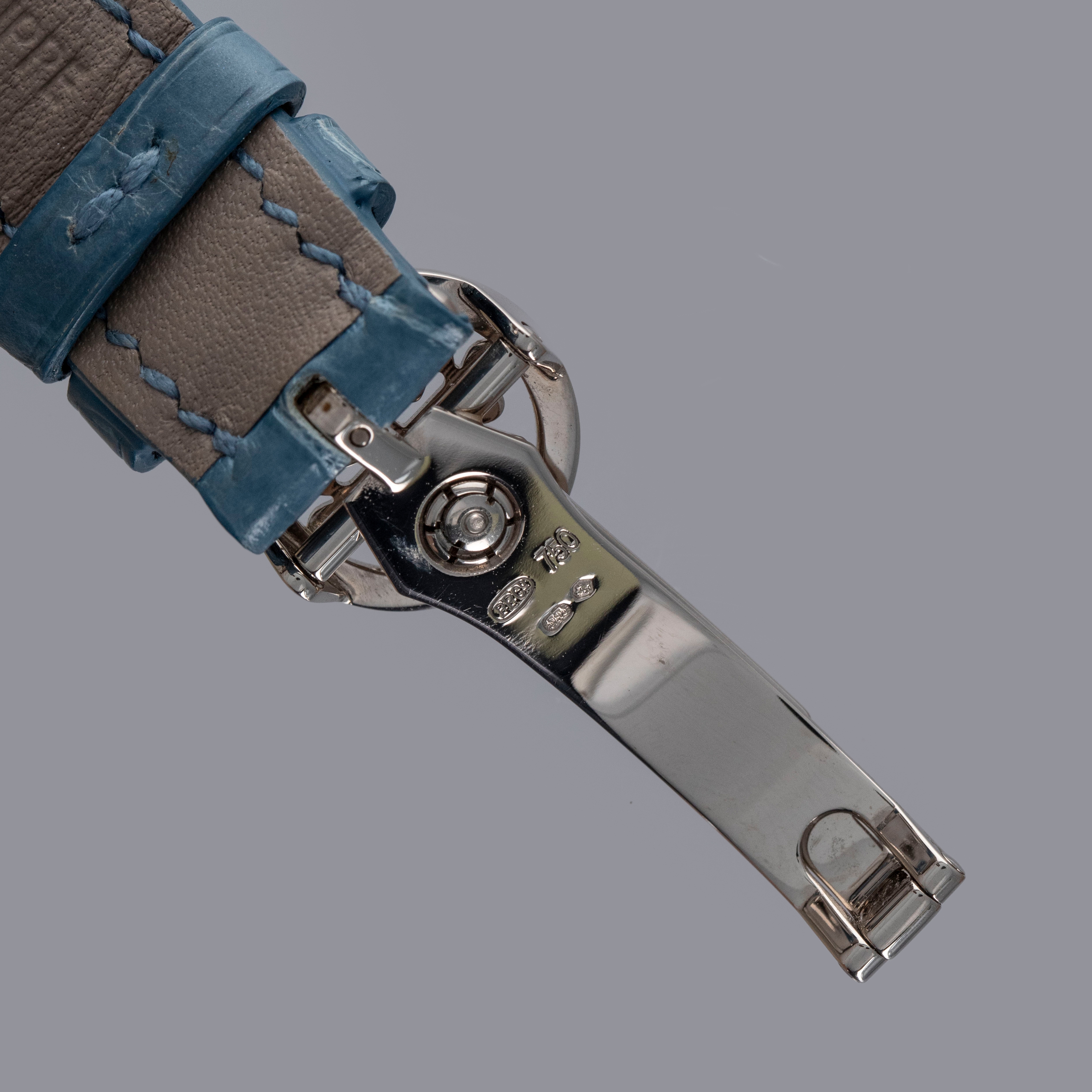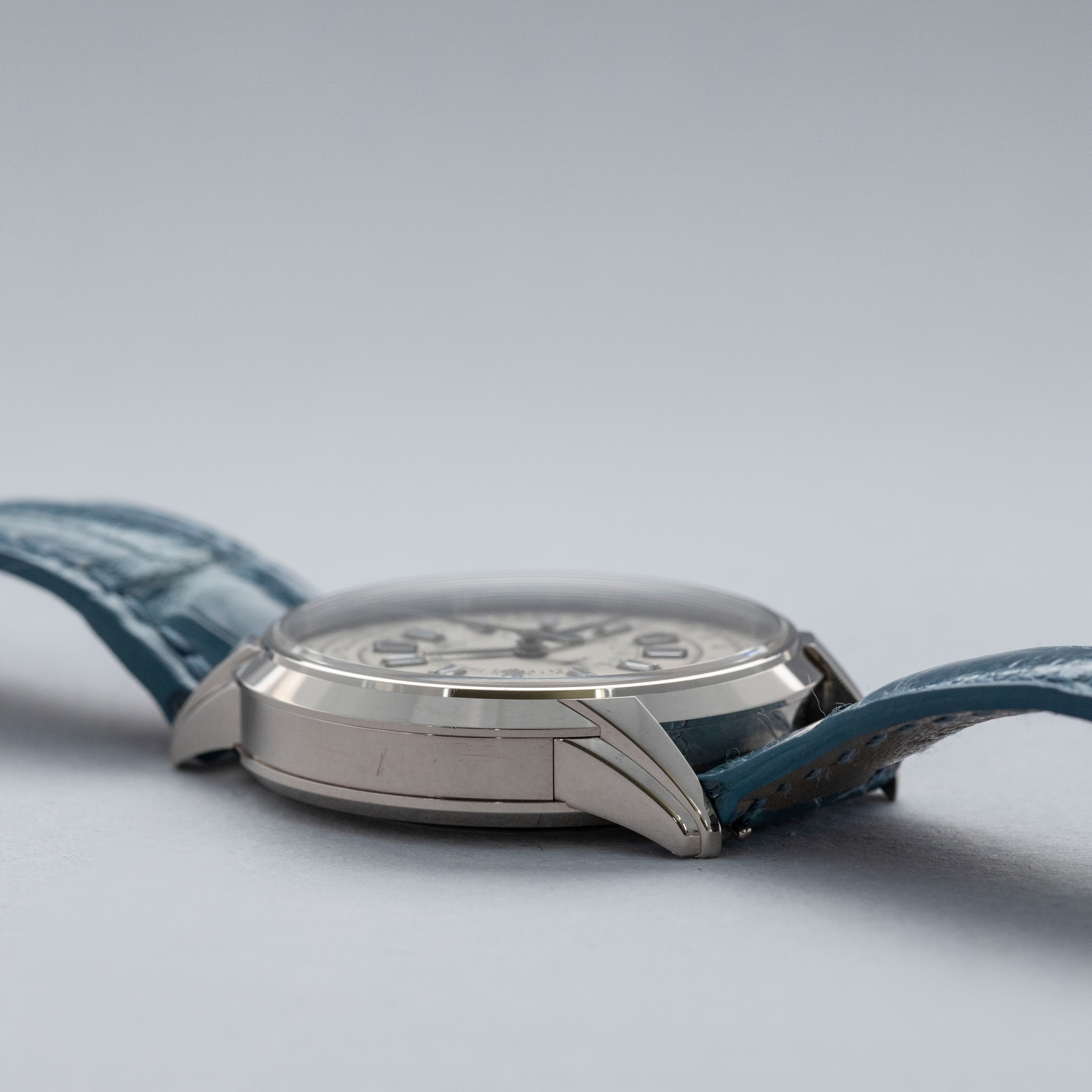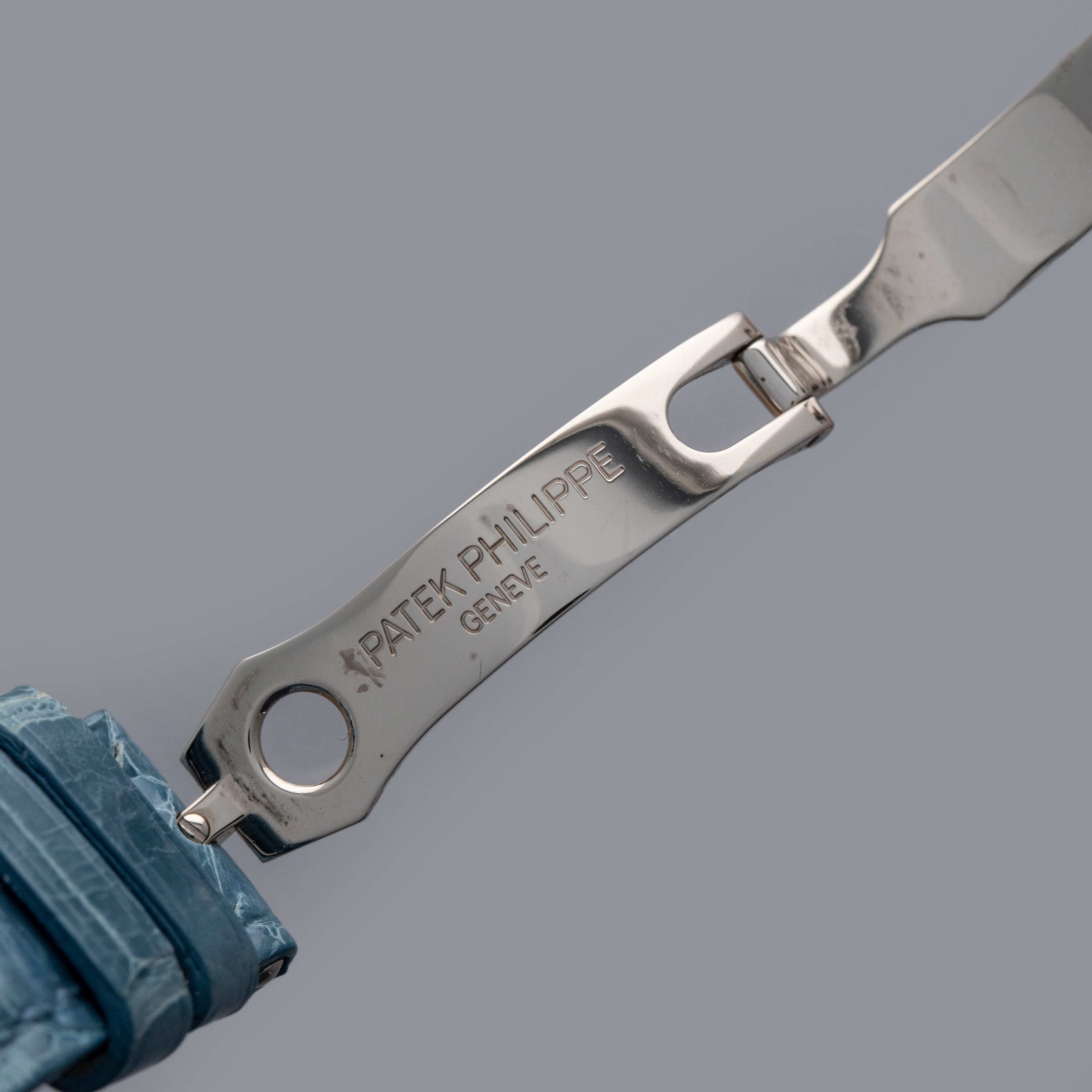 Watch is in overall near-mint condition. The white gold case shows signs of careful wear, with light surface scratches visible on the polished bezel and case back, while all hallmarks and engravings remain crisp. The dial and hands remain like new. It is fitted with a blue alligator strap and a white gold Patek Philippe deployant clasp, both remaining in near-mint condition. Comes complete with inner and outer boxes, certificate of origin, Limited Edition certificate, booklets, and document holder.