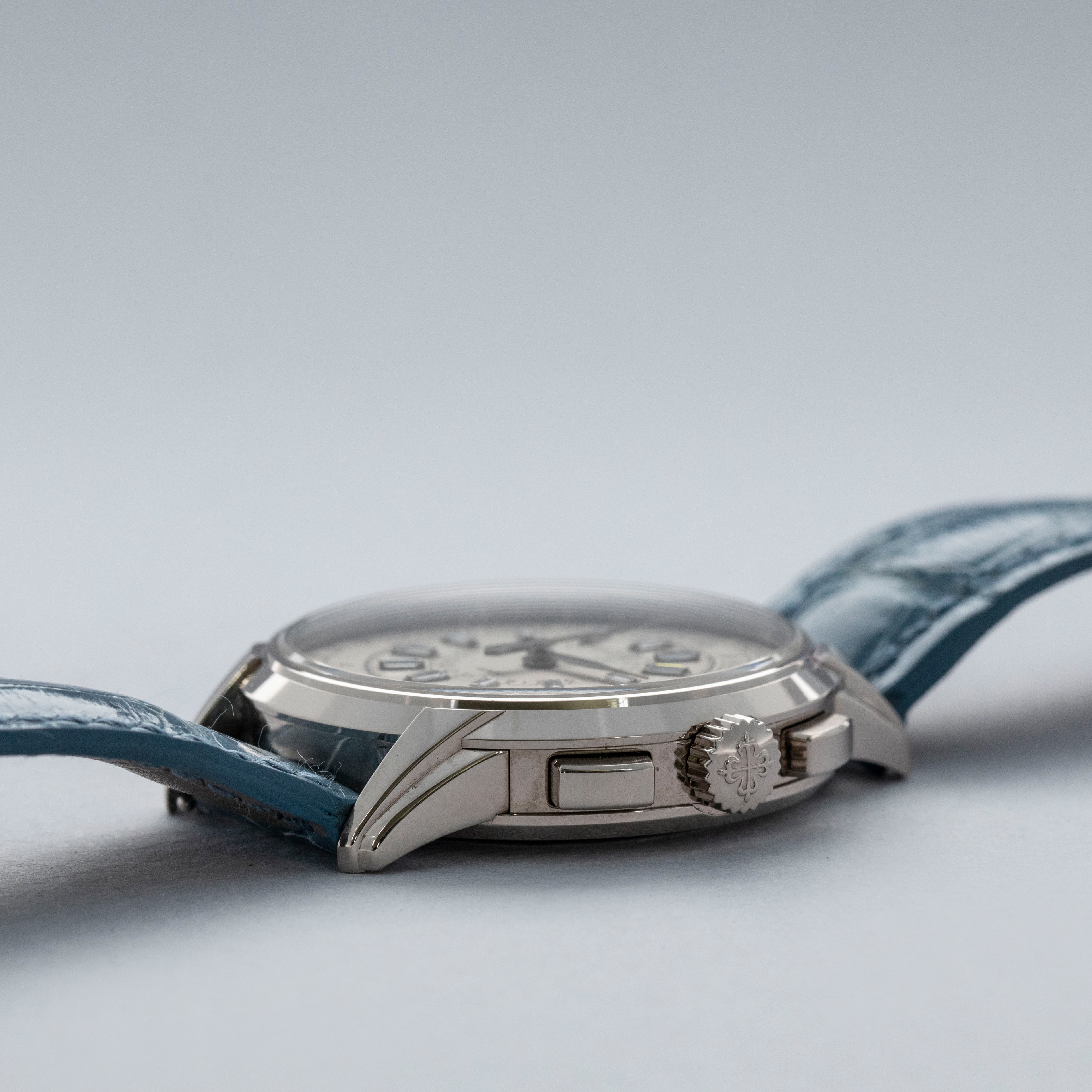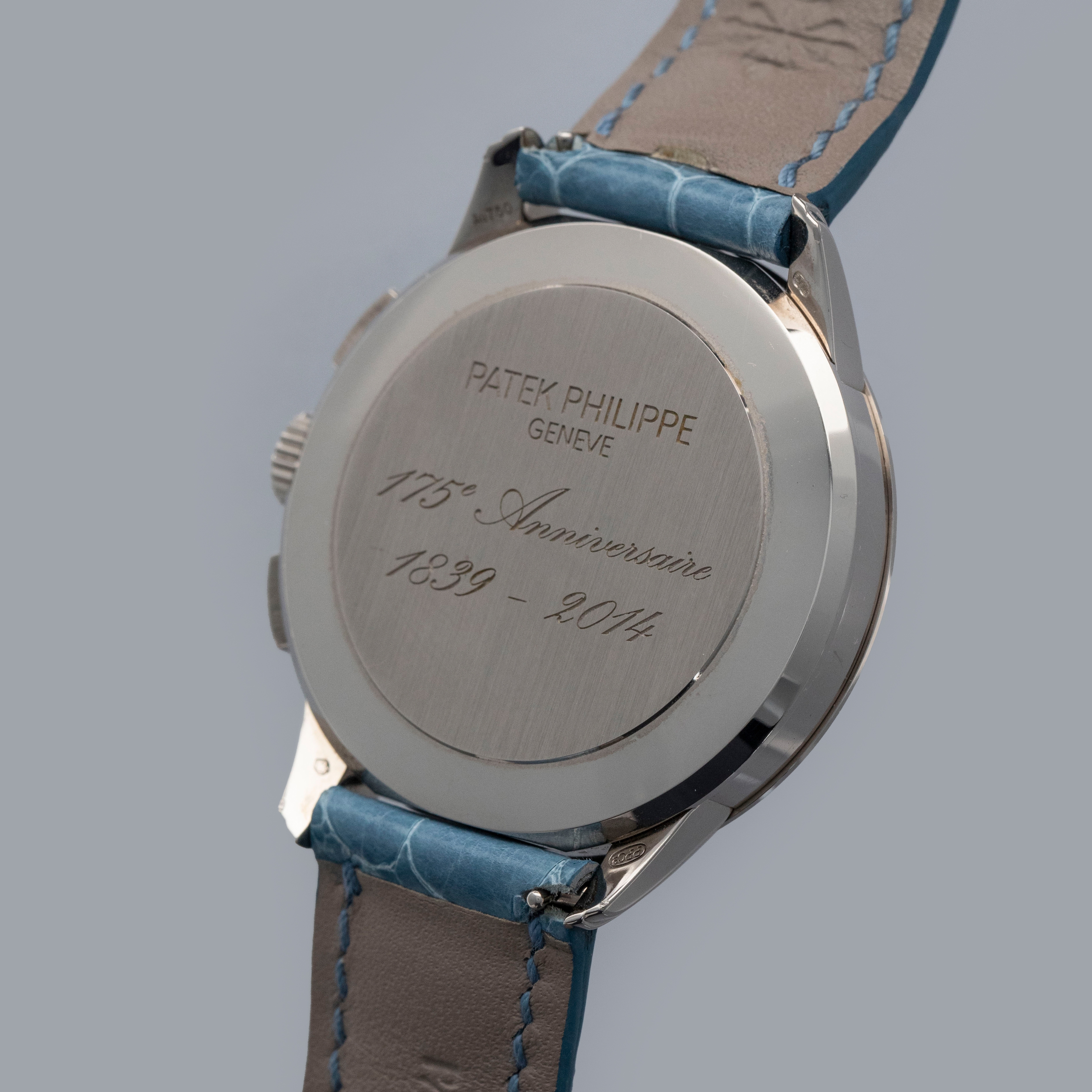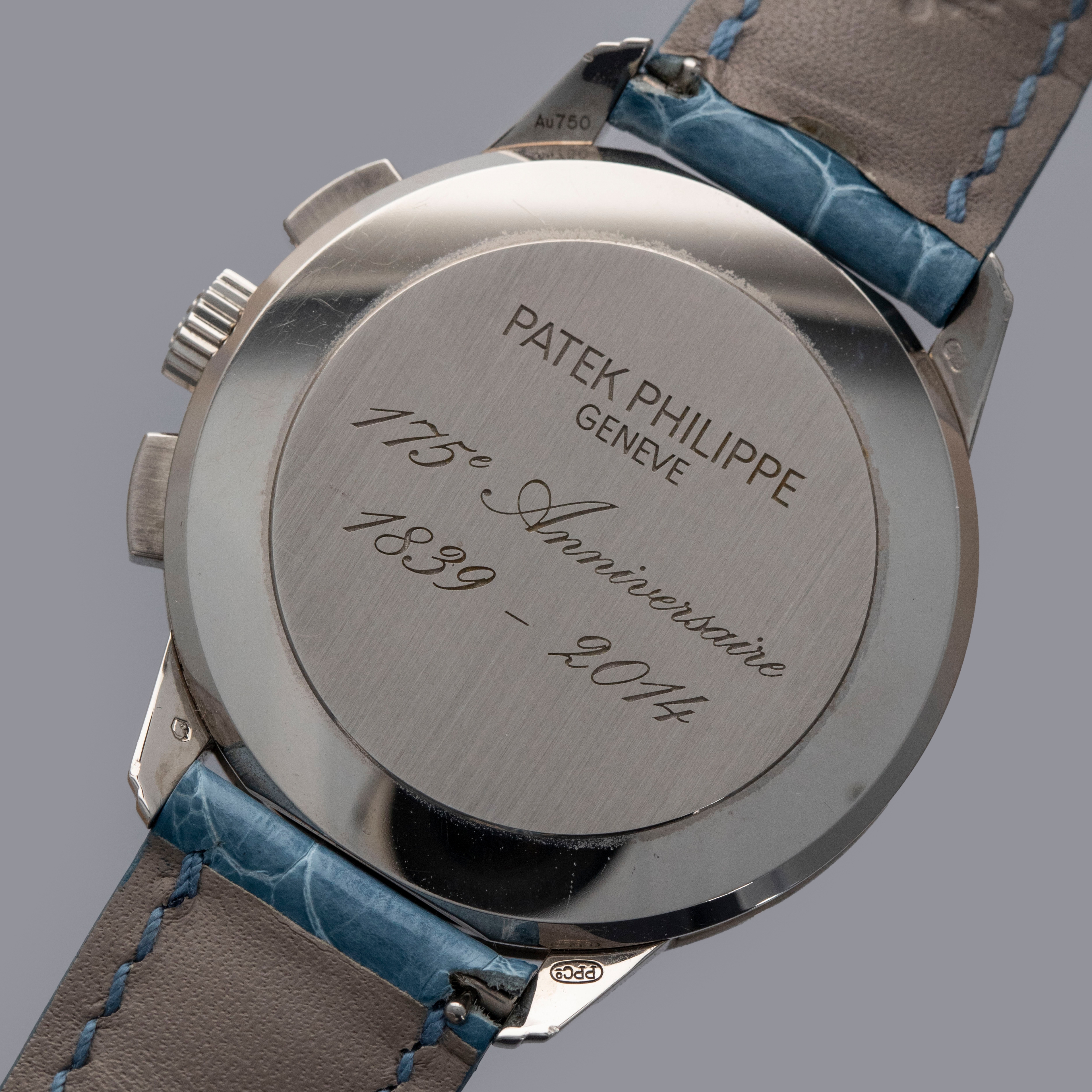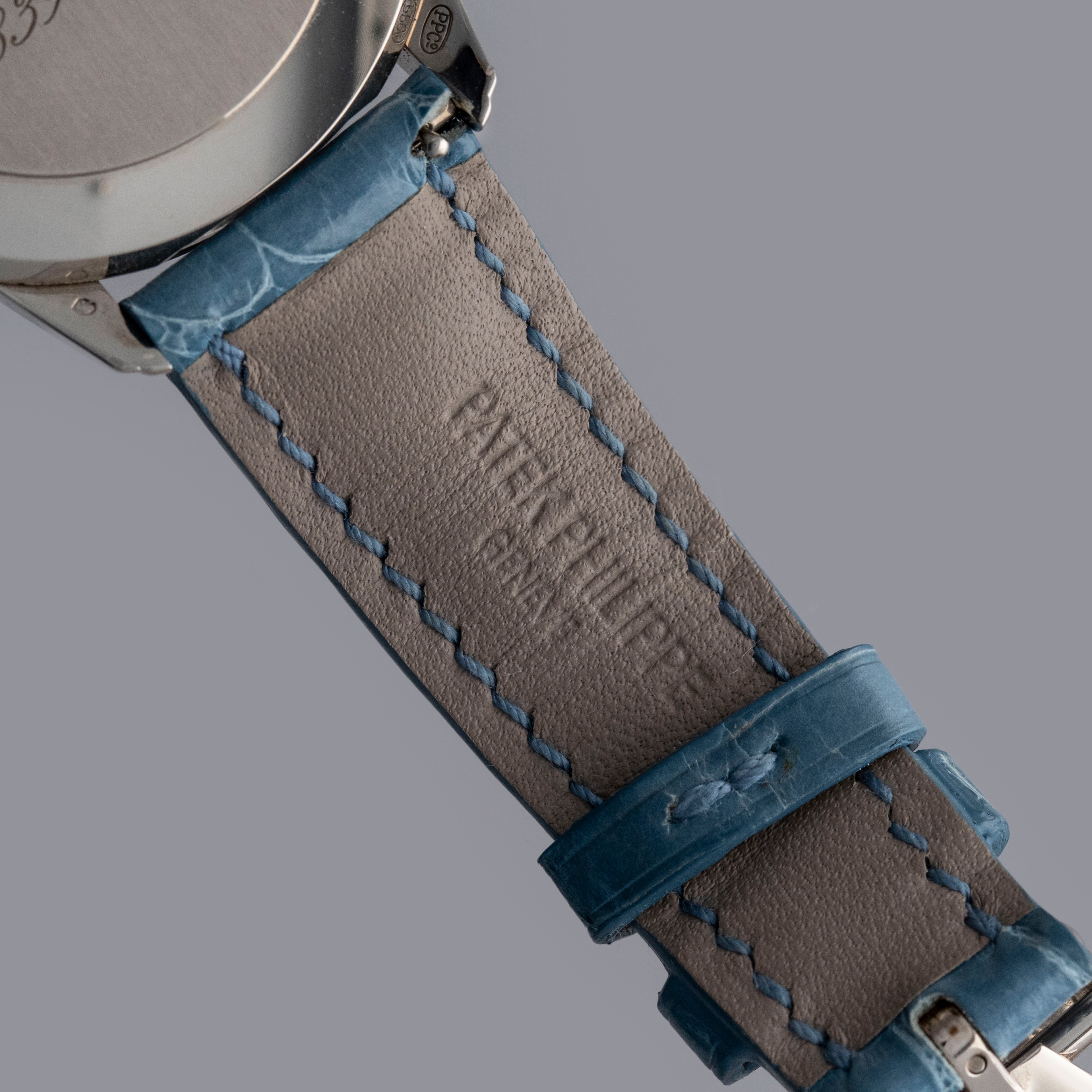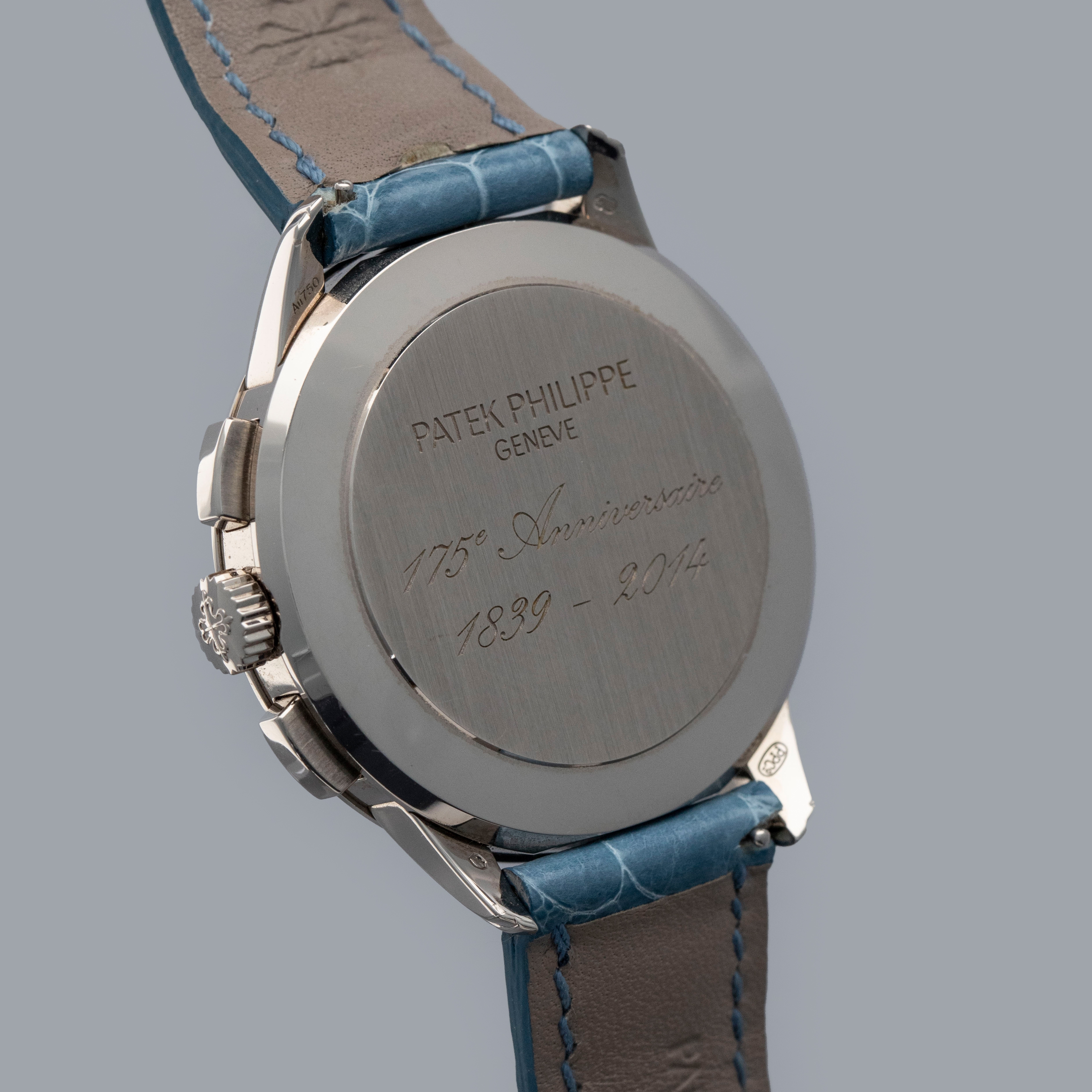 Watch is in overall near-mint condition. The white gold case shows signs of careful wear, with light surface scratches visible on the polished bezel and case back, while all hallmarks and engravings remain crisp. The dial and hands remain like new. It is fitted with a blue alligator strap and a white gold Patek Philippe deployant clasp, both remaining in near-mint condition. Comes complete with inner and outer boxes, certificate of origin, Limited Edition certificate, booklets, and document holder.
