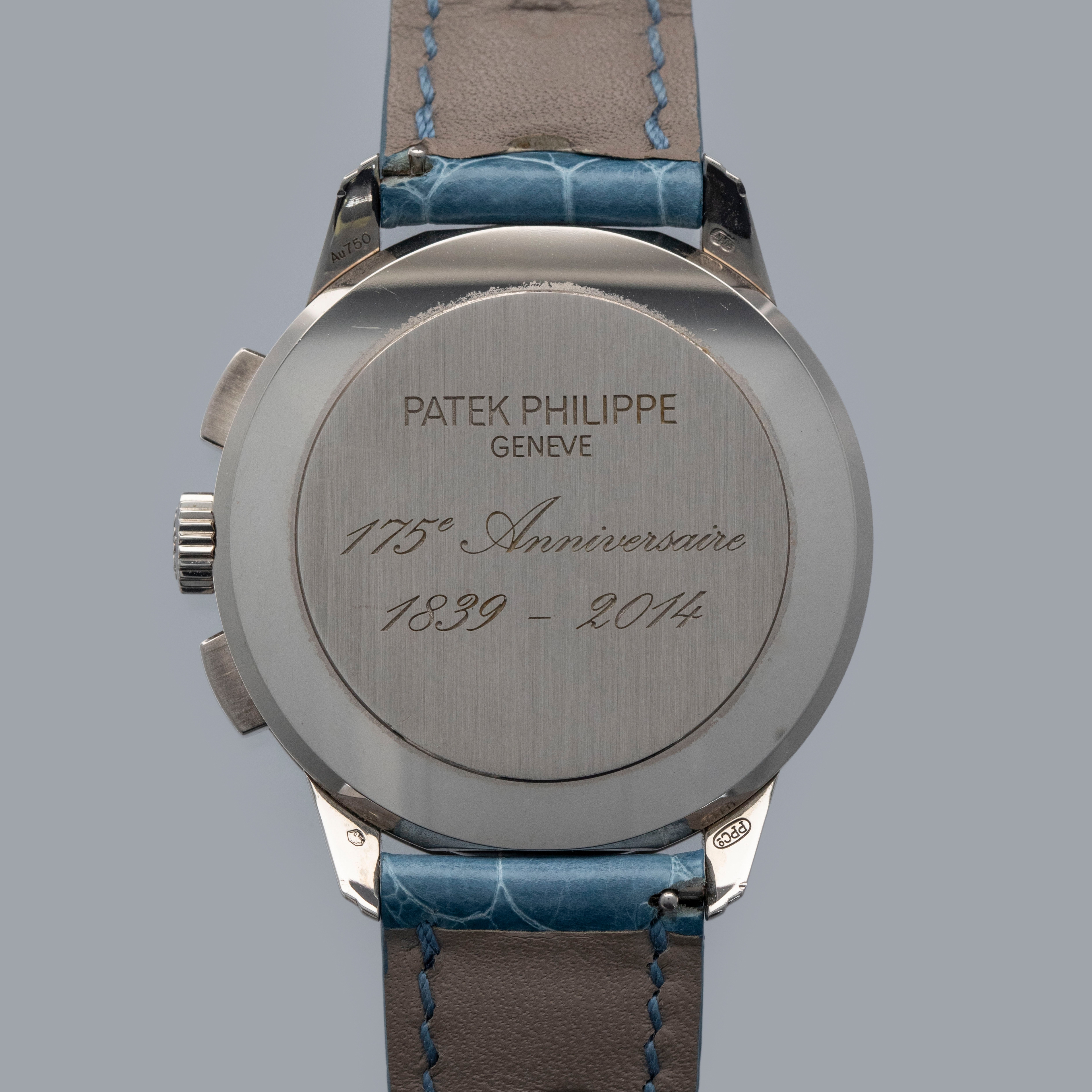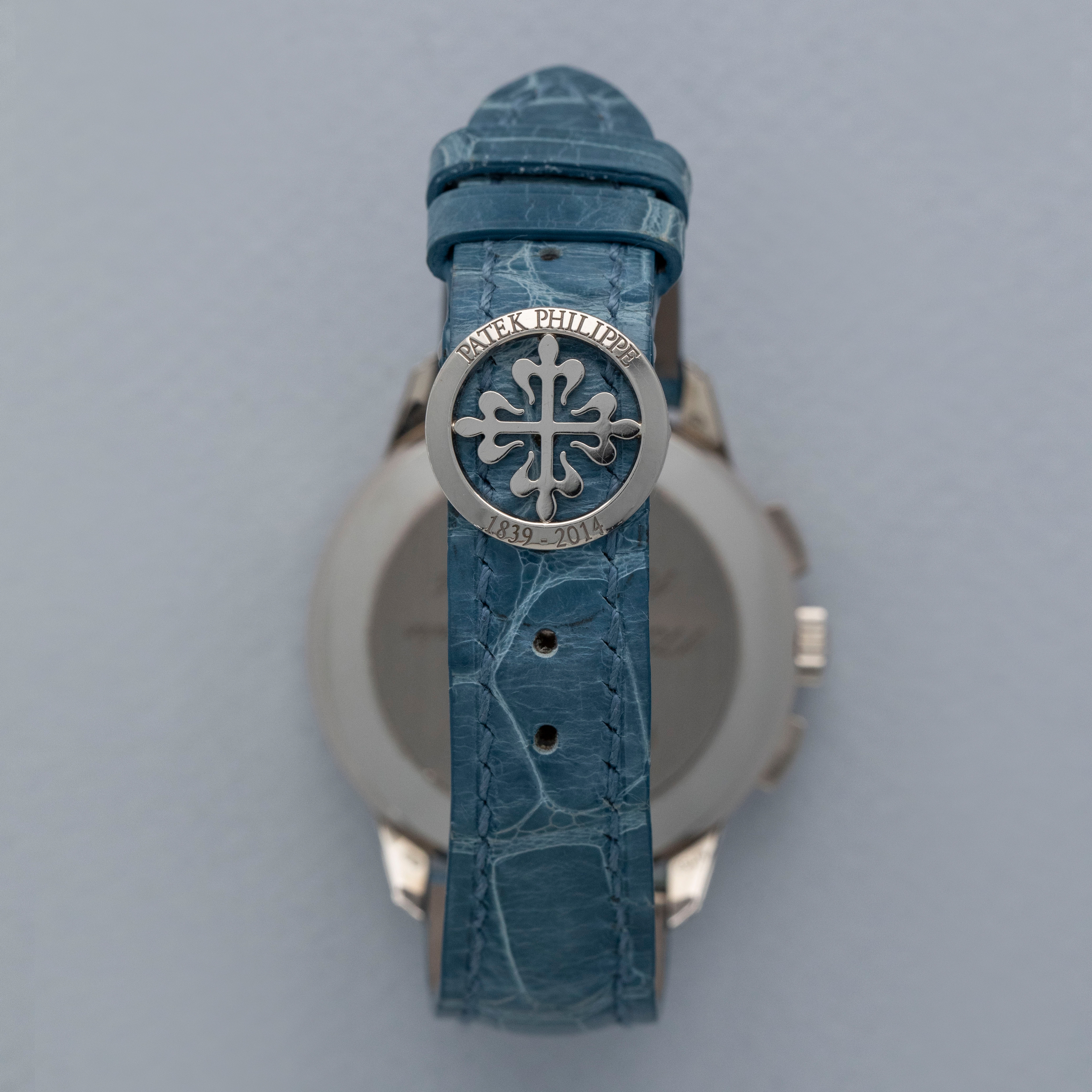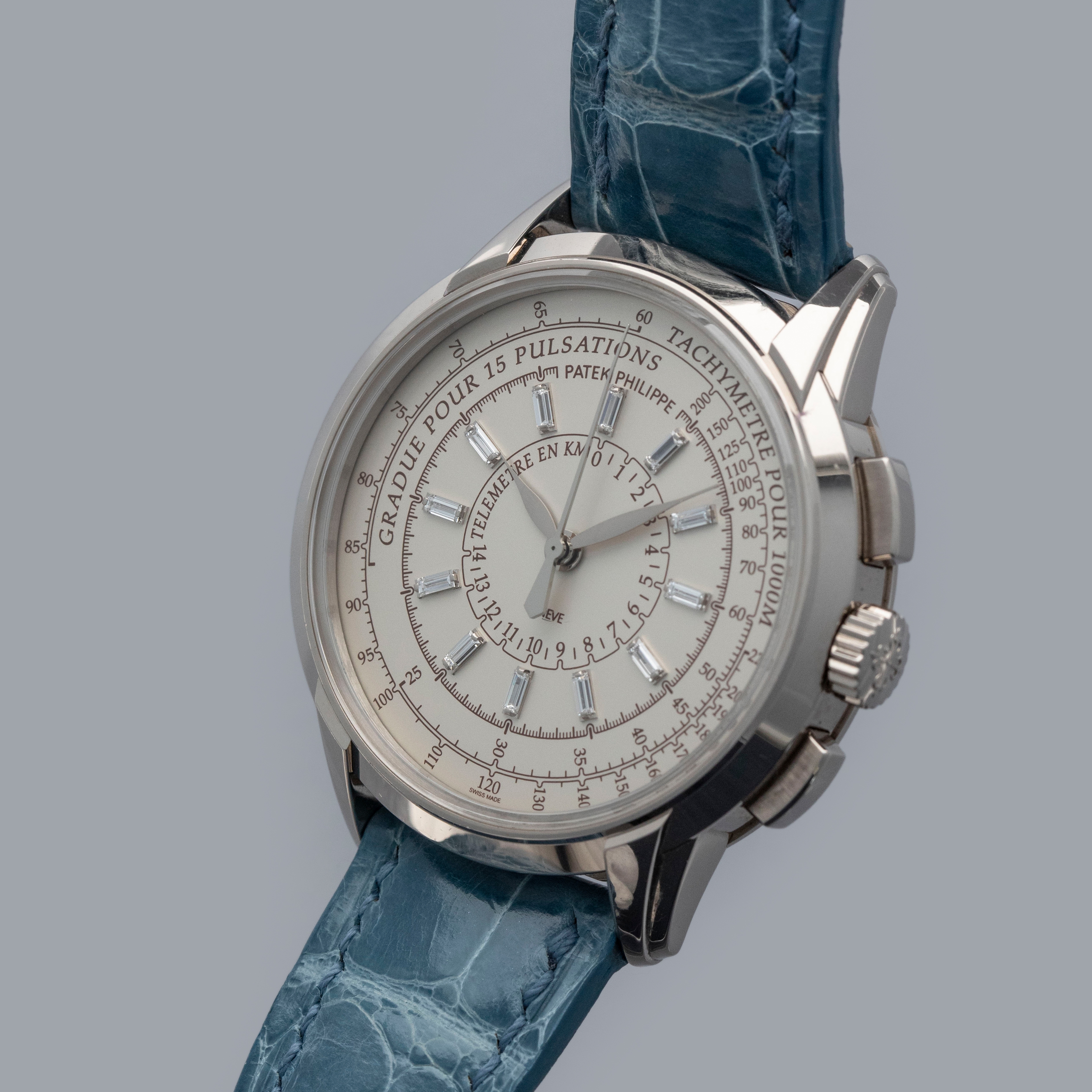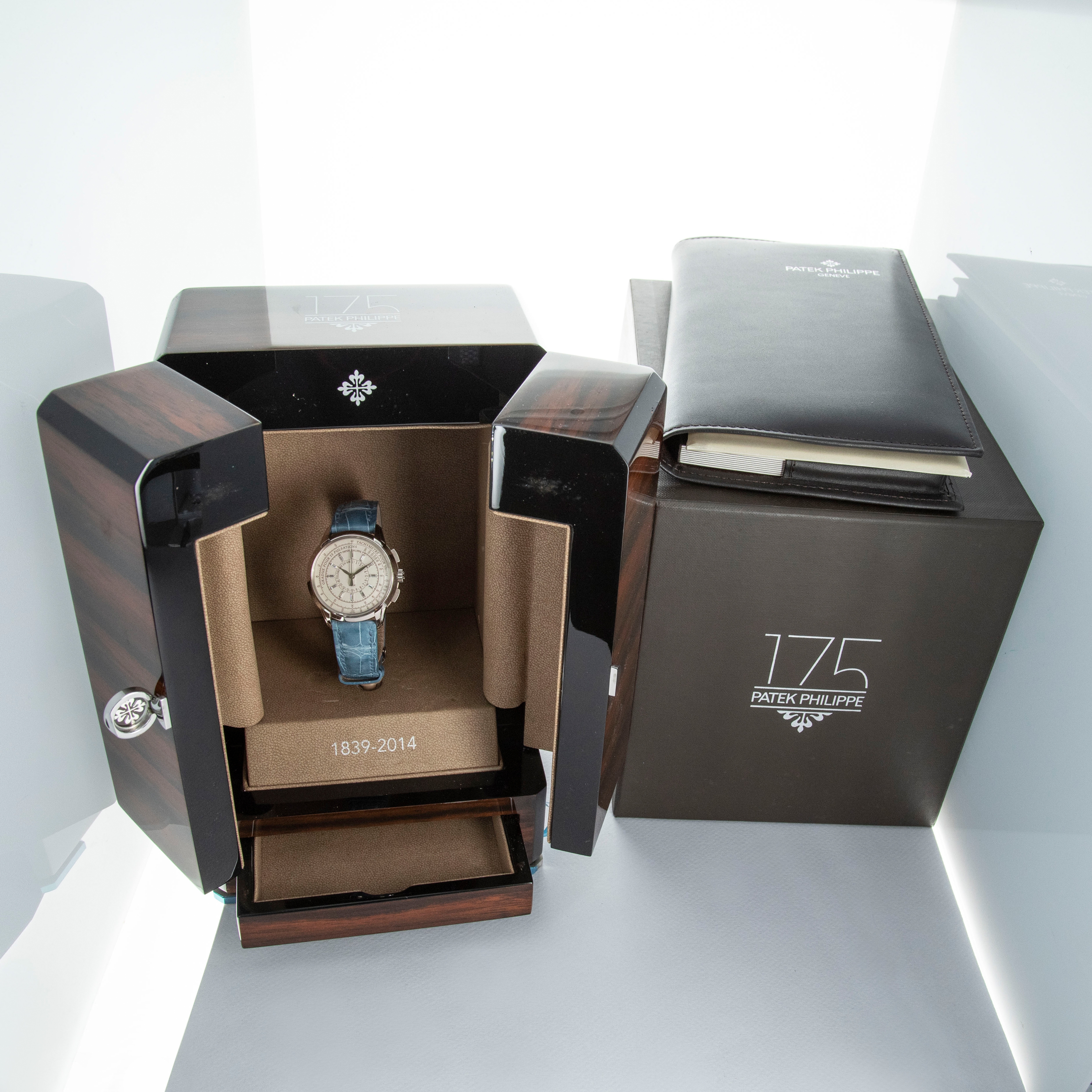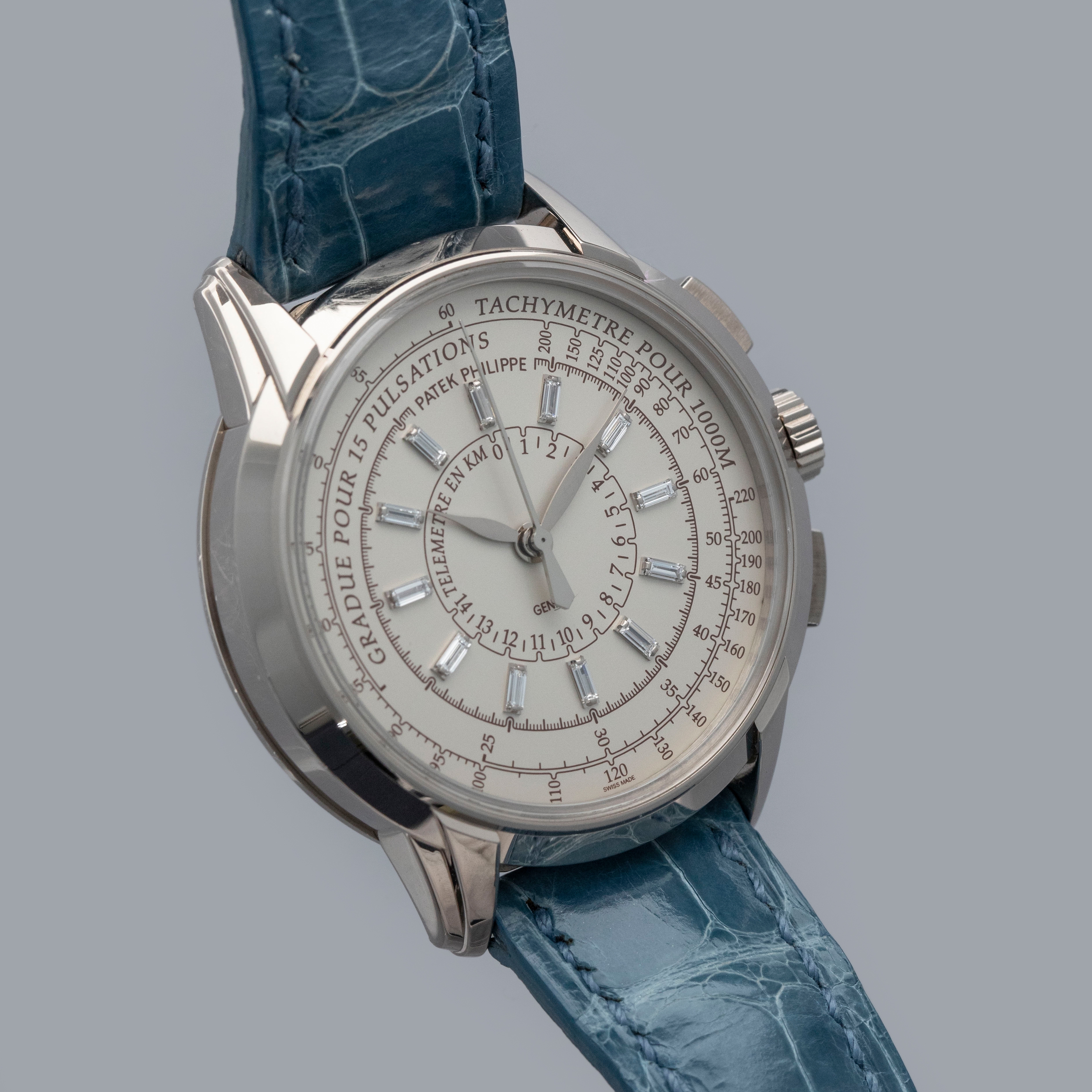 Watch is in overall near-mint condition. The white gold case shows signs of careful wear, with light surface scratches visible on the polished bezel and case back, while all hallmarks and engravings remain crisp. The dial and hands remain like new. It is fitted with a blue alligator strap and a white gold Patek Philippe deployant clasp, both remaining in near-mint condition. Comes complete with inner and outer boxes, certificate of origin, Limited Edition certificate, booklets, and document holder.