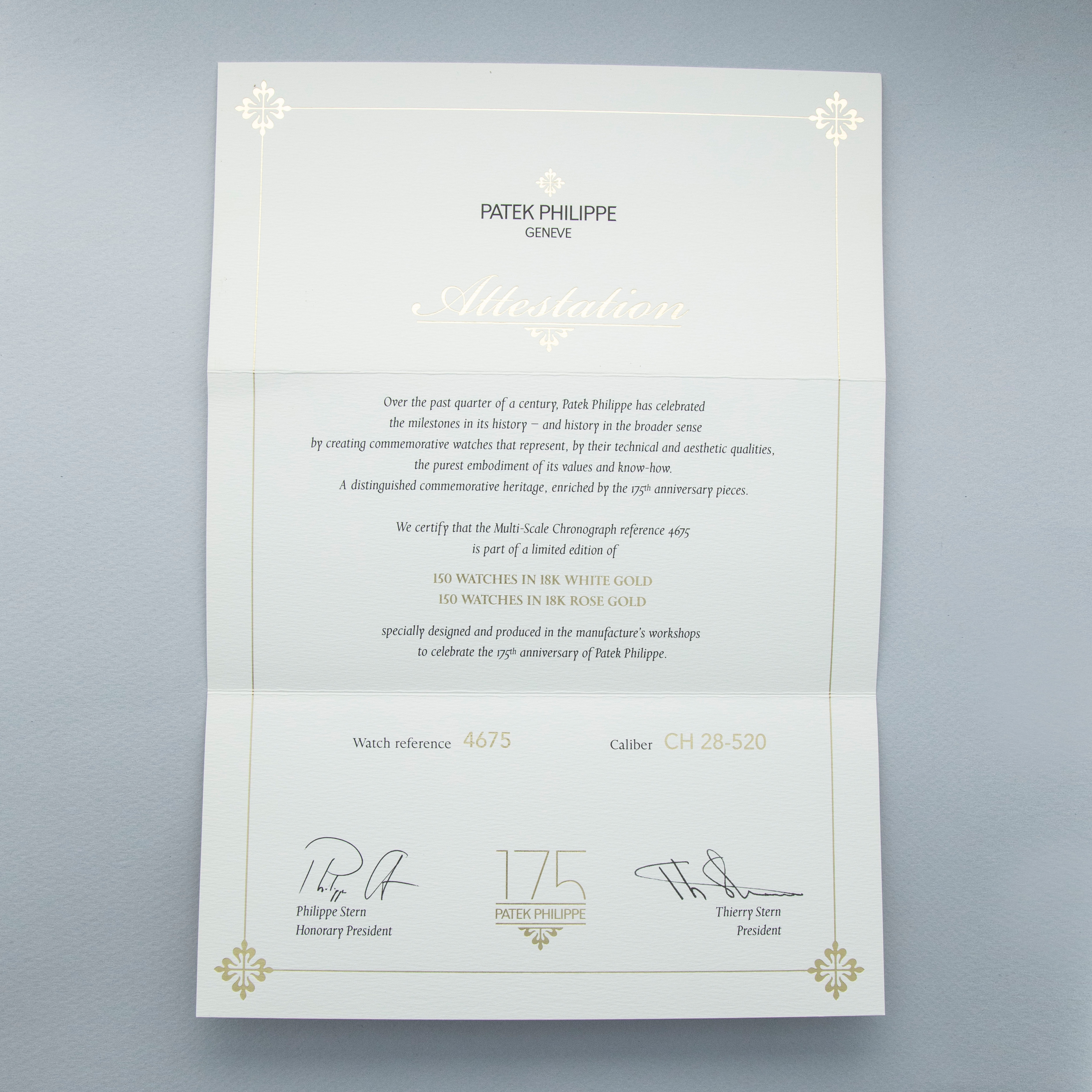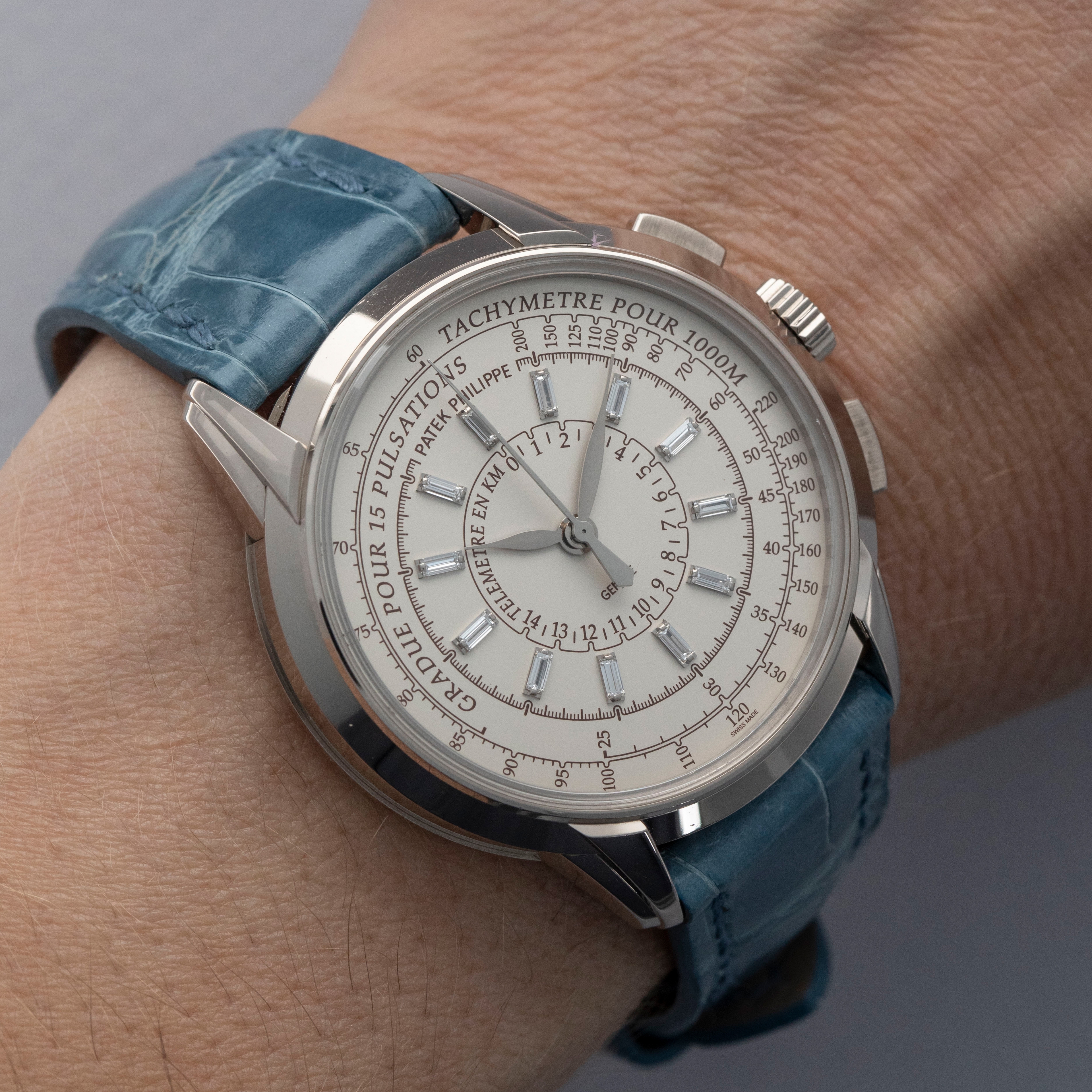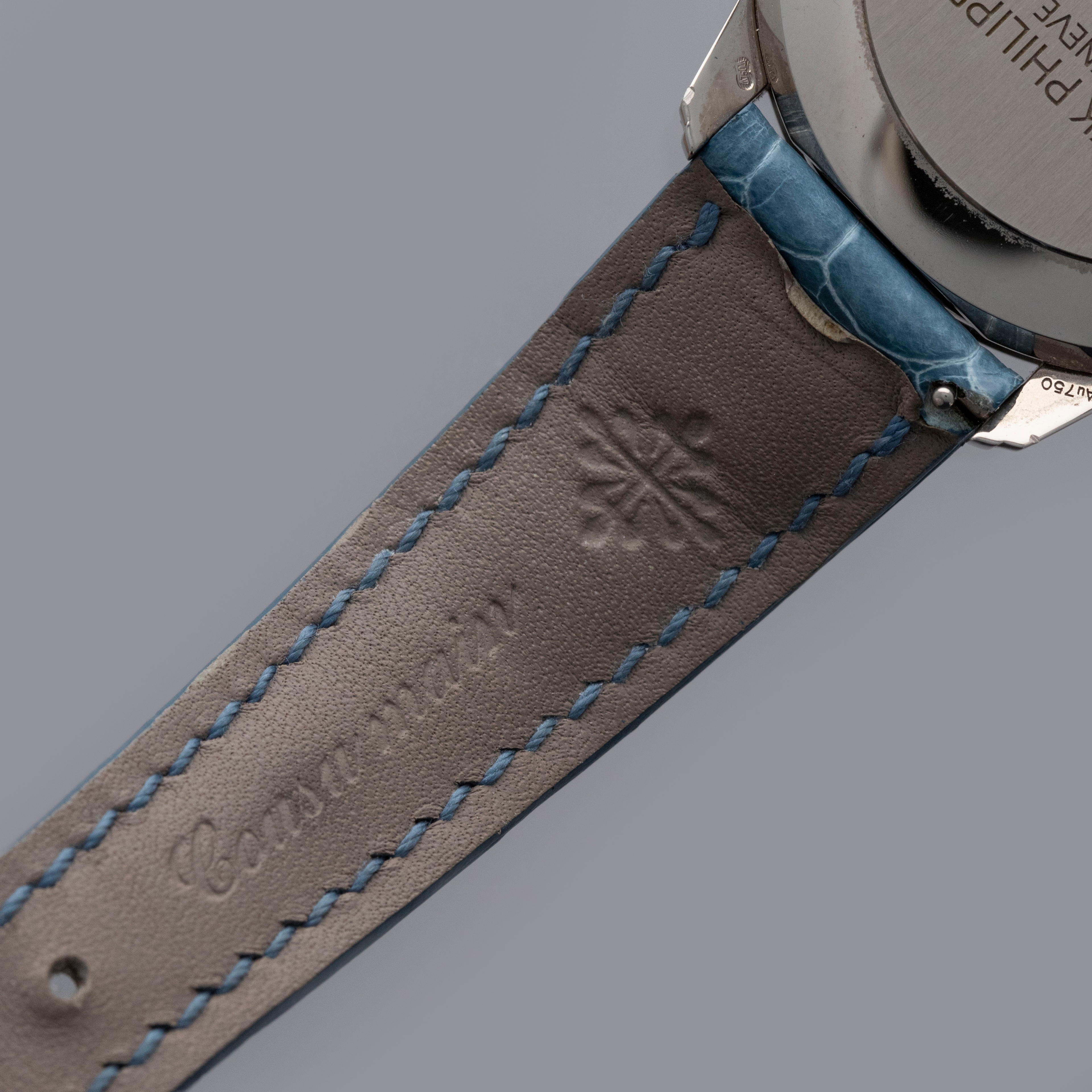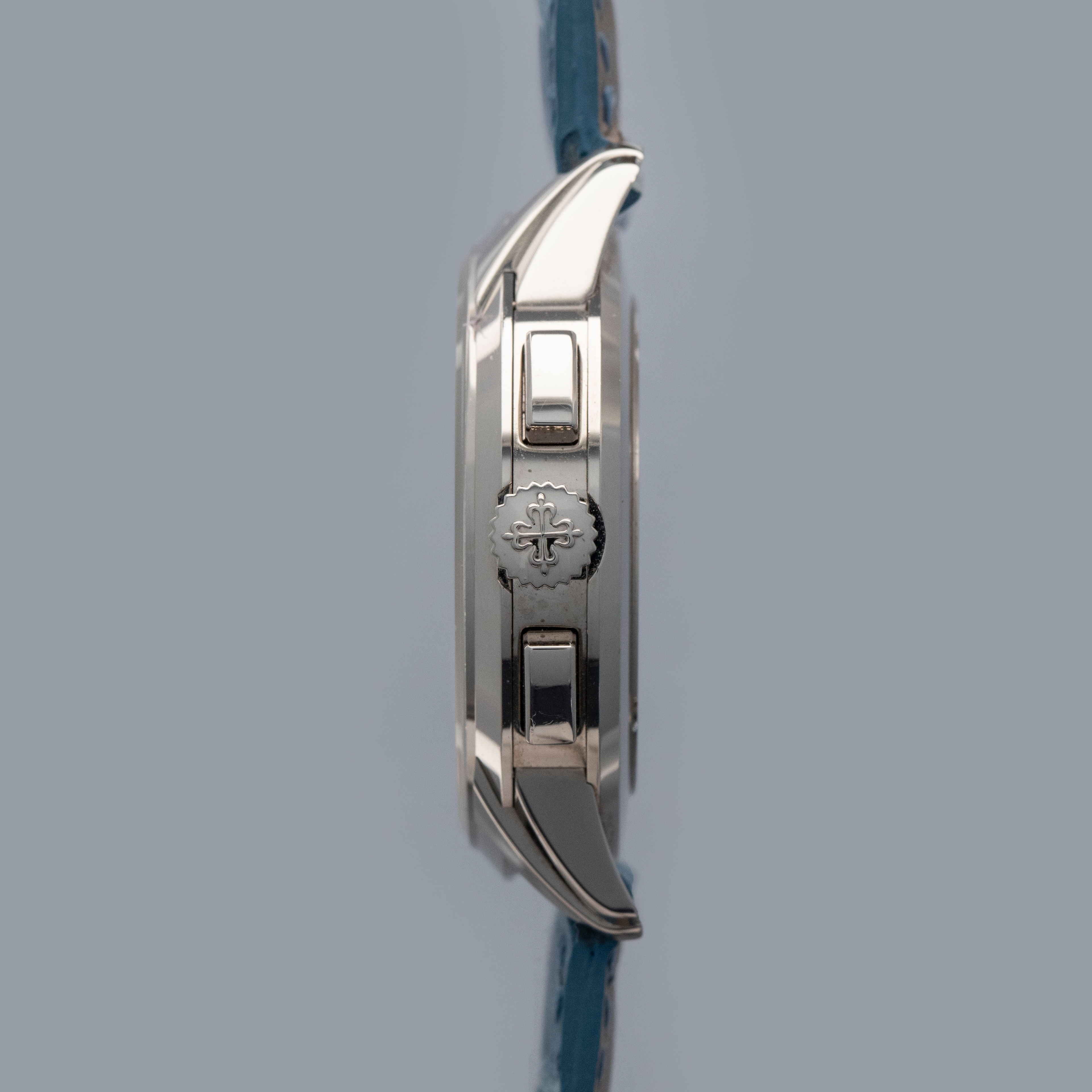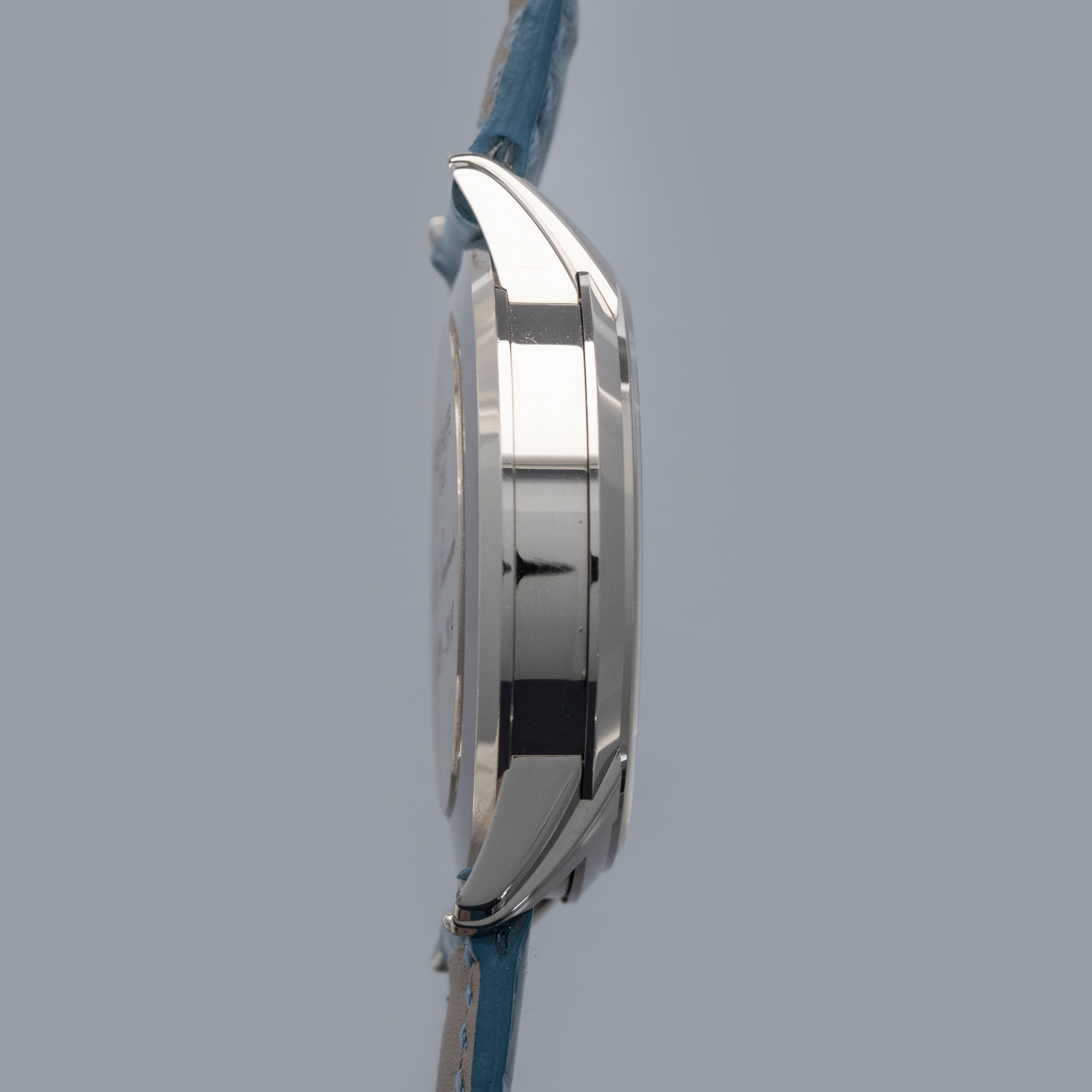 Watch is in overall near-mint condition. The white gold case shows signs of careful wear, with light surface scratches visible on the polished bezel and case back, while all hallmarks and engravings remain crisp. The dial and hands remain like new. It is fitted with a blue alligator strap and a white gold Patek Philippe deployant clasp, both remaining in near-mint condition. Comes complete with inner and outer boxes, certificate of origin, Limited Edition certificate, booklets, and document holder.