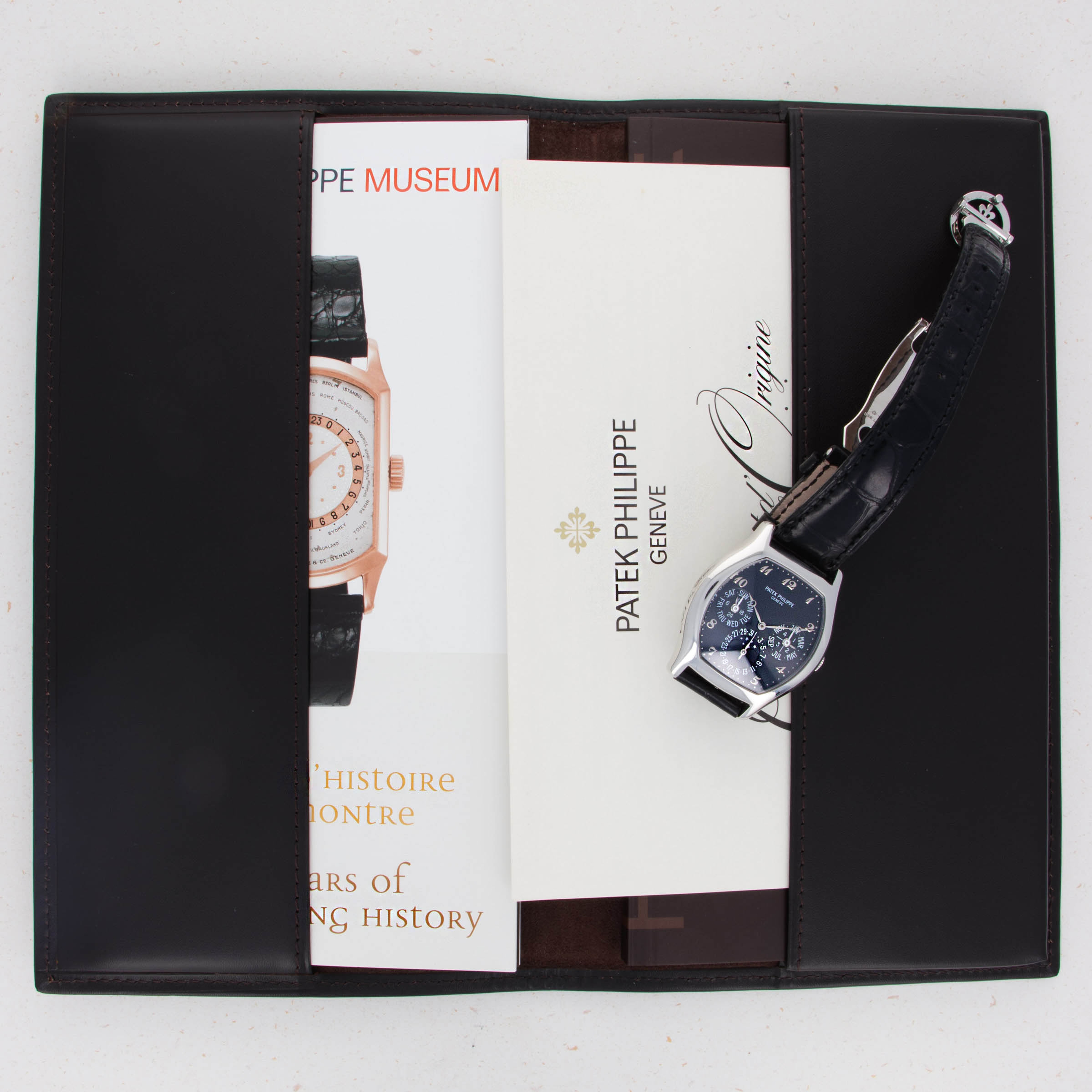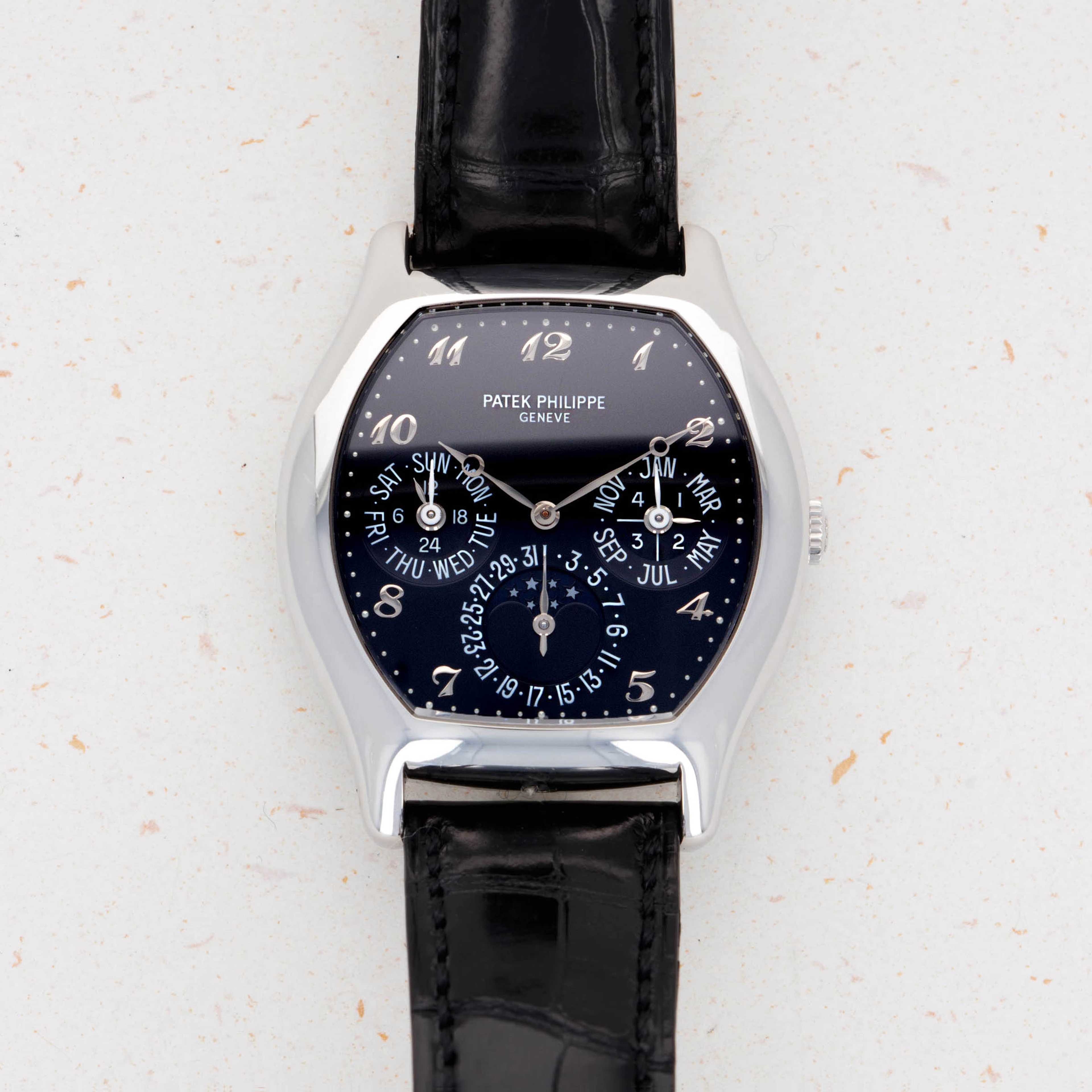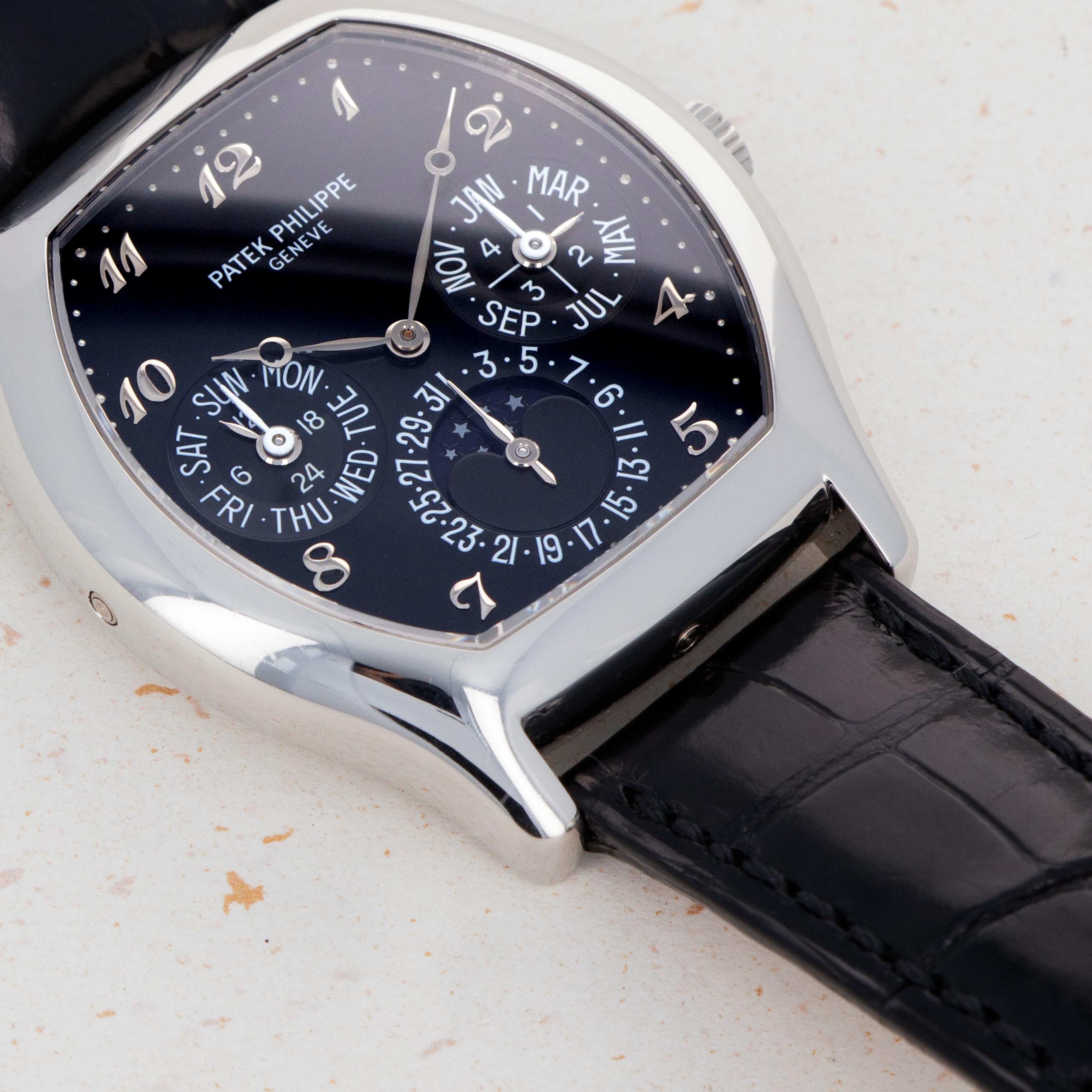Released in 1992 and produced primarily in yellow gold until its discontinuation in 2007, the platinum variant ref. 5040P that we have here is understated, elegant, and incredibly rare. The first tonneau-shaped perpetual calendar watch from Patek Philippe, clearly inspired by the Art Deco movement and Abraham-Louis Breguet, it was the first serially produced wristwatch from the brand to carry both, Breguet numerals and Breguet hands. Described by many seasoned collectors as one of the most overlooked complication pieces from Patek, the ref. 5040's dial is as legible as they come. Sporting clear script throughout its three subdials, and a circular railroad-style minute track along the glossy black dial's periphery, the ref. 5040 is a visual treat with something taking your eye's interest no matter where you look. While it is covered by a solid platinum caseback, within its 35mm case lies one of the finest perpetual calendar movements Patek ever produced, the automatic cal. 240Q. This allows each subdial to feature two individual pieces of information. The subdial at 9 o'clock provides the wearer with a day indication and 24-hour clock, while the subdial at 6 o'clock provides the wearer with a moon phase indicator and day of the month display, and the 3 o'clock position includes the month and leap year indicator. An intricately designed watch, from its physical construction to its displays, the ref. 5040P is easily one of the most refined Grand Complication timepieces to ever leave the Patek Philippe workshop.