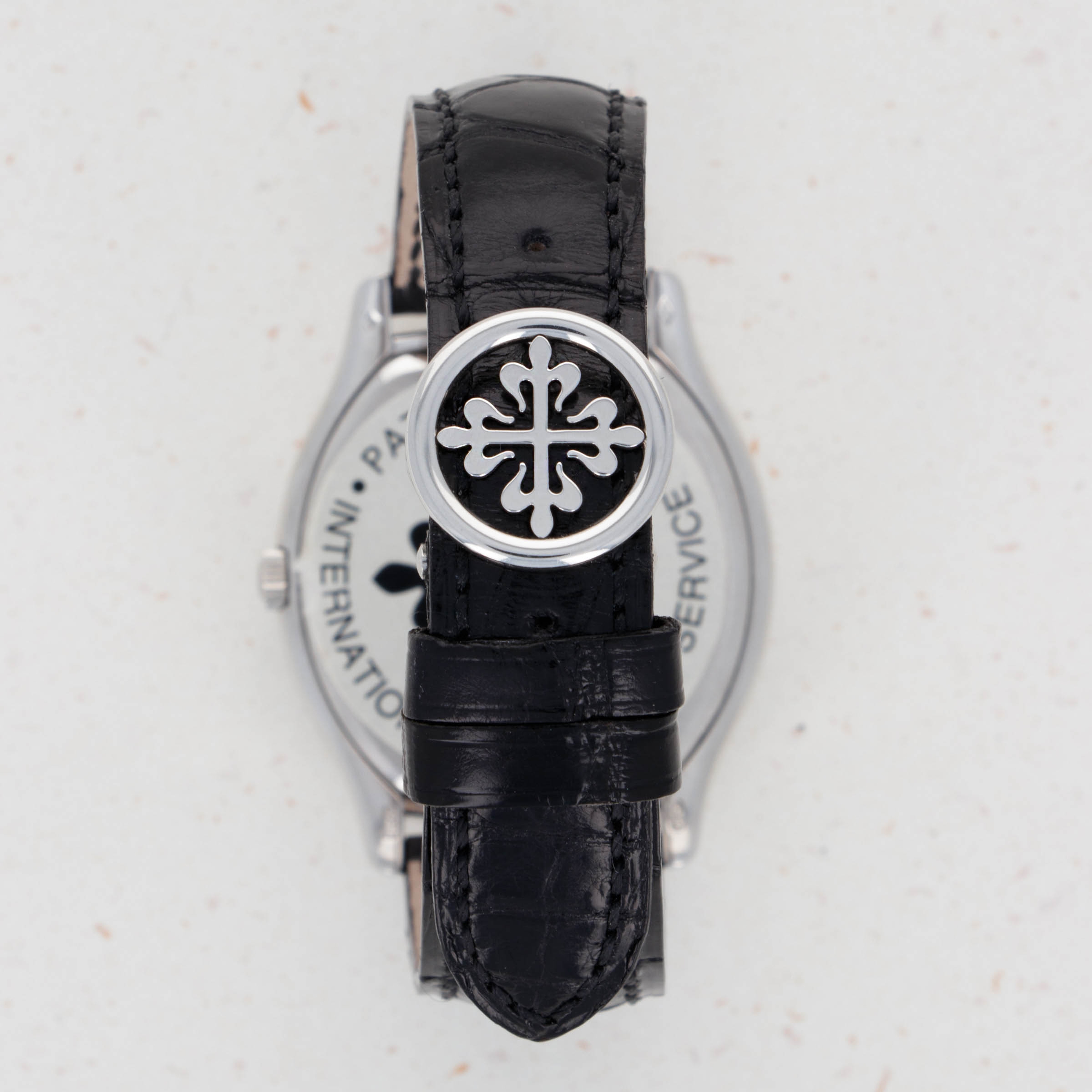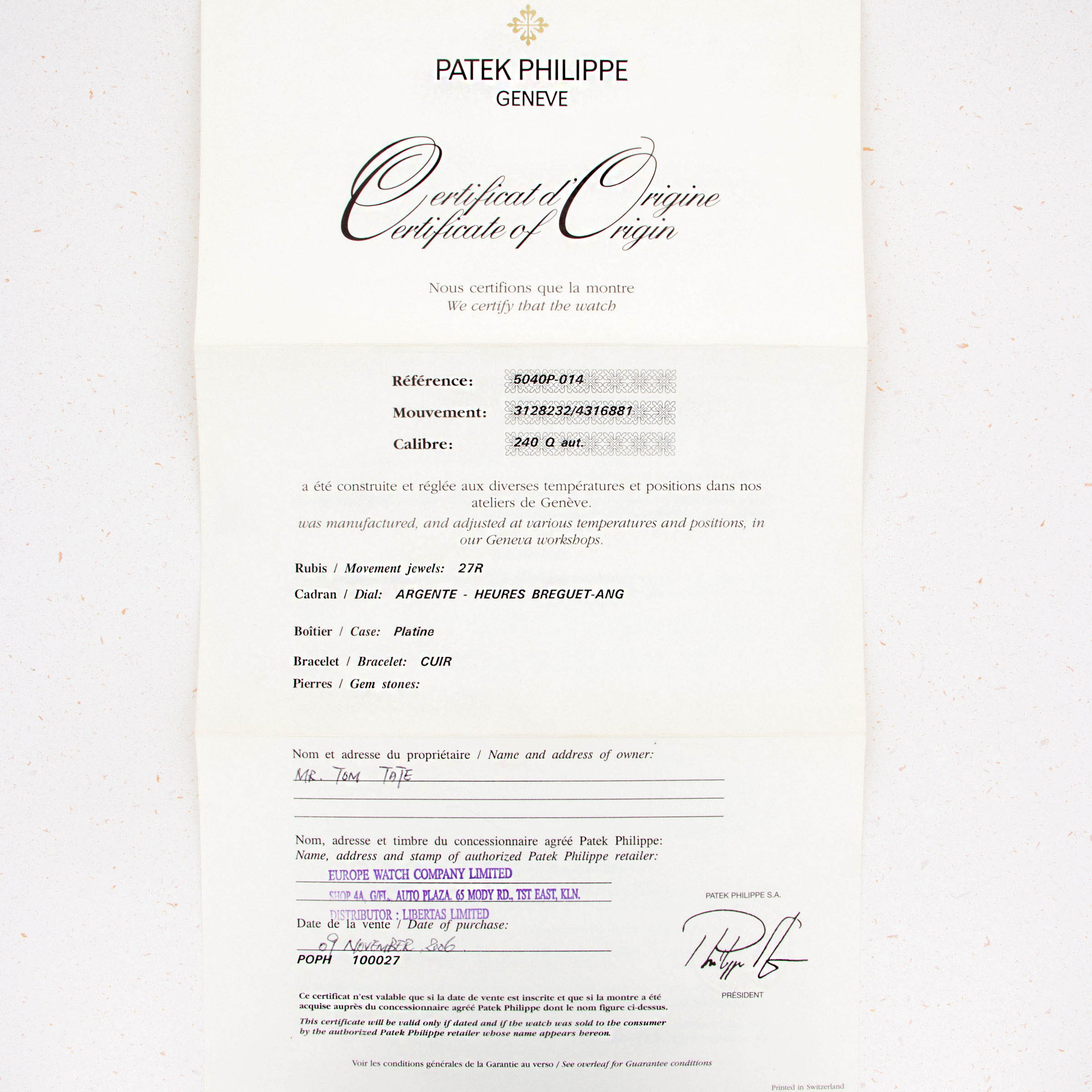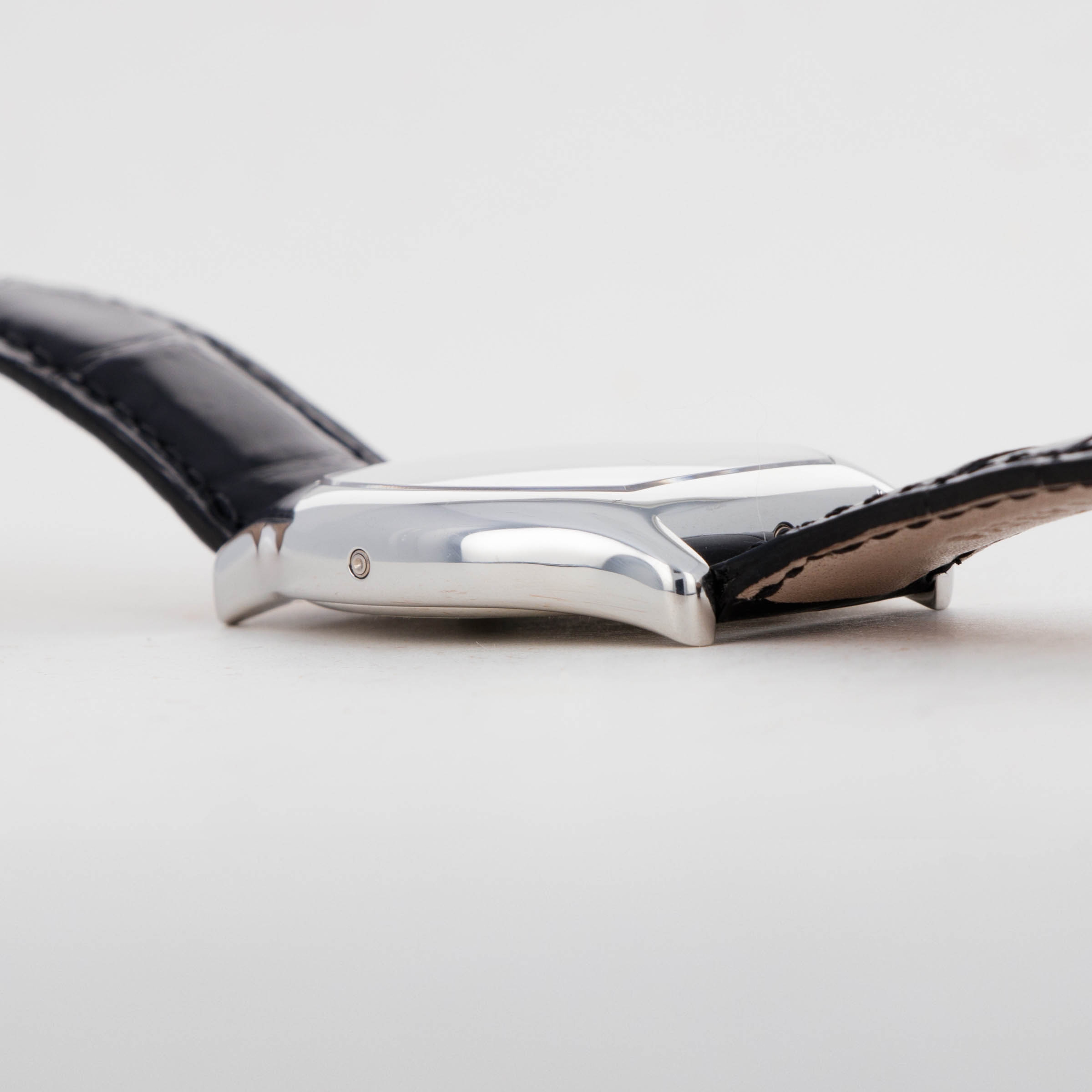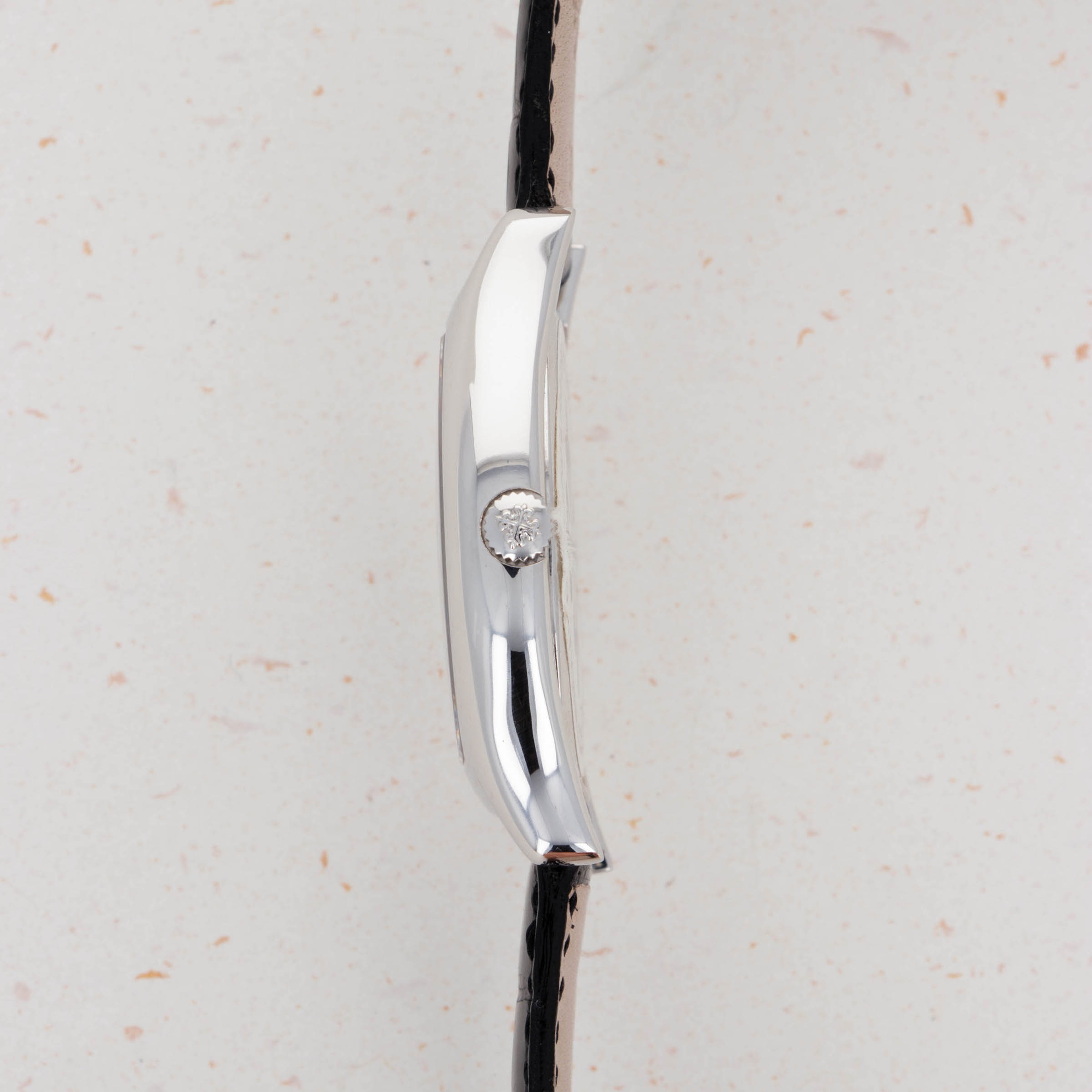 Released in 1992 and produced primarily in yellow gold until its discontinuation in 2007, the platinum variant ref. 5040P that we have here is understated, elegant, and incredibly rare. The first tonneau-shaped perpetual calendar watch from Patek Philippe, clearly inspired by the Art Deco movement and Abraham-Louis Breguet, it was the first serially produced wristwatch from the brand to carry both, Breguet numerals and Breguet hands. Described by many seasoned collectors as one of the most overlooked complication pieces from Patek, the ref. 5040's dial is as legible as they come. Sporting clear script throughout its three subdials, and a circular railroad-style minute track along the glossy black dial's periphery, the ref. 5040 is a visual treat with something taking your eye's interest no matter where you look. While it is covered by a solid platinum caseback, within its 35mm case lies one of the finest perpetual calendar movements Patek ever produced, the automatic cal. 240Q. This allows each subdial to feature two individual pieces of information. The subdial at 9 o'clock provides the wearer with a day indication and 24-hour clock, while the subdial at 6 o'clock provides the wearer with a moon phase indicator and day of the month display, and the 3 o'clock position includes the month and leap year indicator. An intricately designed watch, from its physical construction to its displays, the ref. 5040P is easily one of the most refined Grand Complication timepieces to ever leave the Patek Philippe workshop.