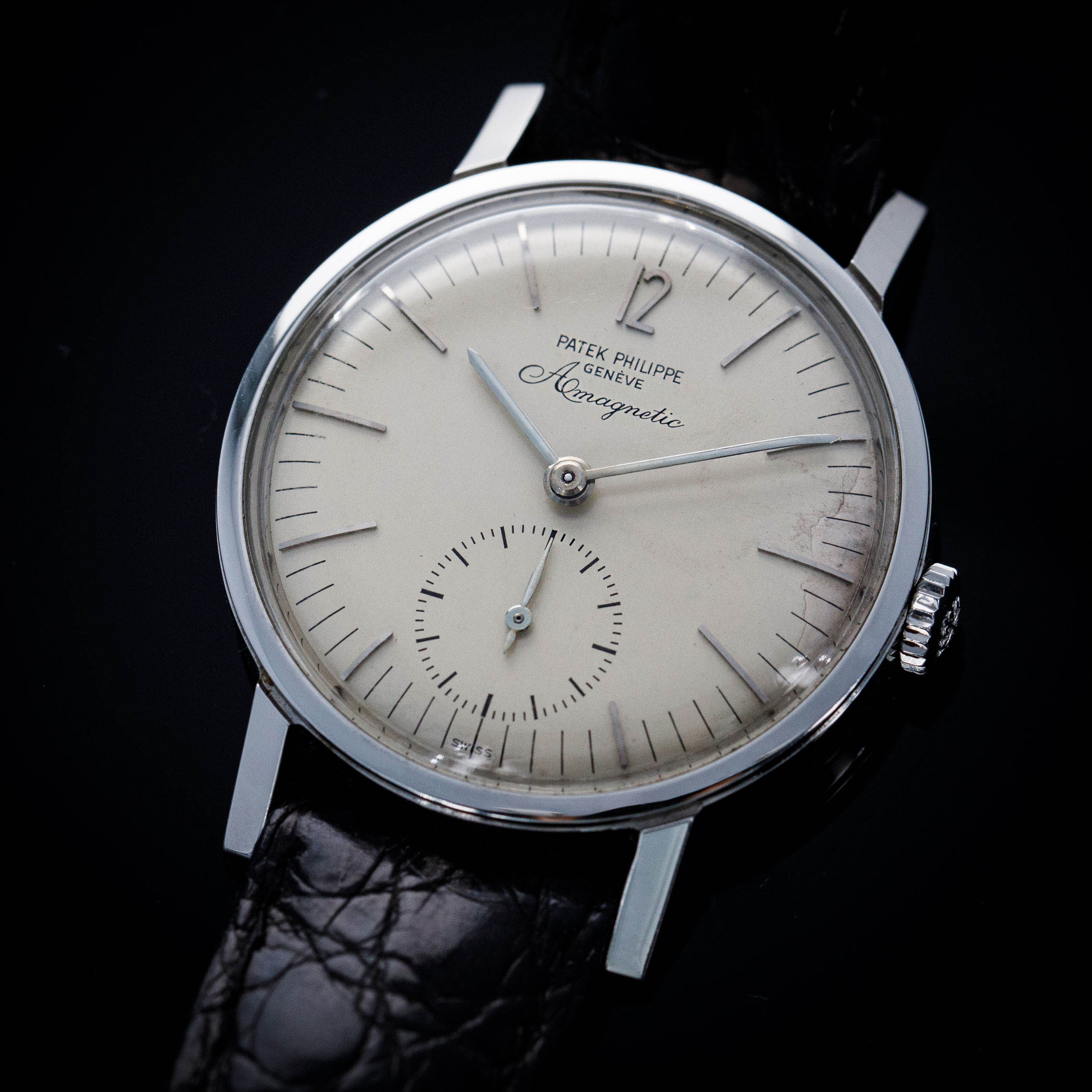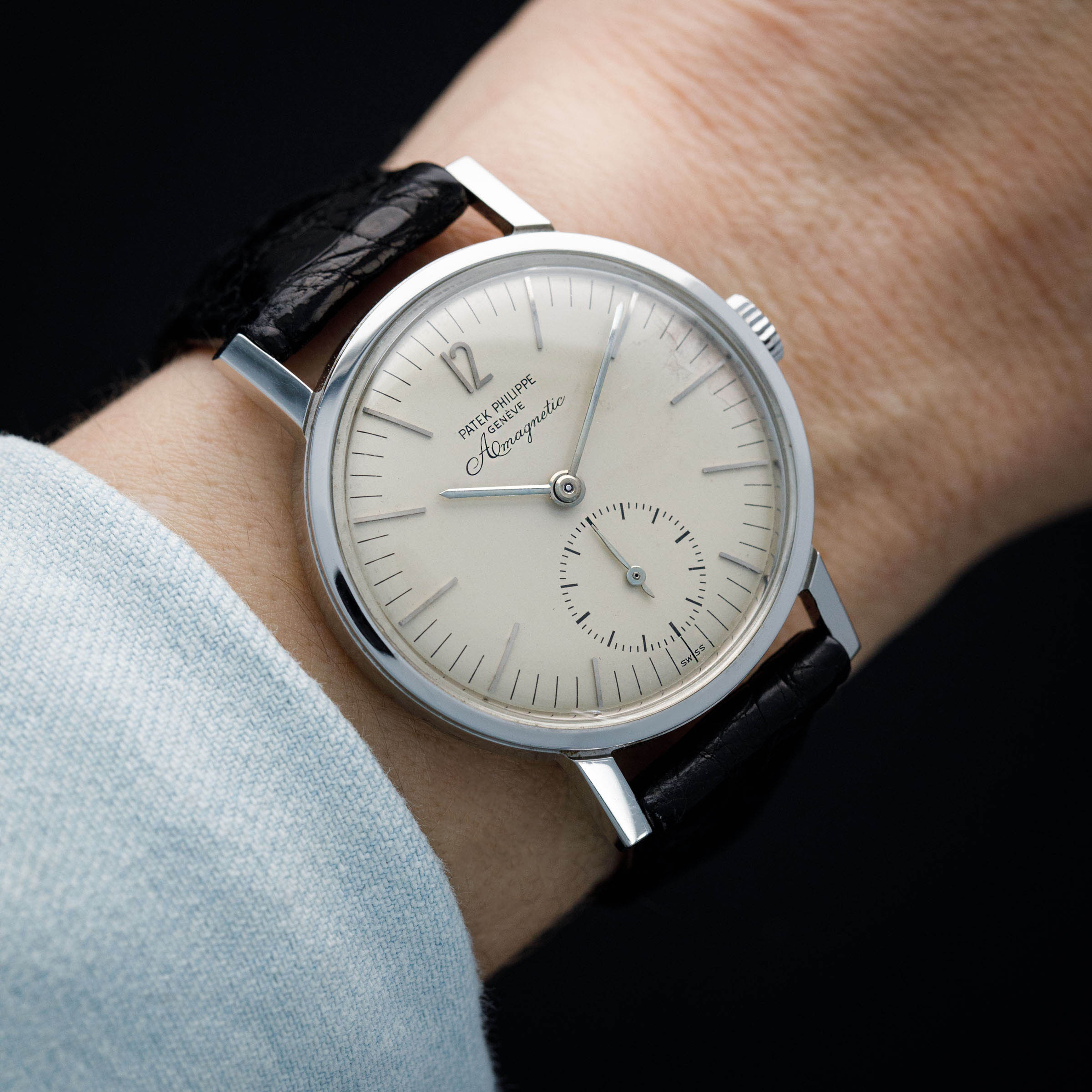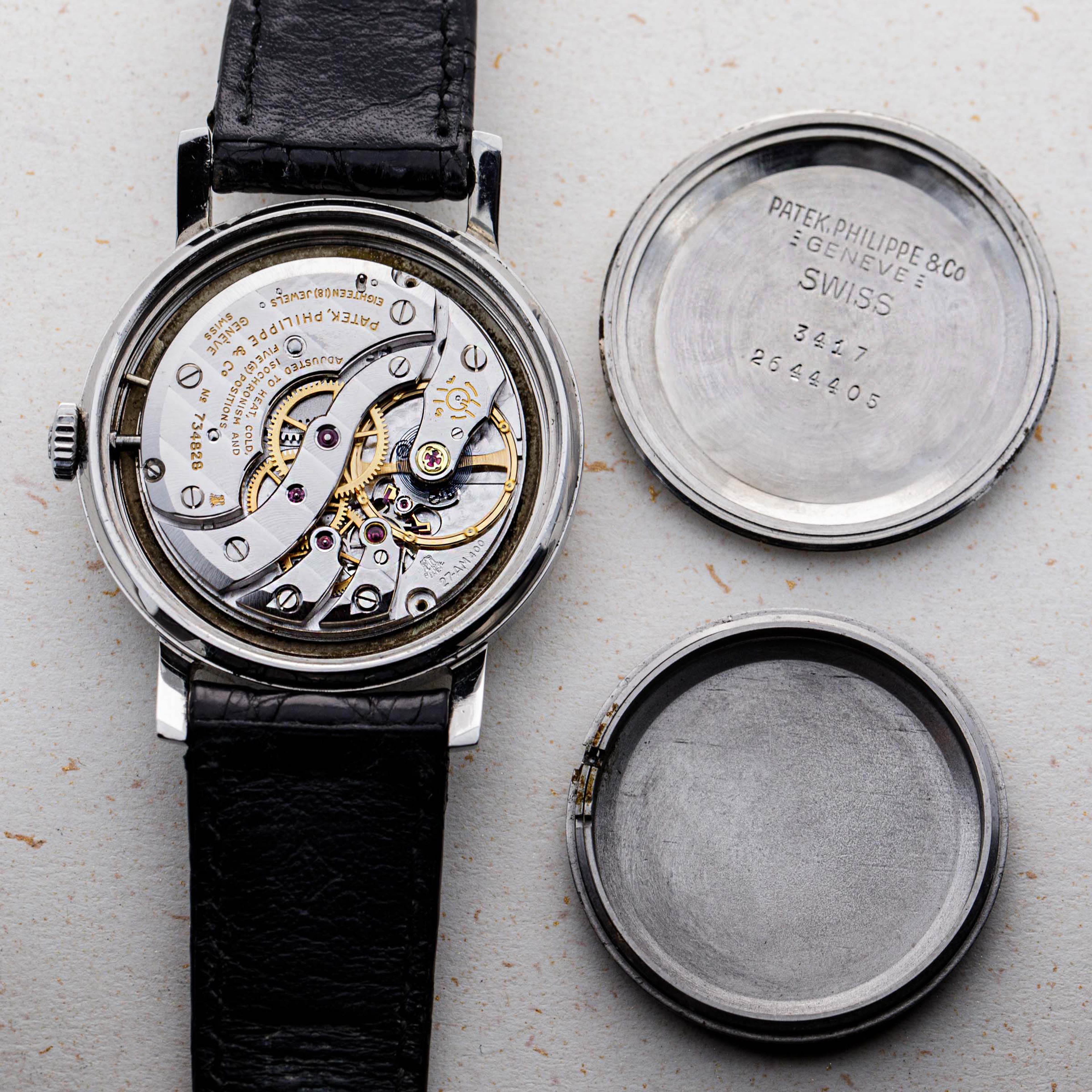 While they are famed for their precious metal dress watches and ultra-complicated feats of technical prowess, one obscure part of Patek Philippe’s past is their small history in creating anti-magnetic watches that would remain accurate no matter the magnetic field they came into contact with. Perhaps the best-known reference within that unique collection of offerings is the Amagnetic ref. 3417 that we have here. Launched in 1958 and produced until the late 1960s, the ref. 3417 is not only unique amongst Patek’s historical catalog due to its anti-magnetic properties, but aso due to its stainless steel construction, an extreme rarity for Patek, especially prior to the launch of the Nautilus in 1976. Adding to that, the ref. 3417 also features a screw-down caseback, which has also been a relative rarity for Patek Philippe. Offered in a svelte but wearable 35mm case and boasting an eggshell white dial with a seconds subdial and a lone Arabic numeral at 12 o’clock, the ref. 3417 is a watch that is immediately recognisable on the wrist amongst Patek collectors, but a more “if you know you know” kind of watch for those who are not privy to the intricacies of Patek Philippe’s history as a watchmaker. Powered by the manual-wind calibre 12'''400 AM movement from 1958 to 1960 and the cal. 27-AM 400 manula-wind movement from then to its discontinuation, the ref. 3417 packs a lot of history and intrigue into its legendary stainless steel amagnetic case.