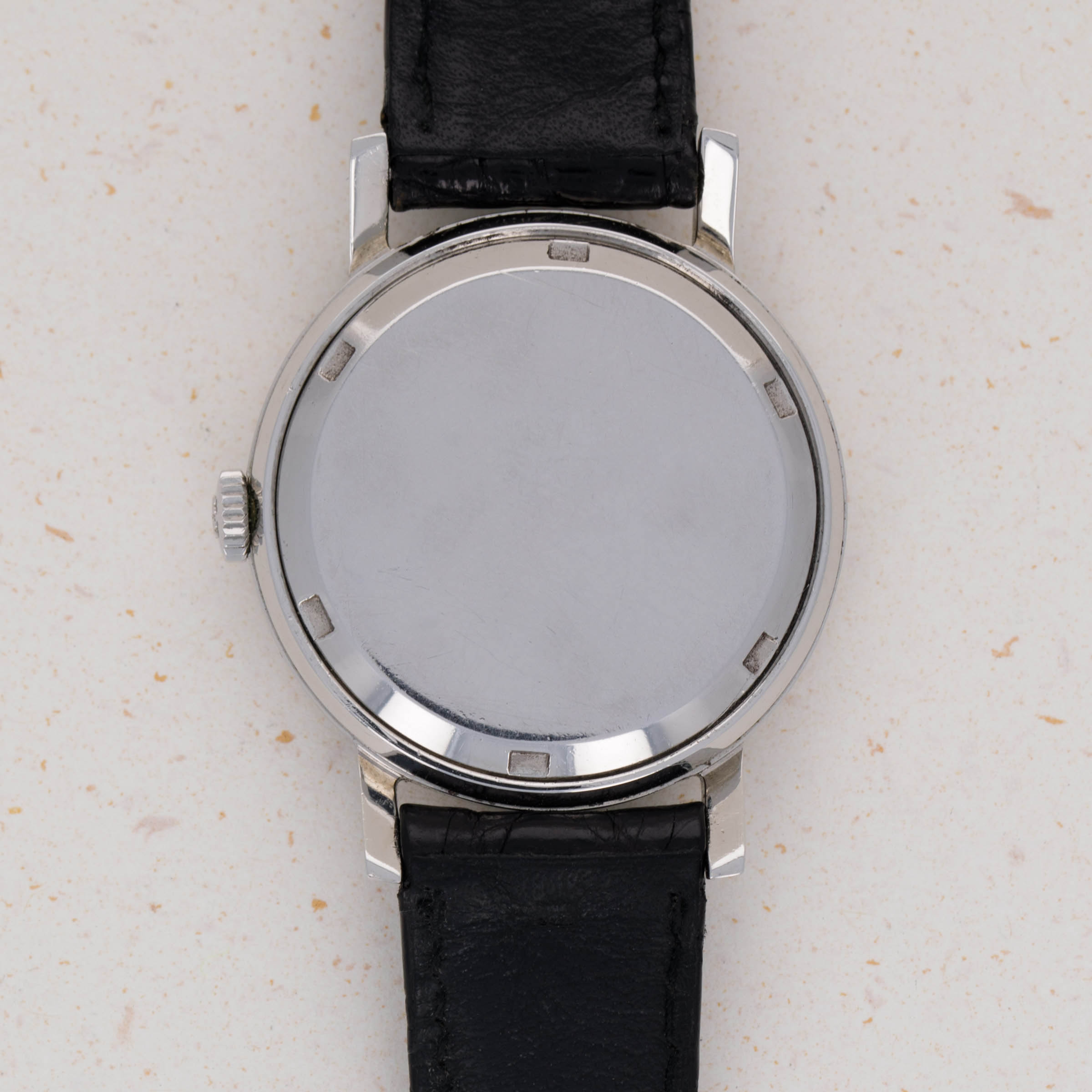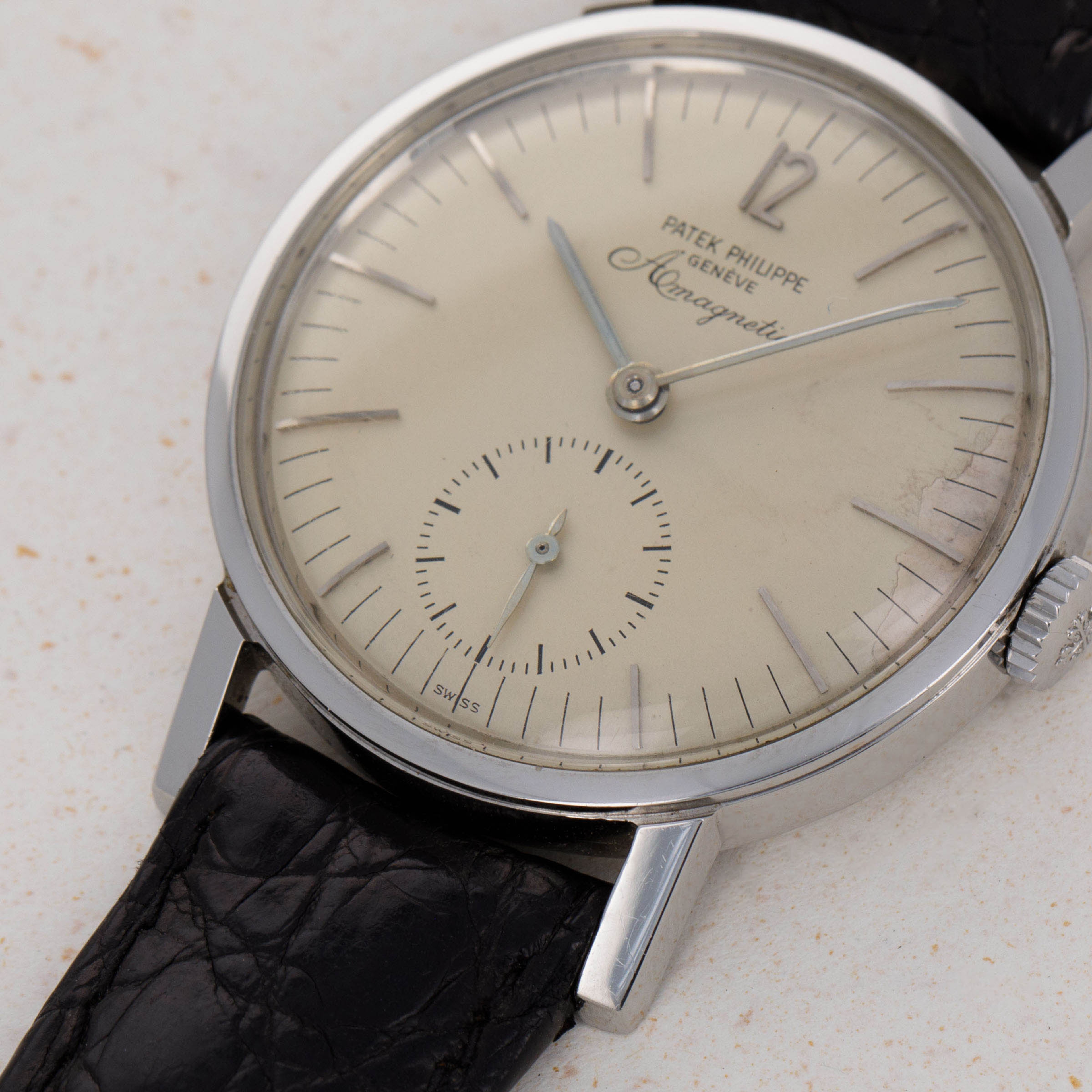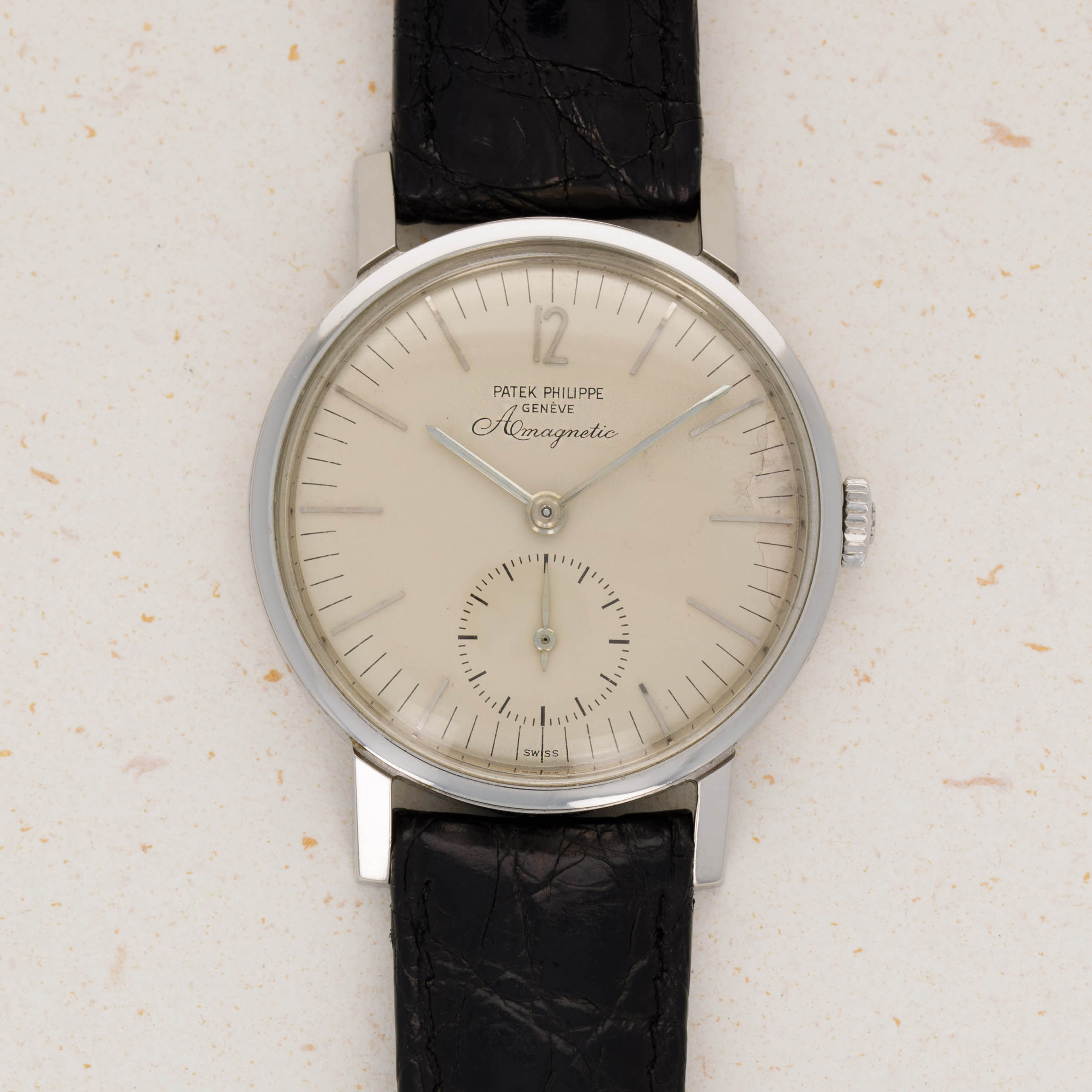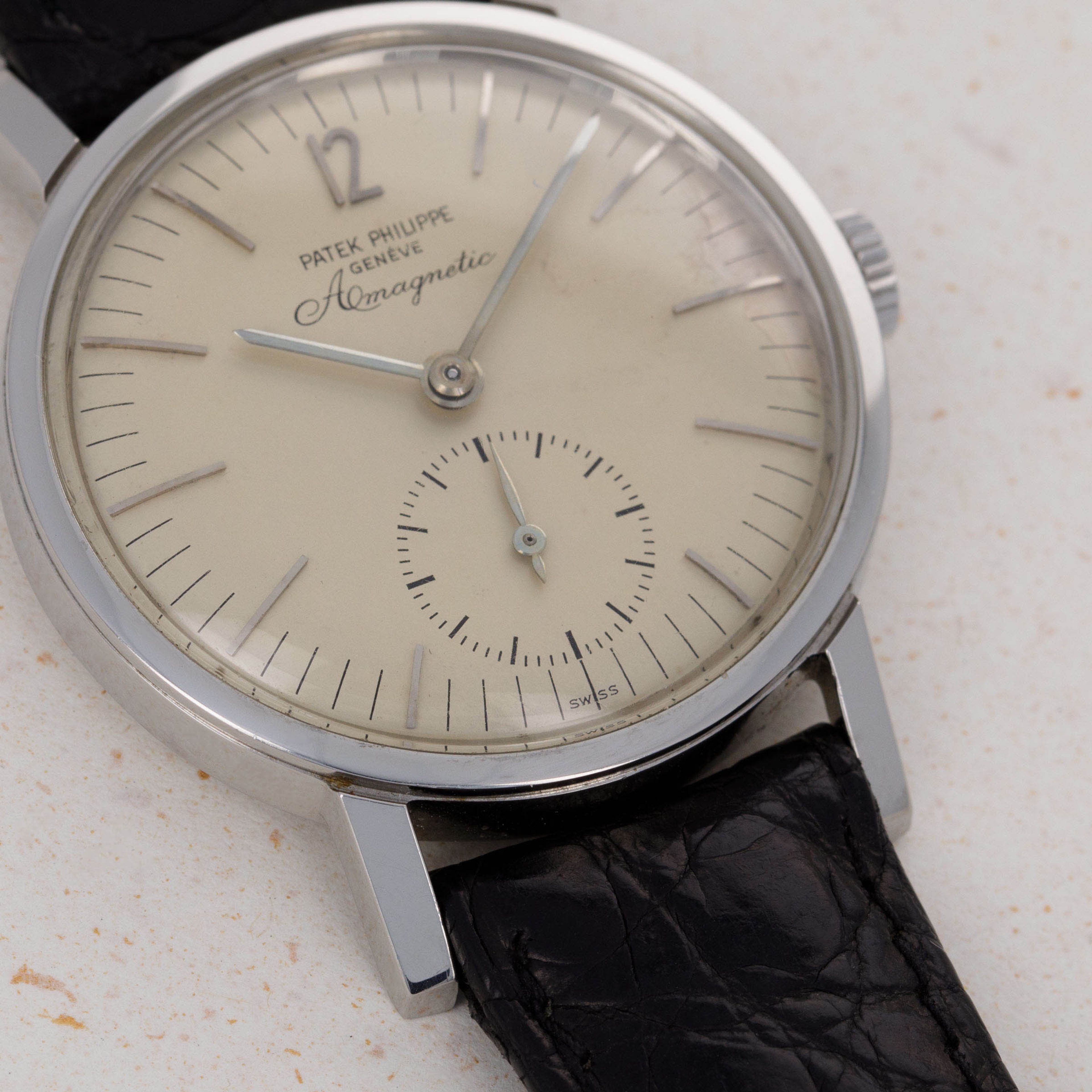 While they are famed for their precious metal dress watches and ultra-complicated feats of technical prowess, one obscure part of Patek Philippe’s past is their small history in creating anti-magnetic watches that would remain accurate no matter the magnetic field they came into contact with. Perhaps the best-known reference within that unique collection of offerings is the Amagnetic ref. 3417 that we have here. Launched in 1958 and produced until the late 1960s, the ref. 3417 is not only unique amongst Patek’s historical catalog due to its anti-magnetic properties, but aso due to its stainless steel construction, an extreme rarity for Patek, especially prior to the launch of the Nautilus in 1976. Adding to that, the ref. 3417 also features a screw-down caseback, which has also been a relative rarity for Patek Philippe. Offered in a svelte but wearable 35mm case and boasting an eggshell white dial with a seconds subdial and a lone Arabic numeral at 12 o’clock, the ref. 3417 is a watch that is immediately recognisable on the wrist amongst Patek collectors, but a more “if you know you know” kind of watch for those who are not privy to the intricacies of Patek Philippe’s history as a watchmaker. Powered by the manual-wind calibre 12'''400 AM movement from 1958 to 1960 and the cal. 27-AM 400 manula-wind movement from then to its discontinuation, the ref. 3417 packs a lot of history and intrigue into its legendary stainless steel amagnetic case.