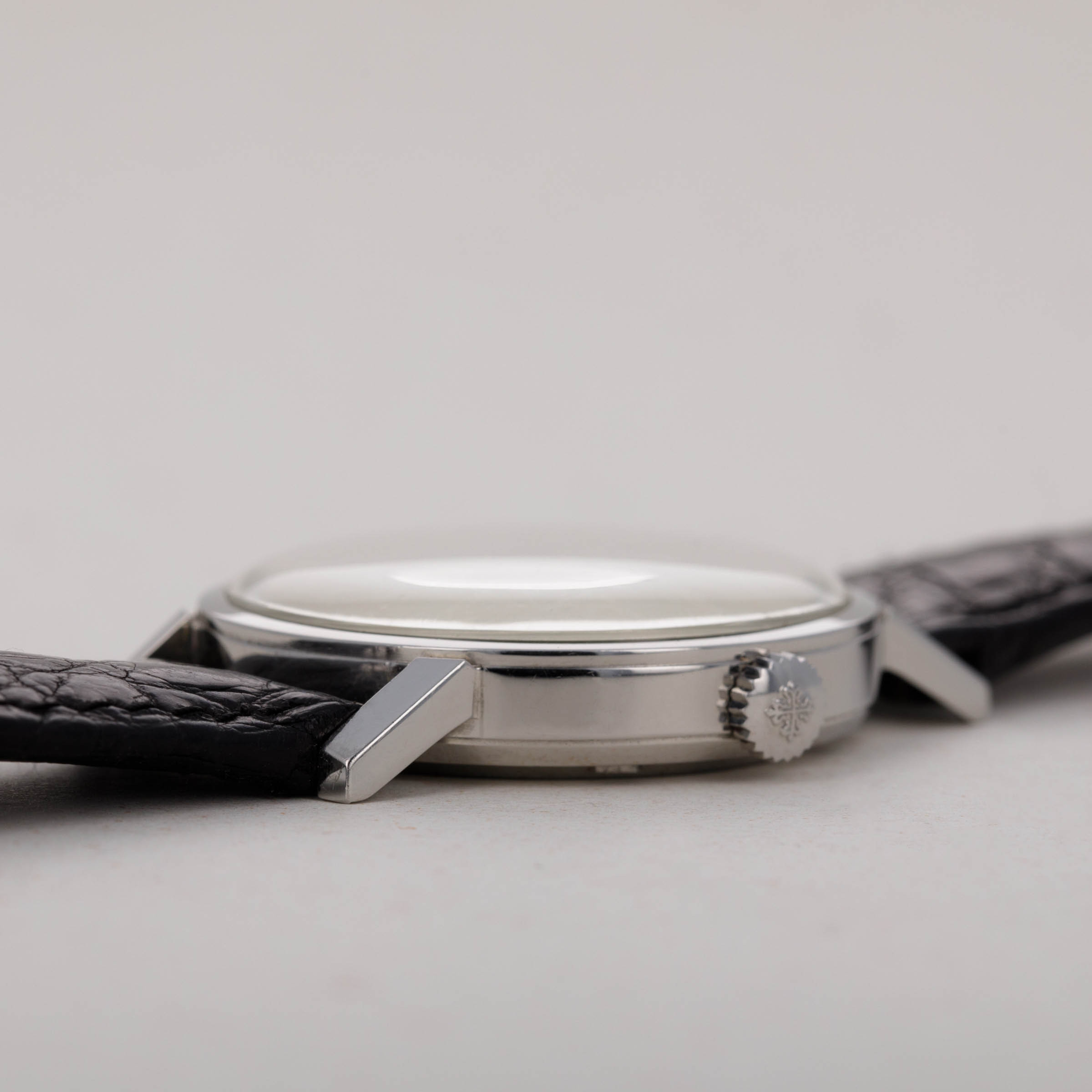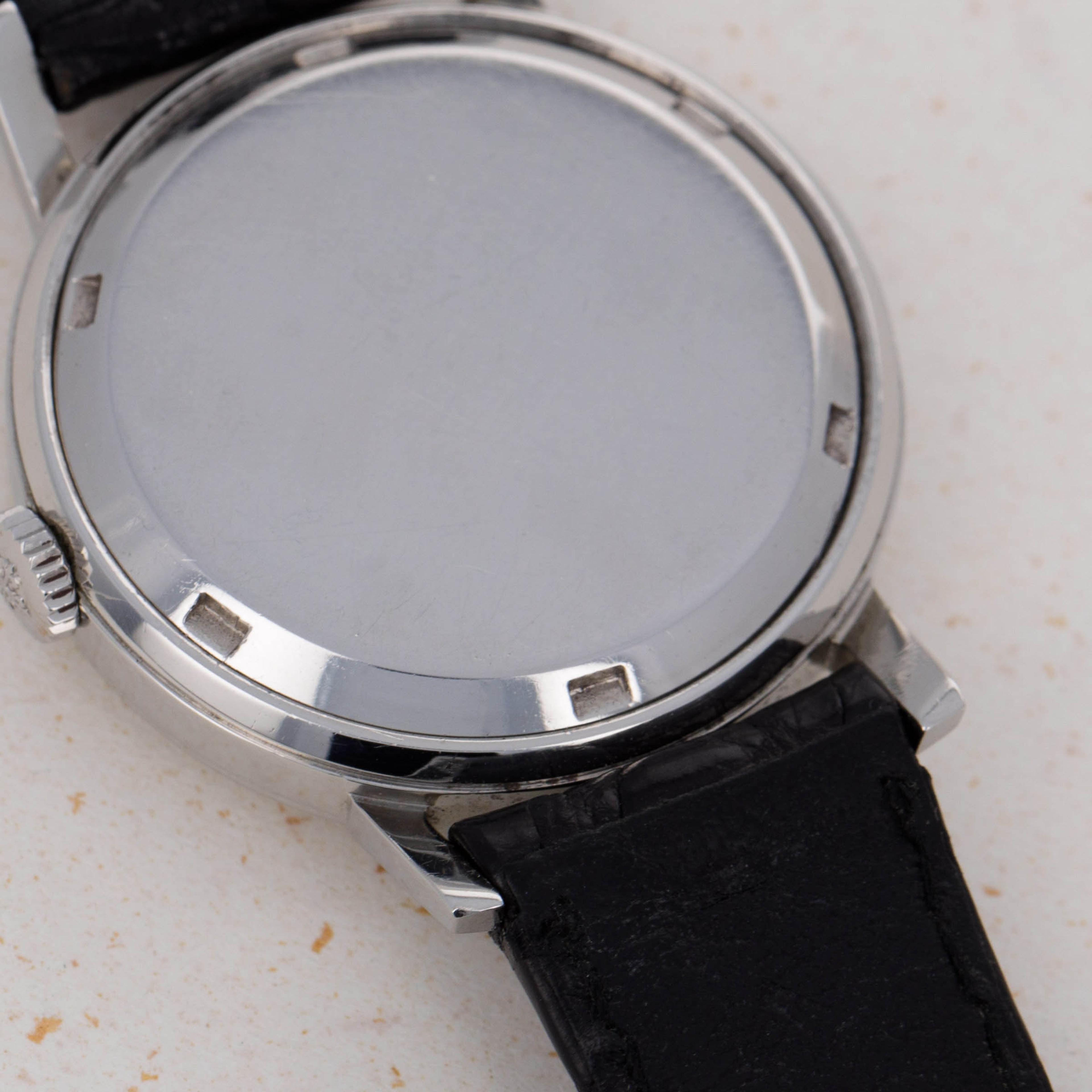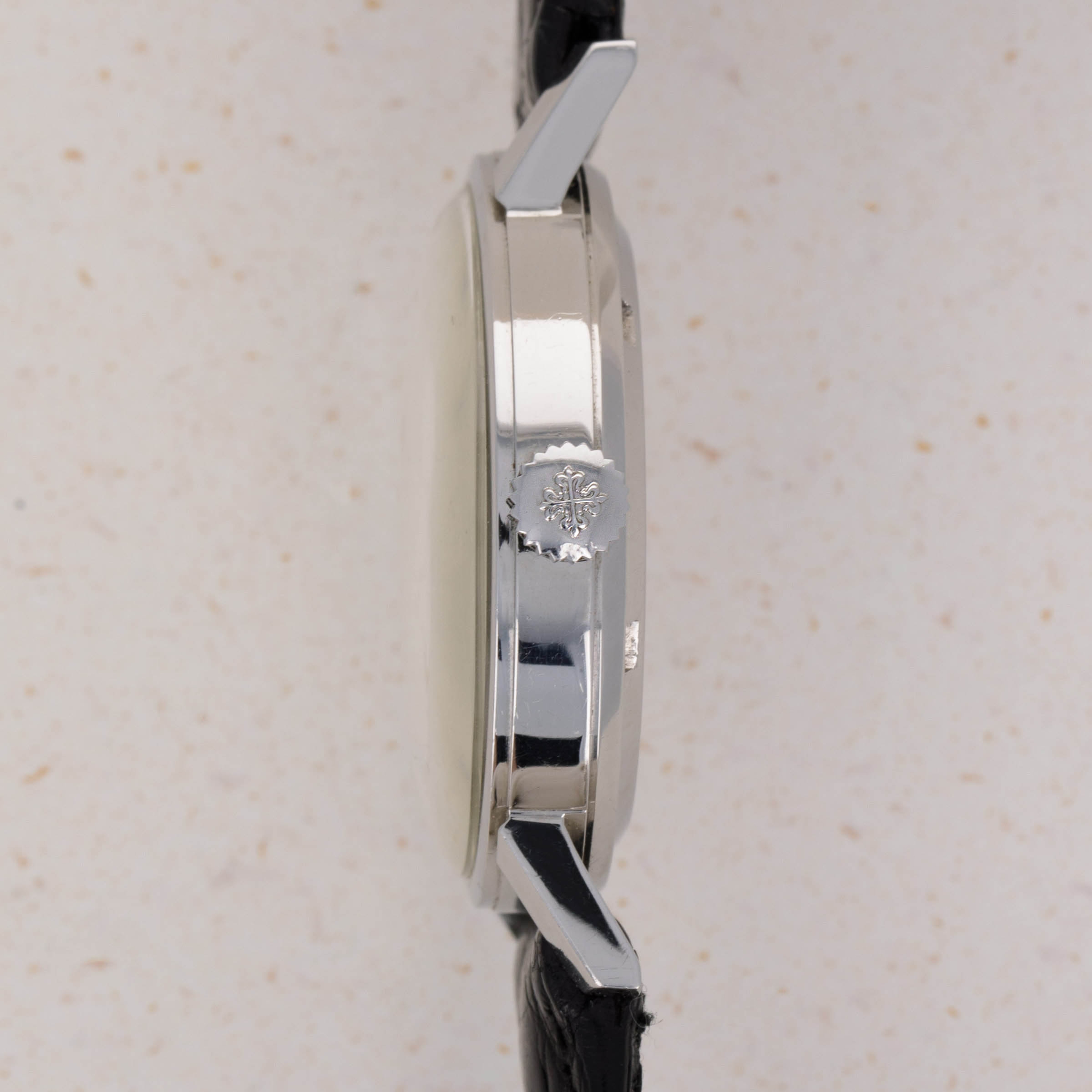 Watch is in very good overall condition. Case shows minor surface wear and marks, with no significant or noteworthy damage. There is some softness to the edges, comensurate with the age of the watch. The dial is in very good overall condition. It exhbits some clouding on the surface, particularly manifested on the right edge, where there is an area of loss of lacquer that is visible on the edge from approx 2 to 4 o'clock. Light oxidation on the indexes is also present. The watch comes on an original PP strap with a generic steel buckle.