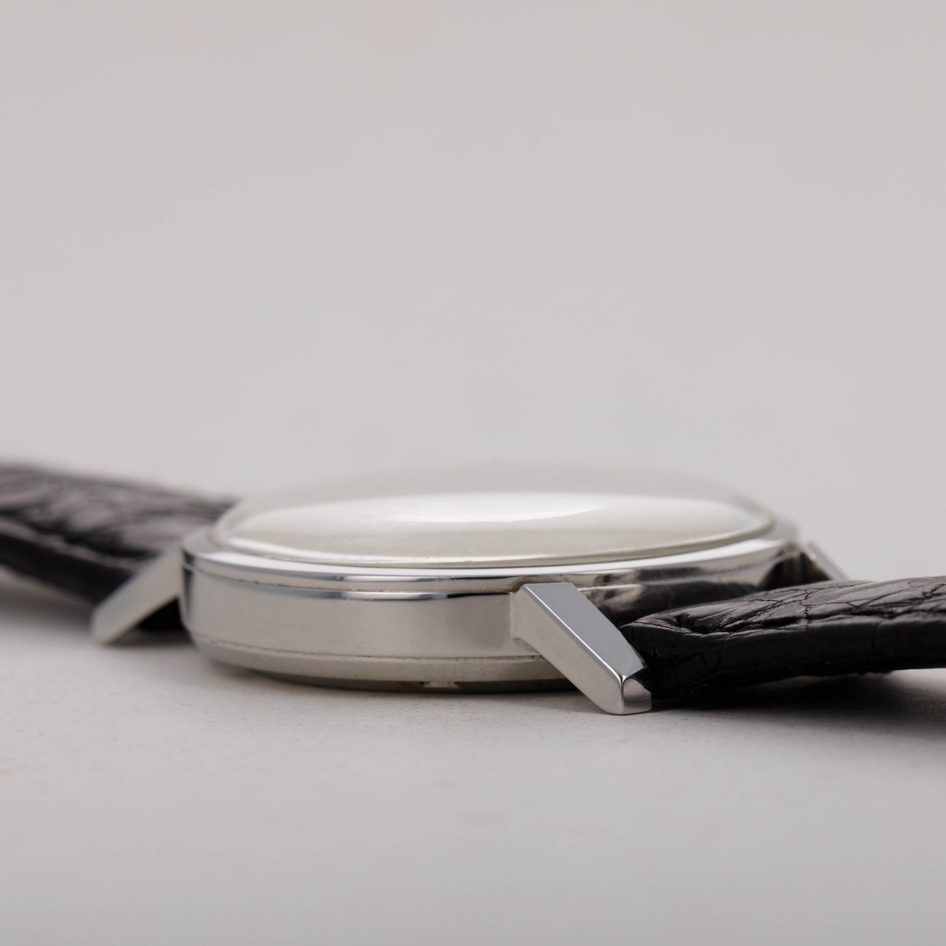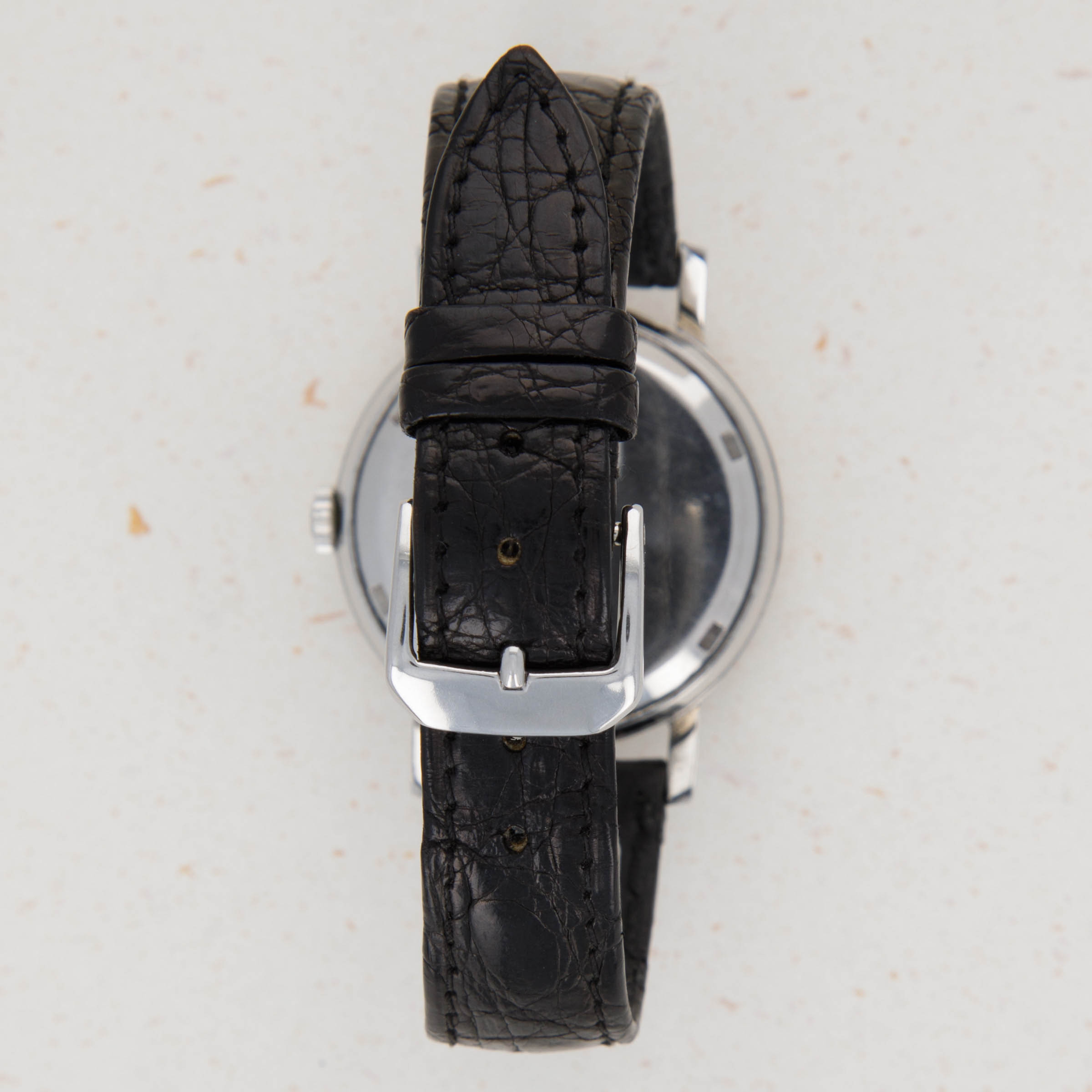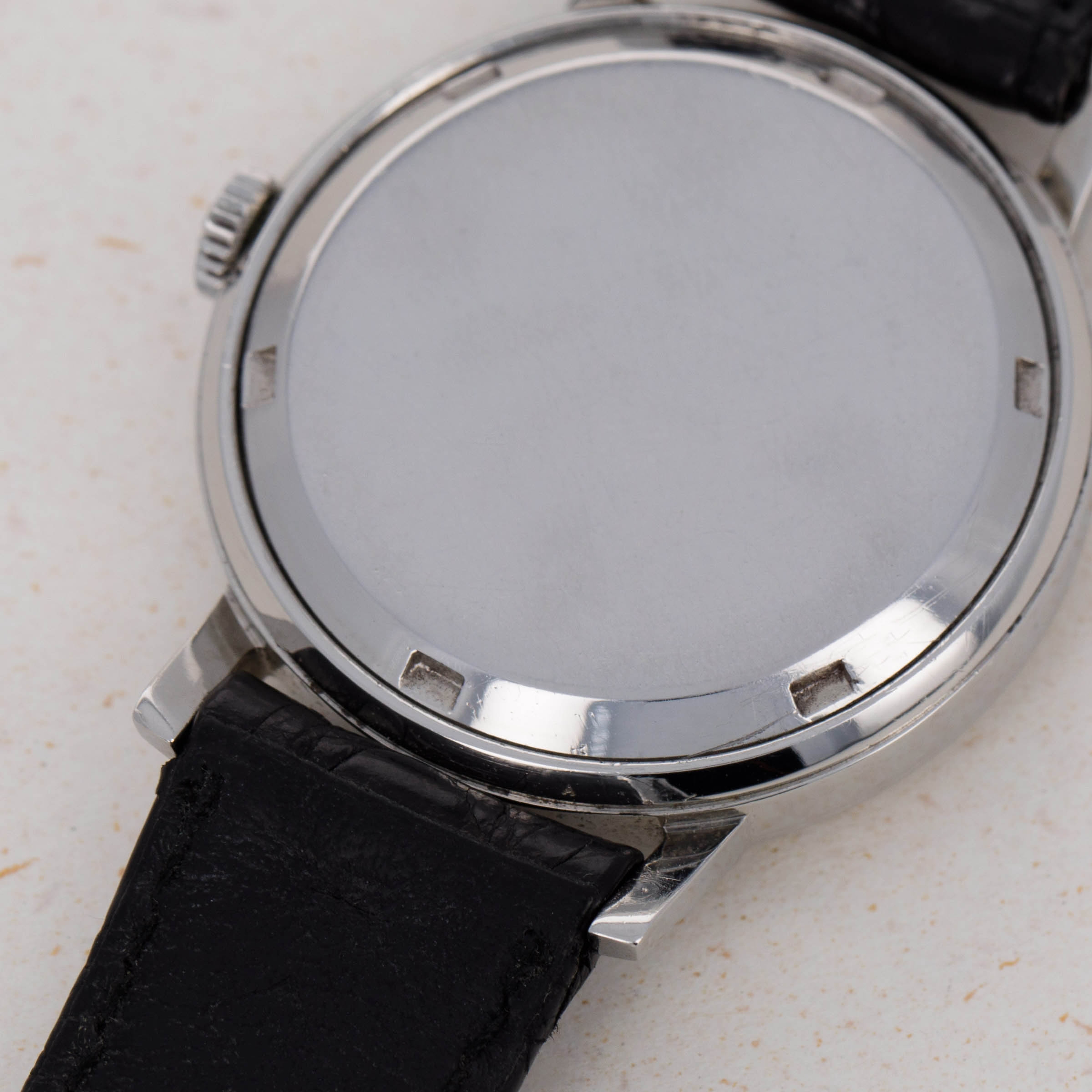 Watch is in very good overall condition. Case shows minor surface wear and marks, with no significant or noteworthy damage. There is some softness to the edges, comensurate with the age of the watch. The dial is in very good overall condition. It exhbits some clouding on the surface, particularly manifested on the right edge, where there is an area of loss of lacquer that is visible on the edge from approx 2 to 4 o'clock. Light oxidation on the indexes is also present. The watch comes on an original PP strap with a generic steel buckle.