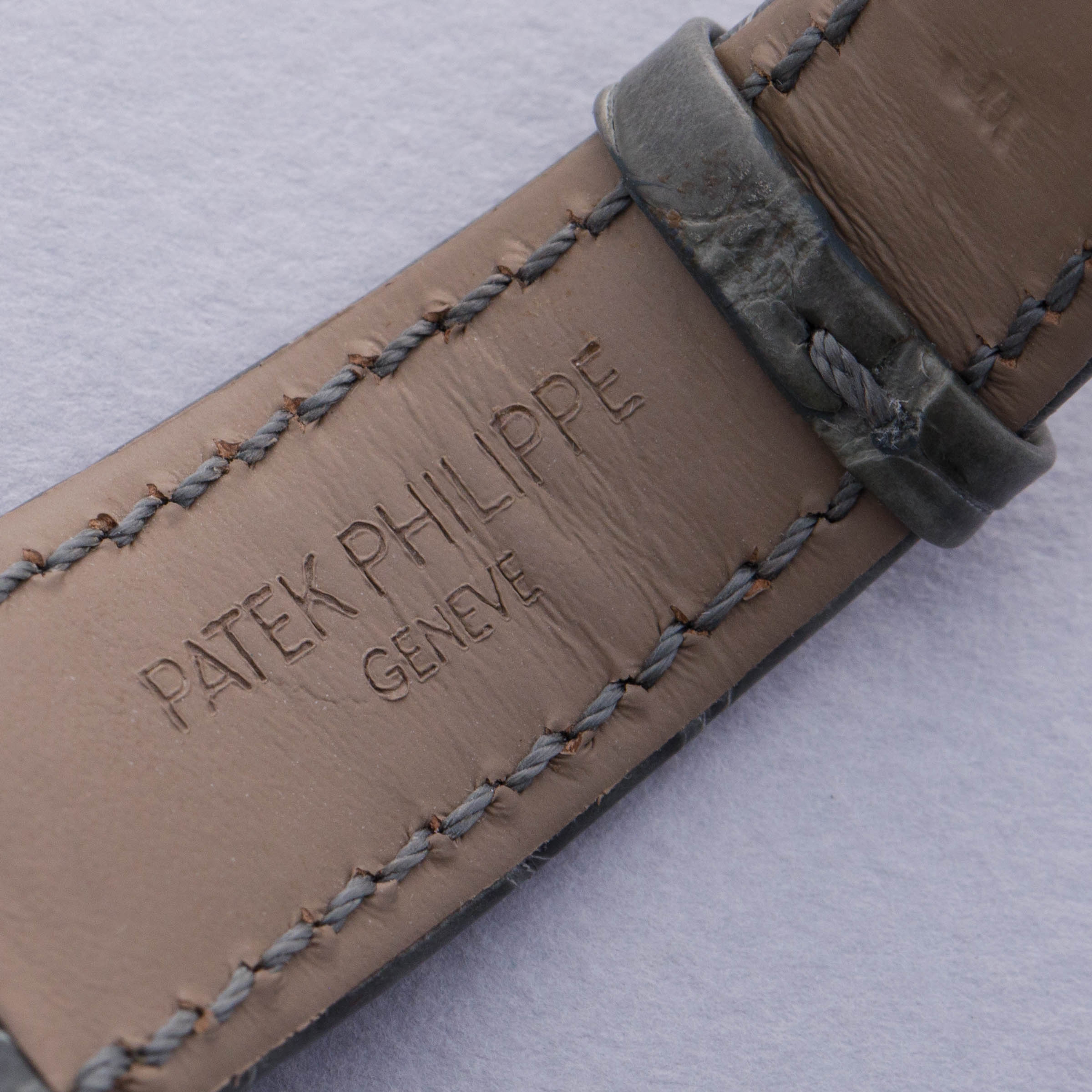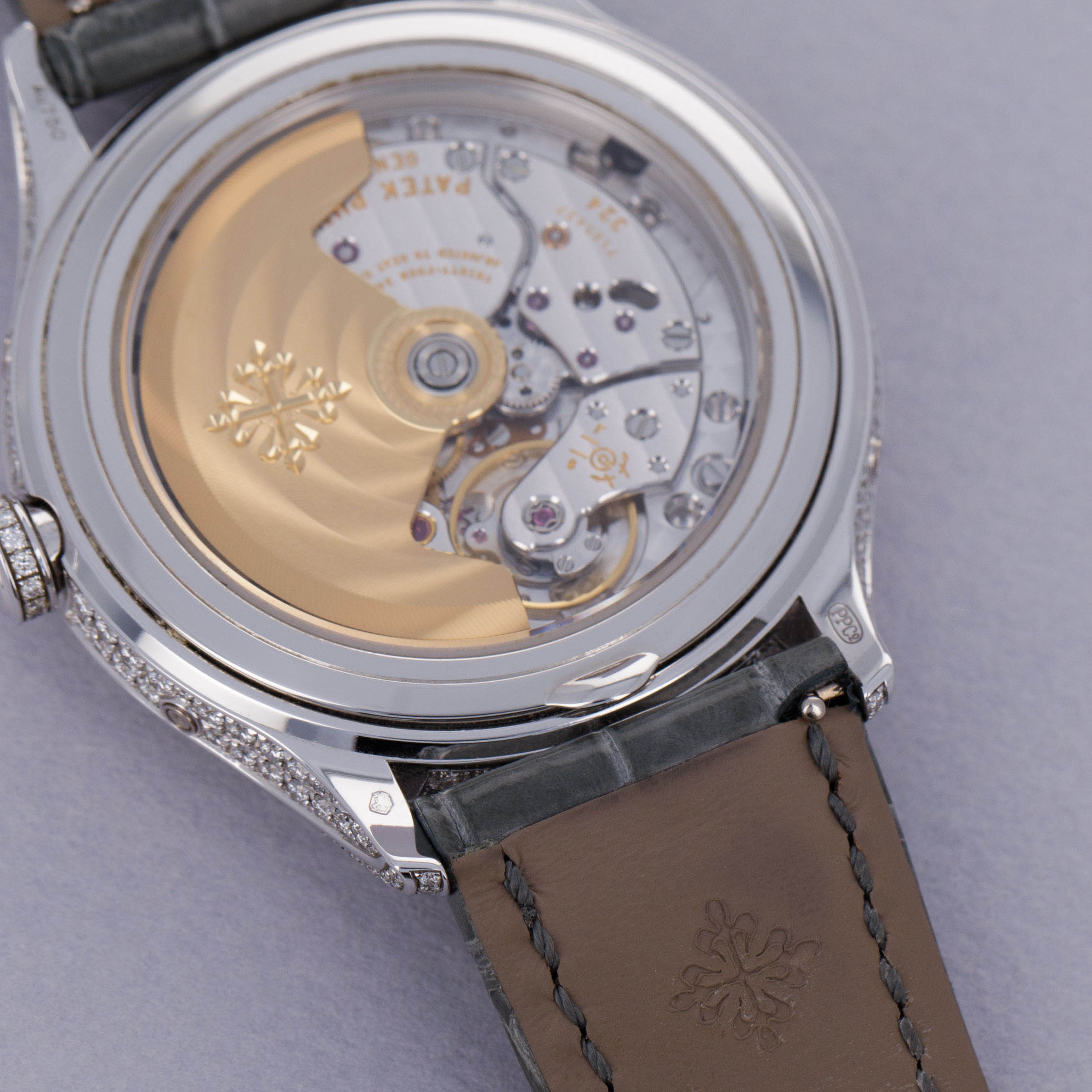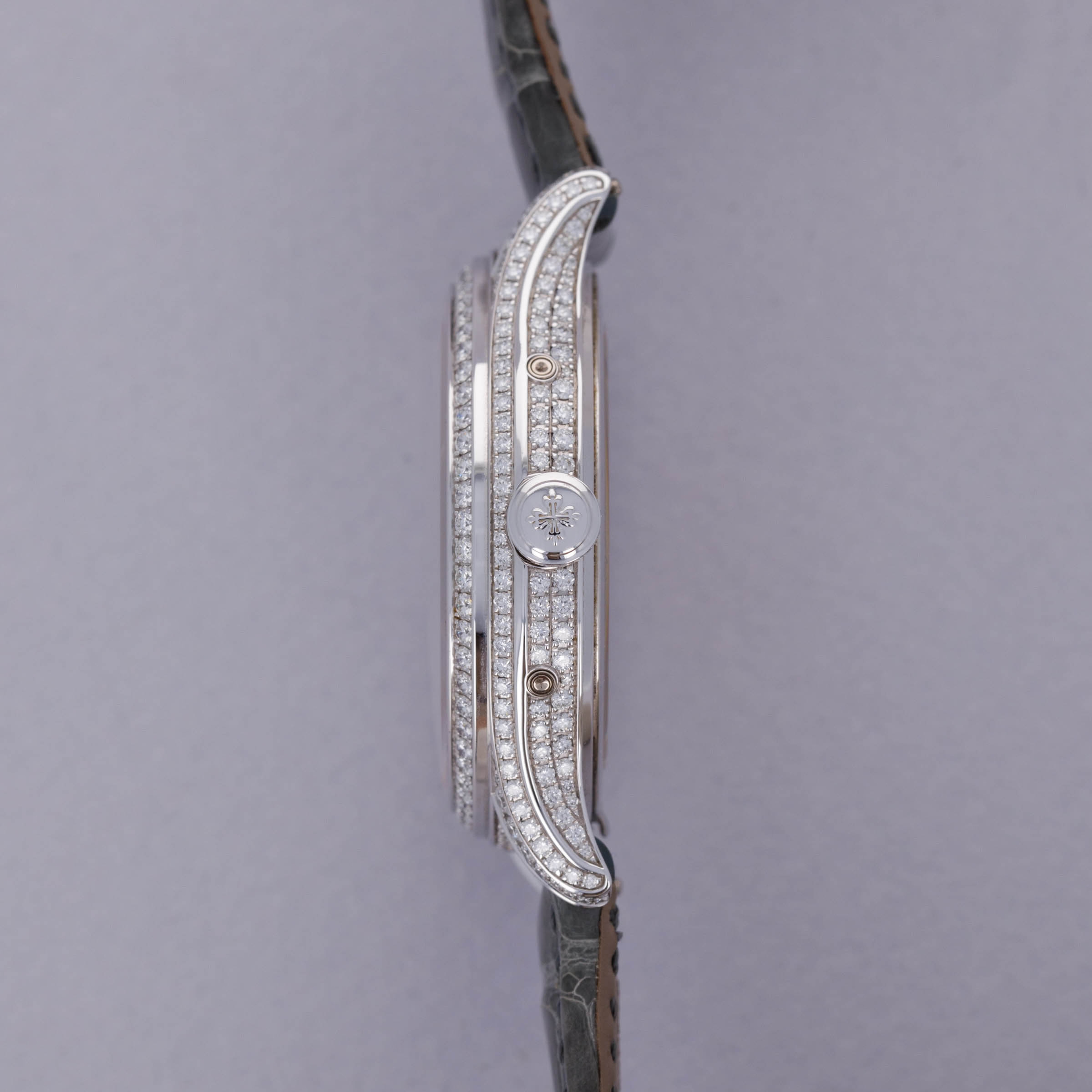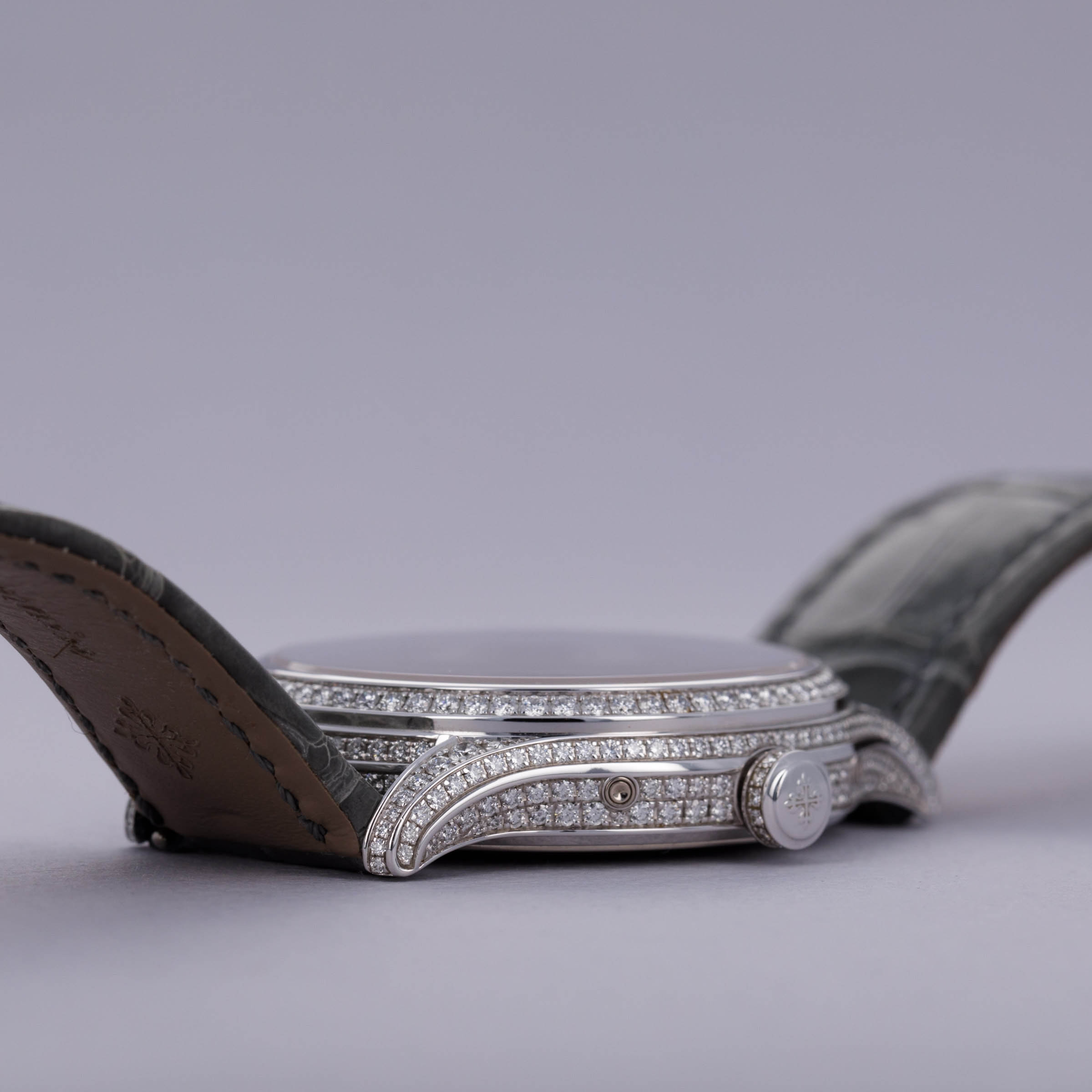 Watch is in near-mint condition. There are minor signs of wear, including small marks along the case, as well as some accumulated debris on the surfaces and crevasses of the diamond settings. Watch comes with box and papers in addition to two lightly worn Patek Philippe straps.