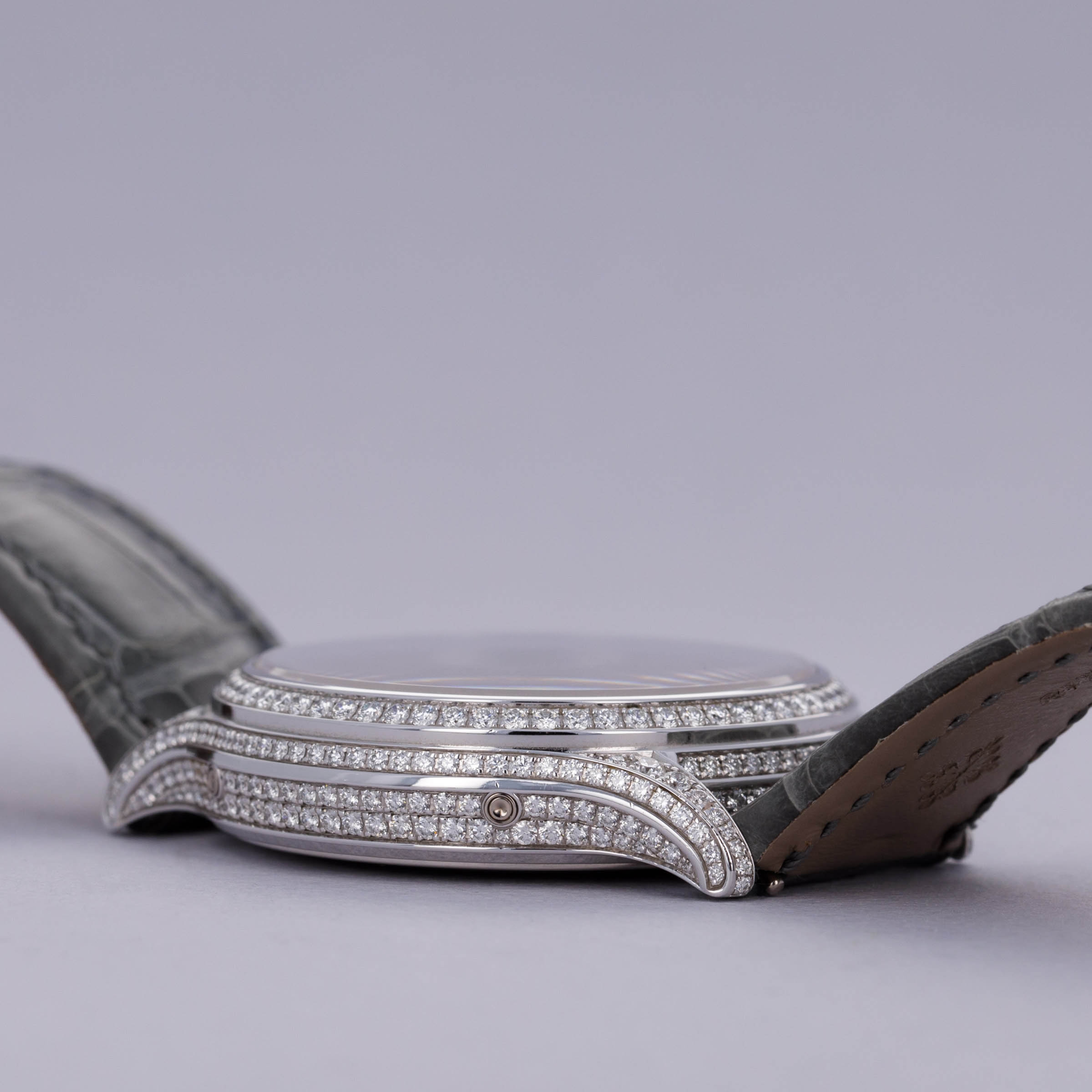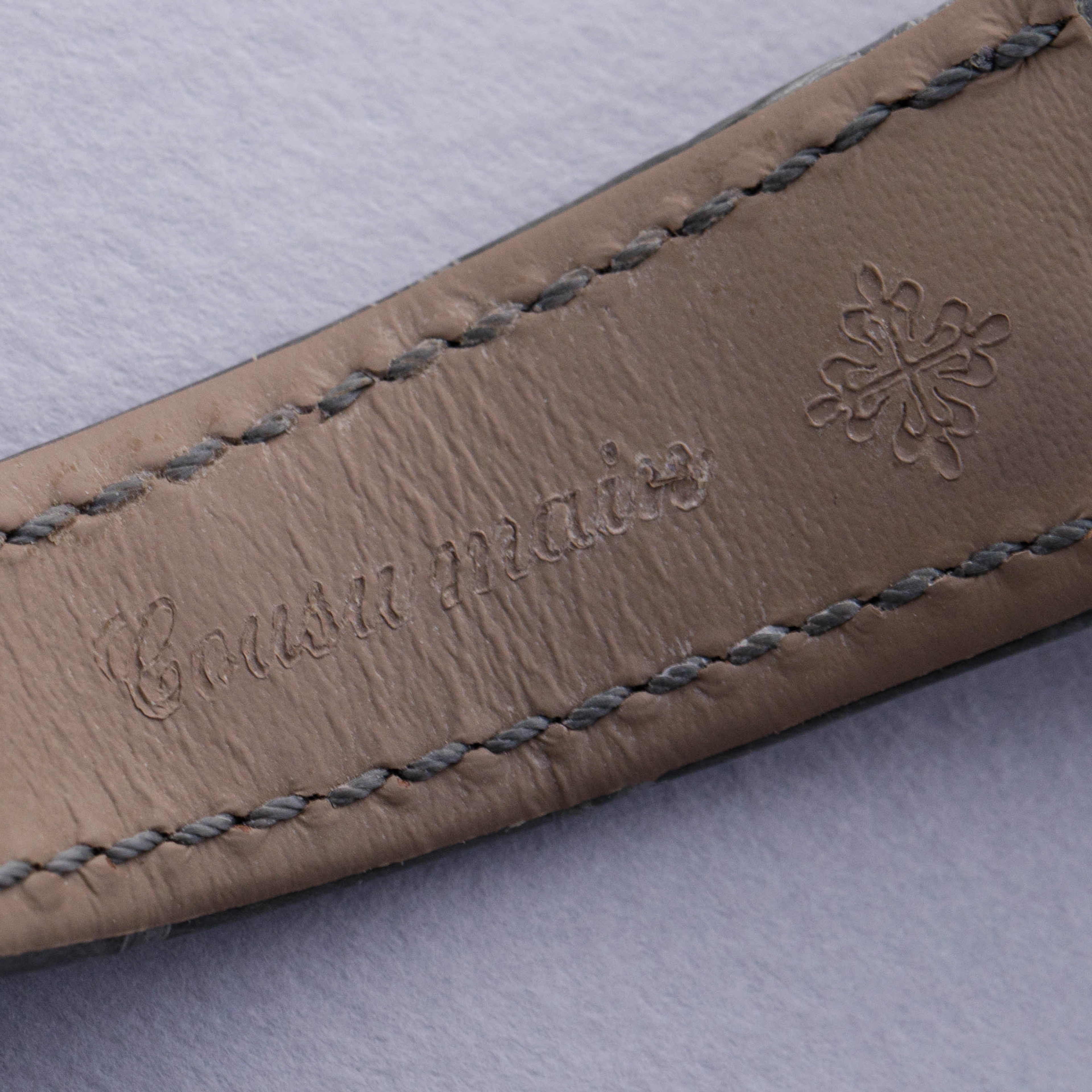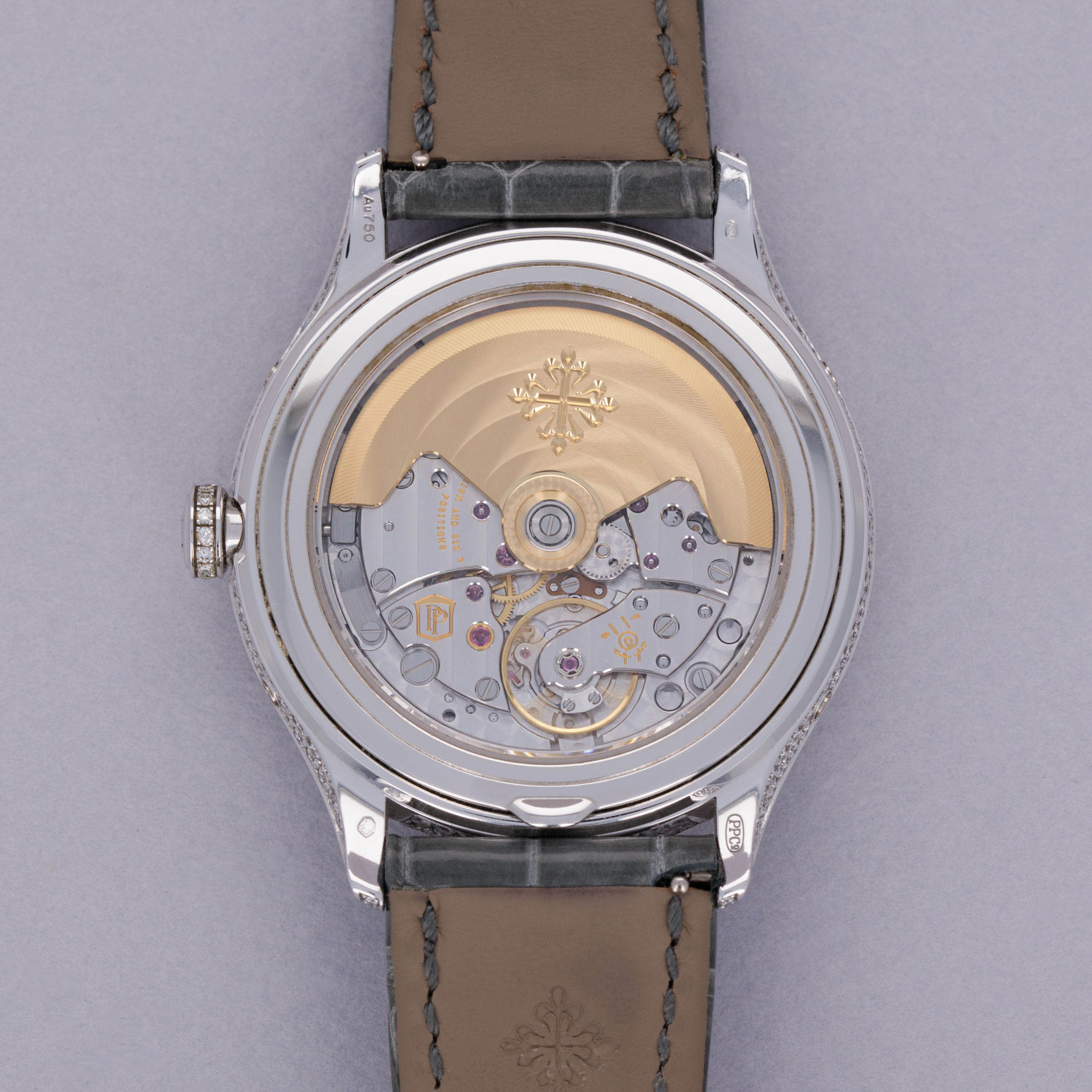 Watch is in near-mint condition. There are minor signs of wear, including small marks along the case, as well as some accumulated debris on the surfaces and crevasses of the diamond settings. Watch comes with box and papers in addition to two lightly worn Patek Philippe straps.