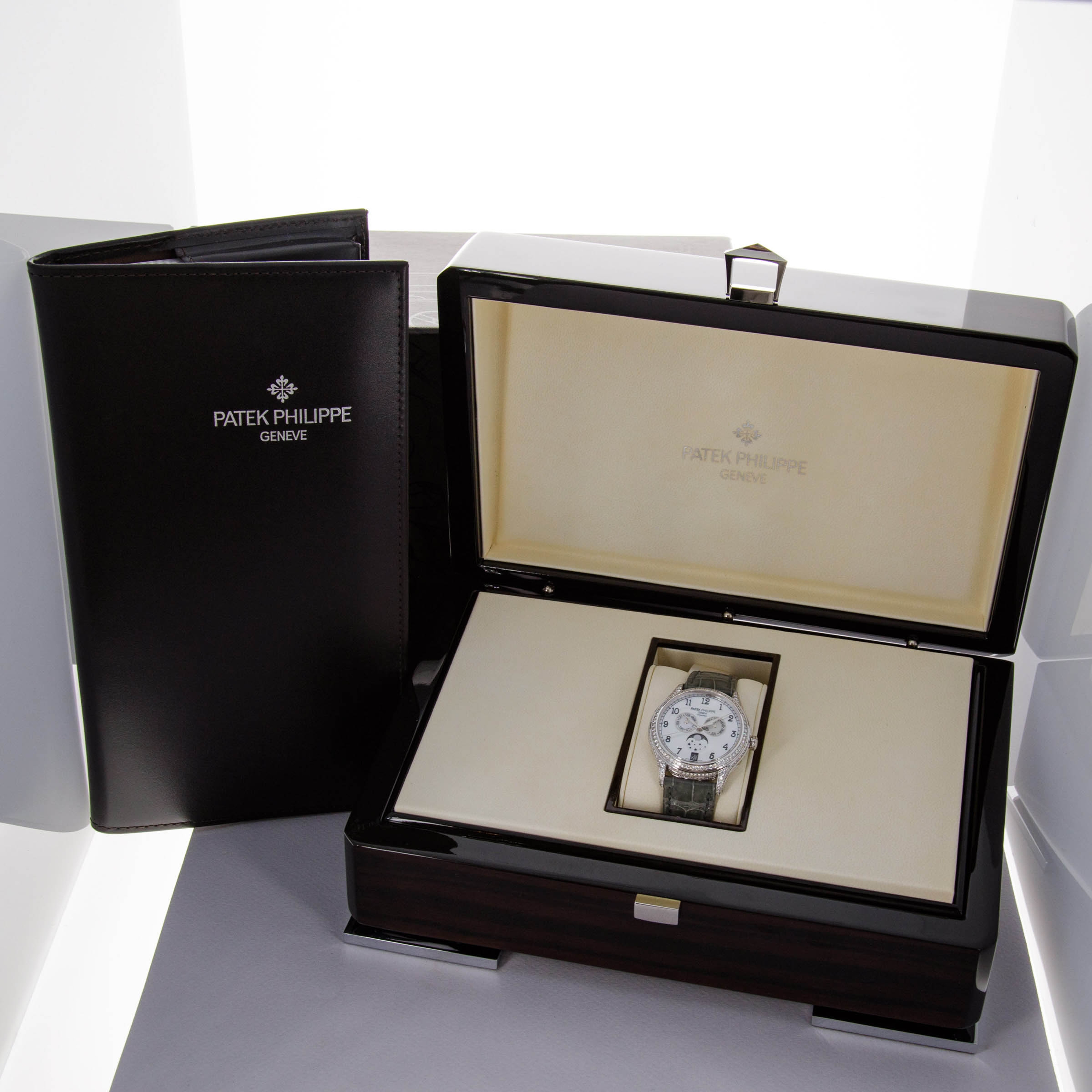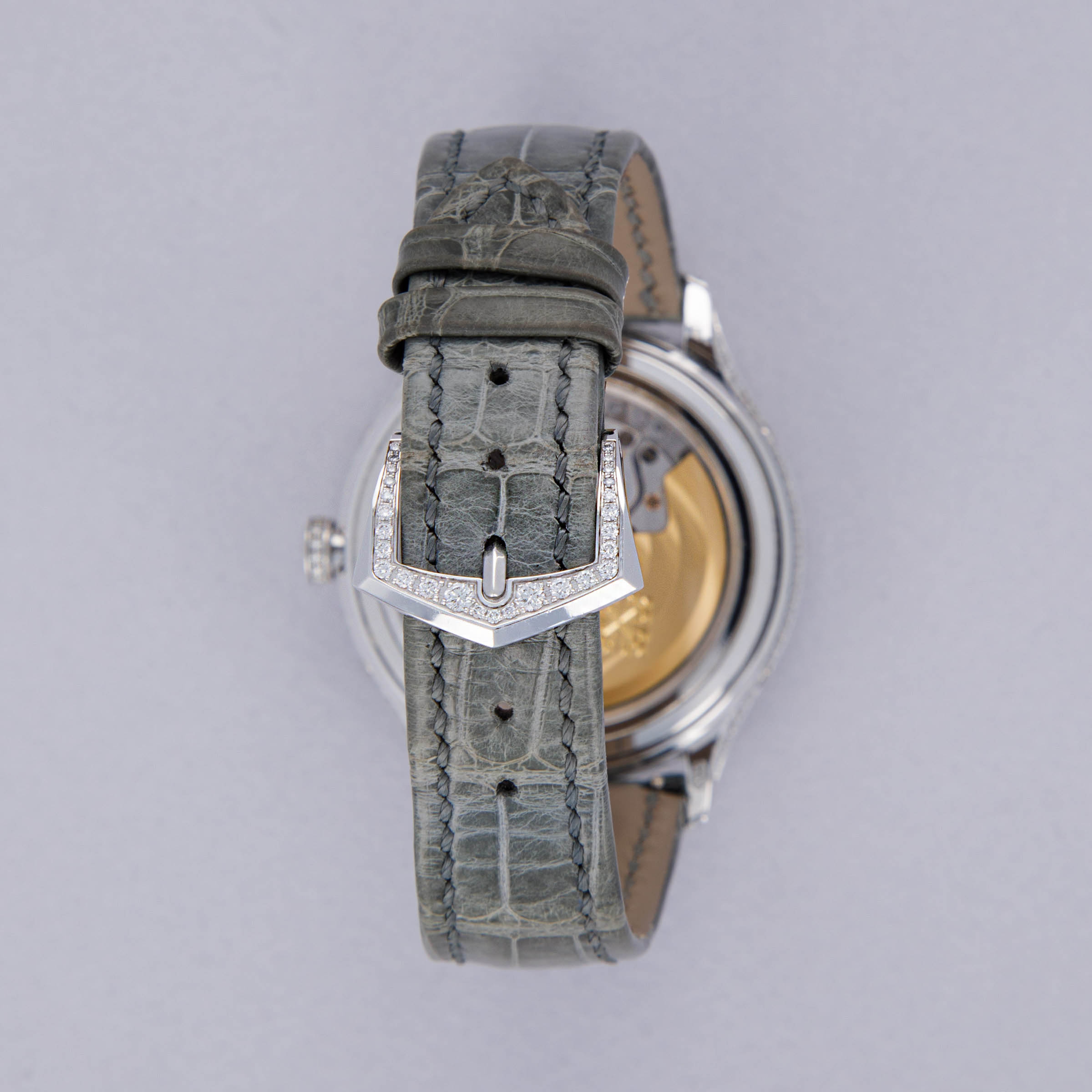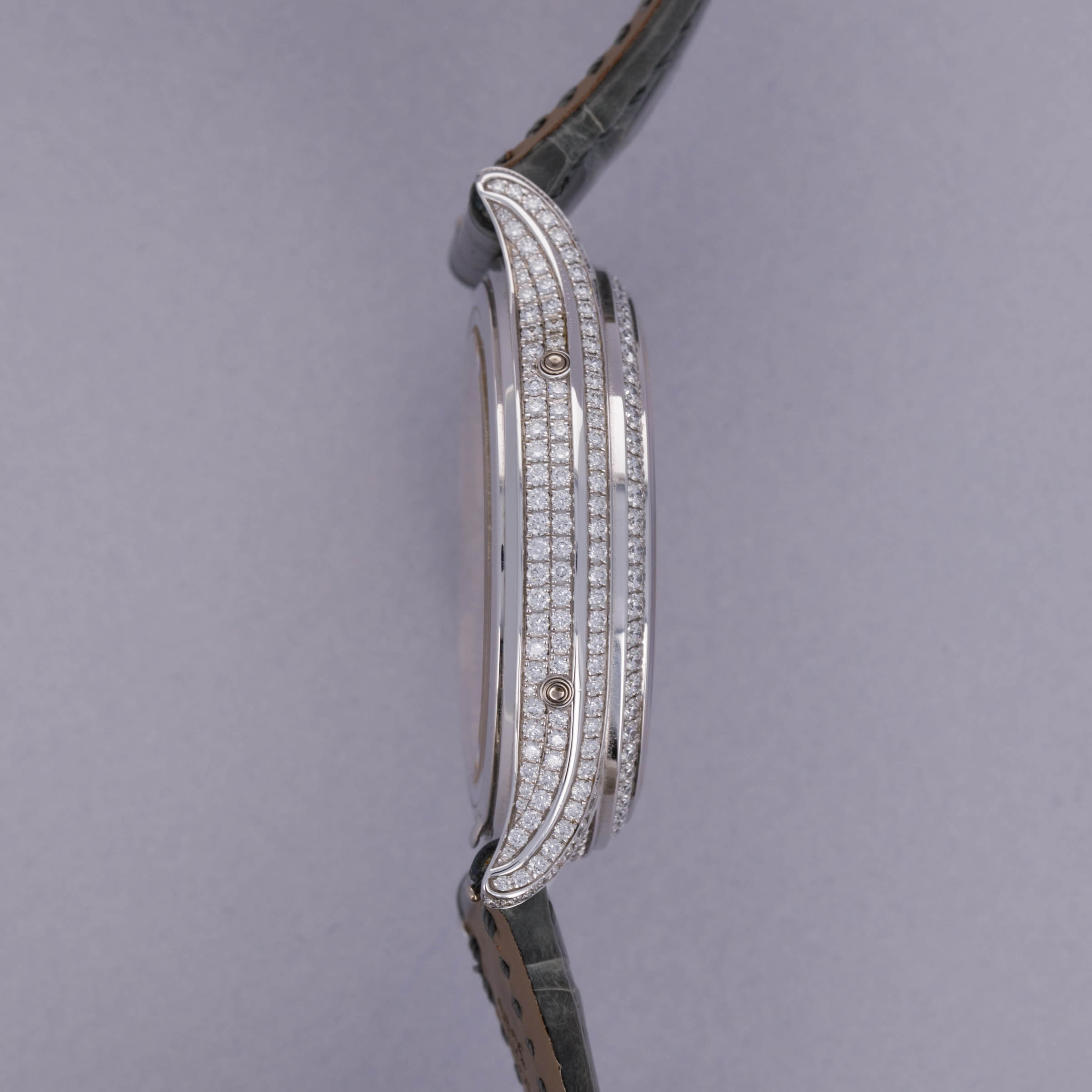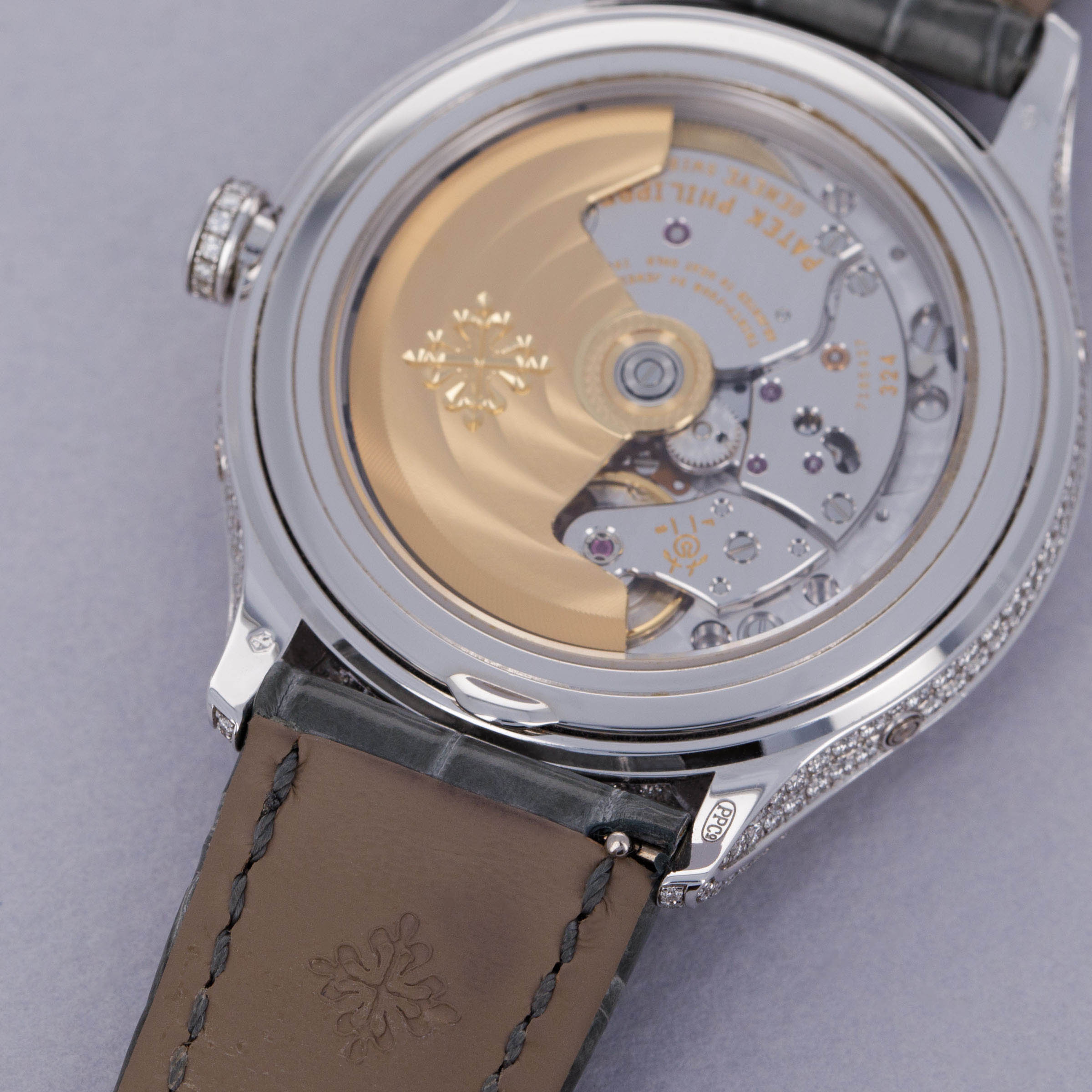 Watch is in near-mint condition. There are minor signs of wear, including small marks along the case, as well as some accumulated debris on the surfaces and crevasses of the diamond settings. Watch comes with box and papers in addition to two lightly worn Patek Philippe straps.